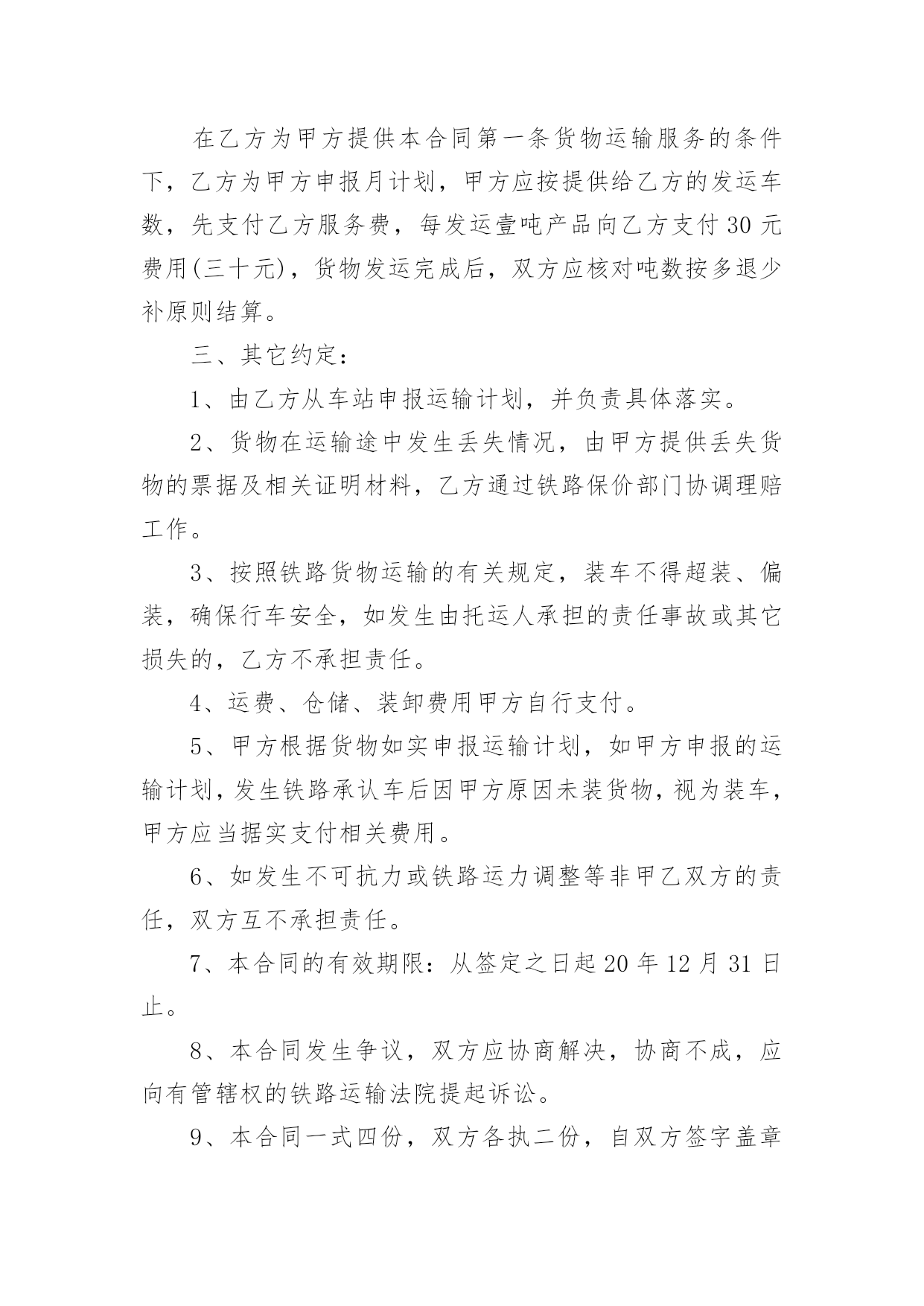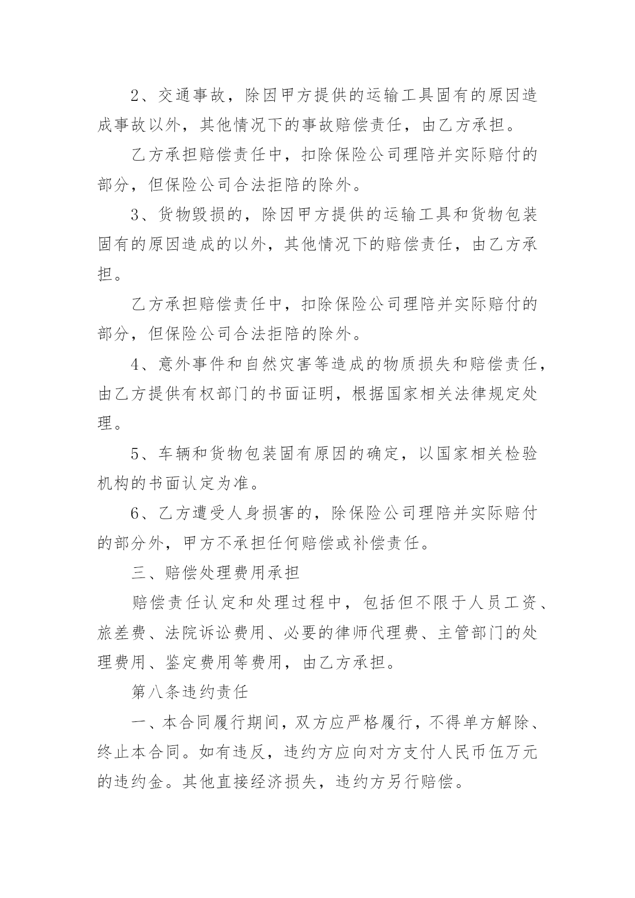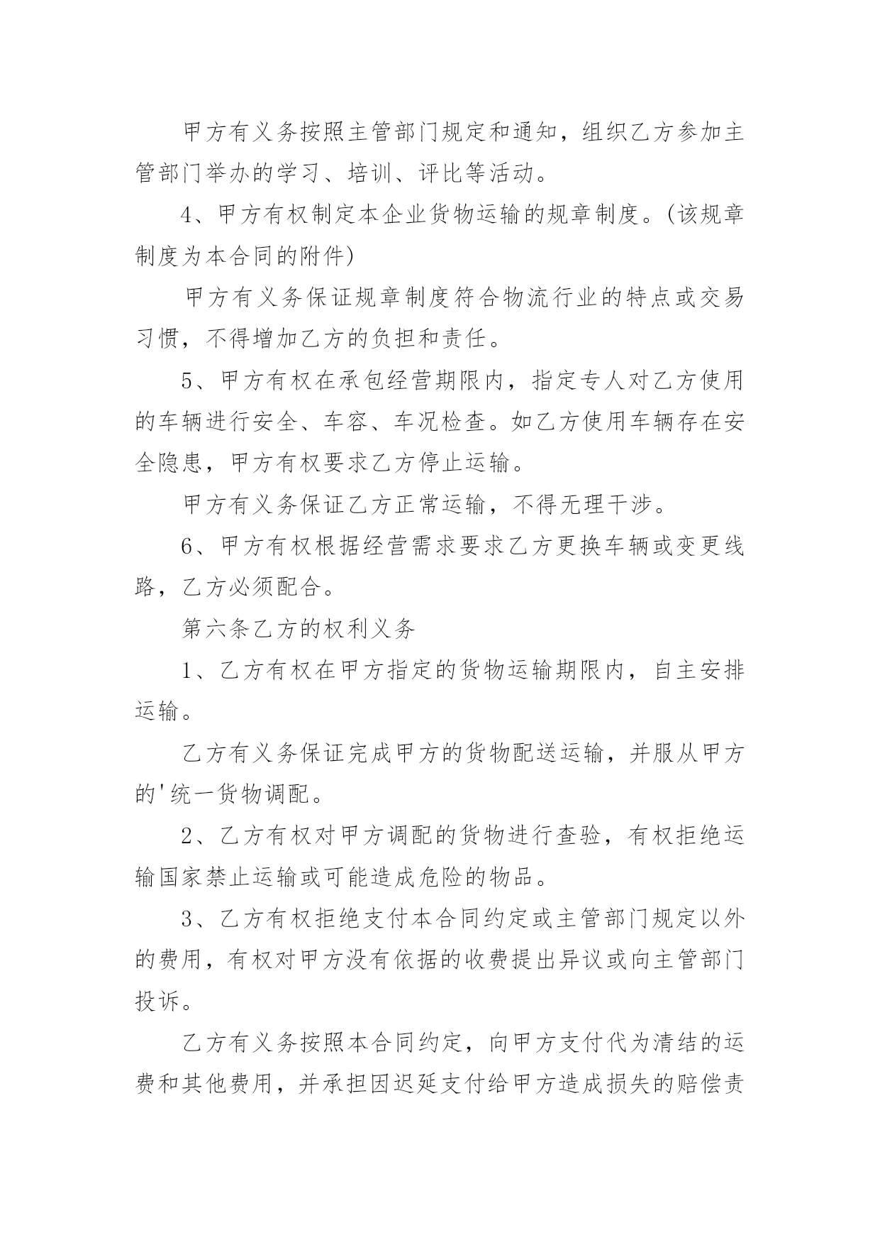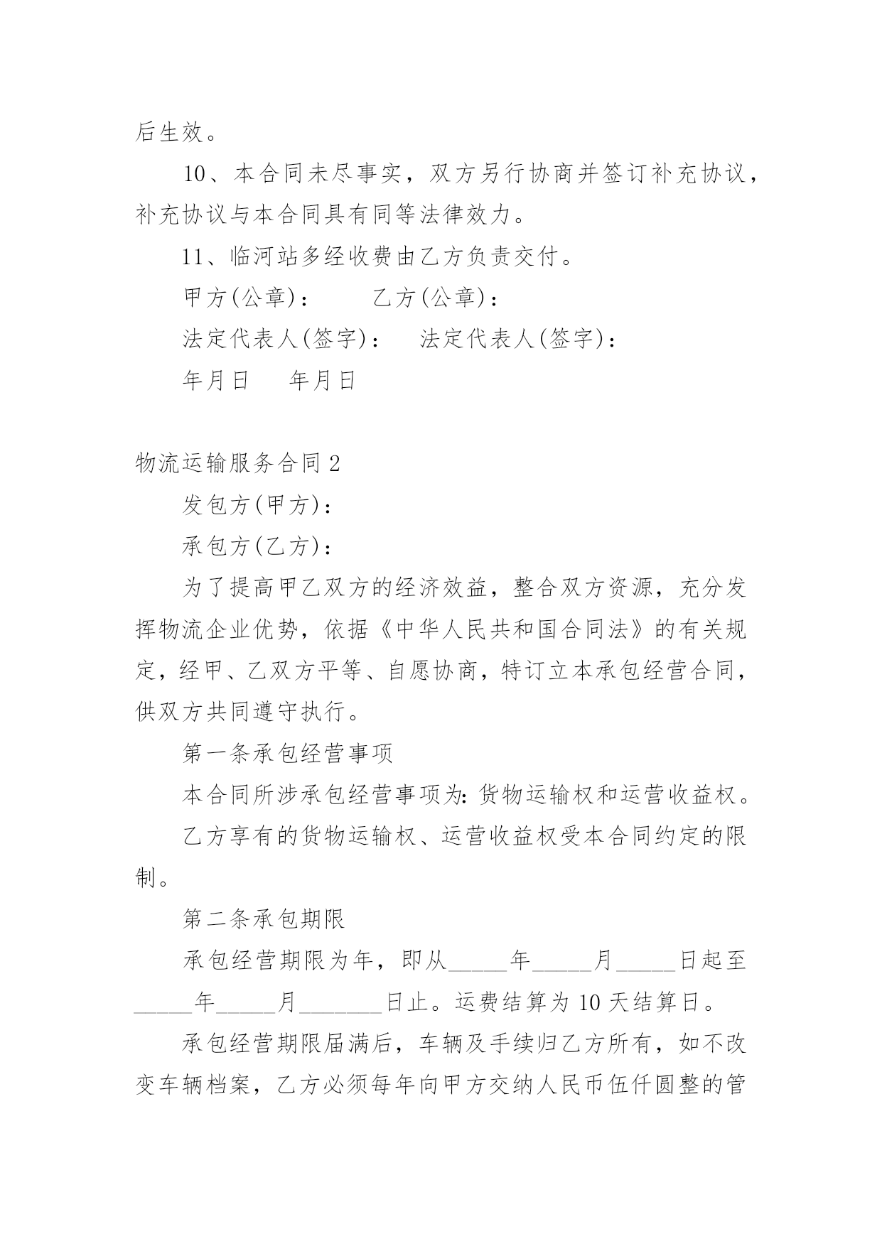 物流运输服务合同物流运输服务合同6篇在人们的法律意识不断增强的社会,越来越多事情需要用到合同,它也是减少和防止发生争议的重要措施。相信大家又在为写合同犯愁了吧,以下是小编为大家整理的物流运输服务合同,供大家参考借鉴,希望可以帮助到有需要的朋友。物流运输服务合同1甲方:乙方:根据《中华人民共和国合同法》及相关法律规定,甲乙双方本着公平互利互补的原则,就乙方为甲方提供物流服务一事达成如下协议:一、乙方的服务内容、责任:乙方为甲方提供所生产产品的`铁路运输物流服务,发货站临河站,到达站北京局、郑州局、济南局、太原局、成都局、沈阳局、武汉局,乙方负责为甲方申报月计划、日计划。代办清车服务、监督过磅、装车及联系短途运输,代交铁路运费及其它费用,如在运输过程中发生运力调整,以及自然环境不可抗力等因素影响货物运输时,应及时告知甲方并协助解决。二、物流运输服务费用及支付方式:在乙方为甲方提供本合同第一条货物运输服务的条件下,乙方为甲方申报月计划,甲方应按提供给乙方的发运车数,先支付乙方服务费,每发运壹吨产品向乙方支付30元费用(三十元),货物发运完成后,双方应核对吨数按多退少补原则结算。三、其它约定:1、由乙方从车站申报运输计划,并负责具体落实。2、货物在运输途中发生丢失情况,由甲方提供丢失货物的票据及相关证明材料,乙方通过铁路保价部门协调理赔工作。3、按照铁路货物运输的有关规定,装车不得超装、偏装,确保行车安全,如发生由托运人承担的责任事故或其它损失的,乙方不承担责任。4、运费、仓储、装卸费用甲方自行支付。5、甲方根据货物如实申报运输计划,如甲方申报的运输计划,发生铁路承认车后因甲方原因未装货物,视为装车,甲方应当据实支付相关费用。6、如发生不可抗力或铁路运力调整等非甲乙双方的责任,双方互不承担责任。7、本合同的有效期限:从签定之日起20年12月31日止。8、本合同发生争议,双方应协商解决,协商不成,应向有管辖权的铁路运输法院提起诉讼。9、本合同一式四份,双方各执二份,自双方签字盖章后生效。10、本合同未尽事实,双方另行协商并签订补充协议,补充协议与本合同具有同等法律效力。11、临河站多经收费由乙方负责交付。甲方(公章):乙方(公章):法定代表人(签字):法定代表人(签字):年月日年月日物流运输服务合同2发包方(甲方):承包方(乙方):为了提高甲乙双方的经济效益,整合双方资源,充分发挥物流企业优势,依据《中华人民共和国合同法》的有关规定,经甲、乙双方平等、自愿协商,特订立本承包经营合同,供双方共同遵守执行。第一条承包经营事项本合同所涉承包经营事项为:货物运输权和运营收益权。乙方享有的货物运输权、运营收益权受本合同约定的限制。第二条承包期限承包经营期限为年,即从_____年_____月_____日起至_____年_____月_______日止。运费结算为10天结算日。承包经营期限届满后,车辆及手续归乙方所有,如不改变车辆档案,乙方必须每年向甲方交纳人民币伍仟圆整的管理费用。承包经营期限内,甲、乙双方可依据本合同的约定,变更或解除本合同。第三条承包方式一、基本承包经营方式:1、甲方提供货物运输的货源,由乙方运输至甲方或货主指定的地点。2、甲方与货物托运人办理托运手续和运费清结。根据经营需要,甲方也可以书面(不得口头)委托乙方办理货物托运手续和运费清结。3、乙方必须在甲方通知的期限内完成甲方安排或随时指定的运输业务。4、承包金正向给付,即由乙方向甲方支付本协议约定的承包金人民币贰拾万圆整。另每月乙方需向甲方缴纳人民币壹万壹千圆整的车辆月承包收益金,此金额缴纳期限为26个月,合同签订之日乙方须向甲方缴纳人民币壹万圆整预付定金,当甲方通知乙方缴纳剩余款项后,乙方须在两天内向甲方缴纳剩余人民币壹拾玖万圆整,如在_______年_____月_____日前甲方仍未开始项目运营,甲方向乙方退还已缴纳的预付定金人民币壹万元整。5、承包经营期间,乙方承担货物运输过程中所发生的燃油、燃气费用、路桥通行费用、车辆维修保养费用(保险公司赔偿的除外)等经营成本。6、承包经营期间,车辆年检,二保等检验及商业保险费用由乙方承担。二、乙方以甲方提供车辆作为运输工具。()乙方的运输工具为:号汽车,车架号,发动机号,以及随车工具。上述车辆,必须车况完好、审验合格、安全适用、符合行驶和货运的国家强制性标准。第四条承包经营保证金和承包金一、承包经营保证金本合同生效后,乙方应向甲方交付承包经营保证金人民币贰拾万元,乙方在本合同生效当时支付。该保证金为乙方在承包经营期间车辆使用费用及非甲方原因造成损失的赔偿资金保证。承包经营保证金一次性交付。承包经营期间,保证金不计付银行利息。承包经营期限届满,承包保证金不予退还。第五条甲方的权利义务1、甲方有权纠正乙方在货物运输中违法、违规行为。甲