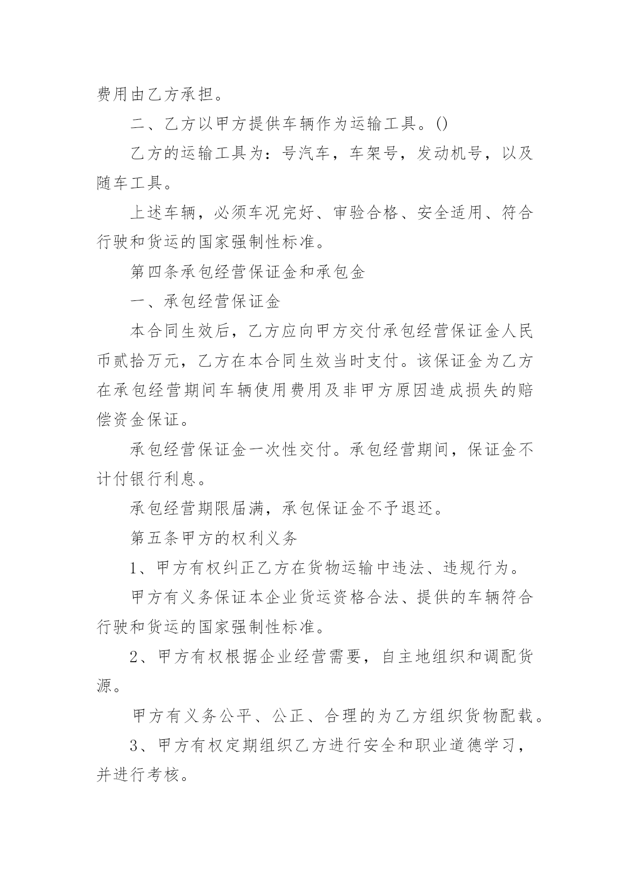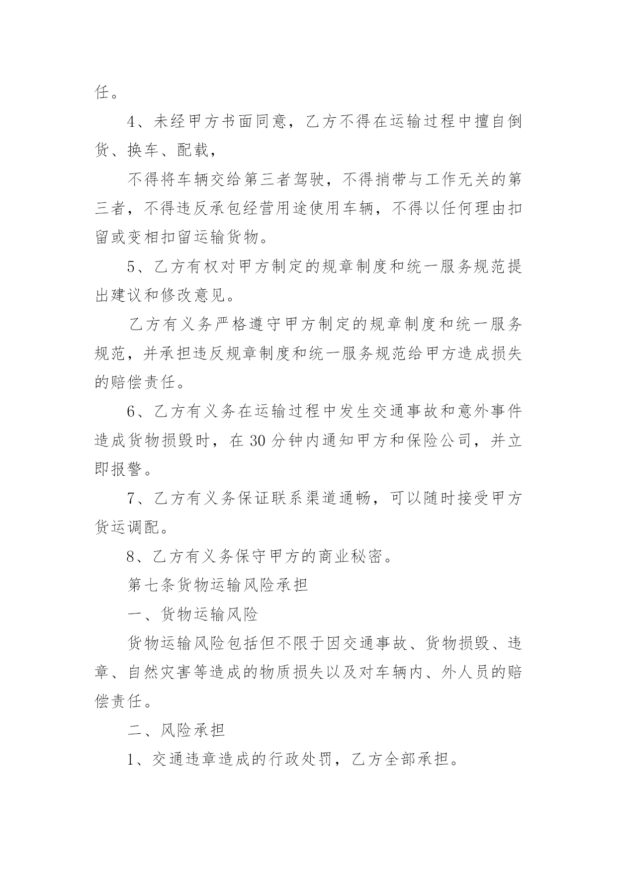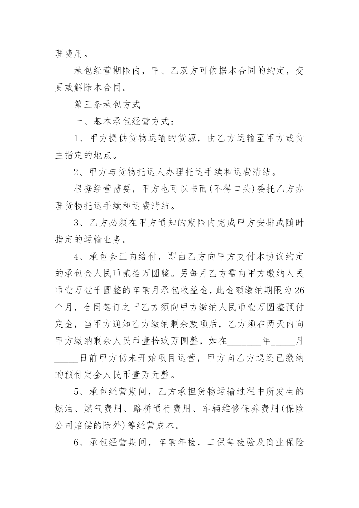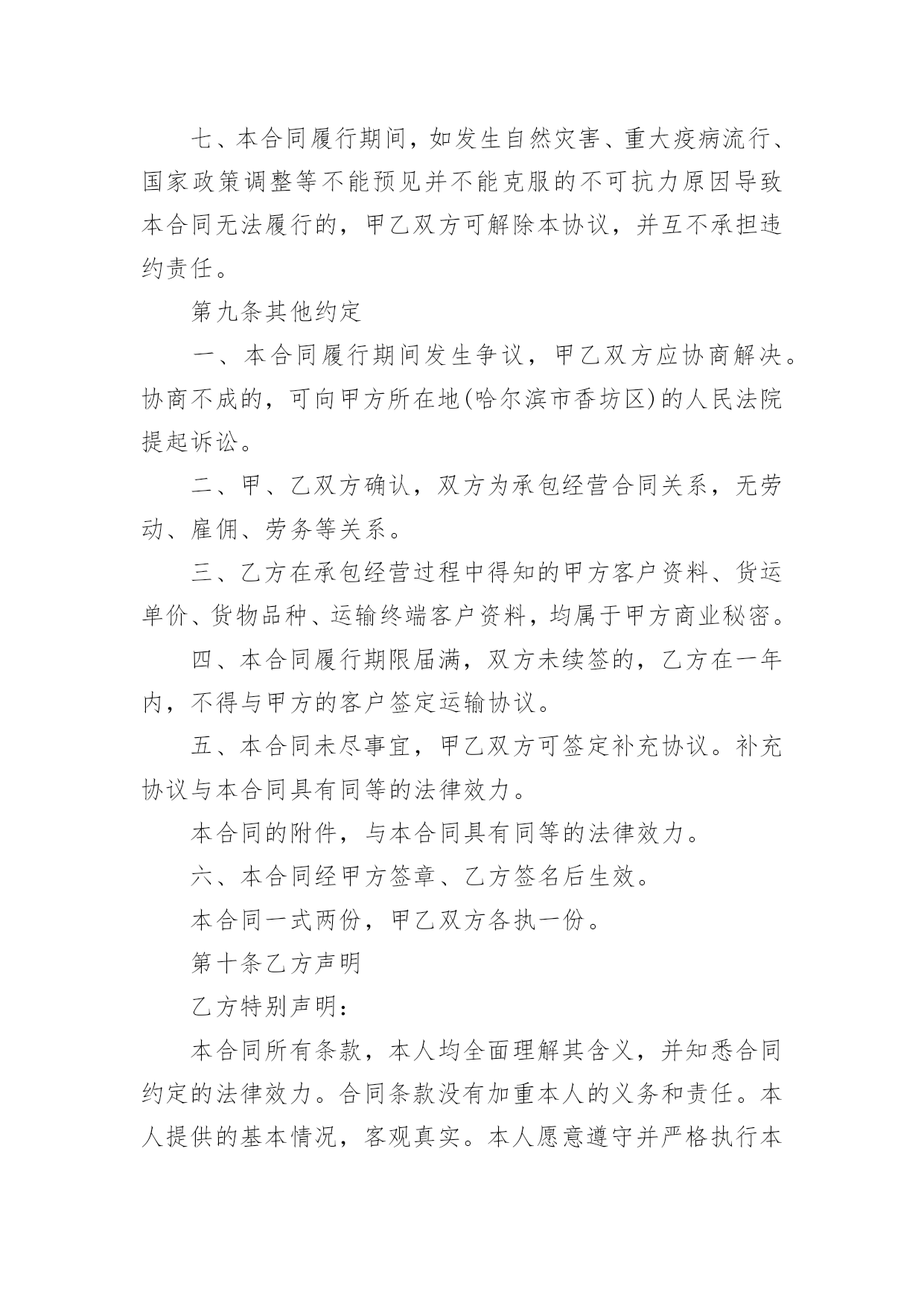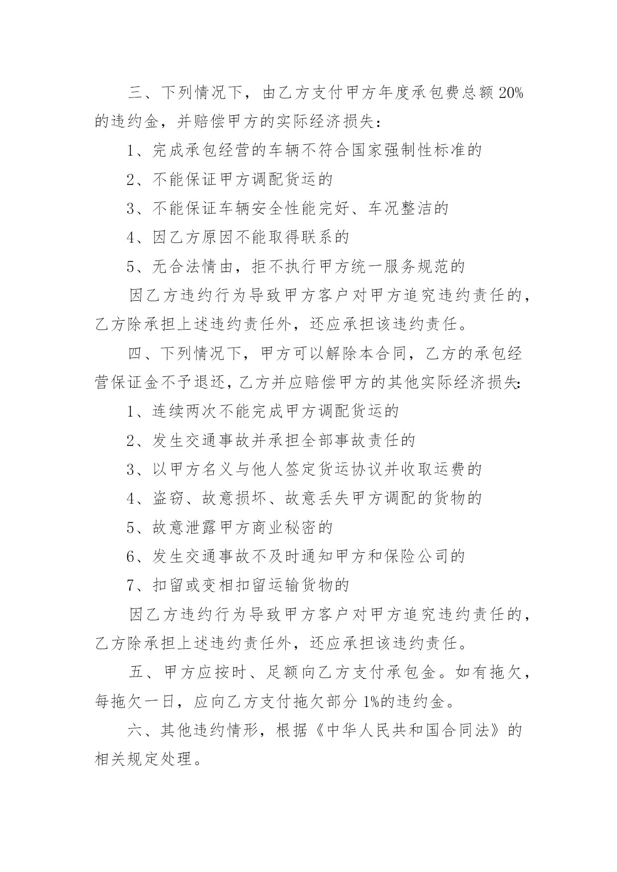 物流运输服务合同物流运输服务合同6篇在人们的法律意识不断增强的社会,越来越多事情需要用到合同,它也是减少和防止发生争议的重要措施。相信大家又在为写合同犯愁了吧,以下是小编为大家整理的物流运输服务合同,供大家参考借鉴,希望可以帮助到有需要的朋友。物流运输服务合同1甲方:乙方:根据《中华人民共和国合同法》及相关法律规定,甲乙双方本着公平互利互补的原则,就乙方为甲方提供物流服务一事达成如下协议:一、乙方的服务内容、责任:乙方为甲方提供所生产产品的`铁路运输物流服务,发货站临河站,到达站北京局、郑州局、济南局、太原局、成都局、沈阳局、武汉局,乙方负责为甲方申报月计划、日计划。代办清车服务、监督过磅、装车及联系短途运输,代交铁路运费及其它费用,如在运输过程中发生运力调整,以及自然环境不可抗力等因素影响货物运输时,应及时告知甲方并协助解决。二、物流运输服务费用及支付方式:在乙方为甲方提供本合同第一条货物运输服务的条件下,乙方为甲方申报月计划,甲方应按提供给乙方的发运车数,先支付乙方服务费,每发运壹吨产品向乙方支付30元费用(三十元),货物发运完成后,双方应核对吨数按多退少补原则结算。三、其它约定:1、由乙方从车站申报运输计划,并负责具体落实。2、货物在运输途中发生丢失情况,由甲方提供丢失货物的票据及相关证明材料,乙方通过铁路保价部门协调理赔工作。3、按照铁路货物运输的有关规定,装车不得超装、偏装,确保行车安全,如发生由托运人承担的责任事故或其它损失的,乙方不承担责任。4、运费、仓储、装卸费用甲方自行支付。5、甲方根据货物如实申报运输计划,如甲方申报的运输计划,发生铁路承认车后因甲方原因未装货物,视为装车,甲方应当据实支付相关费用。6、如发生不可抗力或铁路运力调整等非甲乙双方的责任,双方互不承担责任。7、本合同的有效期限:从签定之日起20年12月31日止。8、本合同发生争议,双方应协商解决,协商不成,应向有管辖权的铁路运输法院提起诉讼。9、本合同一式四份,双方各执二份,自双方签字盖章后生效。10、本合同未尽事实,双方另行协商并签订补充协议,补充协议与本合同具有同等法律效力。11、临河站多经收费由乙方负责交付。甲方(公章):乙方(公章):法定代表人(签字):法定代表人(签字):年月日年月日物流运输服务合同2发包方(甲方):承包方(乙方):为了提高甲乙双方的经济效益,整合双方资源,充分发挥物流企业优势,依据《中华人民共和国合同法》的有关规定,经甲、乙双方平等、自愿协商,特订立本承包经营合同,供双方共同遵守执行。第一条承包经营事项本合同所涉承包经营事项为:货物运输权和运营收益权。乙方享有的货物运输权、运营收益权受本合同约定的限制。第二条承包期限承包经营期限为年,即从_____年_____月_____日起至_____年_____月_______日止。运费结算为10天结算日。承包经营期限届满后,车辆及手续归乙方所有,如不改变车辆档案,乙方必须每年向甲方交纳人民币伍仟圆整的管理费用。承包经营期限内,甲、乙双方可依据本合同的约定,变更或解除本合同。第三条承包方式一、基本承包经营方式:1、甲方提供货物运输的货源,由乙方运输至甲方或货主指定的地点。2、甲方与货物托运人办理托运手续和运费清结。根据经营需要,甲方也可以书面(不得口头)委托乙方办理货物托运手续和运费清结。3、乙方必须在甲方通知的期限内完成甲方安排或随时指定的运输业务。4、承包金正向给付,即由乙方向甲方支付本协议约定的承包金人民币贰拾万圆整。另每月乙方需向甲方缴纳人民币壹万壹千圆整的车辆月承包收益金,此金额缴纳期限为26个月,合同签订之日乙方须向甲方缴纳人民币壹万圆整预付定金,当甲方通知乙方缴纳剩余款项后,乙方须在两天内向甲方缴纳剩余人民币壹拾玖万圆整,如在_______年_____月_____日前甲方仍未开始项目运营,甲方向乙方退还已缴纳的预付定金人民币壹万元整。5、承包经营期间,乙方承担货物运输过程中所发生的燃油、燃气费用、路桥通行费用、车辆维修保养费用(保险公司赔偿的除外)等经营成本。6、承包经营期间,车辆年检,二保等检验及商业保险费用由乙方承担。二、乙方以甲方提供车辆作为运输工具。()乙方的运输工具为:号汽车,车架号,发动机号,以及随车工具。上述车辆,必须车况完好、审验合格、安全适用、符合行驶和货运的国家强制性标准。第四条承包经营保证金和承包金一、承包经营保证金本合同生效后,乙方应向甲方交付承包经营保证金人民币贰拾万元,乙方在本合同生效当时支付。该保证金为乙方在承包经营期间车辆使用费用及非甲方原因造成损失的赔偿资金保证。承包经营保证金一次性交付。承包经营期间,保证金不计付银行利息。承包经营期限届满,承包保证金不予退还。第五条甲方的权利义务1、甲方有权纠正乙方在货物运输中违法、违规行为。甲