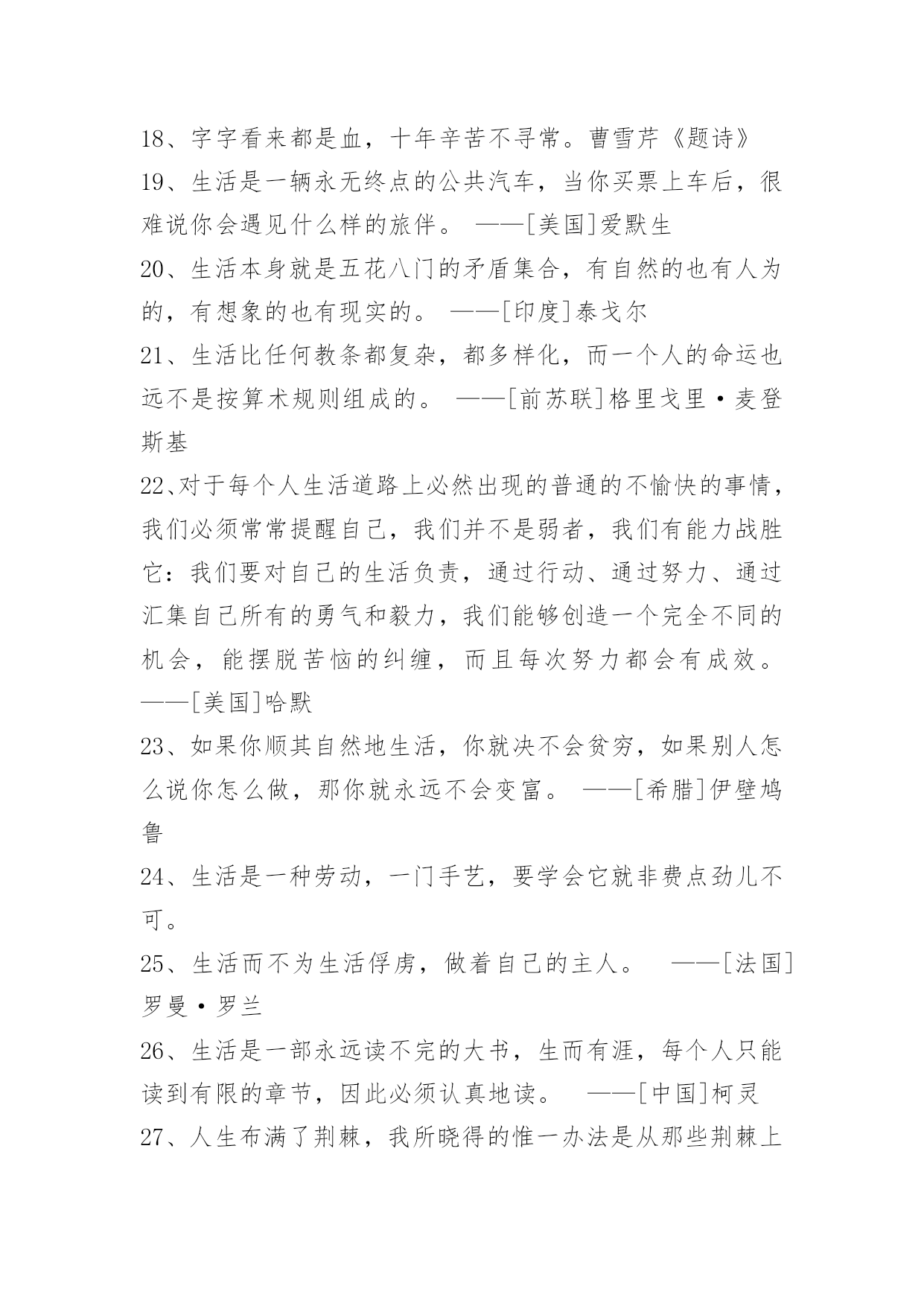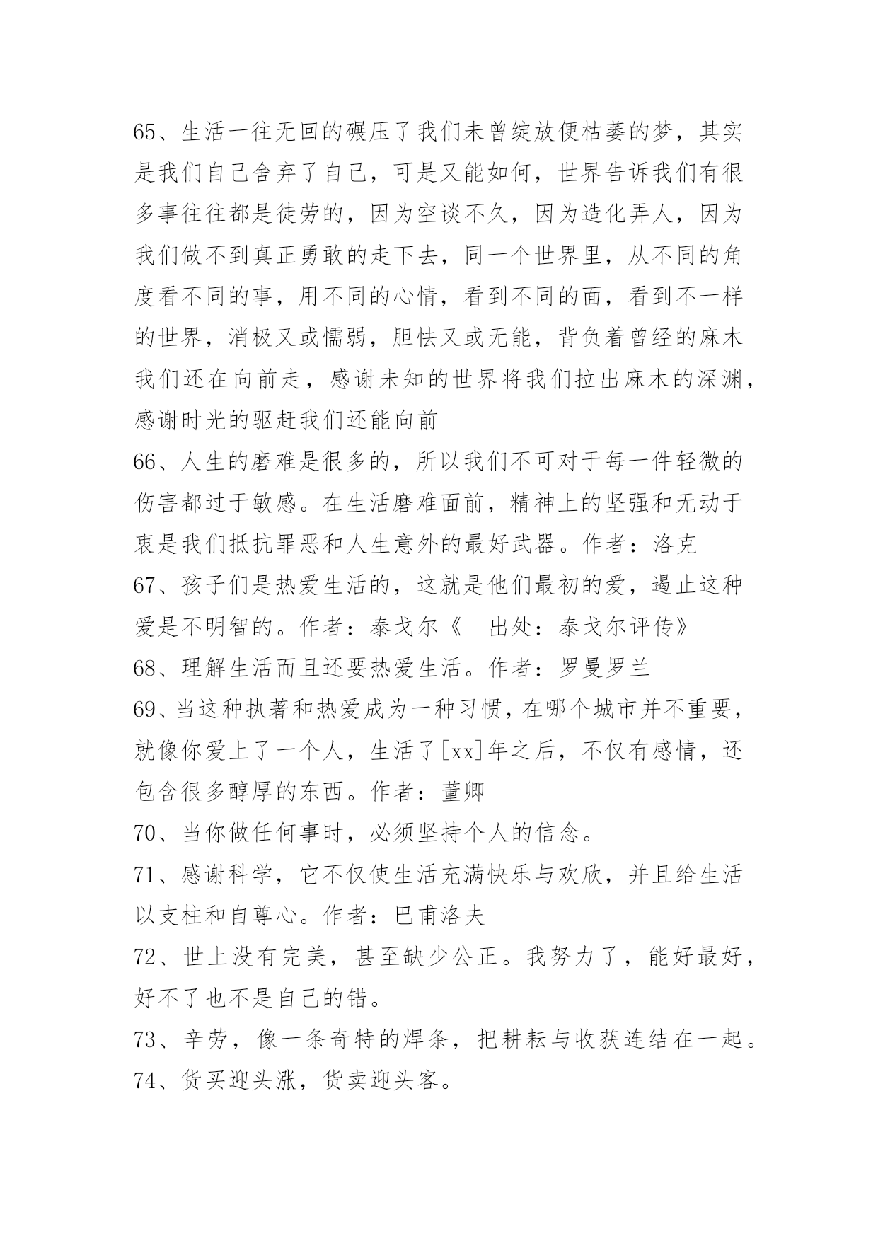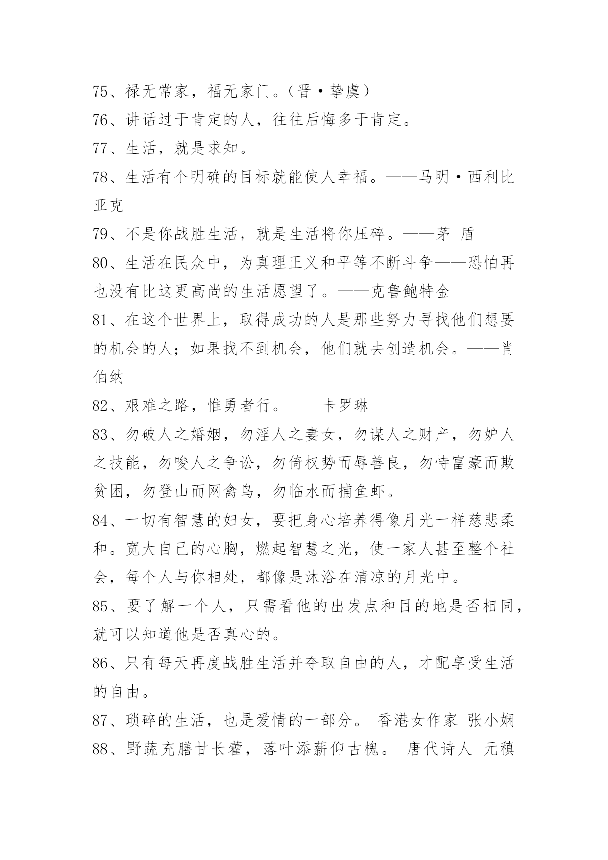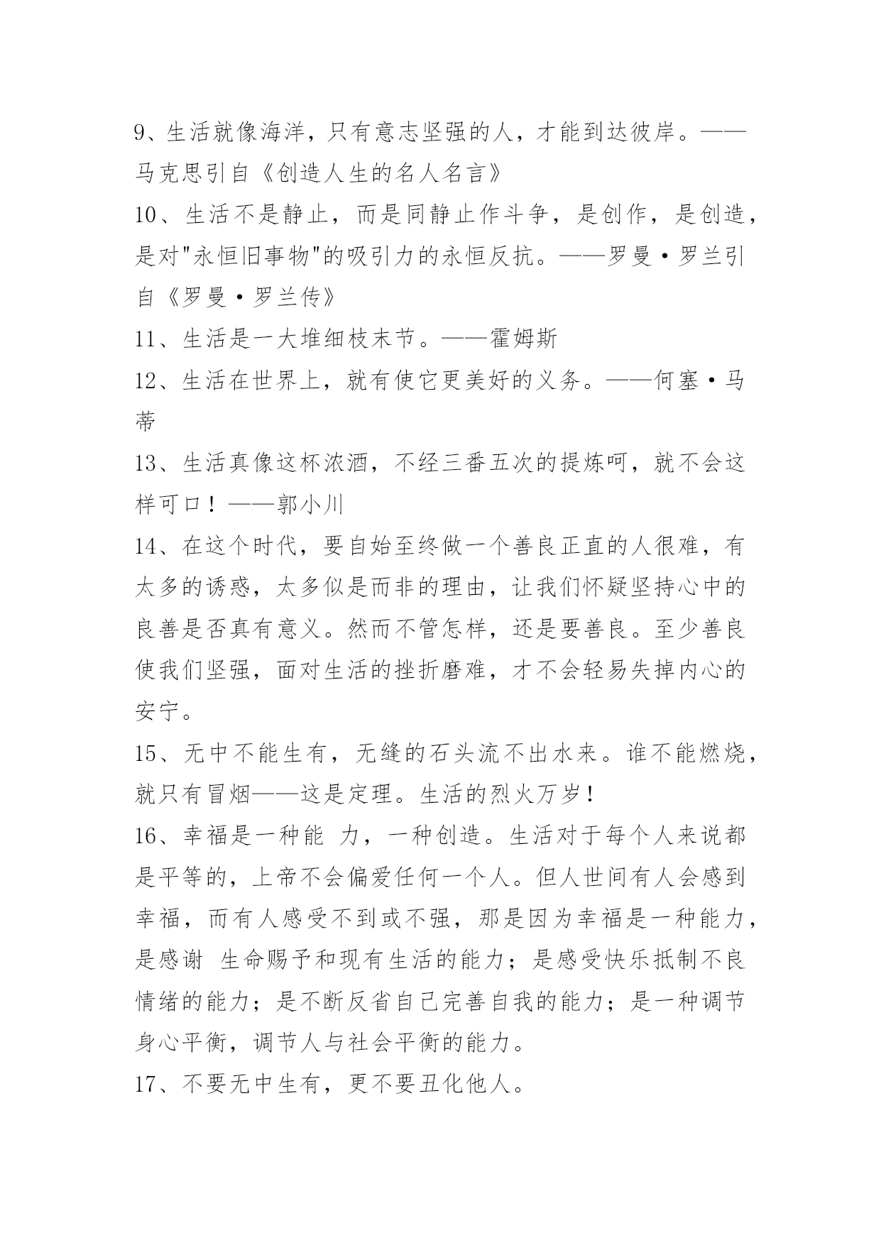 生活名言名句生活名言名句锦集89句就理解和领会能力而言,头脑中塞满东西和头脑中空空如也同样糟糕。以下是小编帮大家整理的生活名言名句89句,欢迎阅读,希望大家能够喜欢。1、这个世界不会以一时的成功论英雄,也不会以偶然的失误判输赢。一个人,若没有持久的表现,往往很难被肯定,而被肯定的人,也难一时被推翻。2、只有明确了人生目标,才有方向感。3、人类的生活,必须时时刻刻拿最大的努力,向最高的理想扩张传衍,流转无穷,把那陈旧的组织、腐滞的机能一一的扫荡摧清,别开一种新局面。4、吃苦了苦,苦尽甘来,享福了福,福尽悲来。5、生活的航行给了每个人一把橹,但不同的航道决定了不同的归宿。应该怎样理智地生活?每一次的出发都是严肃的考验!6、热爱生活的人,生活也爱他。——佚名7、我为什么要觉得可怜,这就是我的生活。我甚至要感谢它,它让我在任何情况下都必须往前走。我没有退路,我只能不停地努力向前走。我为什么不能做到?8、假如生活欺骗了你,不要忧郁,也不要愤慨!不顺心的时候暂且容忍:相信吧,欢乐的日子就会到来。——普希金9、生活就像海洋,只有意志坚强的人,才能到达彼岸。——马克思引自《创造人生的名人名言》10、生活不是静止,而是同静止作斗争,是创作,是创造,是对"永恒旧事物"的吸引力的永恒反抗。——罗曼·罗兰引自《罗曼·罗兰传》11、生活是一大堆细枝末节。——霍姆斯12、生活在世界上,就有使它更美好的义务。——何塞·马蒂13、生活真像这杯浓酒,不经三番五次的提炼呵,就不会这样可口!——郭小川14、在这个时代,要自始至终做一个善良正直的人很难,有太多的诱惑,太多似是而非的理由,让我们怀疑坚持心中的良善是否真有意义。然而不管怎样,还是要善良。至少善良使我们坚强,面对生活的挫折磨难,才不会轻易失掉内心的安宁。15、无中不能生有,无缝的石头流不出水来。谁不能燃烧,就只有冒烟——这是定理。生活的烈火万岁!16、幸福是一种能力,一种创造。生活对于每个人来说都是平等的,上帝不会偏爱任何一个人。但人世间有人会感到幸福,而有人感受不到或不强,那是因为幸福是一种能力,是感谢生命赐予和现有生活的能力;是感受快乐抵制不良情绪的能力;是不断反省自己完善自我的能力;是一种调节身心平衡,调节人与社会平衡的能力。17、不要无中生有,更不要丑化他人。18、字字看来都是血,十年辛苦不寻常。曹雪芹《题诗》19、生活是一辆永无终点的公共汽车,当你买票上车后,很难说你会遇见什么样的旅伴。——[美国]爱默生20、生活本身就是五花八门的矛盾集合,有自然的也有人为的,有想象的也有现实的。——[印度]泰戈尔21、生活比任何教条都复杂,都多样化,而一个人的命运也远不是按算术规则组成的。——[前苏联]格里戈里·麦登斯基22、对于每个人生活道路上必然出现的普通的不愉快的事情,我们必须常常提醒自己,我们并不是弱者,我们有能力战胜它:我们要对自己的生活负责,通过行动、通过努力、通过汇集自己所有的勇气和毅力,我们能够创造一个完全不同的机会,能摆脱苦恼的纠缠,而且每次努力都会有成效。——[美国]哈默23、如果你顺其自然地生活,你就决不会贫穷,如果别人怎么说你怎么做,那你就永远不会变富。——[希腊]伊壁鸠鲁24、生活是一种劳动,一门手艺,要学会它就非费点劲儿不可。25、生活而不为生活俘虏,做着自己的主人。——[法国]罗曼·罗兰26、生活是一部永远读不完的大书,生而有涯,每个人只能读到有限的章节,因此必须认真地读。——[中国]柯灵27、人生布满了荆棘,我所晓得的惟一办法是从那些荆棘上面迅速踏过。我们对于自己所遭遇的不幸想得越多,它们对于我们的伤害就越大。——伏尔泰28、责任和权利是双生儿,想要享受权利,那么就勇于承担责任吧。29、人生就是一幕戏,每个人都是主角。人生如何去成功,所有干大事的能力也都是从小事情上生发而来的。有时成功并没有那么复杂,做好别人没做到或者忽视的小事,你就赢了。所谓细节决定成败,这是不变的真理。30、生活总的来说是完美的,不完美的是心态,不懂得欣赏的人,那么也就是会用挑剔去把一切变得有残缺。简单做人,率性而为,把握分寸,随遇而安,坦然接受现实;简单做事,不惹事,不生事,不怕事,不悔,不怨,不惜自己所做的事;简单生活,穷通得失自己的命运,担在人间碰到的一切。31、我们该去同情弱势的人,确实需要这么做,那怕心里只是这样想想也好,证明你还不至于冷漠到泯灭了人性。我们谁都不要去恨伤害过你的人与事,因为改变不了。回忆里没有忧伤,有的只是淡淡的怅惘,昨日的辉煌,都已封存,素面朝天,素衣合身,你与我站在阳台,手牵手,看夕阳。32、有时总想让自己活得潇洒快乐一些,对身边的人或事物表面上显的风平浪静,可心中却波涛汹涌,羡慕一些人的坦然,做自己的自己,可事实上又有谁能如此?人生总有太多的无奈和遗憾,因为这就是生活。
