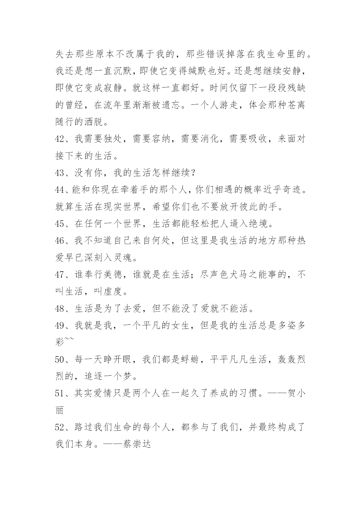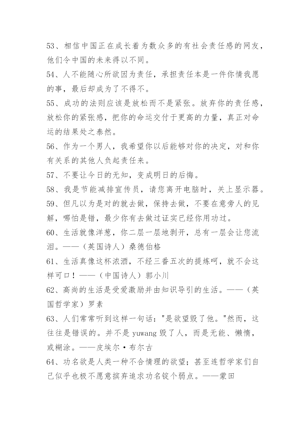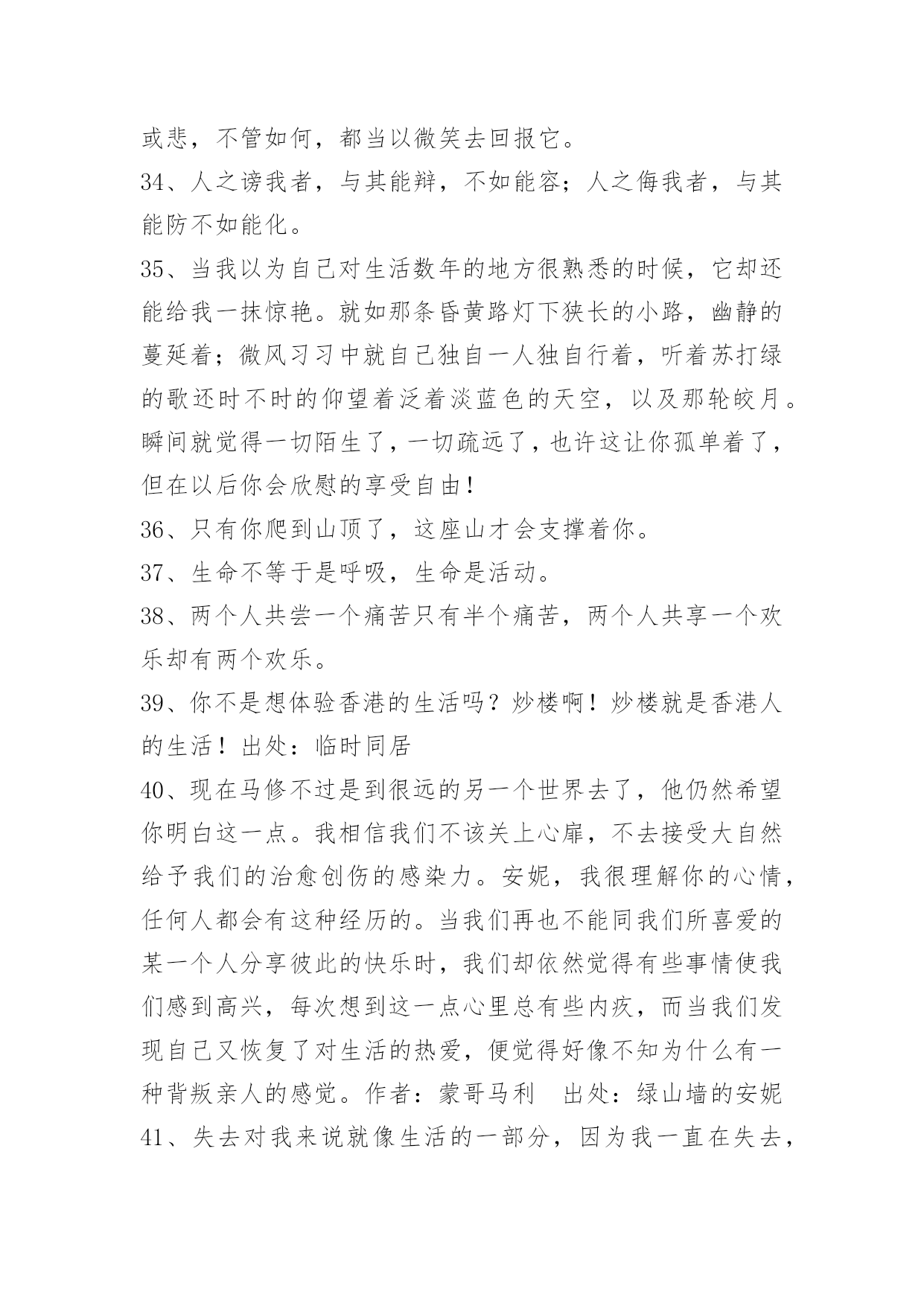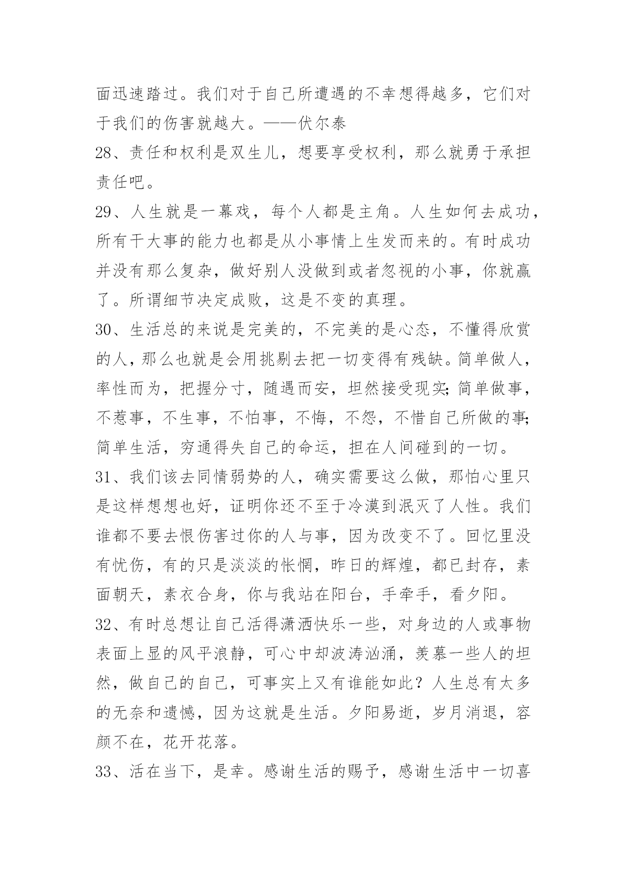 生活名言名句生活名言名句锦集89句就理解和领会能力而言,头脑中塞满东西和头脑中空空如也同样糟糕。以下是小编帮大家整理的生活名言名句89句,欢迎阅读,希望大家能够喜欢。1、这个世界不会以一时的成功论英雄,也不会以偶然的失误判输赢。一个人,若没有持久的表现,往往很难被肯定,而被肯定的人,也难一时被推翻。2、只有明确了人生目标,才有方向感。3、人类的生活,必须时时刻刻拿最大的努力,向最高的理想扩张传衍,流转无穷,把那陈旧的组织、腐滞的机能一一的扫荡摧清,别开一种新局面。4、吃苦了苦,苦尽甘来,享福了福,福尽悲来。5、生活的航行给了每个人一把橹,但不同的航道决定了不同的归宿。应该怎样理智地生活?每一次的出发都是严肃的考验!6、热爱生活的人,生活也爱他。——佚名7、我为什么要觉得可怜,这就是我的生活。我甚至要感谢它,它让我在任何情况下都必须往前走。我没有退路,我只能不停地努力向前走。我为什么不能做到?8、假如生活欺骗了你,不要忧郁,也不要愤慨!不顺心的时候暂且容忍:相信吧,欢乐的日子就会到来。——普希金9、生活就像海洋,只有意志坚强的人,才能到达彼岸。——马克思引自《创造人生的名人名言》10、生活不是静止,而是同静止作斗争,是创作,是创造,是对"永恒旧事物"的吸引力的永恒反抗。——罗曼·罗兰引自《罗曼·罗兰传》11、生活是一大堆细枝末节。——霍姆斯12、生活在世界上,就有使它更美好的义务。——何塞·马蒂13、生活真像这杯浓酒,不经三番五次的提炼呵,就不会这样可口!——郭小川14、在这个时代,要自始至终做一个善良正直的人很难,有太多的诱惑,太多似是而非的理由,让我们怀疑坚持心中的良善是否真有意义。然而不管怎样,还是要善良。至少善良使我们坚强,面对生活的挫折磨难,才不会轻易失掉内心的安宁。15、无中不能生有,无缝的石头流不出水来。谁不能燃烧,就只有冒烟——这是定理。生活的烈火万岁!16、幸福是一种能力,一种创造。生活对于每个人来说都是平等的,上帝不会偏爱任何一个人。但人世间有人会感到幸福,而有人感受不到或不强,那是因为幸福是一种能力,是感谢生命赐予和现有生活的能力;是感受快乐抵制不良情绪的能力;是不断反省自己完善自我的能力;是一种调节身心平衡,调节人与社会平衡的能力。17、不要无中生有,更不要丑化他人。18、字字看来都是血,十年辛苦不寻常。曹雪芹《题诗》19、生活是一辆永无终点的公共汽车,当你买票上车后,很难说你会遇见什么样的旅伴。——[美国]爱默生20、生活本身就是五花八门的矛盾集合,有自然的也有人为的,有想象的也有现实的。——[印度]泰戈尔21、生活比任何教条都复杂,都多样化,而一个人的命运也远不是按算术规则组成的。——[前苏联]格里戈里·麦登斯基22、对于每个人生活道路上必然出现的普通的不愉快的事情,我们必须常常提醒自己,我们并不是弱者,我们有能力战胜它:我们要对自己的生活负责,通过行动、通过努力、通过汇集自己所有的勇气和毅力,我们能够创造一个完全不同的机会,能摆脱苦恼的纠缠,而且每次努力都会有成效。——[美国]哈默23、如果你顺其自然地生活,你就决不会贫穷,如果别人怎么说你怎么做,那你就永远不会变富。——[希腊]伊壁鸠鲁24、生活是一种劳动,一门手艺,要学会它就非费点劲儿不可。25、生活而不为生活俘虏,做着自己的主人。——[法国]罗曼·罗兰26、生活是一部永远读不完的大书,生而有涯,每个人只能读到有限的章节,因此必须认真地读。——[中国]柯灵27、人生布满了荆棘,我所晓得的惟一办法是从那些荆棘上面迅速踏过。我们对于自己所遭遇的不幸想得越多,它们对于我们的伤害就越大。——伏尔泰28、责任和权利是双生儿,想要享受权利,那么就勇于承担责任吧。29、人生就是一幕戏,每个人都是主角。人生如何去成功,所有干大事的能力也都是从小事情上生发而来的。有时成功并没有那么复杂,做好别人没做到或者忽视的小事,你就赢了。所谓细节决定成败,这是不变的真理。30、生活总的来说是完美的,不完美的是心态,不懂得欣赏的人,那么也就是会用挑剔去把一切变得有残缺。简单做人,率性而为,把握分寸,随遇而安,坦然接受现实;简单做事,不惹事,不生事,不怕事,不悔,不怨,不惜自己所做的事;简单生活,穷通得失自己的命运,担在人间碰到的一切。31、我们该去同情弱势的人,确实需要这么做,那怕心里只是这样想想也好,证明你还不至于冷漠到泯灭了人性。我们谁都不要去恨伤害过你的人与事,因为改变不了。回忆里没有忧伤,有的只是淡淡的怅惘,昨日的辉煌,都已封存,素面朝天,素衣合身,你与我站在阳台,手牵手,看夕阳。32、有时总想让自己活得潇洒快乐一些,对身边的人或事物表面上显的风平浪静,可心中却波涛汹涌,羡慕一些人的坦然,做自己的自己,可事实上又有谁能如此?人生总有太多的无奈和遗憾,因为这就是生活。