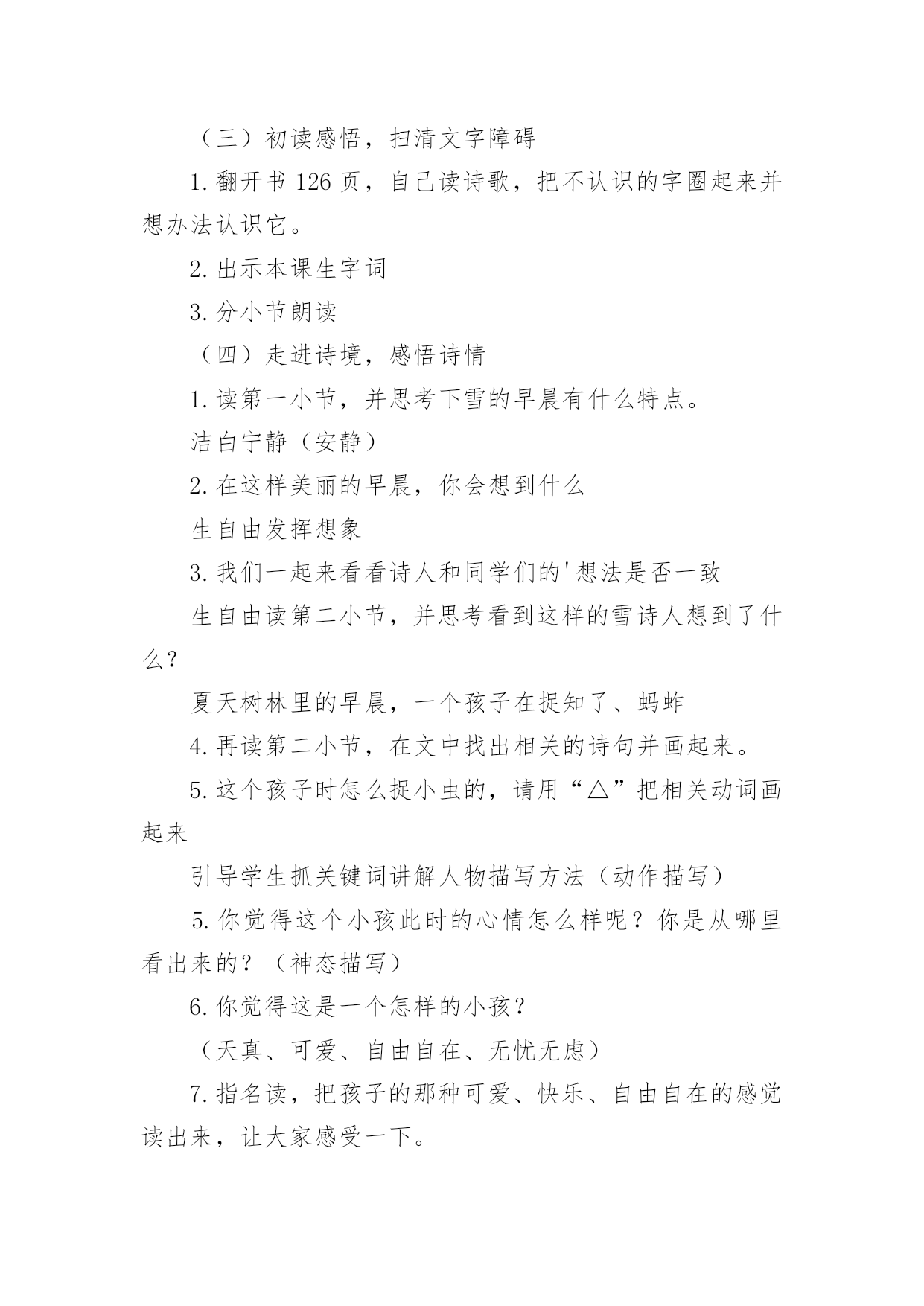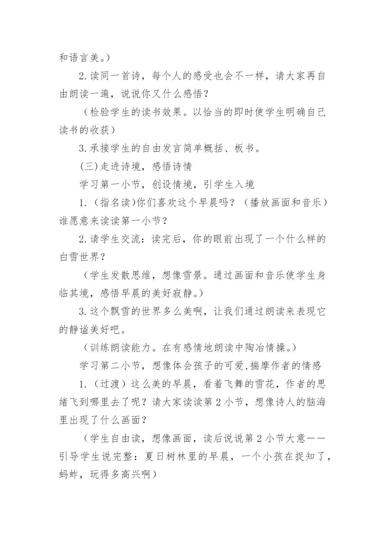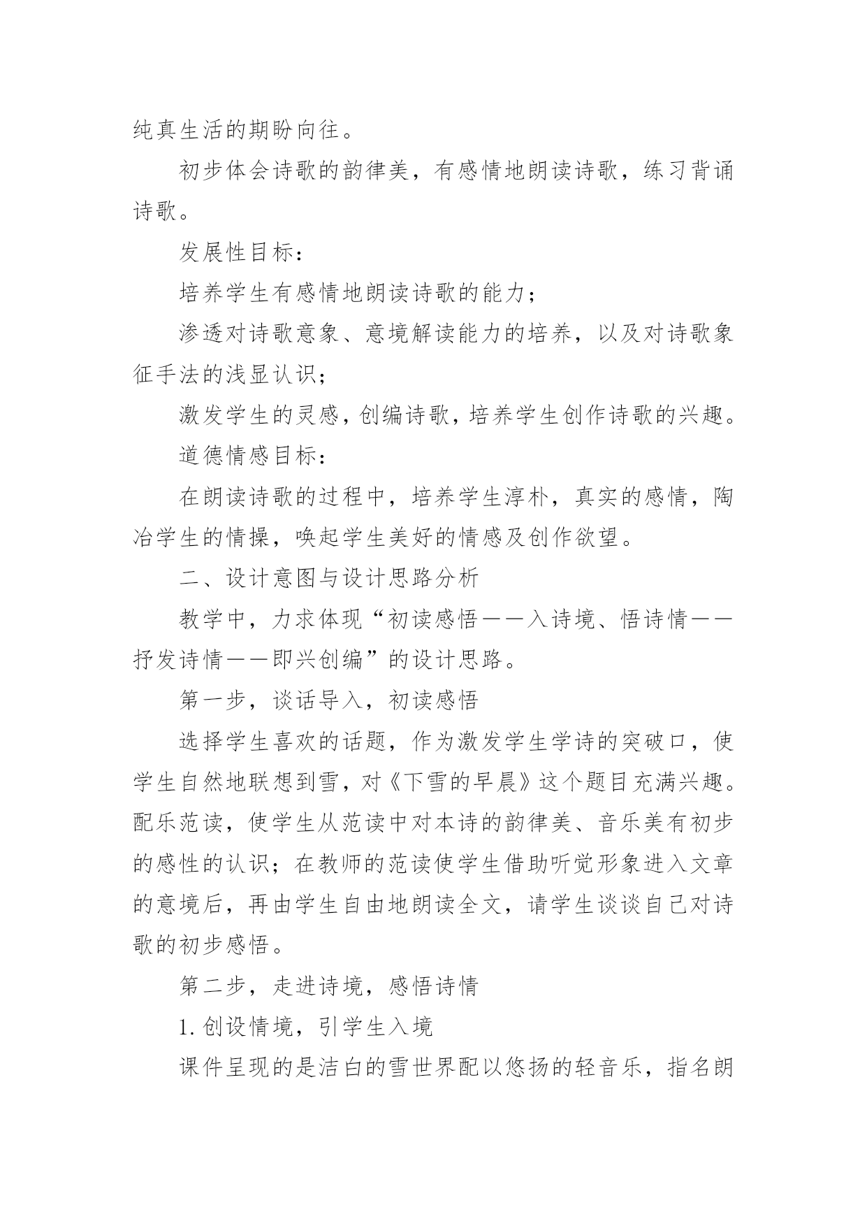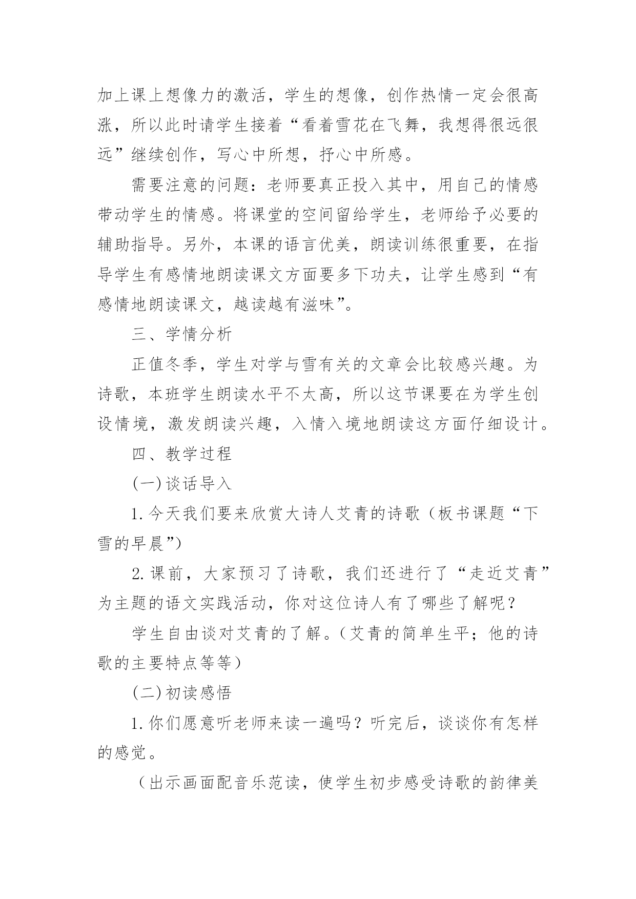 《下雪的早晨》教学设计作为一名老师,时常需要编写教学设计,教学设计是连接基础理论与实践的桥梁,对于教学理论与实践的紧密结合具有沟通作用。那么问题来了,教学设计应该怎么写?以下是小编帮大家整理的《下雪的早晨》教学设计,欢迎大家分享。《下雪的早晨》教学设计1一、教学目的1.正确、流利、有感情地朗读诗歌,初步体会诗人的思想感情;2.学会本课的生字、新词。二、教学重难点1.学会本课的生字、新词,初步体会诗人在诗中表达的思想感情。三、教学过程(一)谈话导入,展示图片孩子们,你们见过雪吗?(二)介绍诗人艾青简介浙江金华人,1933年第一次用艾青这个笔名发表诗歌《大堰河——我的保姆》,代表作品有《雪落在中国的土地上》《我爱这土地》等。(三)初读感悟,扫清文字障碍1.翻开书126页,自己读诗歌,把不认识的字圈起来并想办法认识它。2.出示本课生字词3.分小节朗读(四)走进诗境,感悟诗情1.读第一小节,并思考下雪的早晨有什么特点。洁白宁静(安静)2.在这样美丽的早晨,你会想到什么生自由发挥想象3.我们一起来看看诗人和同学们的'想法是否一致生自由读第二小节,并思考看到这样的雪诗人想到了什么?夏天树林里的早晨,一个孩子在捉知了、蚂蚱4.再读第二小节,在文中找出相关的诗句并画起来。5.这个孩子时怎么捉小虫的,请用“△”把相关动词画起来引导学生抓关键词讲解人物描写方法(动作描写)5.你觉得这个小孩此时的心情怎么样呢?你是从哪里看出来的?(神态描写)6.你觉得这是一个怎样的小孩?(天真、可爱、自由自在、无忧无虑)7.指名读,把孩子的那种可爱、快乐、自由自在的感觉读出来,让大家感受一下。8.教师配乐朗读9.全班齐读。(五)布置作业熟读诗歌并背诵,想想第三小节主要讲了什么。《下雪的早晨》教学设计2教材分析:这首诗歌共三节,描述了宁静的早晨,雪花飘飞,想起了夏天树林里的小孩天真、活泼时的喜悦心情和期盼之心。教学目标:知识技能目标1.通过学习使学生巩固生字,会读一个多音字。能运用各种朗读方法正确、流利地朗读课文。2.能结合上下文及生活实际理解课文中词句的意思,在阅读中积累词语。3.理解诗人在诗中表达的情感。情感态度目标通过课文的学习,培养学生结合生活实际具体分析问题的态度和科学的思维方法。三、教学设想1.结合课后第一题,让学生在充分朗读、自学的基础上理解作者的联想。2.通过联系生活实际谈感受,理解诗人在诗中表达的情感。教学重点、难点:体会诗歌的情境,理解诗人在诗中表达的情感,有感情地朗读课文。教学方法:讨论、小组合作式。教具准备:CAI:《雪绒花》的音乐,雪花纷纷扬扬飘洒树林。课时安排:2课时教学流程:第一课时(一)导入CAI:《雪绒花》的音乐作为背景,雪花纷纷扬扬飘洒。教师:看到这样的画面,你有怎样的感受,想说点什么吗?(鼓励学生自由发挥。)人们喜爱雪,赞美雪,但每一个人对雪的感受又是不同的。有这样一位作家,他笔下的雪有别样的滋味。让我们一起来品读。(二)读中领悟课文教师:请同学们闭上眼睛,静静地听。(CAI课文朗读)1.你听懂了什么?(学生交流:诗人在下雪的'早晨想起了一个小孩;下雪的早晨,整个世界很安静……)2.读同一首诗,每个人的感受也会不一样,请大家再自由朗读一遍,说说你又什么感悟?(检验学生的读书效果。以恰当的即时评价使学生明确自己读书的收获)3.承接学生的自由发言简单概括、板书。(三)走进诗境,感悟诗情学习第一小节,创设情境,引学生入境1.(指名读)你们喜欢这个早晨吗?(播放画面和音乐)谁愿意来读读第一小节?2.请学生交流:读完后,你的眼前出现了一个什么样的白雪世界?(学生发散思维,想像雪景。通过画面和音乐使学生身临其境,感悟早晨的美好寂静。)3.这个飘雪的世界多么美啊,让我们通过朗读来表现它的静谧美好吧。(训练朗读能力。在有感情地朗读中陶冶情操。)学习第二小节,想像体会孩子的可爱,揣摩作者的情感1.(过渡)这么美的早晨,看着飞舞的雪花,作者的思绪飞到哪里去了呢?请大家读读第2小节,想像诗人的脑海里出现了什么画面?(学生自由读,想像画面,读后说说第2小节大意――引导学生说完整:夏日树林里的早晨,一个小孩在捉知了,蚂蚱,玩得多高兴啊)2.诗人想到了一个在树林里玩耍的孩子。请大家再来默读一遍第2小节,画出描述这个孩子的诗句。指名读句子。《下雪的早晨》教学设计3一、教学目标基础性目标:了解诗歌叙述的是在一个下雪的早晨,诗人想起夏日树林里一个天真烂漫的小孩尽情玩耍的情景;体会诗人对美好纯真生活的期盼向往。初步体会诗歌的韵律美,有感情地朗读诗歌,练习背诵诗歌。发展性目标:培养学生有感情地朗读诗歌的能力;渗透对诗歌意象、意境解读能力的培养,以及对诗歌象征手法的浅显认识;激发学生的灵感,创编诗歌,培养学生创作诗歌的兴趣。道德情感目标:在朗读诗歌的过程中,培养学