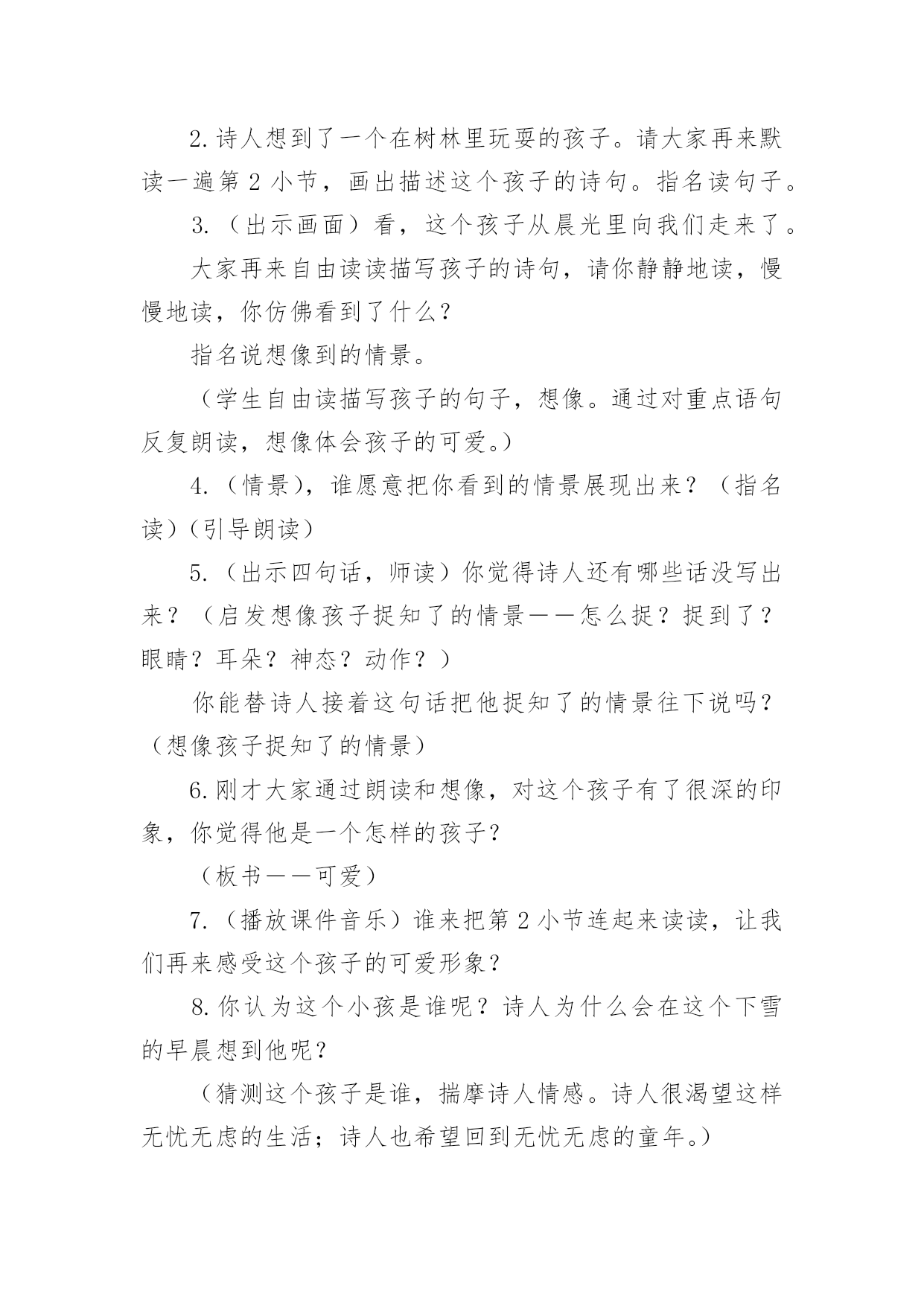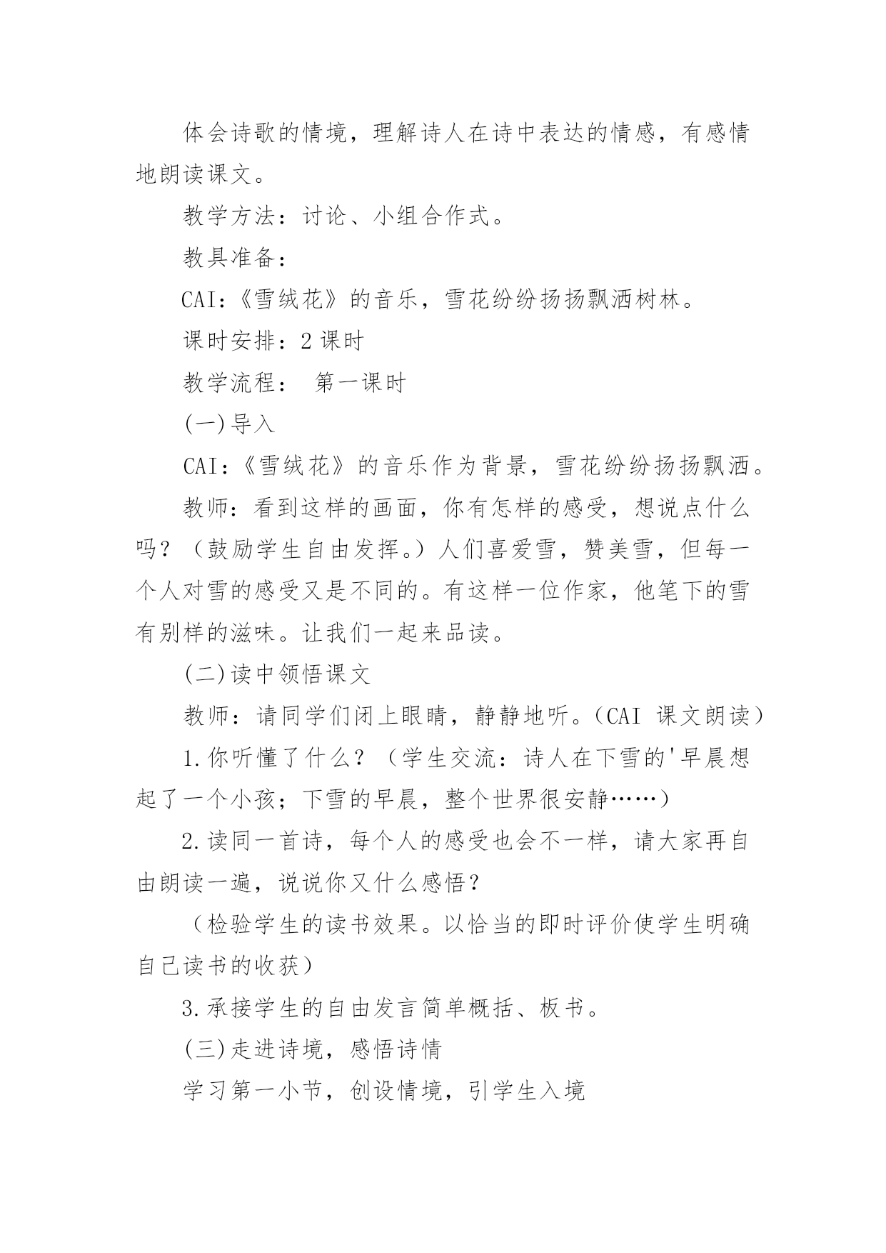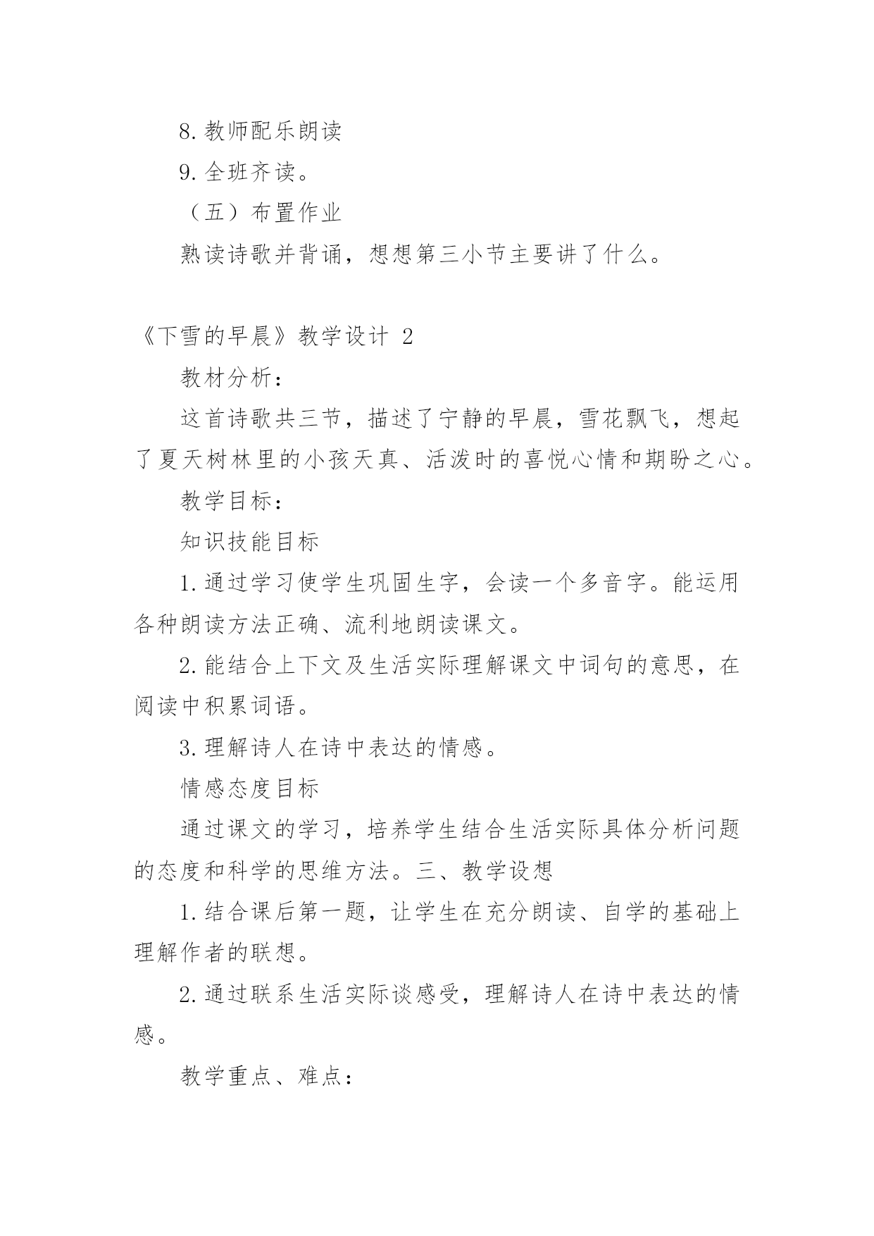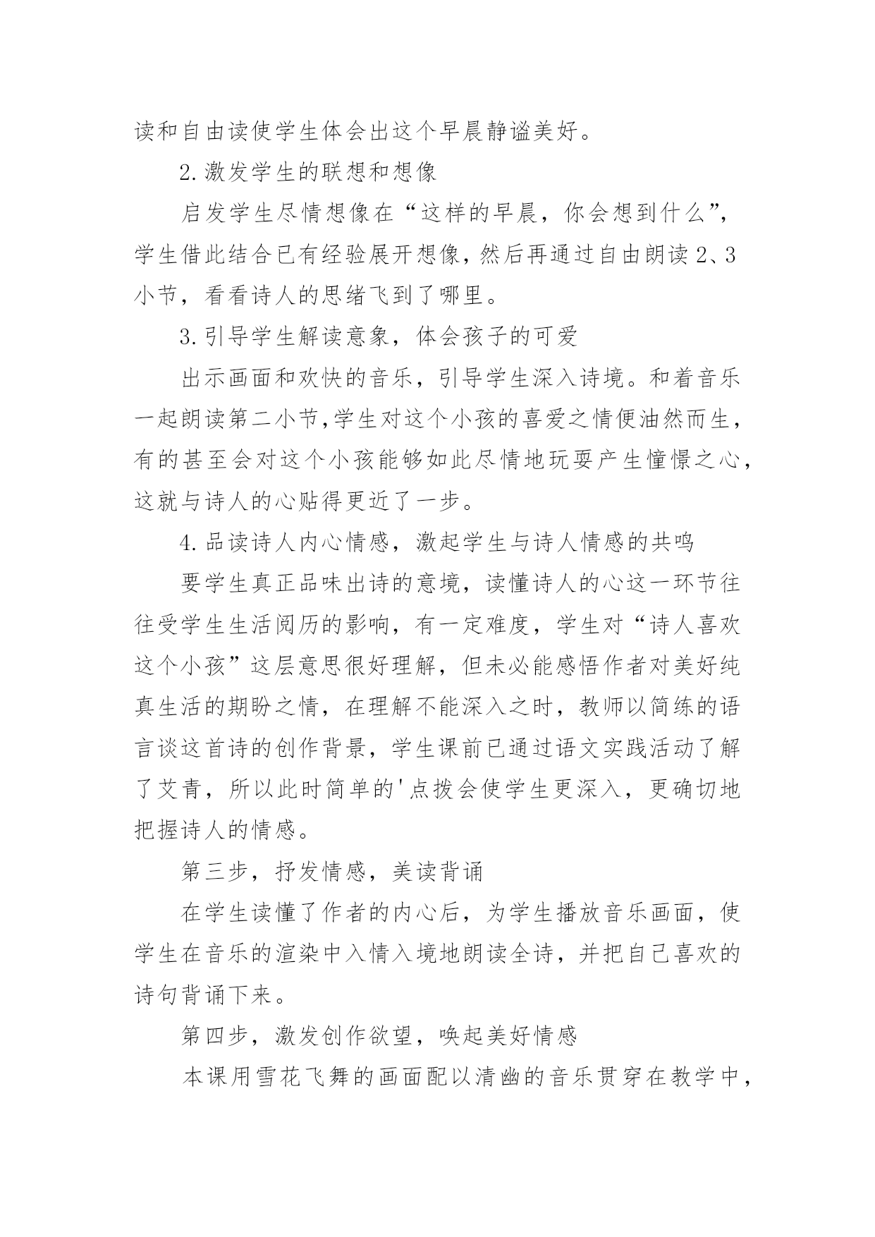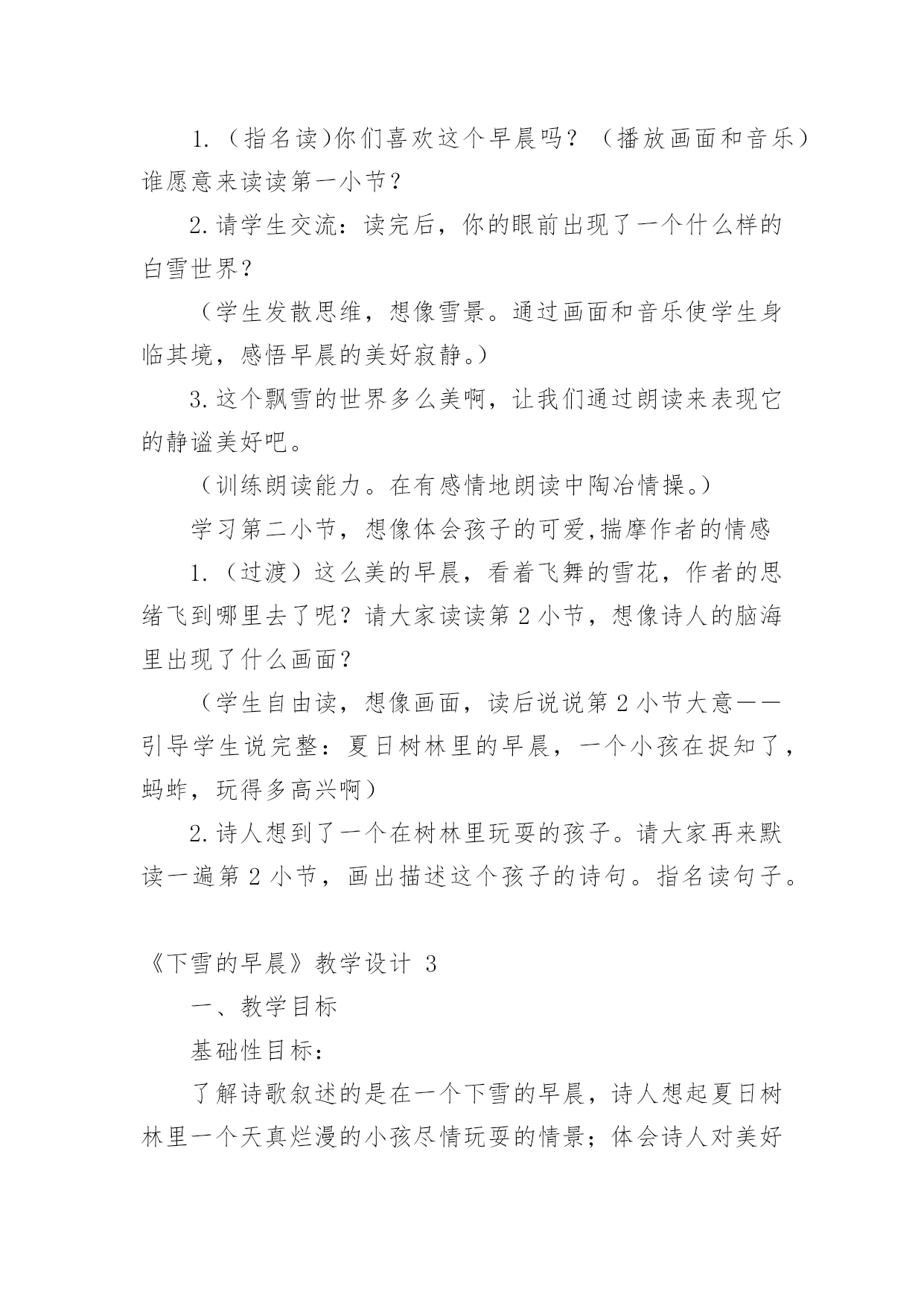《下雪的早晨》教学设计作为一名老师,时常需要编写教学设计,教学设计是连接基础理论与实践的桥梁,对于教学理论与实践的紧密结合具有沟通作用。那么问题来了,教学设计应该怎么写?以下是小编帮大家整理的《下雪的早晨》教学设计,欢迎大家分享。《下雪的早晨》教学设计1一、教学目的1.正确、流利、有感情地朗读诗歌,初步体会诗人的思想感情;2.学会本课的生字、新词。二、教学重难点1.学会本课的生字、新词,初步体会诗人在诗中表达的思想感情。三、教学过程(一)谈话导入,展示图片孩子们,你们见过雪吗?(二)介绍诗人艾青简介浙江金华人,1933年第一次用艾青这个笔名发表诗歌《大堰河——我的保姆》,代表作品有《雪落在中国的土地上》《我爱这土地》等。(三)初读感悟,扫清文字障碍1.翻开书126页,自己读诗歌,把不认识的字圈起来并想办法认识它。2.出示本课生字词3.分小节朗读(四)走进诗境,感悟诗情1.读第一小节,并思考下雪的早晨有什么特点。洁白宁静(安静)2.在这样美丽的早晨,你会想到什么生自由发挥想象3.我们一起来看看诗人和同学们的'想法是否一致生自由读第二小节,并思考看到这样的雪诗人想到了什么?夏天树林里的早晨,一个孩子在捉知了、蚂蚱4.再读第二小节,在文中找出相关的诗句并画起来。5.这个孩子时怎么捉小虫的,请用“△”把相关动词画起来引导学生抓关键词讲解人物描写方法(动作描写)5.你觉得这个小孩此时的心情怎么样呢?你是从哪里看出来的?(神态描写)6.你觉得这是一个怎样的小孩?(天真、可爱、自由自在、无忧无虑)7.指名读,把孩子的那种可爱、快乐、自由自在的感觉读出来,让大家感受一下。8.教师配乐朗读9.全班齐读。(五)布置作业熟读诗歌并背诵,想想第三小节主要讲了什么。《下雪的早晨》教学设计2教材分析:这首诗歌共三节,描述了宁静的早晨,雪花飘飞,想起了夏天树林里的小孩天真、活泼时的喜悦心情和期盼之心。教学目标:知识技能目标1.通过学习使学生巩固生字,会读一个多音字。能运用各种朗读方法正确、流利地朗读课文。2.能结合上下文及生活实际理解课文中词句的意思,在阅读中积累词语。3.理解诗人在诗中表达的情感。情感态度目标通过课文的学习,培养学生结合生活实际具体分析问题的态度和科学的思维方法。三、教学设想1.结合课后第一题,让学生在充分朗读、自学的基础上理解作者的联想。2.通过联系生活实际谈感受,理解诗人在诗中表达的情感。教学重点、难点:体会诗歌的情境,理解诗人在诗中表达的情感,有感情地朗读课文。教学方法:讨论、小组合作式。教具准备:CAI:《雪绒花》的音乐,雪花纷纷扬扬飘洒树林。课时安排:2课时教学流程:第一课时(一)导入CAI:《雪绒花》的音乐作为背景,雪花纷纷扬扬飘洒。教师:看到这样的画面,你有怎样的感受,想说点什么吗?(鼓励学生自由发挥。)人们喜爱雪,赞美雪,但每一个人对雪的感受又是不同的。有这样一位作家,他笔下的雪有别样的滋味。让我们一起来品读。(二)读中领悟课文教师:请同学们闭上眼睛,静静地听。(CAI课文朗读)1.你听懂了什么?(学生交流:诗人在下雪的'早晨想起了一个小孩;下雪的早晨,整个世界很安静……)2.读同一首诗,每个人的感受也会不一样,请大家再自由朗读一遍,说说你又什么感悟?(检验学生的读书效果。以恰当的即时评价使学生明确自己读书的收获)3.承接学生的自由发言简单概括、板书。(三)走进诗境,感悟诗情学习第一小节,创设情境,引学生入境1.(指名读)你们喜欢这个早晨吗?(播放画面和音乐)谁愿意来读读第一小节?2.请学生交流:读完后,你的眼前出现了一个什么样的白雪世界?(学生发散思维,想像雪景。通过画面和音乐使学生身临其境,感悟早晨的美好寂静。)3.这个飘雪的世界多么美啊,让我们通过朗读来表现它的静谧美好吧。(训练朗读能力。在有感情地朗读中陶冶情操。)学习第二小节,想像体会孩子的可爱,揣摩作者的情感1.(过渡)这么美的早晨,看着飞舞的雪花,作者的思绪飞到哪里去了呢?请大家读读第2小节,想像诗人的脑海里出现了什么画面?(学生自由读,想像画面,读后说说第2小节大意――引导学生说完整:夏日树林里的早晨,一个小孩在捉知了,蚂蚱,玩得多高兴啊)2.诗人想到了一个在树林里玩耍的孩子。请大家再来默读一遍第2小节,画出描述这个孩子的诗句。指名读句子。《下雪的早晨》教学设计3一、教学目标基础性目标:了解诗歌叙述的是在一个下雪的早晨,诗人想起夏日树林里一个天真烂漫的小孩尽情玩耍的情景;体会诗人对美好纯真生活的期盼向往。初步体会诗歌的韵律美,有感情地朗读诗歌,练习背诵诗歌。发展性目标:培养学生有感情地朗读诗歌的能力;渗透对诗歌意象、意境解读能力的培养,以及对诗歌象征手法的浅显认识;激发学生的灵感,创编诗歌,培养学生创作诗歌的兴趣。道德情感目标:在朗读诗歌的过程中,培养学
