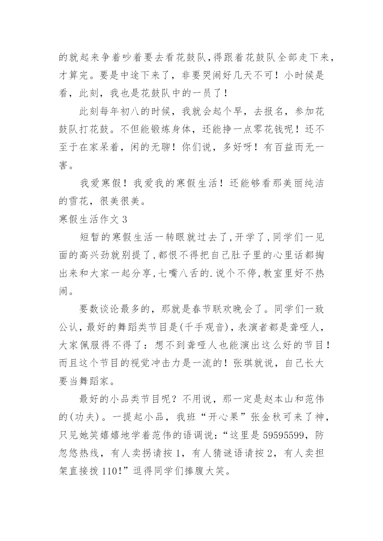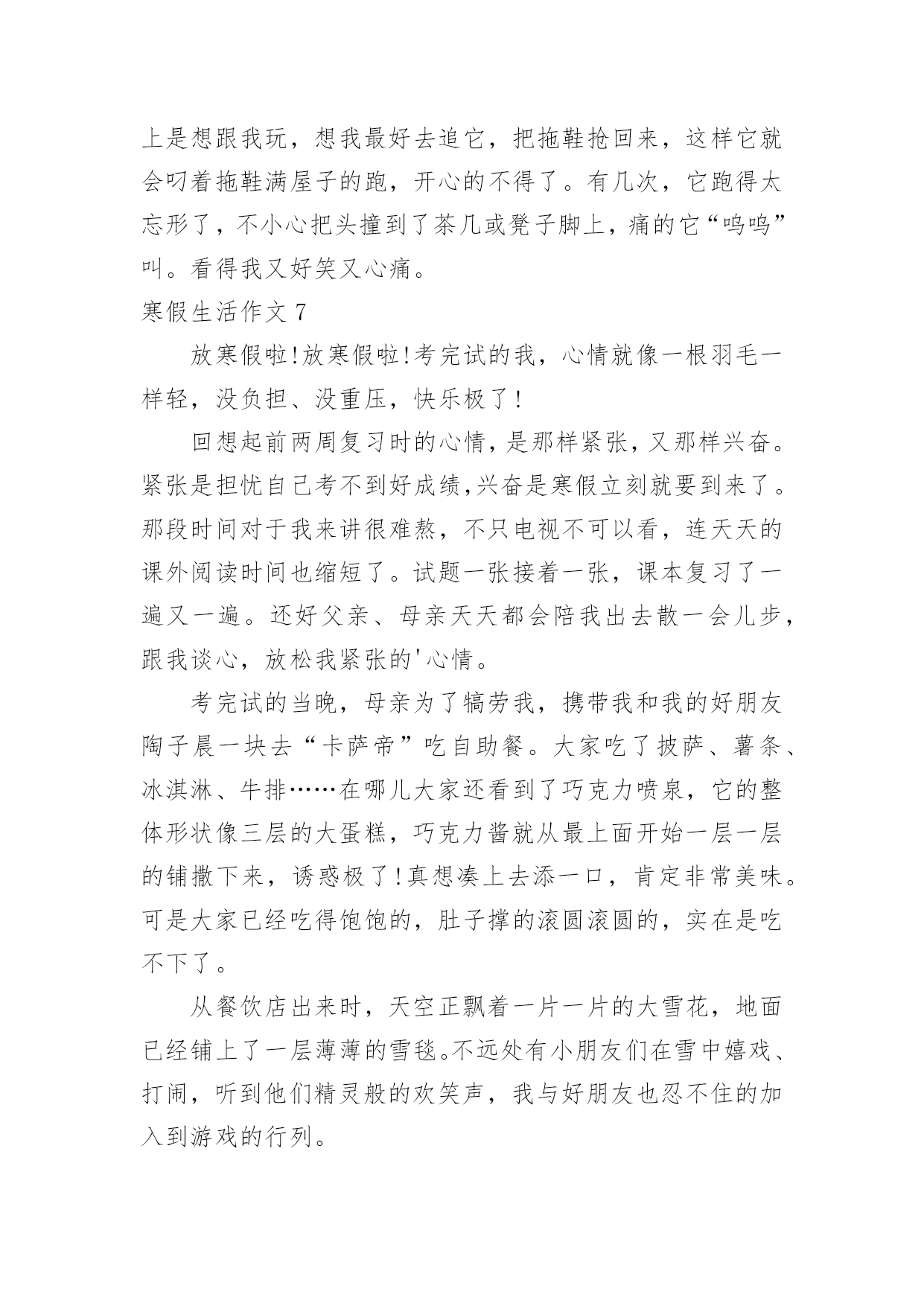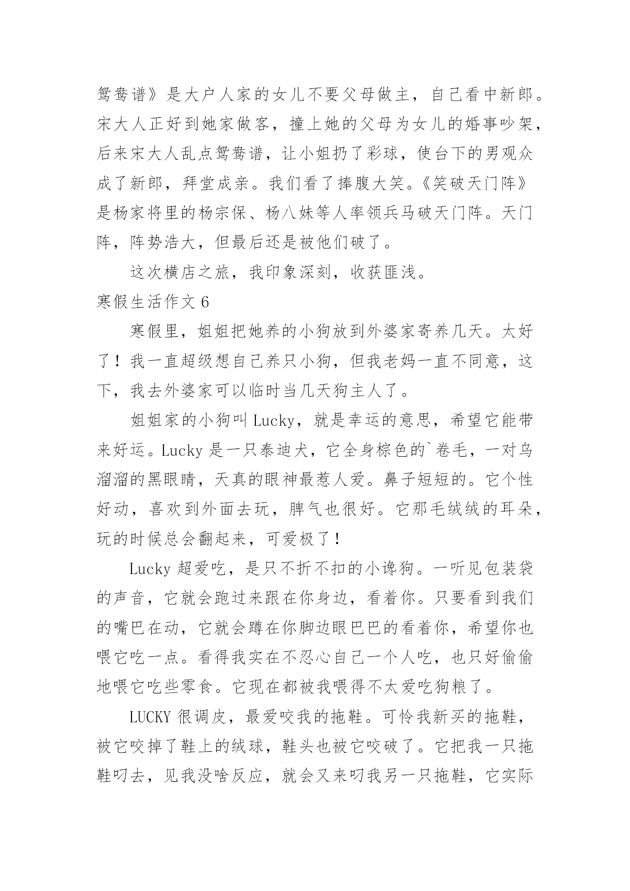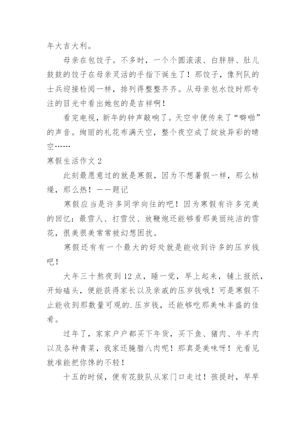 寒假生活作文寒假生活作文【优选】在平凡的学习、工作、生活中,大家都尝试过写作文吧,作文要求篇章结构完整,一定要避免无结尾作文的出现。那么你有了解过作文吗?以下是小编整理的寒假生活作文,仅供参考,希望能够帮助到大家。寒假生活作文1寒假里最让人兴奋难忘的时刻是岁尾迎接旧历新年的时刻。大人们忙着预备年货;小孩子则这儿以堆,那儿一簇,那时不时的一声爆竹脆响,炸响了一阵爆竹似的欢呼。这时,即便是空气里也弥漫着高兴和快乐。而最难忘的,则是除夕之夜了。在我们老家,除夕夜里“迎家堂”(迎接时期的祖辈们”回家过年”)和“迎财神”是必不可少的仪式。天刚黑下,晚饭过后,父亲就带着我们去“迎家堂”了。当那被父亲刷的整整齐齐的黄表纸点燃的时候,透着忽明忽暗的火花,我看家跪在地上磕头的父亲一脸的虔诚,嘴里还嘟嘟囔囔地说着什么。我在心里暗笑,终于忍不住“扑哧"一下笑出声来,迎来是父亲责备的`眼神。我噤声。这时我周围的空气中充溢着黄表纸燃烧过的纸香。这种庄严的仪式过后,父亲叮嘱我,过年了,要说吉祥话,以祈求新的一年大吉大利。母亲在包饺子。不多时,一个个圆滚滚、白胖胖、肚儿鼓鼓的饺子在母亲灵活的手指下诞生了!那饺子,像列队的士兵迎接检阅一样,排列得整整齐齐。从母亲包水饺时那专注的目光中看出她包的是吉祥啊!看完电视,新年的钟声敲响了。天空中便传来了“噼啪”的声音。绚丽的礼花布满天空,整个夜空成了绽放异彩的晴空……寒假生活作文2此刻最愿意过的就是寒假,因为不想暑假一样,那么枯燥,那么热!――题记寒假应当是许多同学向往的吧!因为寒假有许多完美的回忆:最雪人、打雪仗、放鞭炮还能够看那美丽纯洁的雪花,很美很美常常被幻想困扰。寒假还有有一个最大的好处就是能收到许多的压岁钱吧!大年三十熬夜到12点,睡一觉,早上起来,铺上报纸,开始磕头,便能获得家长以及亲戚的压岁钱哦!可是寒假不止能收到那数量可观的.压岁钱,还能够吃那美味丰盛的佳肴。过年了,家家户户都买下年货,买下鱼、猪肉、牛羊肉以及各种青菜,我家还腌腊八肉呢!那真是美味呀!光看见就准能把你馋的不轻!十五的时候,便有花鼓队从家门口走过!孩提时,早早的就起来争着吵着要去看花鼓队,得跟着花鼓队全部走下来,才算完。要是中途下来了,非要哭闹好几天不可!小时候是看,此刻,我也是花鼓队中的一员了!此刻每年初八的时候,我就会起个早,去报名,参加花鼓队打花鼓。不但能锻炼身体,还能挣一点零花钱呢!还不至于在家呆着,闲的无聊!你们说,多好呀!有百益而无一害。我爱寒假!我爱我的寒假生活!还能够看那美丽纯洁的雪花,很美很美。寒假生活作文3短暂的寒假生活一转眼就过去了,开学了,同学们一见面的高兴劲就别提了,都恨不得把自己肚子里的心里话都掏出来和大家一起分享,七嘴八舌的.说个不停,教室里好不热闹。要数谈论最多的,那就是春节联欢晚会了。同学们一致公认,最好的舞蹈类节目是(千手观音),表演者都是聋哑人,大家佩服得不得了:想不到聋哑人也能演出这么好的节目!而且这个节目的视觉冲击力是一流的!张琪就说,自己长大要当舞蹈家。最好的小品类节目呢?不用说,那一定是赵本山和范伟的(功夫)。一提起小品,我班“开心果”张金秋可来了神,只见她笑嬉嬉地学着范伟的语调说:“这里是59595599,防忽悠热线,有人卖拐请按1,有人猜谜语请按2,有人卖担架直接拨110!”逗得同学们捧腹大笑。“告诉你们,我可是在浪漫情人节过生日!”转头一看,原来我班“淑女”陆霄也加入了讨论。教室里乱成了一锅粥,大家有的说自己看了什么书,有的说自己寒假去哪儿玩,有的说自己在春节得了多少压岁钱。有的话题重来重去,同学们也不觉得烦。尽情地说吧,尽情地谈吧!不知明年我们又会在哪儿,和谁一起漫谈寒假生活呢?寒假生活作文4期末考试一出考场,我和斌斌哥哥就兴奋地上了飞机回老家了,飞机上的人可真多,午餐有两种,猪肉面,还有鱼肉饭,我选了猪肉面,吃得美美的`,下了飞机,我们就坐车回到山西老家,然后有个叔叔接我回到爷爷家,那时已到晚上,一回来我就写了两页寒假作业,晚上吃了两个大油糕,我第一次睡爷爷家的大热炕,临睡前脱了衣服兴奋地在爷爷家的大热炕上跳来跳去,结果半夜里肚子疼得要命,然后在家休息了两天就好了,回来过了四、五天就下雪了,我好高兴,接到手上一看,发现雪花有各种形状,过一会儿就化成水了,这次下得少,一天时间就都融化了。过了两天,又下了场大雪,这次雪下得比较大,我和爷爷在院子里堆了个雪人,我还想打雪仗,爷爷怕我着凉没打,不过仍然很开心,今年真正见到下雪了。每天晚上我和爷爷、奶奶“斗地主”,过几天爸爸妈妈回来了,马上就要过年了,老家过年可真热闹,贴对联、垒旺火、包饺子、放鞭炮,爷爷给我买了好多种炮,每晚都放几种,我最喜欢米奇图案的那种,好炫!大年初一我和爸爸妈妈出去拜年,路上大雪冻得地面上滑滑的,到处都是冰,我们一