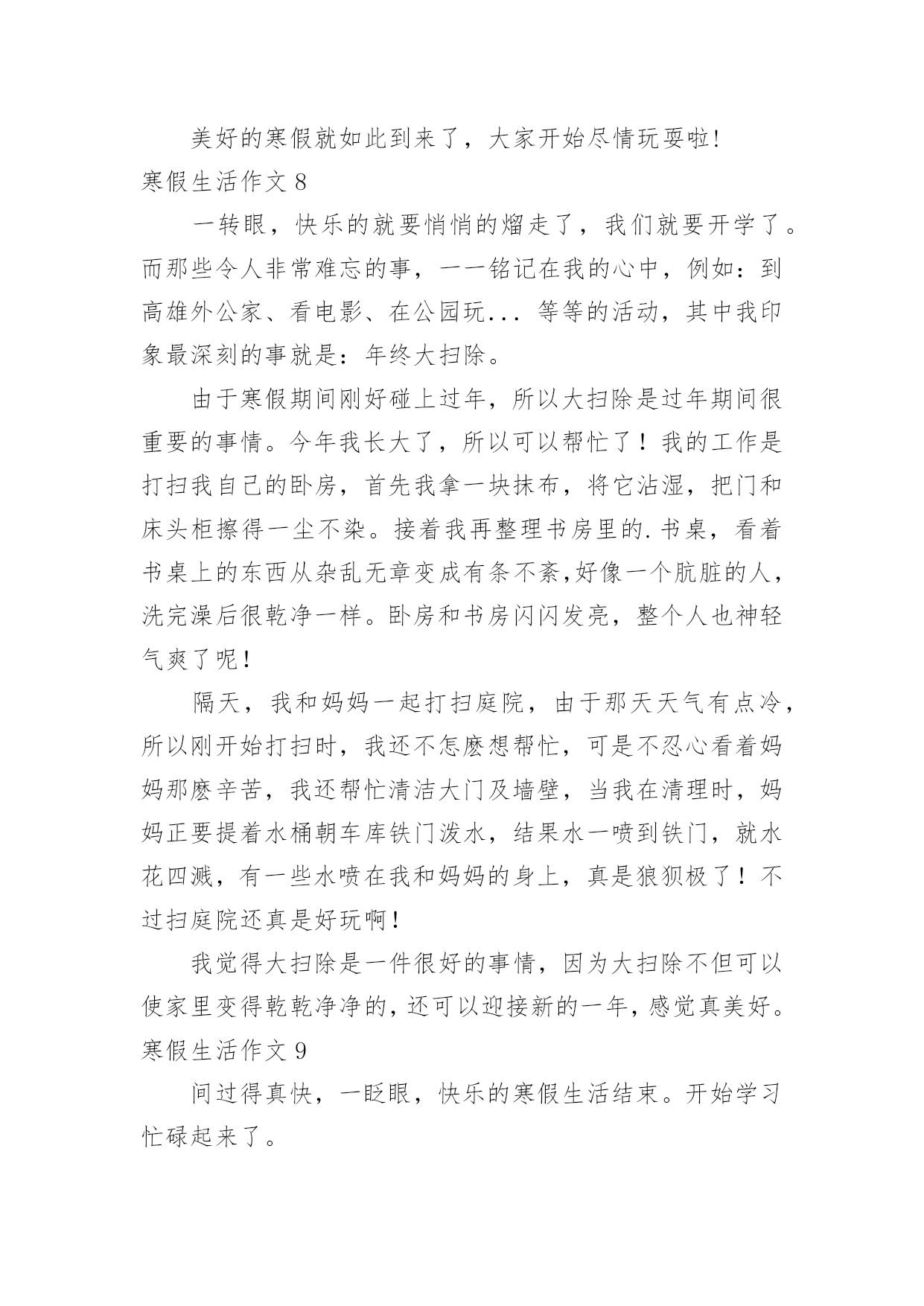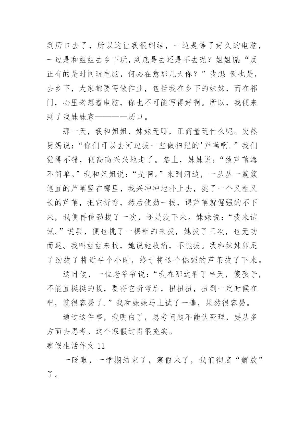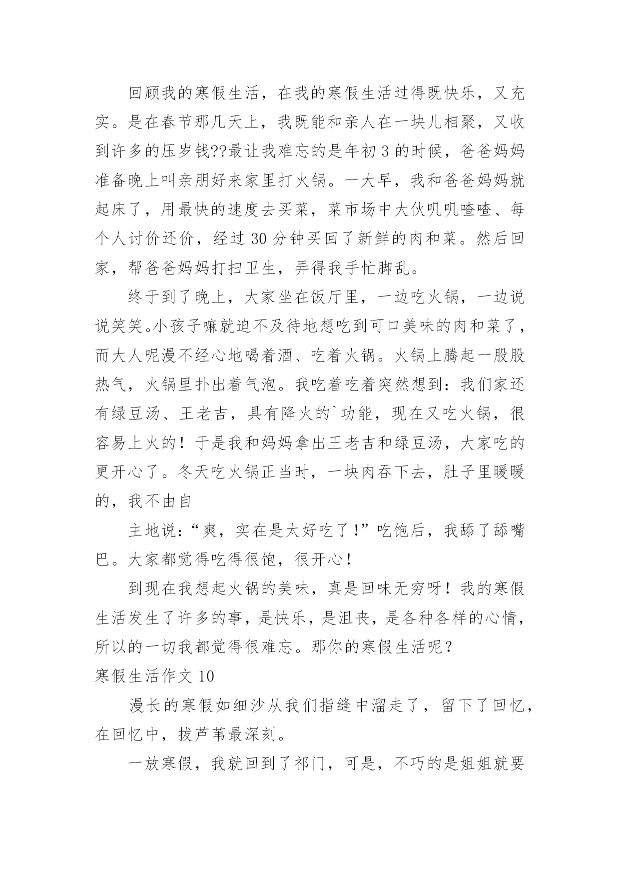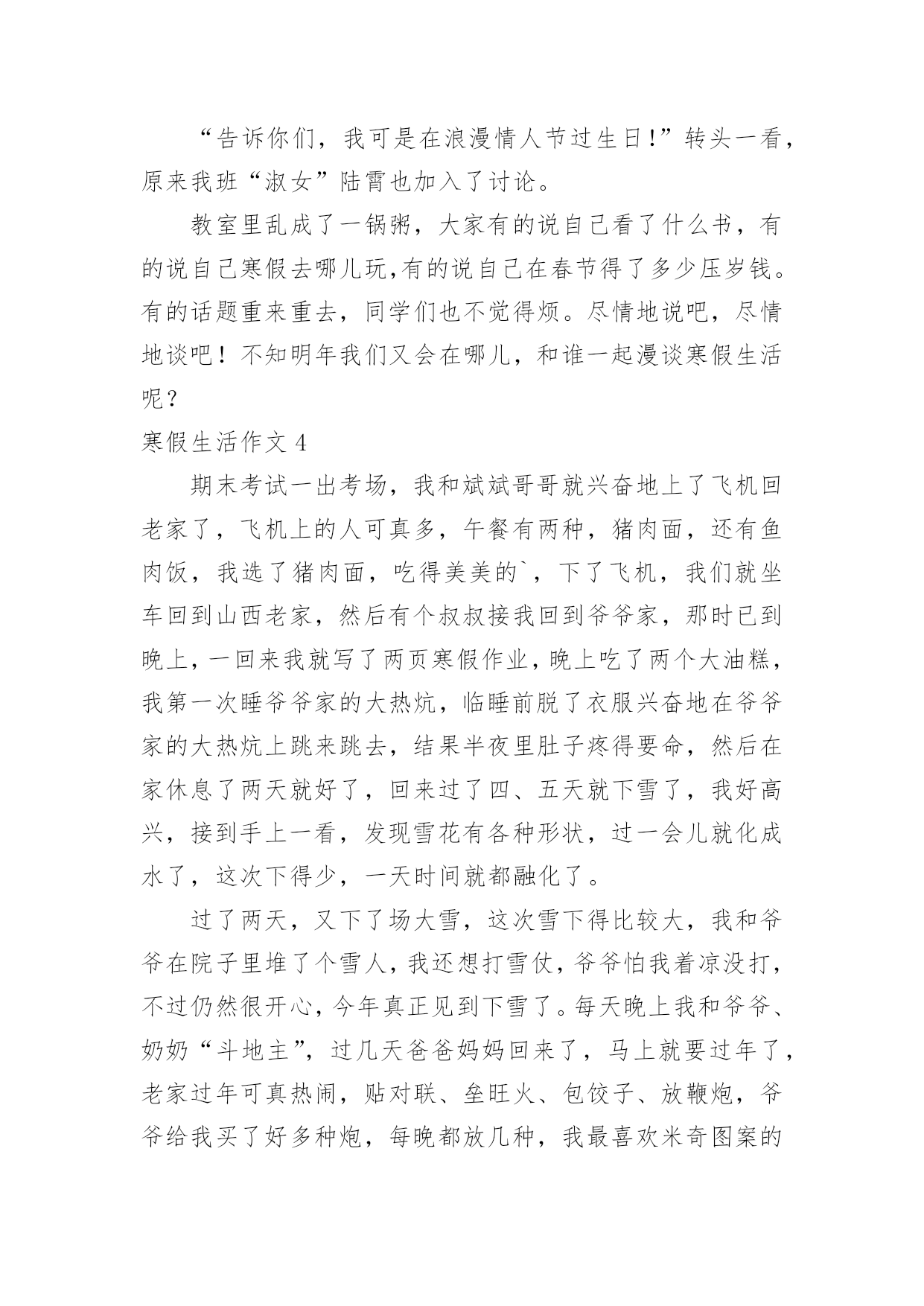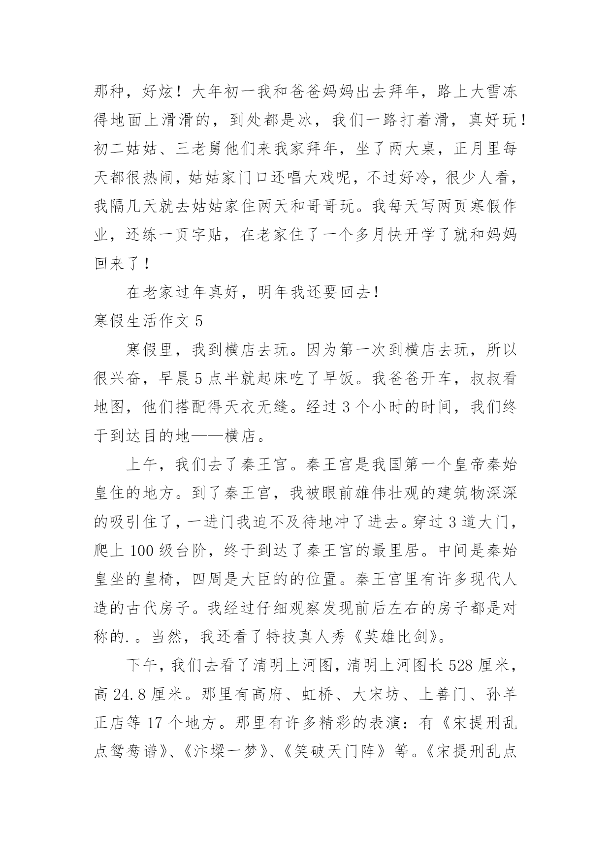 寒假生活作文寒假生活作文【优选】在平凡的学习、工作、生活中,大家都尝试过写作文吧,作文要求篇章结构完整,一定要避免无结尾作文的出现。那么你有了解过作文吗?以下是小编整理的寒假生活作文,仅供参考,希望能够帮助到大家。寒假生活作文1寒假里最让人兴奋难忘的时刻是岁尾迎接旧历新年的时刻。大人们忙着预备年货;小孩子则这儿以堆,那儿一簇,那时不时的一声爆竹脆响,炸响了一阵爆竹似的欢呼。这时,即便是空气里也弥漫着高兴和快乐。而最难忘的,则是除夕之夜了。在我们老家,除夕夜里“迎家堂”(迎接时期的祖辈们”回家过年”)和“迎财神”是必不可少的仪式。天刚黑下,晚饭过后,父亲就带着我们去“迎家堂”了。当那被父亲刷的整整齐齐的黄表纸点燃的时候,透着忽明忽暗的火花,我看家跪在地上磕头的父亲一脸的虔诚,嘴里还嘟嘟囔囔地说着什么。我在心里暗笑,终于忍不住“扑哧"一下笑出声来,迎来是父亲责备的`眼神。我噤声。这时我周围的空气中充溢着黄表纸燃烧过的纸香。这种庄严的仪式过后,父亲叮嘱我,过年了,要说吉祥话,以祈求新的一年大吉大利。母亲在包饺子。不多时,一个个圆滚滚、白胖胖、肚儿鼓鼓的饺子在母亲灵活的手指下诞生了!那饺子,像列队的士兵迎接检阅一样,排列得整整齐齐。从母亲包水饺时那专注的目光中看出她包的是吉祥啊!看完电视,新年的钟声敲响了。天空中便传来了“噼啪”的声音。绚丽的礼花布满天空,整个夜空成了绽放异彩的晴空……寒假生活作文2此刻最愿意过的就是寒假,因为不想暑假一样,那么枯燥,那么热!――题记寒假应当是许多同学向往的吧!因为寒假有许多完美的回忆:最雪人、打雪仗、放鞭炮还能够看那美丽纯洁的雪花,很美很美常常被幻想困扰。寒假还有有一个最大的好处就是能收到许多的压岁钱吧!大年三十熬夜到12点,睡一觉,早上起来,铺上报纸,开始磕头,便能获得家长以及亲戚的压岁钱哦!可是寒假不止能收到那数量可观的.压岁钱,还能够吃那美味丰盛的佳肴。过年了,家家户户都买下年货,买下鱼、猪肉、牛羊肉以及各种青菜,我家还腌腊八肉呢!那真是美味呀!光看见就准能把你馋的不轻!十五的时候,便有花鼓队从家门口走过!孩提时,早早的就起来争着吵着要去看花鼓队,得跟着花鼓队全部走下来,才算完。要是中途下来了,非要哭闹好几天不可!小时候是看,此刻,我也是花鼓队中的一员了!此刻每年初八的时候,我就会起个早,去报名,参加花鼓队打花鼓。不但能锻炼身体,还能挣一点零花钱呢!还不至于在家呆着,闲的无聊!你们说,多好呀!有百益而无一害。我爱寒假!我爱我的寒假生活!还能够看那美丽纯洁的雪花,很美很美。寒假生活作文3短暂的寒假生活一转眼就过去了,开学了,同学们一见面的高兴劲就别提了,都恨不得把自己肚子里的心里话都掏出来和大家一起分享,七嘴八舌的.说个不停,教室里好不热闹。要数谈论最多的,那就是春节联欢晚会了。同学们一致公认,最好的舞蹈类节目是(千手观音),表演者都是聋哑人,大家佩服得不得了:想不到聋哑人也能演出这么好的节目!而且这个节目的视觉冲击力是一流的!张琪就说,自己长大要当舞蹈家。最好的小品类节目呢?不用说,那一定是赵本山和范伟的(功夫)。一提起小品,我班“开心果”张金秋可来了神,只见她笑嬉嬉地学着范伟的语调说:“这里是59595599,防忽悠热线,有人卖拐请按1,有人猜谜语请按2,有人卖担架直接拨110!”逗得同学们捧腹大笑。“告诉你们,我可是在浪漫情人节过生日!”转头一看,原来我班“淑女”陆霄也加入了讨论。教室里乱成了一锅粥,大家有的说自己看了什么书,有的说自己寒假去哪儿玩,有的说自己在春节得了多少压岁钱。有的话题重来重去,同学们也不觉得烦。尽情地说吧,尽情地谈吧!不知明年我们又会在哪儿,和谁一起漫谈寒假生活呢?寒假生活作文4期末考试一出考场,我和斌斌哥哥就兴奋地上了飞机回老家了,飞机上的人可真多,午餐有两种,猪肉面,还有鱼肉饭,我选了猪肉面,吃得美美的`,下了飞机,我们就坐车回到山西老家,然后有个叔叔接我回到爷爷家,那时已到晚上,一回来我就写了两页寒假作业,晚上吃了两个大油糕,我第一次睡爷爷家的大热炕,临睡前脱了衣服兴奋地在爷爷家的大热炕上跳来跳去,结果半夜里肚子疼得要命,然后在家休息了两天就好了,回来过了四、五天就下雪了,我好高兴,接到手上一看,发现雪花有各种形状,过一会儿就化成水了,这次下得少,一天时间就都融化了。过了两天,又下了场大雪,这次雪下得比较大,我和爷爷在院子里堆了个雪人,我还想打雪仗,爷爷怕我着凉没打,不过仍然很开心,今年真正见到下雪了。每天晚上我和爷爷、奶奶“斗地主”,过几天爸爸妈妈回来了,马上就要过年了,老家过年可真热闹,贴对联、垒旺火、包饺子、放鞭炮,爷爷给我买了好多种炮,每晚都放几种,我最喜欢米奇图案的那种,好炫!大年初一我和爸爸妈妈出去拜年,路上大雪冻得地面上滑滑的,到处都是冰,我们一