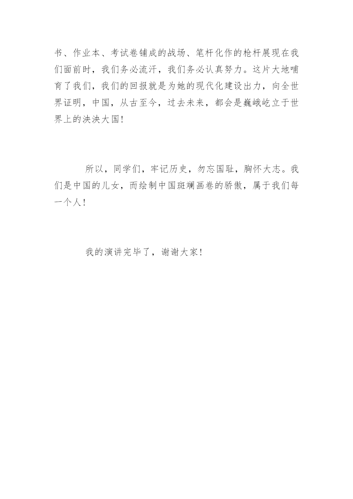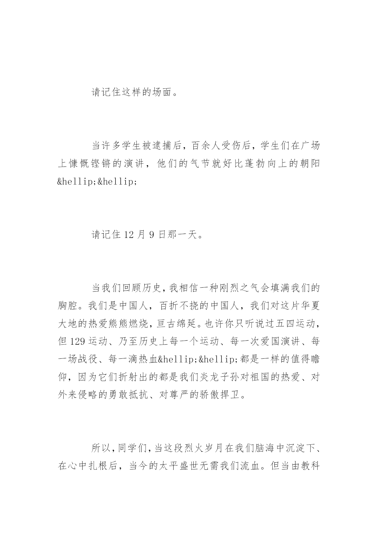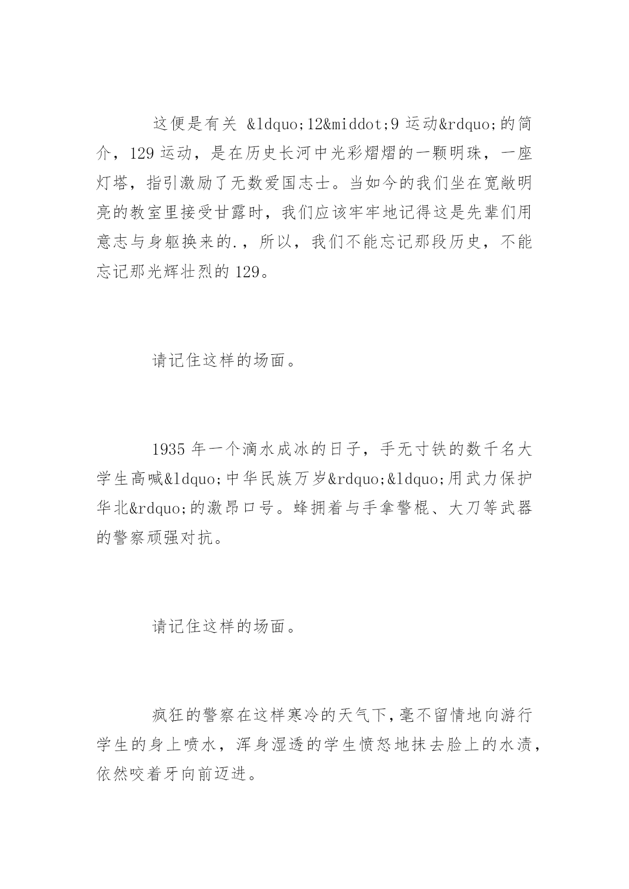一二九运动演讲稿关于一二九运动演讲稿导语:当许多学生被逮捕后,百余人受伤后,学生们在广场上慷慨铿锵的演讲,他们的气节就好比蓬勃向上的朝阳……下面是小编收集的一些一二九运动演讲稿,欢迎查阅与借鉴,谢谢。一二九运动演讲稿各位亲爱的老师们、同学们:大家好!“1935年的12月9日,北平(北京)大中学生数千人在中国共产党的领导下举行了抗日救国示威游行,反对华北自治,打倒日本帝国主义,掀起全国抗日救国新高潮,史称“一二·九”运动。这是中国共产党领导的一次大规模学生爱国运动。”这便是有关“12·9运动”的简介,129运动,是在历史长河中光彩熠熠的一颗明珠,一座灯塔,指引激励了无数爱国志士。当如今的我们坐在宽敞明亮的教室里接受甘露时,我们应该牢牢地记得这是先辈们用意志与身躯换来的.,所以,我们不能忘记那段历史,不能忘记那光辉壮烈的129。请记住这样的场面。1935年一个滴水成冰的日子,手无寸铁的数千名大学生高喊“中华民族万岁”“用武力保护华北”的激昂口号。蜂拥着与手拿警棍、大刀等武器的警察顽强对抗。请记住这样的场面。疯狂的警察在这样寒冷的天气下,毫不留情地向游行学生的身上喷水,浑身湿透的学生愤怒地抹去脸上的水渍,依然咬着牙向前迈进。请记住这样的场面。当许多学生被逮捕后,百余人受伤后,学生们在广场上慷慨铿锵的演讲,他们的气节就好比蓬勃向上的朝阳……请记住12月9日那一天。当我们回顾历史,我相信一种刚烈之气会填满我们的胸腔。我们是中国人,百折不挠的中国人,我们对这片华夏大地的热爱熊熊燃烧,亘古绵延。也许你只听说过五四运动,但129运动、乃至历史上每一个运动、每一次爱国演讲、每一场战役、每一滴热血……都是一样的值得瞻仰,因为它们折射出的都是我们炎龙子孙对祖国的热爱、对外来侵略的勇敢抵抗、对尊严的骄傲捍卫。所以,同学们,当这段烈火岁月在我们脑海中沉淀下、在心中扎根后,当今的太平盛世无需我们流血。但当由教科书、作业本、考试卷铺成的战场、笔杆化作的枪杆展现在我们面前时,我们务必流汗,我们务必认真努力。这片大地哺育了我们,我们的回报就是为她的现代化建设出力,向全世界证明,中国,从古至今,过去未来,都会是巍峨屹立于世界上的泱泱大国!所以,同学们,牢记历史,勿忘国耻,胸怀大志。我们是中国的儿女,而绘制中国斑斓画卷的骄傲,属于我们每一个人!我的演讲完毕了,谢谢大家!