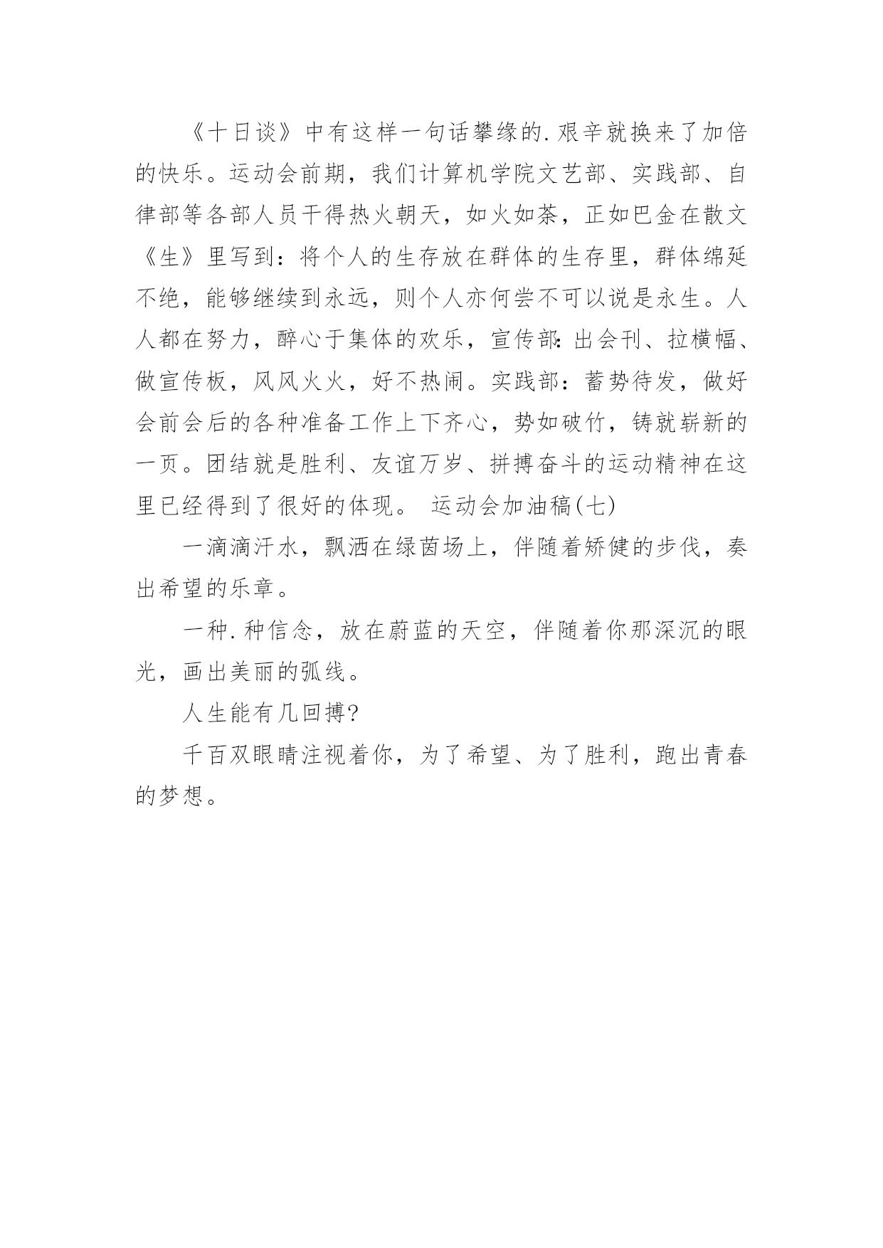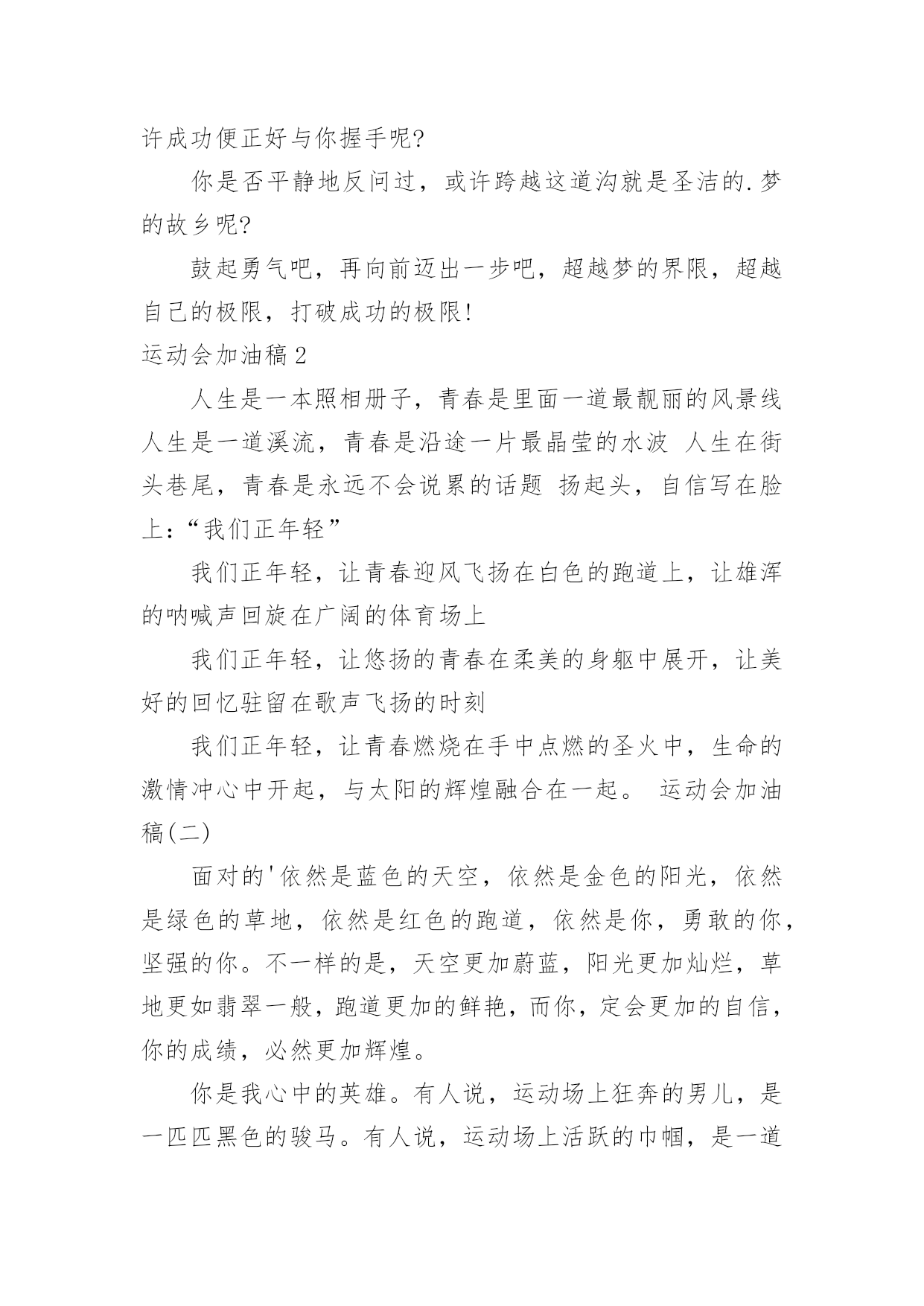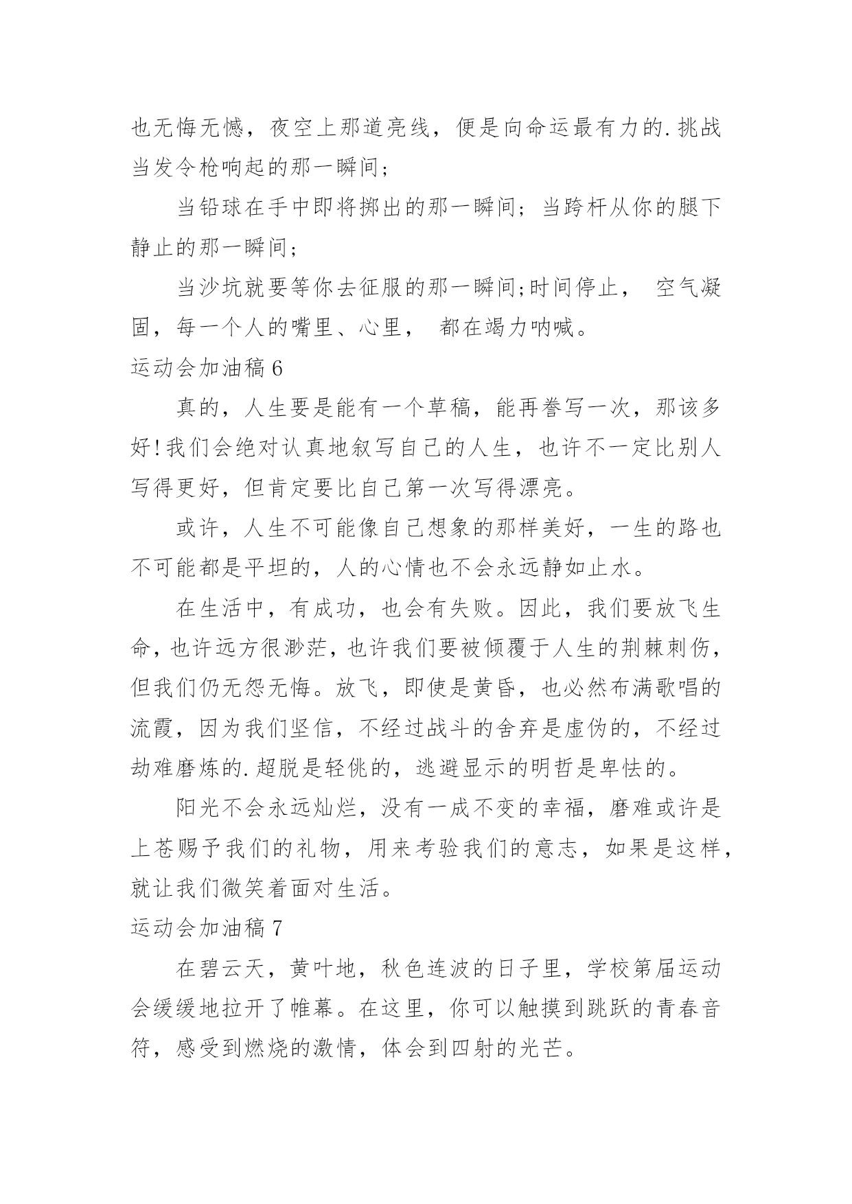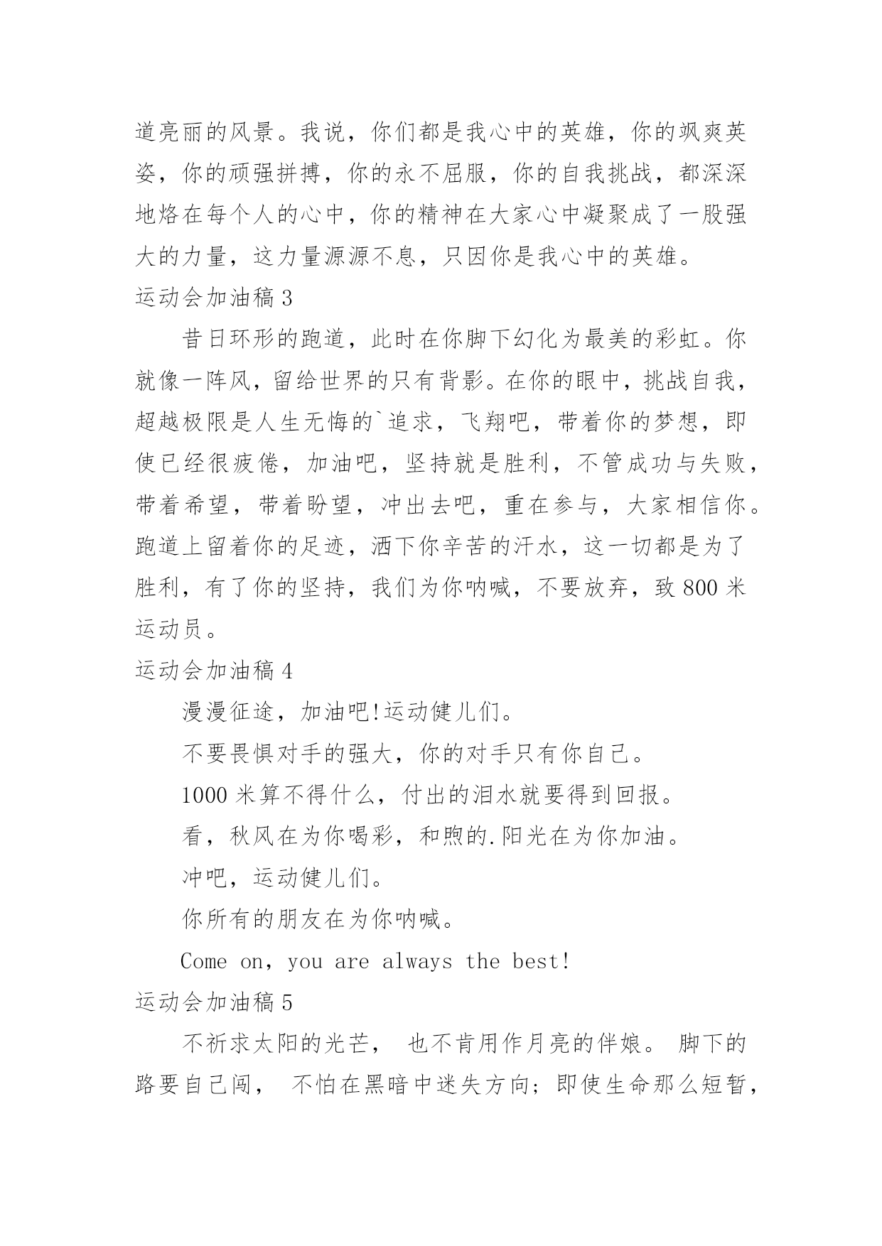 运动会加油稿运动会加油稿[汇总7篇]随着社会一步步向前发展,很多地方都会使用到加油稿,加油稿可以增添对方必胜的勇气和信心。还是对加油稿一筹莫展吗?下面是小编为大家整理的运动会加油稿,希望能够帮助到大家。运动会加油稿1走过的岁月,有欢笑,也有苦涩。泪水告诉我一个跌倒的故事,汗水使我多了一份沉重,几多成熟。理想毕竟不同于现实,失败是生活的一部分,谁也无法选择,无法拒绝。生要自己去拼搏,去奋斗,在风雨中百屈不挠、勇往直前,在自己的每个驿站都留下一段无悔的回忆。泪不是失落,徘徊不是迷惑,成功属于那些战胜失败,坚持不懈,勇于追求梦想的人。运动会加油稿(五)或许你努力过,争取过,但还是与成功的掌声和鲜花擦肩而过。或许你尝试过,失败过,但成功的火焰就是无法熊熊燃烧。或许你面对沟壑时,犹豫过,害怕过,徘徊过,伤心过,滞步过。但朋友,你是否冷静地思考过,或许你再往前一步,或许成功便正好与你握手呢?你是否平静地反问过,或许跨越这道沟就是圣洁的.梦的故乡呢?鼓起勇气吧,再向前迈出一步吧,超越梦的界限,超越自己的极限,打破成功的极限!运动会加油稿2人生是一本照相册子,青春是里面一道最靓丽的风景线人生是一道溪流,青春是沿途一片最晶莹的水波人生在街头巷尾,青春是永远不会说累的话题扬起头,自信写在脸上:“我们正年轻”我们正年轻,让青春迎风飞扬在白色的跑道上,让雄浑的呐喊声回旋在广阔的体育场上我们正年轻,让悠扬的青春在柔美的身躯中展开,让美好的回忆驻留在歌声飞扬的时刻我们正年轻,让青春燃烧在手中点燃的圣火中,生命的激情冲心中开起,与太阳的辉煌融合在一起。运动会加油稿(二)面对的'依然是蓝色的天空,依然是金色的阳光,依然是绿色的草地,依然是红色的跑道,依然是你,勇敢的你,坚强的你。不一样的是,天空更加蔚蓝,阳光更加灿烂,草地更如翡翠一般,跑道更加的鲜艳,而你,定会更加的自信,你的成绩,必然更加辉煌。你是我心中的英雄。有人说,运动场上狂奔的男儿,是一匹匹黑色的骏马。有人说,运动场上活跃的巾帼,是一道道亮丽的风景。我说,你们都是我心中的英雄,你的飒爽英姿,你的顽强拼搏,你的永不屈服,你的自我挑战,都深深地烙在每个人的心中,你的精神在大家心中凝聚成了一股强大的力量,这力量源源不息,只因你是我心中的英雄。运动会加油稿3昔日环形的跑道,此时在你脚下幻化为最美的彩虹。你就像一阵风,留给世界的只有背影。在你的眼中,挑战自我,超越极限是人生无悔的`追求,飞翔吧,带着你的梦想,即使已经很疲倦,加油吧,坚持就是胜利,不管成功与失败,带着希望,带着盼望,冲出去吧,重在参与,大家相信你。跑道上留着你的足迹,洒下你辛苦的汗水,这一切都是为了胜利,有了你的坚持,我们为你呐喊,不要放弃,致800米运动员。运动会加油稿4漫漫征途,加油吧!运动健儿们。不要畏惧对手的强大,你的对手只有你自己。1000米算不得什么,付出的泪水就要得到回报。看,秋风在为你喝彩,和煦的.阳光在为你加油。冲吧,运动健儿们。你所有的朋友在为你呐喊。Comeon,youarealwaysthebest!运动会加油稿5不祈求太阳的光芒,也不肯用作月亮的伴娘。脚下的路要自己闯,不怕在黑暗中迷失方向;即使生命那么短暂,也无悔无憾,夜空上那道亮线,便是向命运最有力的.挑战当发令枪响起的那一瞬间;当铅球在手中即将掷出的那一瞬间;当跨杆从你的腿下静止的那一瞬间;当沙坑就要等你去征服的那一瞬间;时间停止,空气凝固,每一个人的嘴里、心里,都在竭力呐喊。运动会加油稿6真的,人生要是能有一个草稿,能再誊写一次,那该多好!我们会绝对认真地叙写自己的人生,也许不一定比别人写得更好,但肯定要比自己第一次写得漂亮。或许,人生不可能像自己想象的那样美好,一生的路也不可能都是平坦的,人的心情也不会永远静如止水。在生活中,有成功,也会有失败。因此,我们要放飞生命,也许远方很渺茫,也许我们要被倾覆于人生的荆棘刺伤,但我们仍无怨无悔。放飞,即使是黄昏,也必然布满歌唱的流霞,因为我们坚信,不经过战斗的舍弃是虚伪的,不经过劫难磨炼的.超脱是轻佻的,逃避显示的明哲是卑怯的。阳光不会永远灿烂,没有一成不变的幸福,磨难或许是上苍赐予我们的礼物,用来考验我们的意志,如果是这样,就让我们微笑着面对生活。运动会加油稿7在碧云天,黄叶地,秋色连波的日子里,学校第届运动会缓缓地拉开了帷幕。在这里,你可以触摸到跳跃的青春音符,感受到燃烧的激情,体会到四射的光芒。《十日谈》中有这样一句话攀缘的.艰辛就换来了加倍的快乐。运动会前期,我们计算机学院文艺部、实践部、自律部等各部人员干得热火朝天,如火如荼,正如巴金在散文《生》里写到:将个人的生存放在群体的生存里,群体绵延不绝,能够继续到永远,则个人亦何尝不可以说是永生。人人都在努力,醉心于集体的欢乐,宣传部:出会刊、拉横幅、做宣传板,风
