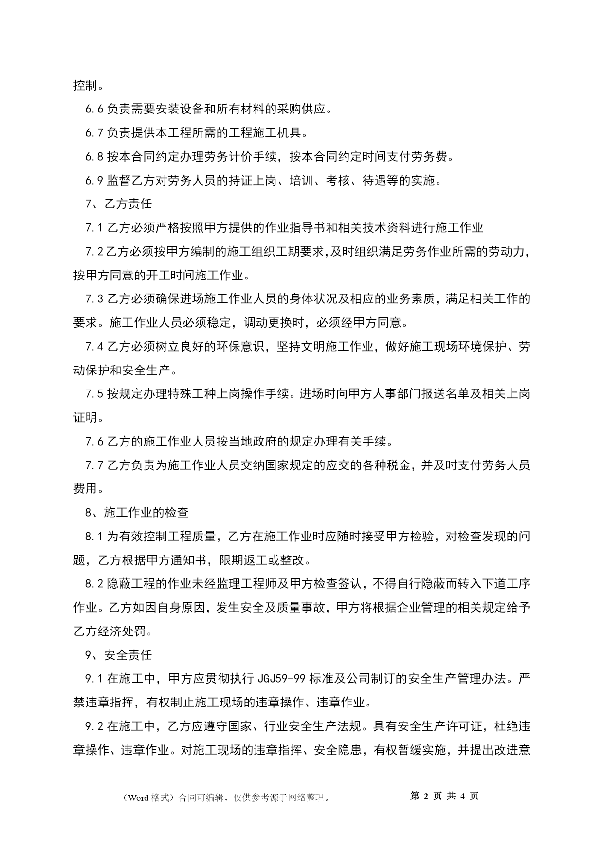第PAGE\*MERGEFORMAT4页共NUMPAGES\*MERGEFORMAT4页(Word格式)合同可编辑,仅供参考源于网络整理。产业园机电安装工程劳务用工协议雇用方(甲方):_________________劳务方(乙方):_________________根据有关法律法规,按照工程具体情况经双方协商一致,签订本劳务用工协议,双方共同遵照执行。1、用工工程项目2、用工方式3、工期按甲方编制的施工组织设计及生产计划执行。4、劳务费用4.1本工程项目的劳务费用详见附件:《劳务费用一览表》。其单价已综合包括了完成该作业项目所需全部劳务用工费用,单价不做任何调整。4.2劳务费用计算以现场实际发生的工作量为准。5、施工作业标准5.1乙方必须按照甲方提供的作业指导书及有关技术资料进行施工作业。5.2乙方的施工作业,必须满足甲方提供的技术文件要求和达到国家或行业现行的工程质量验收标准;本项目执行的质量验收规范、标准,见附表。5.3施工作业质量不合格的,乙方应在甲方规定的时间内无偿返工,达到质量验收标准合格后。6、甲方责任6.1及时为乙方提供作业指导书和相关技术资料。6.2甲方在乙方施工作业前必须对乙方按规定进行技术交底,下达该工程的安全、质量措施和工程技术标准。6.3及时组织测量和交桩6.4及时按建设单位要求进行隐蔽工程检查及办理签证手续。6.5对本工程的施工作业质量、安全、技术、物资采购、作业进度进行全方面的管理、控制。6.6负责需要安装设备和所有材料的采购供应。6.7负责提供本工程所需的工程施工机具。6.8按本合同约定办理劳务计价手续,按本合同约定时间支付劳务费。6.9监督乙方对劳务人员的持证上岗、培训、考核、待遇等的实施。7、乙方责任7.1乙方必须严格按照甲方提供的作业指导书和相关技术资料进行施工作业7.2乙方必须按甲方编制的施工组织工期要求,及时组织满足劳务作业所需的劳动力,按甲方同意的开工时间施工作业。7.3乙方必须确保进场施工作业人员的身体状况及相应的业务素质,满足相关工作的要求。施工作业人员必须稳定,调动更换时,必须经甲方同意。7.4乙方必须树立良好的环保意识,坚持文明施工作业,做好施工现场环境保护、劳动保护和安全生产。7.5按规定办理特殊工种上岗操作手续。进场时向甲方人事部门报送名单及相关上岗证明。7.6乙方的施工作业人员按当地政府的规定办理有关手续。7.7乙方负责为施工作业人员交纳国家规定的应交的各种税金,并及时支付劳务人员费用。8、施工作业的检查8.1为有效控制工程质量,乙方在施工作业时应随时接受甲方检验,对检查发现的问题,乙方根据甲方通知书,限期返工或整改。8.2隐蔽工程的作业未经监理工程师及甲方检查签认,不得自行隐蔽而转入下道工序作业。乙方如因自身原因,发生安全及质量事故,甲方将根据企业管理的相关规定给予乙方经济处罚。9、安全责任9.1在施工中,甲方应贯彻执行JGJ59-99标准及公司制订的安全生产管理办法。严禁违章指挥,有权制止施工现场的违章操作、违章作业。9.2在施工中,乙方应遵守国家、行业安全生产法规。具有安全生产许可证,杜绝违章操作、违章作业。对施工现场的违章指挥、安全隐患,有权暂缓实施,并提出改进意见。由于甲方的疏忽,发生的安全事故并不能免除乙方的安全责任和承担相应经济损失的责任。9.3乙方必须对施工作业人员进行专业安全教育,作业中发生人员伤亡事故,应按国家有关规定认真组织调查,乙方自理并承担相应经济损失。10、工程材料10.1甲方按定额消耗量,根据施工组织和进度情况,供给乙方材料,材料经双方验收签单后,乙方妥善保管,甲方派专人对材料的使用进行旁站监督。10.2在施工中,材料实际消耗量超出定额消耗量的部分,按市场价在乙方劳务工费中扣除。(其中钢材按定额量节余5%以上,水泥按定额节余7%以上,未达到者视同超耗。11、劳务费的结算11.1每月25日前由甲方按设计要求组织现场质检人员、技术负责人和施工员签认完成的合格作业量。11.2按项目预算人员核准的作业量及附表单价结算劳务费。12、劳务费的结算和拨付劳务费按月结算,根据本工程资金情况及时拨付。甲方根据施工任务书(代结方单)进行劳务费结算,结方单应由项目有关人员核定签认,项目经理签批后,于当月28日报送财务处审核,作为甲方拨款的依据。现场临设完成后可结算付款,基础施工期间不付款,基础工程完成,验收后结帐,付款80%。主体工程,乙方除了交保证金外,二个月不付款,从第三个月开始,结帐后付当月款项的70%~80%。工资中的优质价在工程质量评定后再付给。13、环境和文物保护13.1乙方应在施工作业中保护施工作业现场环境,避免和减少由于施工方法不当引起的环境污染和破坏。如有违反甲方及上级下发的有关环保条例的行为,甲方按有关规定严格处罚。1