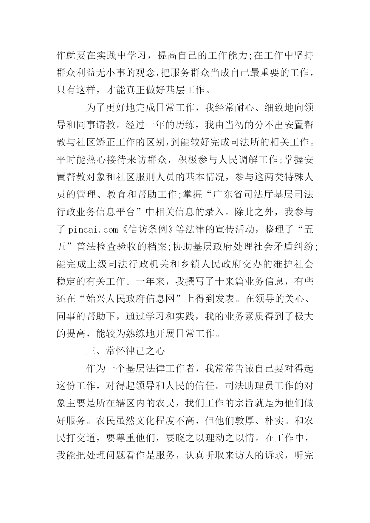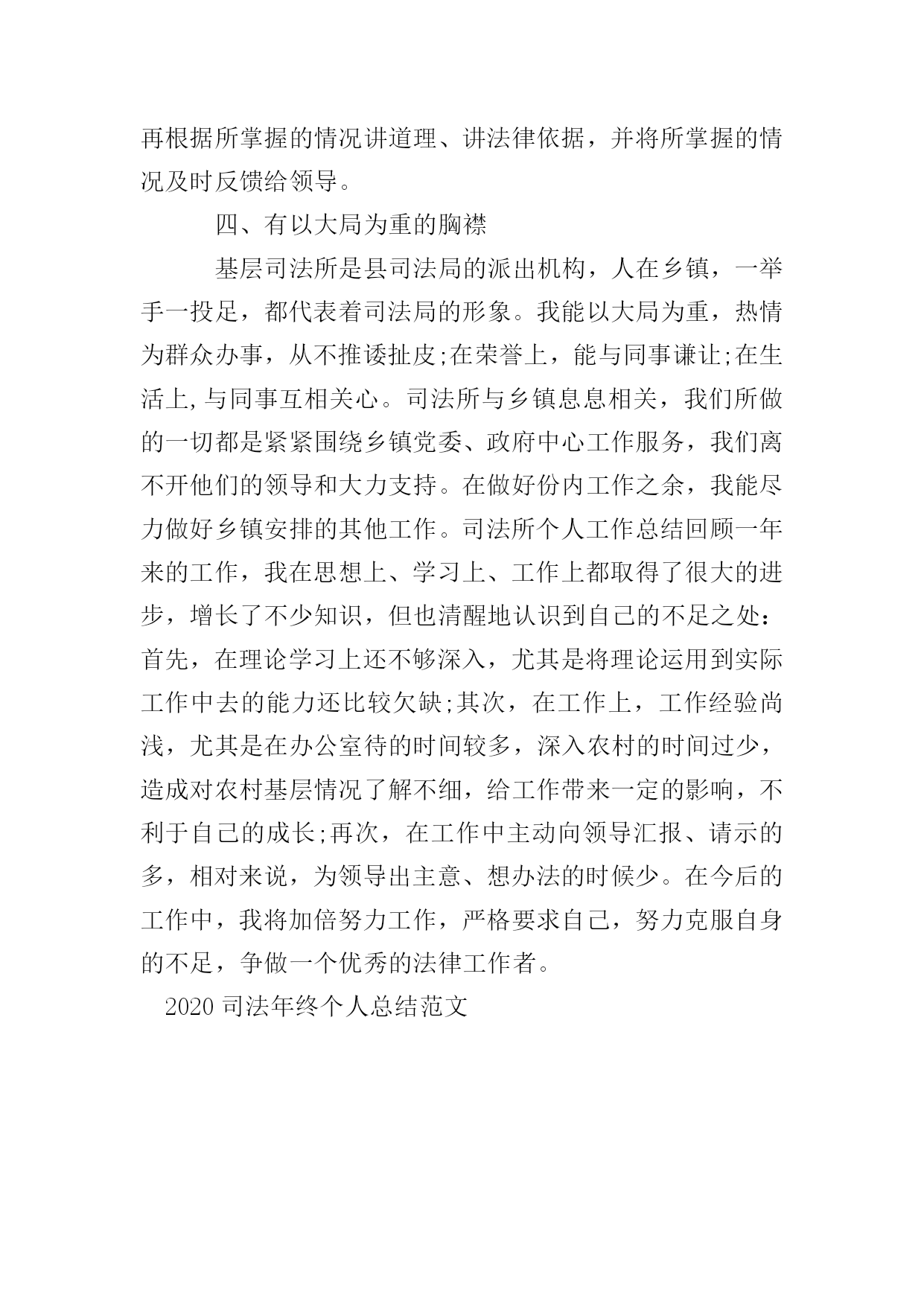 2020司法年终个人总结范文20xx年,我很荣幸地考入了某某公职律师事务所,经县司法局领导讨论决定,我被分派到司法所挂任司法助理员。通过一年来的工作,我完成了从一个学子到一个基层法律工作者的转变。一年时间不长,但在领导的关心栽培和同事们的帮助支持下,我始终勤奋学习、积极进取,努力提高自我,始终勤奋工作,认真完成任务,履行好岗位职责,得到了领导和群众的肯定。现将一年来的学习、工作情况简要总结如下:一、注重思想政治学习,提高思想认识水平作为一名基层法律工作者,我不断加强学习,不断提高自身的政治素质和道德修养,始终把学习作为提高自身政治素质和道德修养的前提和基础。充分利用一切可利用的时间,学习马列主义、毛泽东思想、邓小平理论,特别是加强学习“三个代表”重要思想和科学发展观,学习党的xx大会议精神等政治理论。通过对“三个代表”重要思想和科学发展观的学习,进一步加强了自己贯彻落实“三个代表”重要思想和科学发展观的自觉性和坚定性,进一步认识到全面贯彻落实“三个代表”重要思想和科学发展观的重要性和紧迫性。我积极向党组织靠拢,上交了《入党申请书》,学习了党的有关知识,如《中国共产党章程》、《入党教材》等。二、提高工作能力,认真完成各项工作参加工作的一年时间里,在离群众最近的地方,亲身的感受到基层工作的繁琐、责任的重大,明白要做好基层工作就要在实践中学习,提高自己的工作能力;在工作中坚持群众利益无小事的观念,把服务群众当成自己最重要的工作,只有这样,才能真正做好基层工作。为了更好地完成日常工作,我经常耐心、细致地向领导和同事请教。经过一年的历练,我由当初的分不出安置帮教与社区矫正工作的区别,到能较好完成司法所的相关工作。平时能热心接待来访群众,积极参与人民调解工作;掌握安置帮教对象和社区服刑人员的基本情况,参与这两类特殊人员的管理、教育和帮助工作;掌握“广东省司法厅基层司法行政业务信息平台”中相关信息的录入。除此之外,我参与了pincai.com《信访条例》等法律的宣传活动,整理了“五五”普法检查验收的档案;协助基层政府处理社会矛盾纠纷;能完成上级司法行政机关和乡镇人民政府交办的维护社会稳定的有关工作。一年来,我撰写了十来篇业务信息,有些还在“始兴人民政府信息网”上得到发表。在领导的关心、同事的帮助下,通过学习和实践,我的业务素质得到了极大的提高,能较为熟练地开展日常工作。三、常怀律己之心作为一个基层法律工作者,我常常告诫自己要对得起这份工作,对得起领导和人民的信任。司法助理员工作的对象主要是所在辖区内的农民,我们工作的宗旨就是为他们做好服务。农民虽然文化程度不高,但他们敦厚、朴实。和农民打交道,要尊重他们,要晓之以理动之以情。在工作中,我能把处理问题看作是服务,认真听取来访人的诉求,听完再根据所掌握的情况讲道理、讲法律依据,并将所掌握的情况及时反馈给领导。四、有以大局为重的胸襟基层司法所是县司法局的派出机构,人在乡镇,一举手一投足,都代表着司法局的形象。我能以大局为重,热情为群众办事,从不推诿扯皮;在荣誉上,能与同事谦让;在生活上,与同事互相关心。司法所与乡镇息息相关,我们所做的一切都是紧紧围绕乡镇党委、政府中心工作服务,我们离不开他们的领导和大力支持。在做好份内工作之余,我能尽力做好乡镇安排的其他工作。司法所个人工作总结回顾一年来的工作,我在思想上、学习上、工作上都取得了很大的进步,增长了不少知识,但也清醒地认识到自己的不足之处:首先,在理论学习上还不够深入,尤其是将理论运用到实际工作中去的能力还比较欠缺;其次,在工作上,工作经验尚浅,尤其是在办公室待的时间较多,深入农村的时间过少,造成对农村基层情况了解不细,给工作带来一定的影响,不利于自己的成长;再次,在工作中主动向领导汇报、请示的多,相对来说,为领导出主意、想办法的时候少。在今后的工作中,我将加倍努力工作,严格要求自己,努力克服自身的不足,争做一个优秀的法律工作者。2020司法年终个人总结范文