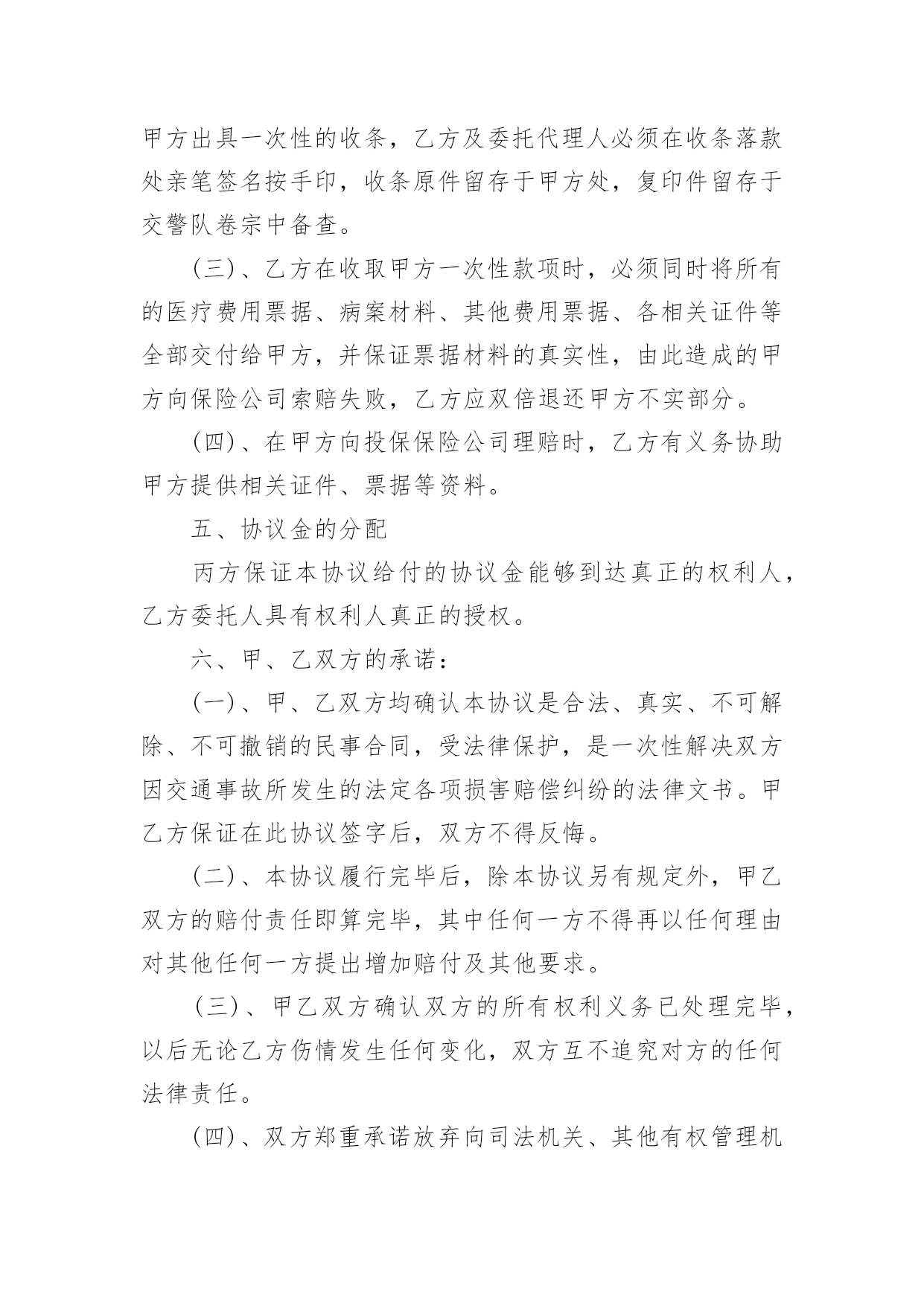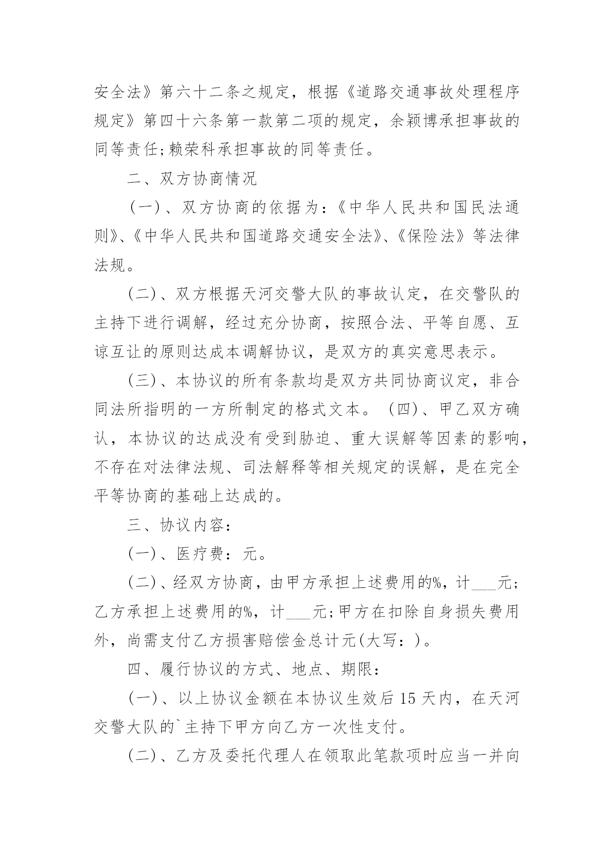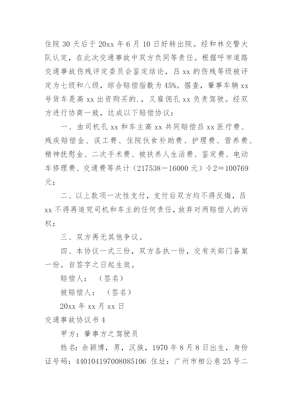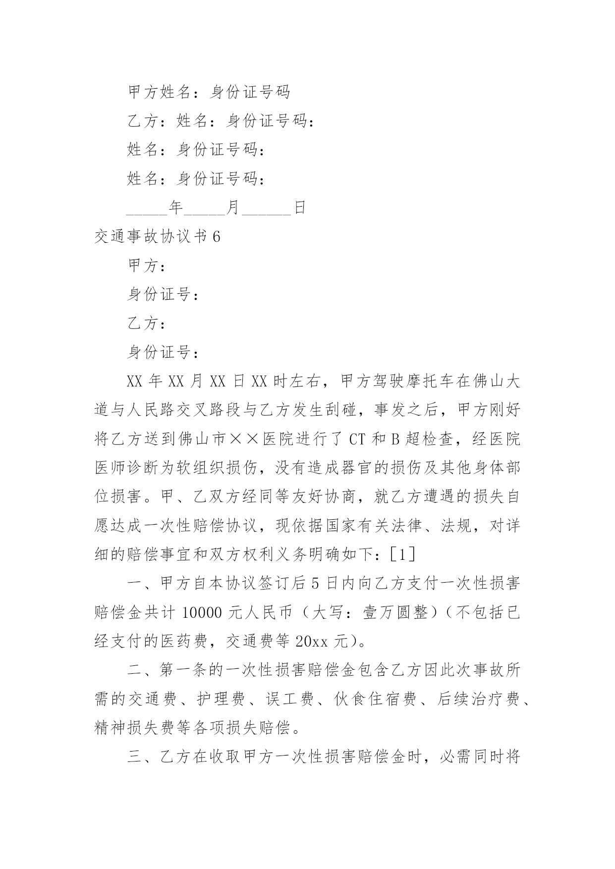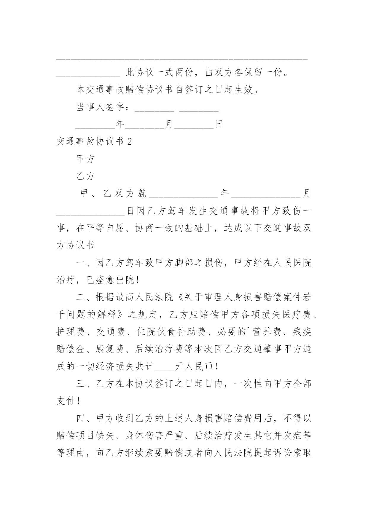 交通事故协议书交通事故协议书【实用】在当今社会生活中,各种协议频频出现,签订协议后则有法可依,有据可寻。那么协议的格式,你掌握了吗以下是小编收集整理的交通事故协议书,欢迎大家借鉴与参考,希望对大家有所帮助。交通事故协议书1甲方:________乙方:________当事人情况甲方________性别________年龄________住址________身份证号________电话________乙方________性别________年龄________住址________身份证号________电话________时间经过________________________________________________________________________________________越详细越好,时间、地点、双方驾驶的车型、行走的方向都写明经调解协商,双方共同达成如下协议:________________________________________________________________此协议一式两份,由双方各保留一份。本交通事故赔偿协议书自签订之日起生效。当事人签字:________________________年________月________日交通事故协议书2甲方乙方甲、乙双方就______________年______________月______________日因乙方驾车发生交通事故将甲方致伤一事,在平等自愿、协商一致的基础上,达成以下交通事故双方协议书一、因乙方驾车致甲方脚部之损伤,甲方经在人民医院治疗,已痊愈出院!二、根据最高人民法院《关于审理人身损害赔偿案件若干问题的解释》之规定,乙方应赔偿甲方各项损失医疗费、护理费、交通费、住院伙食补助费、必要的`营养费、残疾赔偿金、康复费、后续治疗费等本次因乙方交通肇事甲方造成的一切经济损失共计____元人民币!三、乙方在本协议签订之日起日内,一次性向甲方全部支付!四、甲方收到乙方的上述人身损害赔偿费用后,不得以赔偿项目缺失、身体伤害严重、后续治疗发生其它并发症等等理由,向乙方继续索要赔偿或者向人民法院提起诉讼索取赔偿!乙方不得以上述赔偿项目多、赔偿金额多等理由,向甲方索要赔偿费用!如一方违约,违约方要向守约方支付违约金______元!五、甲方鉴于乙方家属在事故发生后能够积极给予赔偿,达成了本调解协议!故对乙方应承担的刑事责任给予谅解,请求人民法院对乙方应付的刑事责任给予从轻、减轻处罚,对可能判处的缓刑处罚不提出任何异议!六、为保证乙方交通肇事案件的顺利进行,甲方保证在公安机关、检察机关及法院审理过程中的需要,给予积极的支持和配合!通讯地址____联系电话___!七、本交通事故双方协议书自签订之日起生效!本协议一式五份,双方当事人各一份,公安局、检察院、法院各一份!甲方乙方______________年______________月______________日______________年______________月______________日交通事故协议书3赔偿人:赔偿人:被赔偿人:20xx年5月10日,吕xx在公路上骑电动自行车正常行驶的过程中,和孔xx驾驶的xx号货车相撞,致使吕xx受伤。吕x被撞伤后立即到内蒙古医学院附属医院住院治疗,住院30天后于20xx年6月10日好转出院。经和林交警大队认定,在此次交通事故中双方负同等责任。根据呼市道路交通事故伤残评定委员会鉴定结论,吕xx的伤残等级被评定为七级和八级,综合赔偿指数为45%。据查,肇事车辆xx号货车是高xx出资购买的.,又雇佣孔xx负责驾驶。经双方进行协商一致,达成以下赔偿协议:一、由司机孔xx和车主高xx共同赔偿吕xx医疗费、残疾赔偿金、误工费、住院伙食补助费、护理费、营养费、精神抚慰金、二次手术费、被扶养人生活费、鉴定费、电动车修理费、交通费等共计(217538―16000元)÷2=100769元;二、以上款项一次性支付,支付后双方均不得反悔,吕xx不得再追究司机和车主的任何责任,放弃对两赔偿人的诉权;三、双方再无其他争议。四、本协议一式三份,双方各执一份,交有关部门备案一份。自签字之日起生效。赔偿人:(签名)被赔偿人:(签名)20xx年xx月xx日交通事故协议书4甲方:肇事方之驾驶员姓名:余颖博,男,汉族,1970年8月8日出生,身份证号码:440104197008085106住址:广州市相公巷25号二楼头,联系电话:18928810310甲方委托代理人:乙方:受伤行人姓名:赖荣科,男,汉族,1972年6月20日出生,身份证号码:4401021972062040X住址:广州市越秀区先烈中路81号大院19号301房,联系电话:13710748993乙方委托代理人:丙方