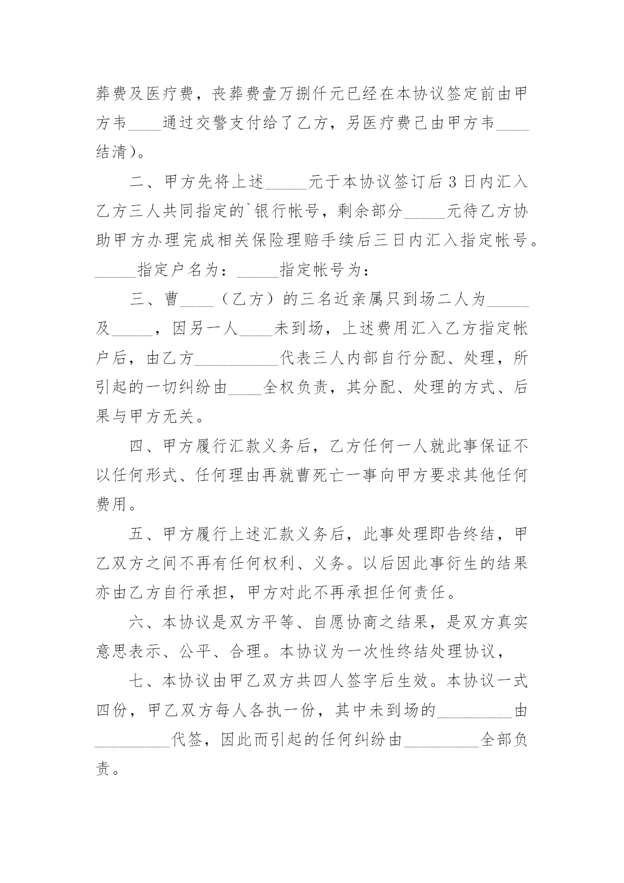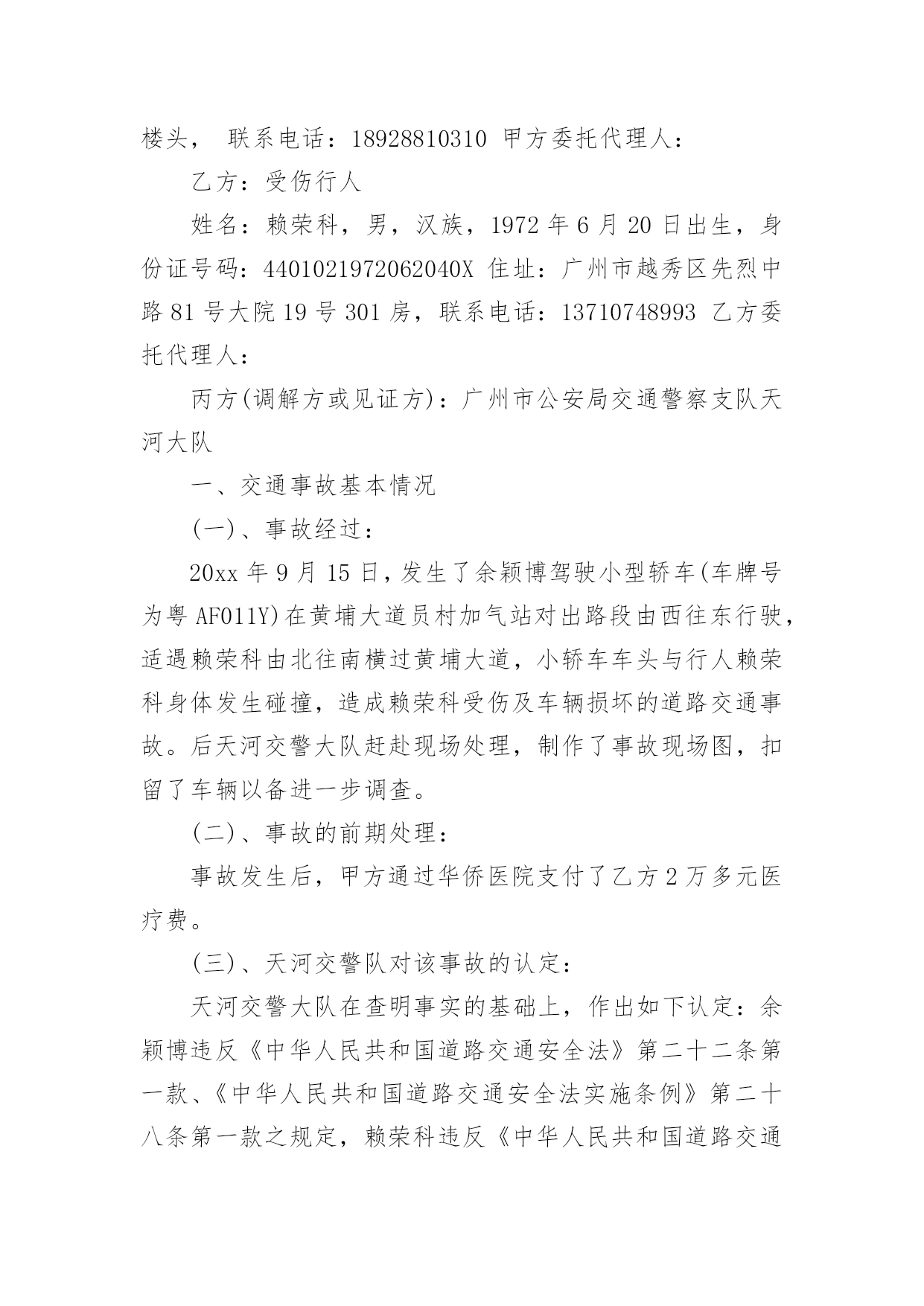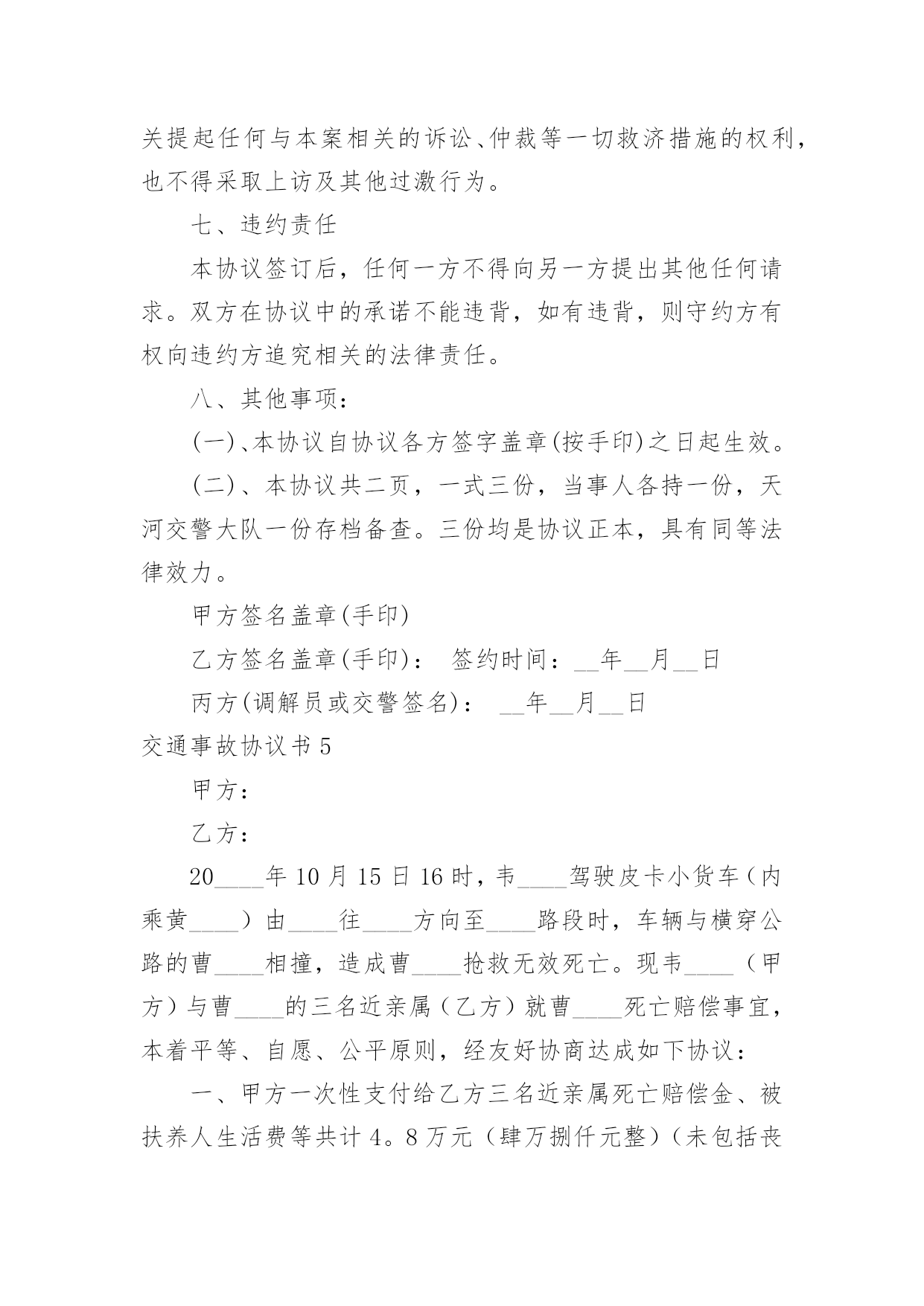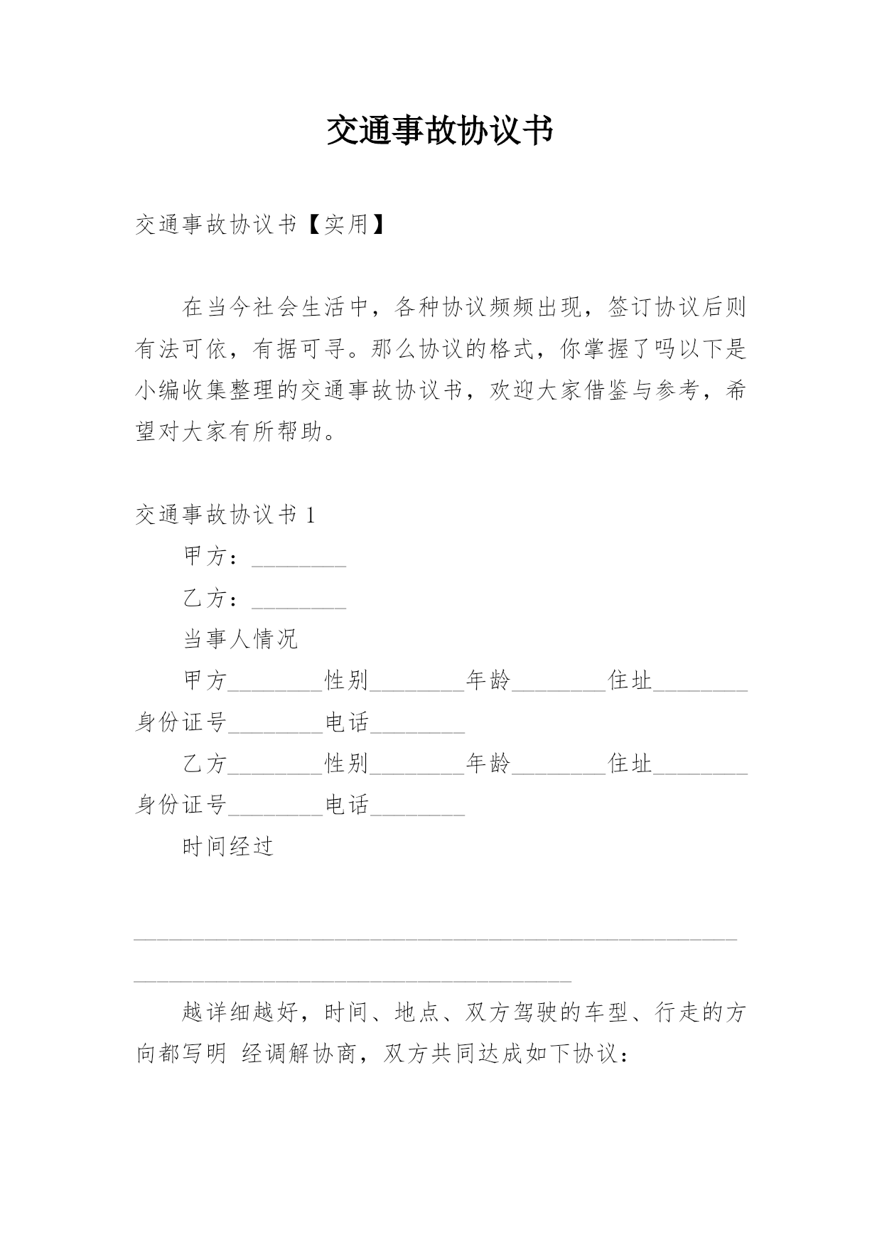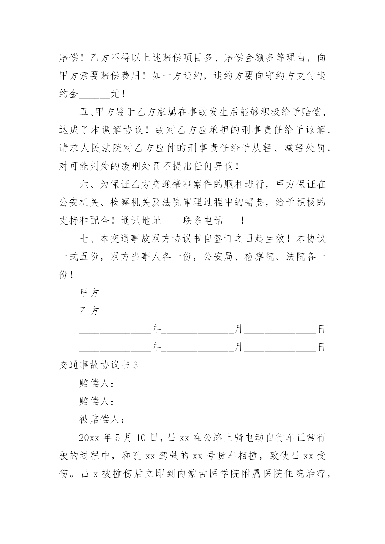 交通事故协议书交通事故协议书【实用】在当今社会生活中,各种协议频频出现,签订协议后则有法可依,有据可寻。那么协议的格式,你掌握了吗以下是小编收集整理的交通事故协议书,欢迎大家借鉴与参考,希望对大家有所帮助。交通事故协议书1甲方:________乙方:________当事人情况甲方________性别________年龄________住址________身份证号________电话________乙方________性别________年龄________住址________身份证号________电话________时间经过________________________________________________________________________________________越详细越好,时间、地点、双方驾驶的车型、行走的方向都写明经调解协商,双方共同达成如下协议:________________________________________________________________此协议一式两份,由双方各保留一份。本交通事故赔偿协议书自签订之日起生效。当事人签字:________________________年________月________日交通事故协议书2甲方乙方甲、乙双方就______________年______________月______________日因乙方驾车发生交通事故将甲方致伤一事,在平等自愿、协商一致的基础上,达成以下交通事故双方协议书一、因乙方驾车致甲方脚部之损伤,甲方经在人民医院治疗,已痊愈出院!二、根据最高人民法院《关于审理人身损害赔偿案件若干问题的解释》之规定,乙方应赔偿甲方各项损失医疗费、护理费、交通费、住院伙食补助费、必要的`营养费、残疾赔偿金、康复费、后续治疗费等本次因乙方交通肇事甲方造成的一切经济损失共计____元人民币!三、乙方在本协议签订之日起日内,一次性向甲方全部支付!四、甲方收到乙方的上述人身损害赔偿费用后,不得以赔偿项目缺失、身体伤害严重、后续治疗发生其它并发症等等理由,向乙方继续索要赔偿或者向人民法院提起诉讼索取赔偿!乙方不得以上述赔偿项目多、赔偿金额多等理由,向甲方索要赔偿费用!如一方违约,违约方要向守约方支付违约金______元!五、甲方鉴于乙方家属在事故发生后能够积极给予赔偿,达成了本调解协议!故对乙方应承担的刑事责任给予谅解,请求人民法院对乙方应付的刑事责任给予从轻、减轻处罚,对可能判处的缓刑处罚不提出任何异议!六、为保证乙方交通肇事案件的顺利进行,甲方保证在公安机关、检察机关及法院审理过程中的需要,给予积极的支持和配合!通讯地址____联系电话___!七、本交通事故双方协议书自签订之日起生效!本协议一式五份,双方当事人各一份,公安局、检察院、法院各一份!甲方乙方______________年______________月______________日______________年______________月______________日交通事故协议书3赔偿人:赔偿人:被赔偿人:20xx年5月10日,吕xx在公路上骑电动自行车正常行驶的过程中,和孔xx驾驶的xx号货车相撞,致使吕xx受伤。吕x被撞伤后立即到内蒙古医学院附属医院住院治疗,住院30天后于20xx年6月10日好转出院。经和林交警大队认定,在此次交通事故中双方负同等责任。根据呼市道路交通事故伤残评定委员会鉴定结论,吕xx的伤残等级被评定为七级和八级,综合赔偿指数为45%。据查,肇事车辆xx号货车是高xx出资购买的.,又雇佣孔xx负责驾驶。经双方进行协商一致,达成以下赔偿协议:一、由司机孔xx和车主高xx共同赔偿吕xx医疗费、残疾赔偿金、误工费、住院伙食补助费、护理费、营养费、精神抚慰金、二次手术费、被扶养人生活费、鉴定费、电动车修理费、交通费等共计(217538―16000元)÷2=100769元;二、以上款项一次性支付,支付后双方均不得反悔,吕xx不得再追究司机和车主的任何责任,放弃对两赔偿人的诉权;三、双方再无其他争议。四、本协议一式三份,双方各执一份,交有关部门备案一份。自签字之日起生效。赔偿人:(签名)被赔偿人:(签名)20xx年xx月xx日交通事故协议书4甲方:肇事方之驾驶员姓名:余颖博,男,汉族,1970年8月8日出生,身份证号码:440104197008085106住址:广州市相公巷25号二楼头,联系电话:18928810310甲方委托代理人:乙方:受伤行人姓名:赖荣科,男,汉族,1972年6月20日出生,身份证号码:4401021972062040X住址:广州市越秀区先烈中路81号大院19号301房,联系电话:13710748993乙方委托代理人:丙方