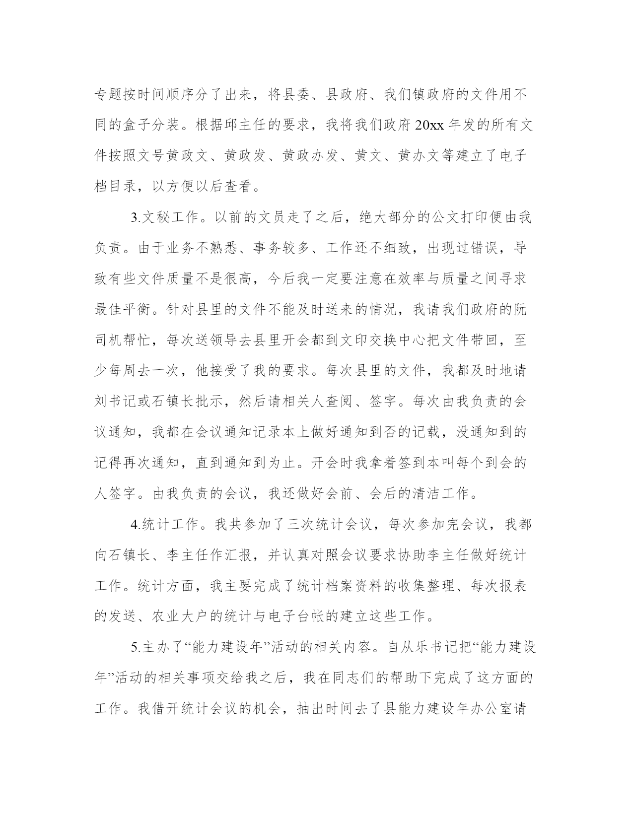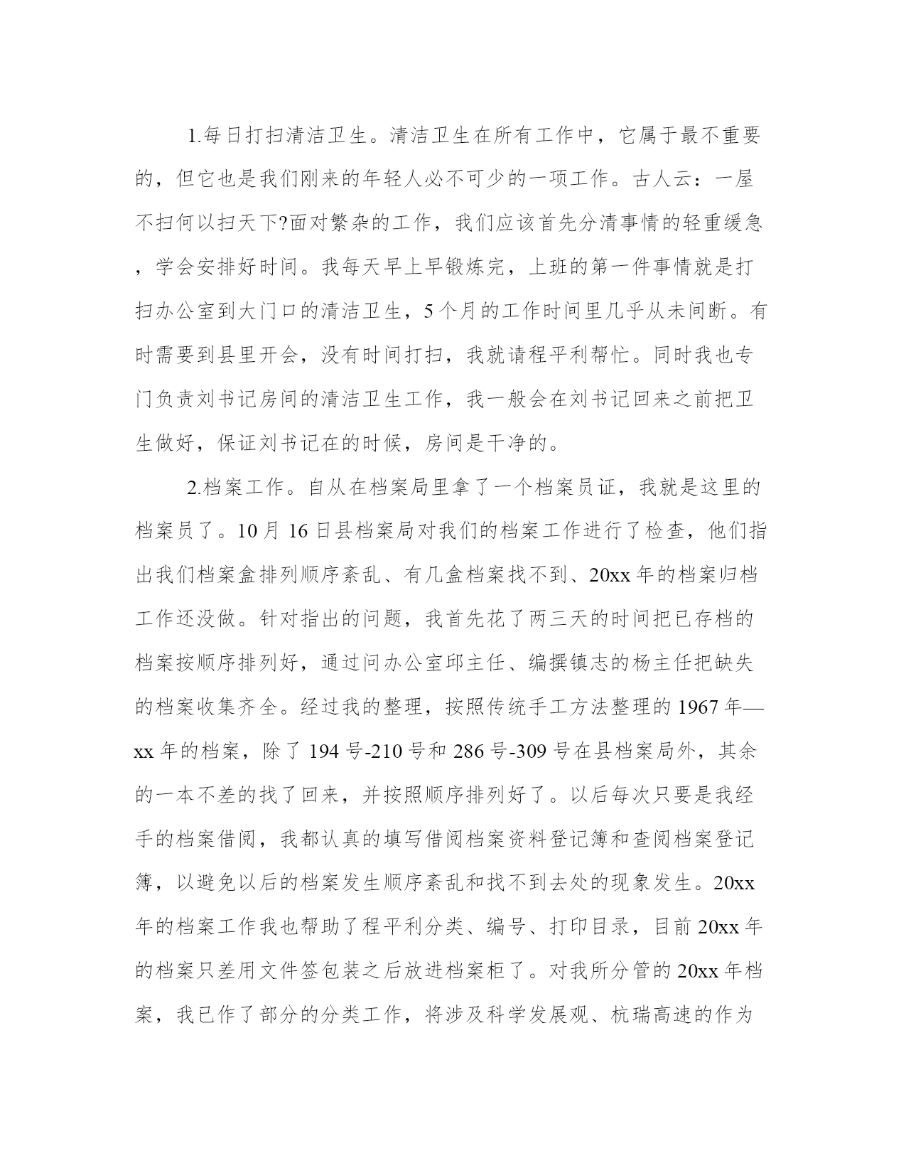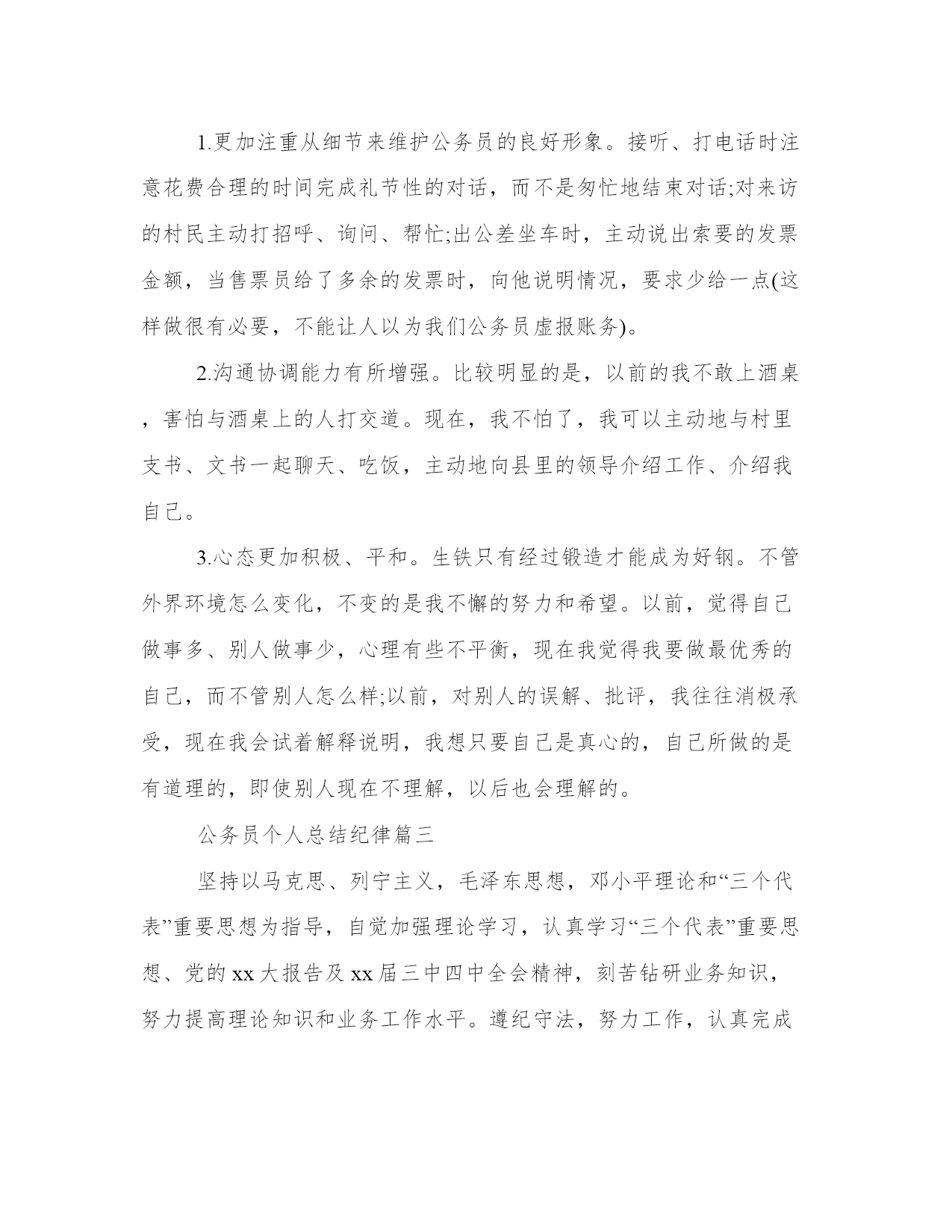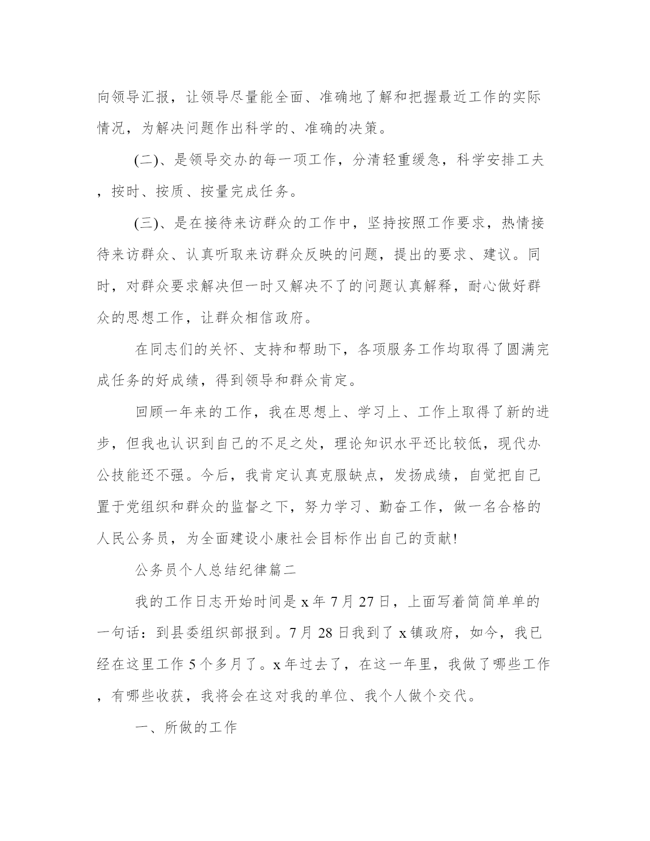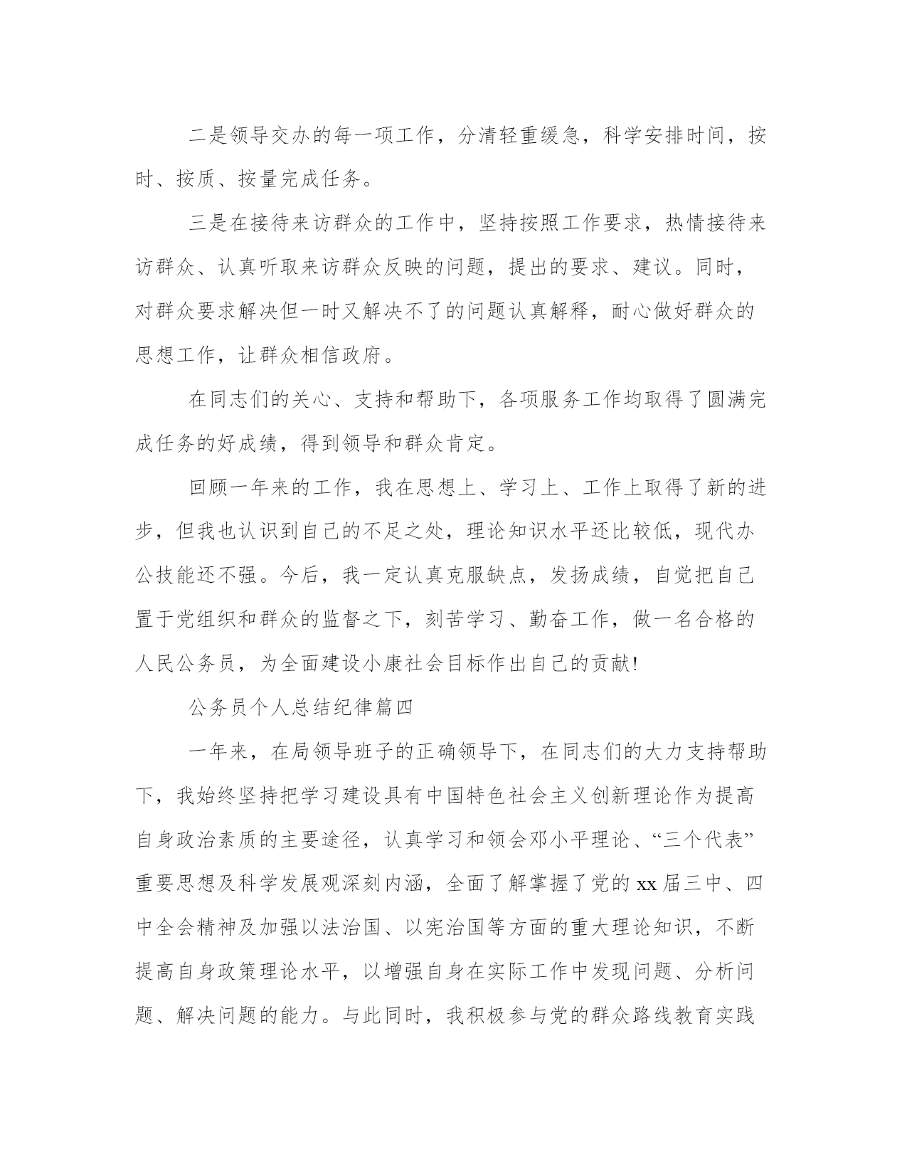 最新公务员个人总结纪律(十三篇)工作学习中一定要善始善终,只有总结才标志工作阶段性完成或者彻底的终止。通过总结对工作学习进行回顾和分析,从中找出经验和教训,引出规律性认识,以指导今后工作和实践活动。那么我们该如何写一篇较为完美的总结呢?下面是小编带来的优秀总结范文,希望大家能够喜欢!公务员个人总结纪律篇一一年来,我一直坚持运用马克思列宁主义的立场、观点和方法论,运用辩证唯物主义与历史唯物主义去分析和观察事物,明辨是非,坚持真理,坚持准确的世界观、人生观、价值观,用准确的世界观、人生观、价值观指导自己的学习、工作和生活实践,在思想上积极构筑抵御资产阶级民主和自由化、拜金主义、自由主义等一切腐朽思想侵蚀的结实防线。热爱祖国,热爱中国共产党,热爱社会主义,拥护中国共产党的领导,拥护改革开放,坚信社会主义最终必然战胜资本主义,对社会主义布满必胜的信心。认真贯彻执行党的路线、方针、政策,为加快社会主义建设事业认真做好本职工作。工作积极主动,勤奋努力,不畏艰难,尽职尽责,在平凡的工作岗位上作出力所能及的贡献。我重视加强理论和业务知识学习,在工作中,坚持一边工作一边学习,不断提高自身综合素质水平。(一)、是认真学习“三个代表”重要思想,深化领会“三个代表”重要思想的科学内涵,增强自己实践“三个代表”重要思想的自觉性和坚定性;认真学习党的会议报告及xx届三中、四中全会精神,自觉坚持以党的会议为指导,为进一步加快完善社会主义市场经济体制,全面建设小康社会作出自己的努力。(二)、是认真学习工作业务知识,重点学习公文写作及公文处理和电脑知识。在学习方法上做到在重点中找重点,抓住重点,并结合自己在公文写作及公文处理、电脑知识方面存在哪些不足之处,有针对性地进行学习,不断提高自己的办公室业务工作能力。三是认真学习法律知识,结合自己工作实际特点,利用闲余工夫,选择性地开展学习,学习了中华人民共和国森林法、森林防火条例、中华人民共和国土地管理法、广西壮族自治区土地山林水利权属纠纷调解处理条例、反民族和国家分裂国家法,通过学习,进一步增强法制意识和法制观念。一年来,我一直坚持严格要求自己,勤奋努力,时辰牢记党一心一意为人民服务的宗旨,努力实践“三个代表”重要思想,在自己平凡而普通的工作岗位上,努力做好本职工作。在详细工作中,我努力做好服务工作,当好参谋助手:(一)、是认真搜集各项信息资料,全面、准确地了解和把握各方面工作的开展情况,分析工作存在的主要问题,总结工作经验,及时向领导汇报,让领导尽量能全面、准确地了解和把握最近工作的实际情况,为解决问题作出科学的、准确的决策。(二)、是领导交办的每一项工作,分清轻重缓急,科学安排工夫,按时、按质、按量完成任务。(三)、是在接待来访群众的工作中,坚持按照工作要求,热情接待来访群众、认真听取来访群众反映的问题,提出的要求、建议。同时,对群众要求解决但一时又解决不了的问题认真解释,耐心做好群众的思想工作,让群众相信政府。在同志们的关怀、支持和帮助下,各项服务工作均取得了圆满完成任务的好成绩,得到领导和群众肯定。回顾一年来的工作,我在思想上、学习上、工作上取得了新的进步,但我也认识到自己的不足之处,理论知识水平还比较低,现代办公技能还不强。今后,我肯定认真克服缺点,发扬成绩,自觉把自己置于党组织和群众的监督之下,努力学习、勤奋工作,做一名合格的人民公务员,为全面建设小康社会目标作出自己的贡献!公务员个人总结纪律篇二我的工作日志开始时间是x年7月27日,上面写着简简单单的一句话:到县委组织部报到。7月28日我到了x镇政府,如今,我已经在这里工作5个多月了。x年过去了,在这一年里,我做了哪些工作,有哪些收获,我将会在这对我的单位、我个人做个交代。一、所做的工作1.每日打扫清洁卫生。清洁卫生在所有工作中,它属于最不重要的,但它也是我们刚来的年轻人必不可少的一项工作。古人云:一屋不扫何以扫天下?面对繁杂的工作,我们应该首先分清事情的轻重缓急,学会安排好时间。我每天早上早锻炼完,上班的第一件事情就是打扫办公室到大门口的清洁卫生,5个月的工作时间里几乎从未间断。有时需要到县里开会,没有时间打扫,我就请程平利帮忙。同时我也专门负责刘书记房间的清洁卫生工作,我一般会在刘书记回来之前把卫生做好,保证刘书记在的时候,房间是干净的。2.档案工作。自从在档案局里拿了一个档案员证,我就是这里的档案员了。10月16日县档案局对我们的档案工作进行了检查,他们指出我们档案盒排列顺序紊乱、有几盒档案找不到、20xx年的档案归档工作还没做。针对指出的问题,我首先花了两三天的时间把已存档的档案按顺序排列好,通过问办公室邱主任、编撰镇志的杨主任把缺失的档案收集齐全。经过我的整理,按照传统手工方法整理的1967年—xx年的档案