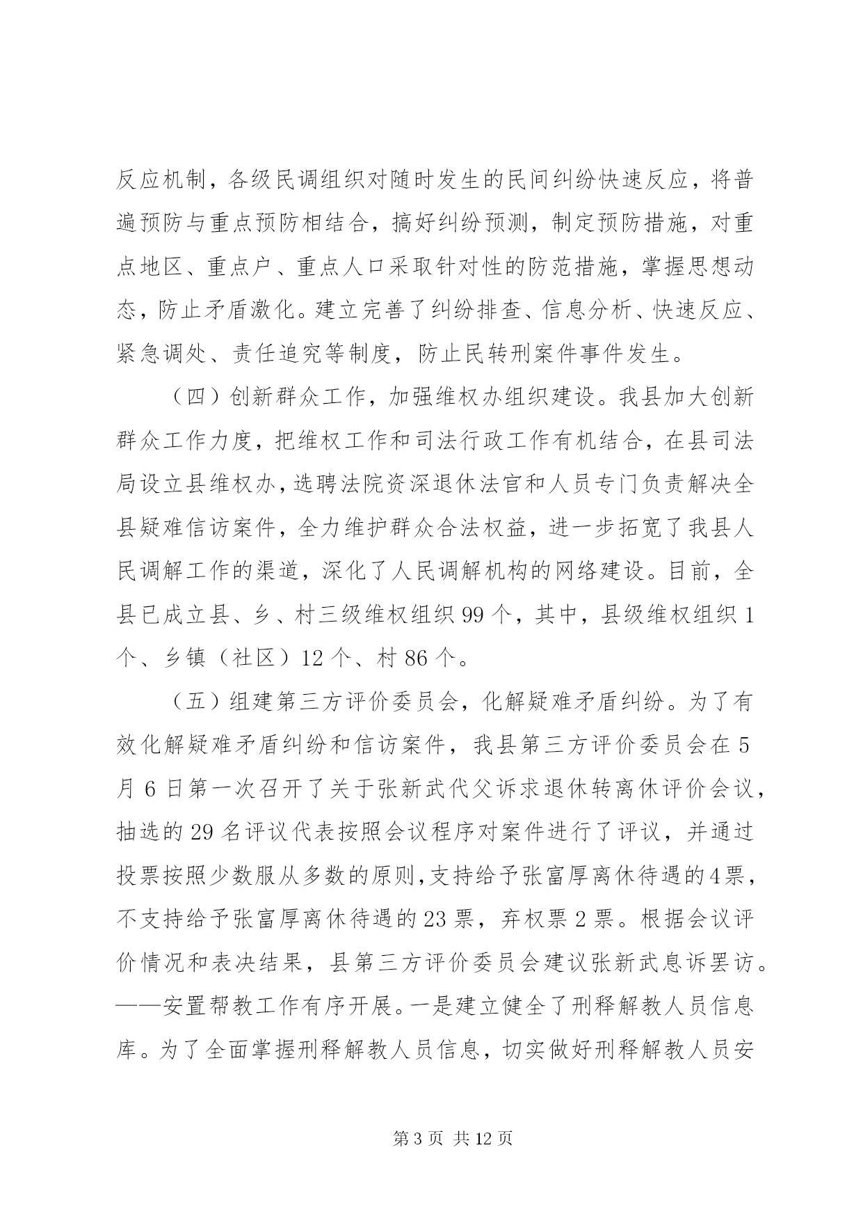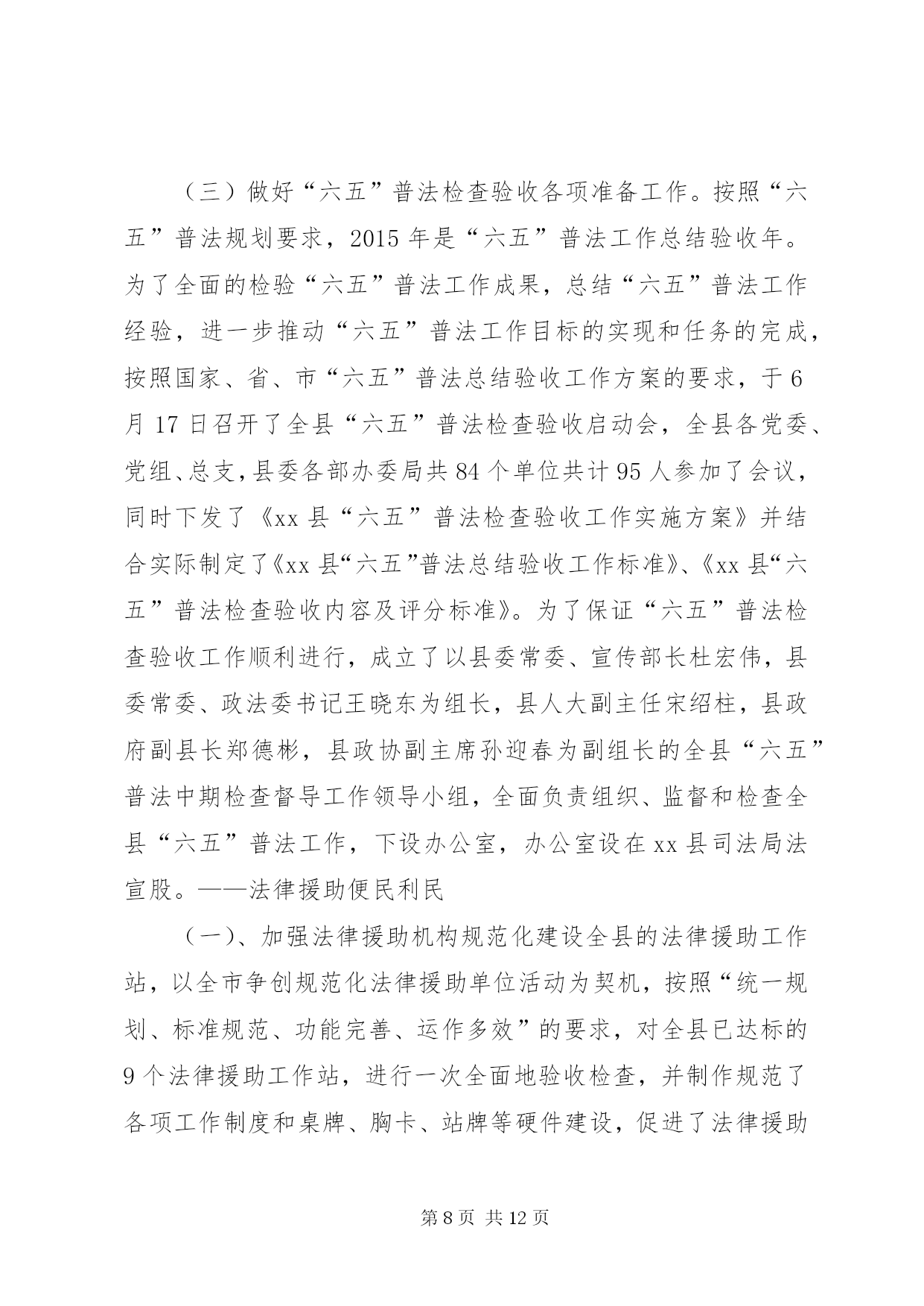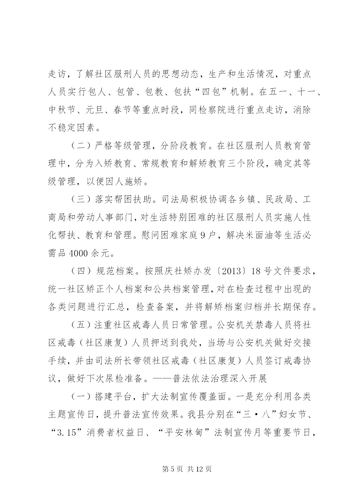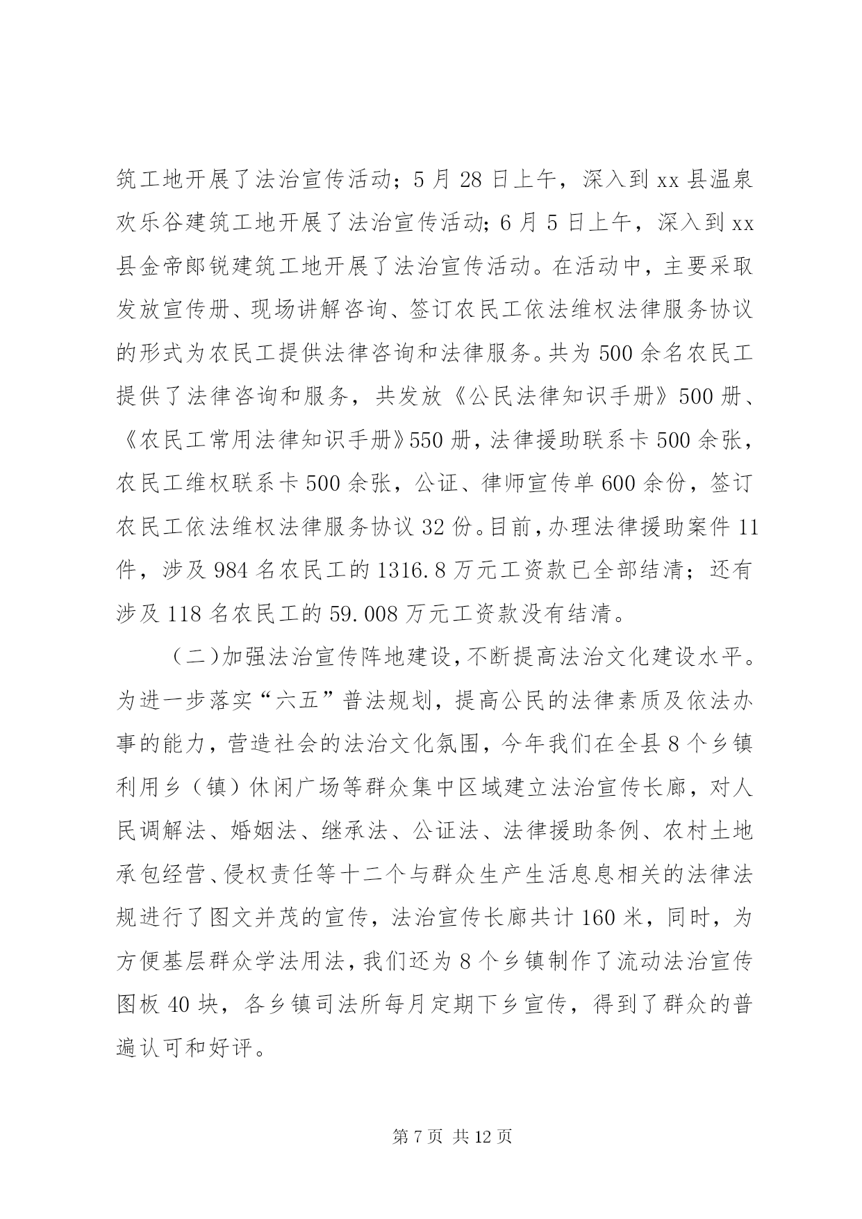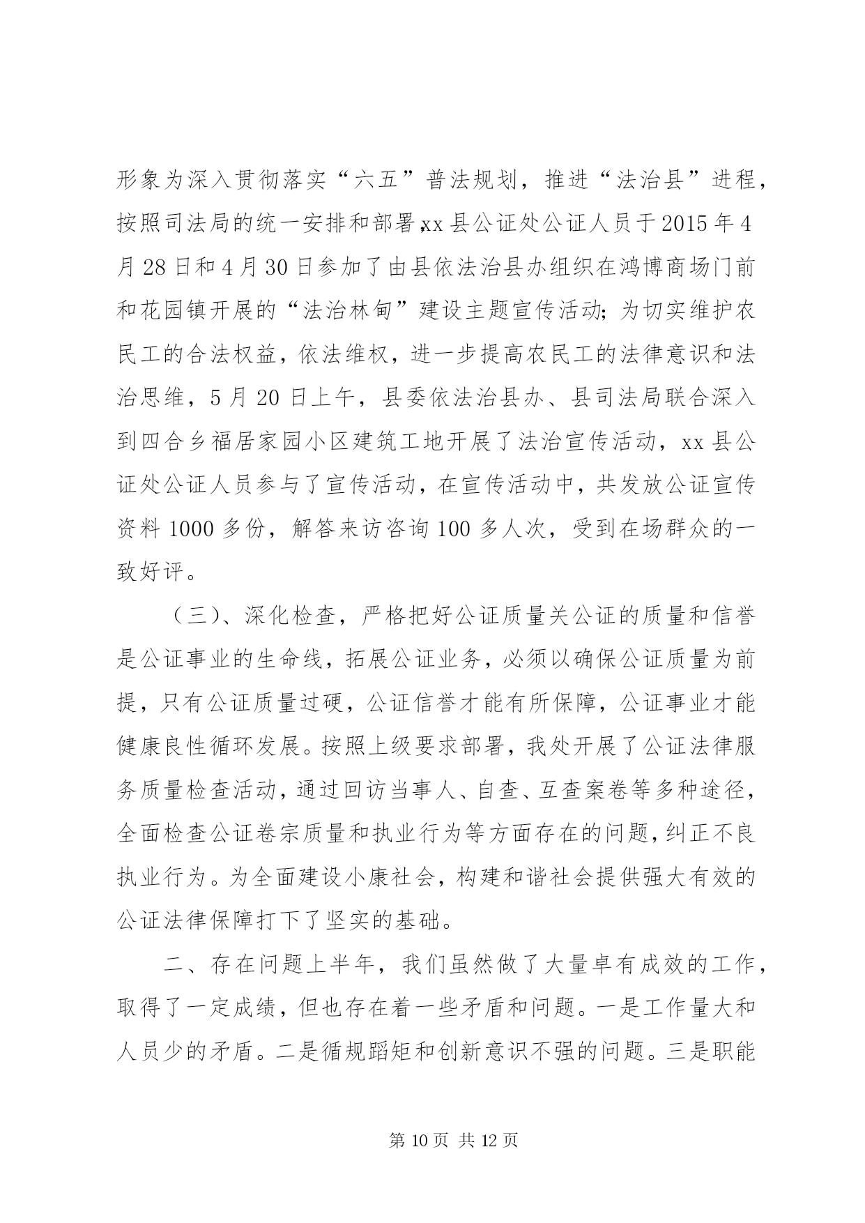 第PAGE\*Arabic\*MERGEFORMAT12页共NUMPAGES\*MERGEFORMAT12页乡镇司法局上半年工作总结年初以来,xx县司法局按照全市司法行政工作会议的安排部署,认真贯彻落实县委十五届六次会议精神,坚持“法治、责任、效率、服务、创新”的工作理念,明确目标,突出重点,强化举措,扎实有序推进司法行政各项工作,现将各项工作开展情况汇报如下。一、工作进展情况——基层工作效果显著。2015年以来,在县委、县政府和市司法局的正确领导下,我局以创建“第一道防线”主题活动为载体,以创新服务群众为动力,奋力开创司法行政工作新局面,在构建多元化社会矛盾纠纷的大调解格局中做出了积极的贡献。(一)进一步加强了人民调解队伍的建设。为适应新形势、新要求,真正构筑化解矛盾纠纷的第一道防线,进一步加强了能够胜任新形势下人民调解工作的组织网络。健全和完善了县、乡、村三级矛盾纠纷排查调处网络。为加大调解工作力度,建立了各调委会之间的联动机制,从而更加提高调处复杂矛盾纠纷的能力和水平,提高了人民调解在维护社会稳定工作中的作用。实现了小事不出村屯、大事不出乡镇的工作格局。尤其结合“春耕期间大排查大调解”活动,各基层调委会成员深入村屯了解村情民意,收集矛盾纠纷信息,及时反映情况,做到早预报、早控制、早处理,确保了各级调委会作用的真正发挥。在活动期间我局领导曾多次到各基层所安排部署各项工作,通过开展活动和督促检查,推广好的典型,将大量的矛盾纠纷解决在基层,消灭在萌芽,真正发挥了人民调解工作在维护社会稳定的第一道防线作用。截至目前,全县共受理各类民间纠纷1151件,成功调处1138件,成功率98%以上。(二)加强《人民调解法》的贯彻落实。为了全面贯彻落实好《人民调解法》,更好地发挥人民调解工作在维护社会稳定,促进社会和谐发展中的“第一道防线”作用。一是多次组织司法助理员和基层人民调解员学习了《人民调解法》,努力提高了自身业务素质和工作能力。二是加大了《人民调解法》的宣传力度,努力营造依法调解的社会氛围。全县各司法所多次开展《人民调解法》宣传活动,得到明显的效果。三是组织开展了“争当金牌调解员”、“创建优秀司法所”等活动,进一步调动了基层调解员的工作积极性。(三)强化矛盾纠纷排查措施,完善工作机制。一是强化矛盾纠纷排查措施。着眼于围绕人民群众关注的热点、难点、焦点问题,全县人民调解组织坚持定期排查与集中排查、普遍排查与重点排查相结合,实行乡(镇)一月一排查活动。针对重大节假日、敏感时期和纠纷多发季节,实行24小时值班和报告制度,集中组织开展专项矛盾纠纷排查活动,并每季度汇总分析研判人民内部矛盾形势。二是完善了矛盾纠纷预警机制。建立预警快速反应机制,各级民调组织对随时发生的民间纠纷快速反应,将普遍预防与重点预防相结合,搞好纠纷预测,制定预防措施,对重点地区、重点户、重点人口采取针对性的防范措施,掌握思想动态,防止矛盾激化。建立完善了纠纷排查、信息分析、快速反应、紧急调处、责任追究等制度,防止民转刑案件事件发生。(四)创新群众工作,加强维权办组织建设。我县加大创新群众工作力度,把维权工作和司法行政工作有机结合,在县司法局设立县维权办,选聘法院资深退休法官和人员专门负责解决全县疑难信访案件,全力维护群众合法权益,进一步拓宽了我县人民调解工作的渠道,深化了人民调解机构的网络建设。目前,全县已成立县、乡、村三级维权组织99个,其中,县级维权组织1个、乡镇(社区)12个、村86个。(五)组建第三方评价委员会,化解疑难矛盾纠纷。为了有效化解疑难矛盾纠纷和信访案件,我县第三方评价委员会在5月6日第一次召开了关于张新武代父诉求退休转离休评价会议,抽选的29名评议代表按照会议程序对案件进行了评议,并通过投票按照少数服从多数的原则,支持给予张富厚离休待遇的4票,不支持给予张富厚离休待遇的23票,弃权票2票。根据会议评价情况和表决结果,县第三方评价委员会建议张新武息诉罢访。——安置帮教工作有序开展。一是建立健全了刑释解教人员信息库。为了全面掌握刑释解教人员信息,切实做好刑释解教人员安置帮教工作,维护社会和谐稳定,我们对全县近三年来刑释解教人员的姓名、籍贯、罪名、服刑时间、服刑监狱、释放时间等静态信息等进行认真排查梳理,确保底数清、情况明。对户籍地与住所地不一致的,做到了安置帮教工作衔接、移交工作,杜绝了脱管、漏管现象。截止目前,共清理排查出376名刑释解教人员。二是刑释解教工作卷宗更加规范化。原来刑释解教人员个人档案信息不详细,帮教人员只有登记,没有帮教协议等。针对帮教工作档案不健全的现象,为进一步做好刑释解教人员的安置帮教工作,规范安置帮教人员的档案卷宗。现已每个基层所逐人建立档案,做到一人一档,把安置帮教人员日常监督管理情况形成文字、表册材