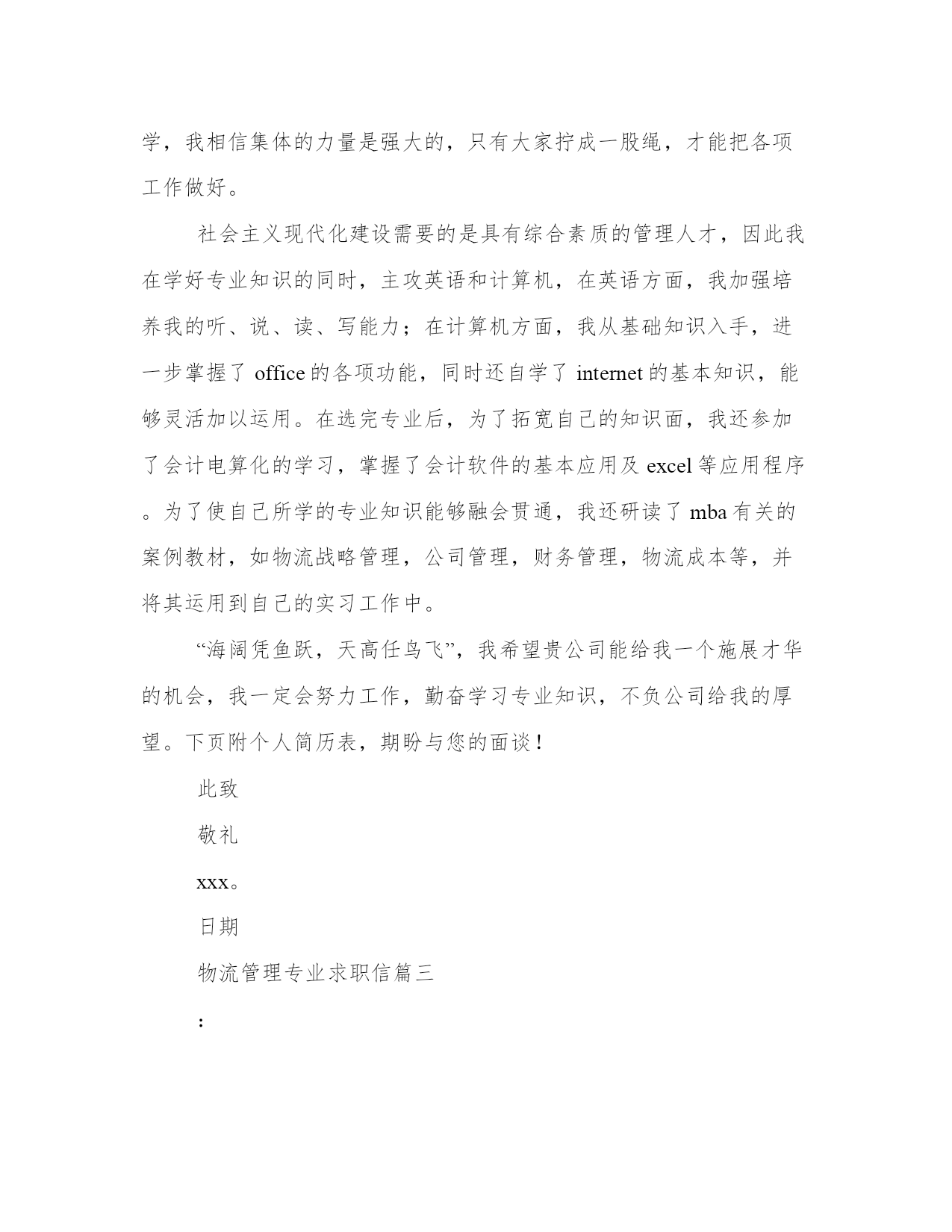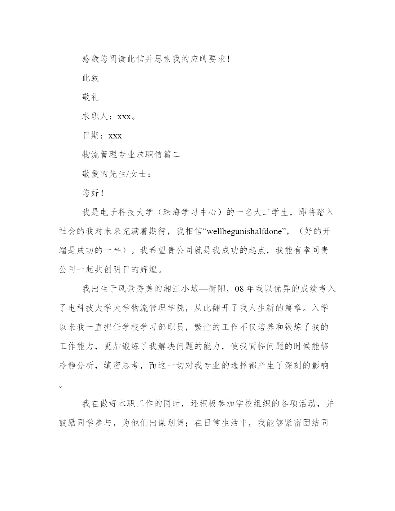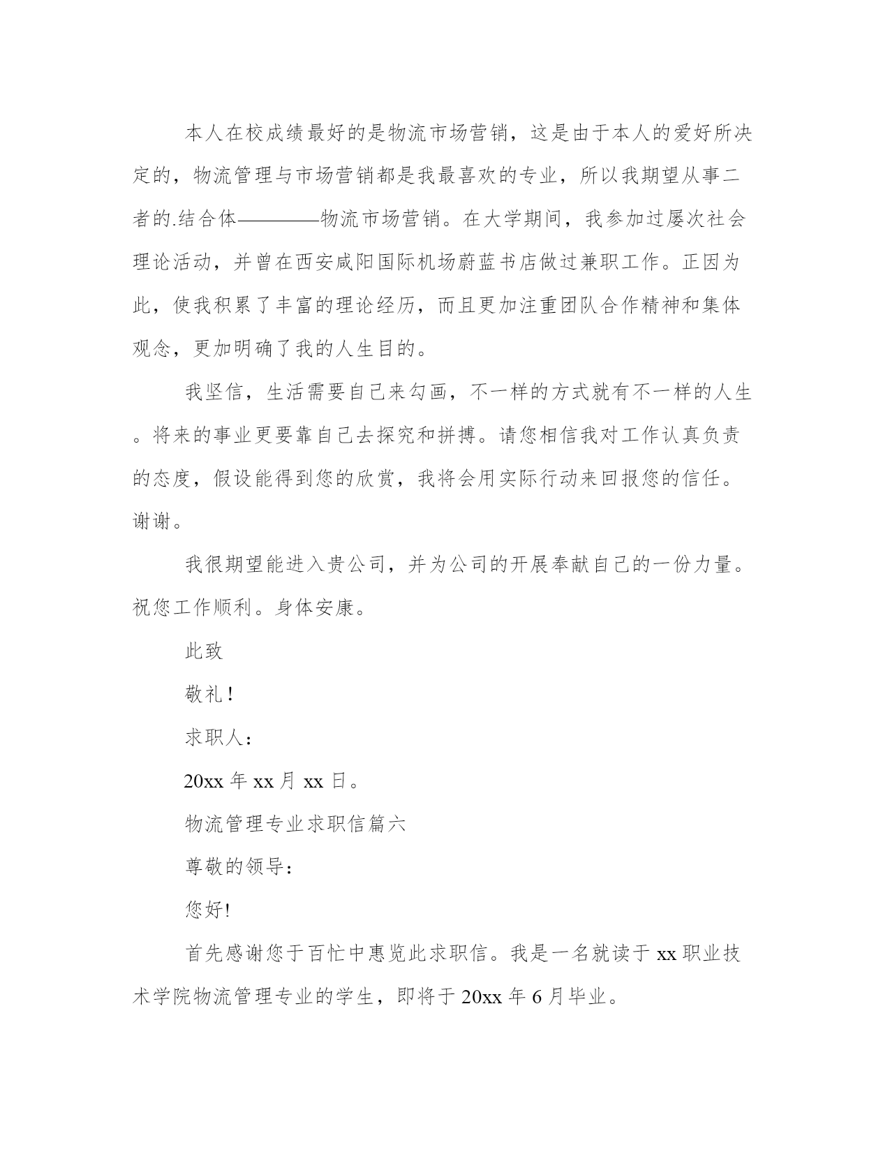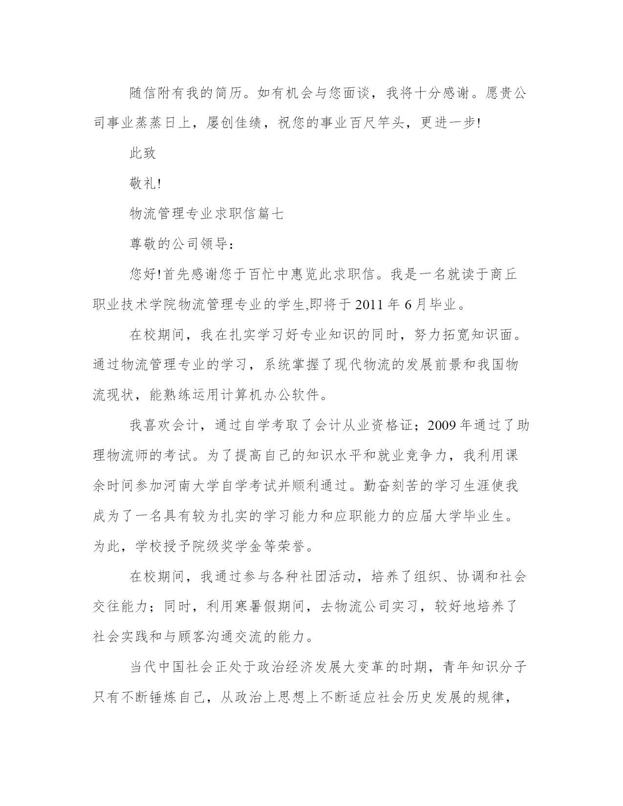 最新物流管理专业求职信(模板15篇)每个人都曾试图在平淡的学习、工作和生活中写一篇文章。写作是培养人的观察、联想、想象、思维和记忆的重要手段。写范文的时候需要注意什么呢?有哪些格式需要注意呢?这里我整理了一些优秀的范文,希望对大家有所帮助,下面我们就来了解一下吧。物流管理专业求职信篇一尊敬的领导:您好!我写此信是为应聘贵公司xxx职位,很快乐在上看到您的招聘信息,并不断希冀加盟贵公司。我行将毕业于西安财经学院,在校时期我学习了很多知识,如报关实务,国际贸易,供给链管理,国际物流,国际货运代理,企业战略管理仓储与配送管理,物流信息管理,推销管理,财务管理,消费与运作管理,企业管理(物流)组织行为学,市场营销,经济学原理物,流学概论,统计学原理,会计学原理,管理学原理等课程。还参与了学校组织的第三方物流实训,物流流程实训,物流实务虚训,仓储业务虚训,网上模仿综合实训等实训操作课,自己具有一定的管理和筹划才能,熟习各种办公软件的操作。团体简历和其他资料已于附件,我非常希望能成为贵公司的无力竞争者,并希望收到面试告诉,电话:xxxxxx。感激您阅读此信并思索我的应聘要求!此致敬礼求职人:xxx。日期:xxx物流管理专业求职信篇二敬爱的先生/女士:您好!我是电子科技大学(珠海学习中心)的一名大二学生,即将踏入社会的我对未来充满着期待,我相信“wellbegunishalfdone”,(好的开端是成功的一半)。我希望贵公司就是我成功的起点,我能有幸同贵公司一起共创明日的辉煌。我出生于风景秀美的湘江小城—衡阳,08年我以优异的成绩考入了电科技大学大学物流管理学院,从此翻开了我人生新的篇章。入学以来我一直担任学校学习部职员,繁忙的工作不仅培养和锻炼了我的工作能力,更加锻炼了我解决问题的能力,使我面临问题的时候能够冷静分析,缜密思考,而这一切对我专业的选择都产生了深刻的影响。我在做好本职工作的同时,还积极参加学校组织的各项活动,并鼓励同学参与,为他们出谋划策;在日常生活中,我能够紧密团结同学,我相信集体的力量是强大的,只有大家拧成一股绳,才能把各项工作做好。社会主义现代化建设需要的是具有综合素质的管理人才,因此我在学好专业知识的同时,主攻英语和计算机,在英语方面,我加强培养我的听、说、读、写能力;在计算机方面,我从基础知识入手,进一步掌握了office的各项功能,同时还自学了internet的基本知识,能够灵活加以运用。在选完专业后,为了拓宽自己的知识面,我还参加了会计电算化的学习,掌握了会计软件的基本应用及excel等应用程序。为了使自己所学的专业知识能够融会贯通,我还研读了mba有关的案例教材,如物流战略管理,公司管理,财务管理,物流成本等,并将其运用到自己的实习工作中。“海阔凭鱼跃,天高任鸟飞”,我希望贵公司能给我一个施展才华的机会,我一定会努力工作,勤奋学习专业知识,不负公司给我的厚望。下页附个人简历表,期盼与您的面谈!此致敬礼xxx。日期物流管理专业求职信篇三:您好!衷心的感谢您在百忙之中翻阅我的这份材料,并祝愿贵单位事业欣欣向荣,蒸蒸日上!知识结构及心理生长成熟的阶段。使我成为了一名复合型人才。时光飞逝,我将怀着我童年的梦想青年的理想离开我的母校,走上工作岗位。成职学院师生中一直流传着这样一句话“今天你以成职院为荣,明天成职院以你为荣”,从入学以来,我一直把它铭记在心,立志要在大学3年里全面发展自己,从适应社会发展的角度提高个人素质。将来真正能在本职工作上做出成绩,为母校争光。我以“严”字当头,在学习上勤奋严谨,对课堂知识不懂就问,力求深刻理解。在掌握了本专业知识的基础上,不忘拓展自己的'知识面,对课外知识也有比较广泛的涉猎。同时,为了全面提升个人素质,我积极参加各种活动,这些经历使我认识到团结合作的重要性,也学到了很多社交方面的知识,增加了阅历,相信这对我今后投身社会将起重要作用。财富能够使我战胜它们。“长风破浪会有时,直挂云帆济沧海”,希望贵公司能给我一个发展的平台,我会好好珍惜它,并全力以赴,为实现自己的人生价值而奋斗,为贵公司的发展贡献力量。请给我一个机会,我将返还你一份惊喜!此致敬礼!求职人:xxx。20xx年xx月xx。物流管理专业求职信篇四敬爱的领导:你好!本人xx,男,是三明职业技术学院经济与管理系的学生,所学专业是物流管理,将于的20xx年7月毕业,物流管理专业毕业生求职信。今天我慎重递上求职信,应聘贵公司的xx职位。在大学的学习中,我认真学好本专业的同时扩大自己的知识面,熟练掌握物流和会计两个专业的知识,系统的掌握了现代物流管理、国际物流实务、物流管理信息系统、供应链管理、物流企业仓储与实务、采购与配送实务,会计基础、财务会计(一)