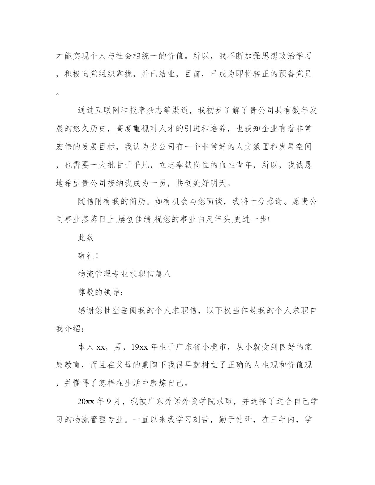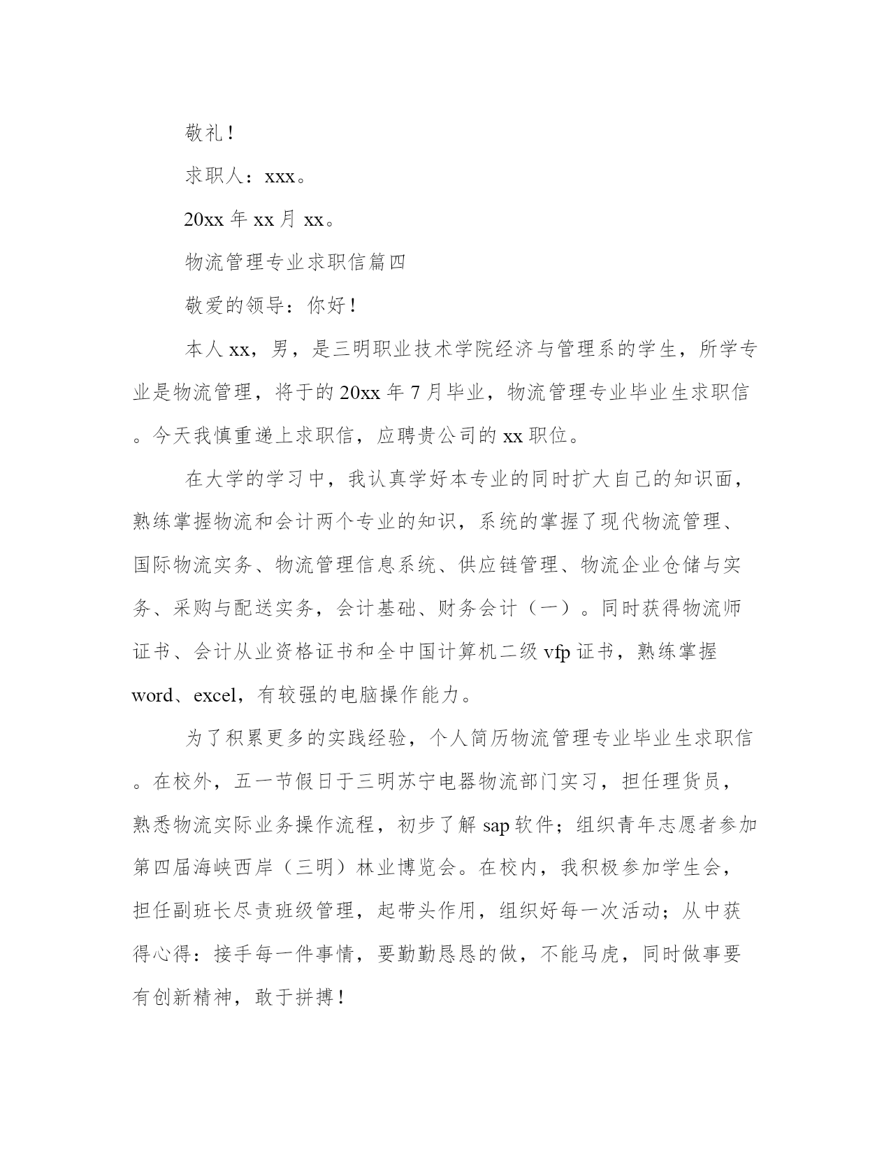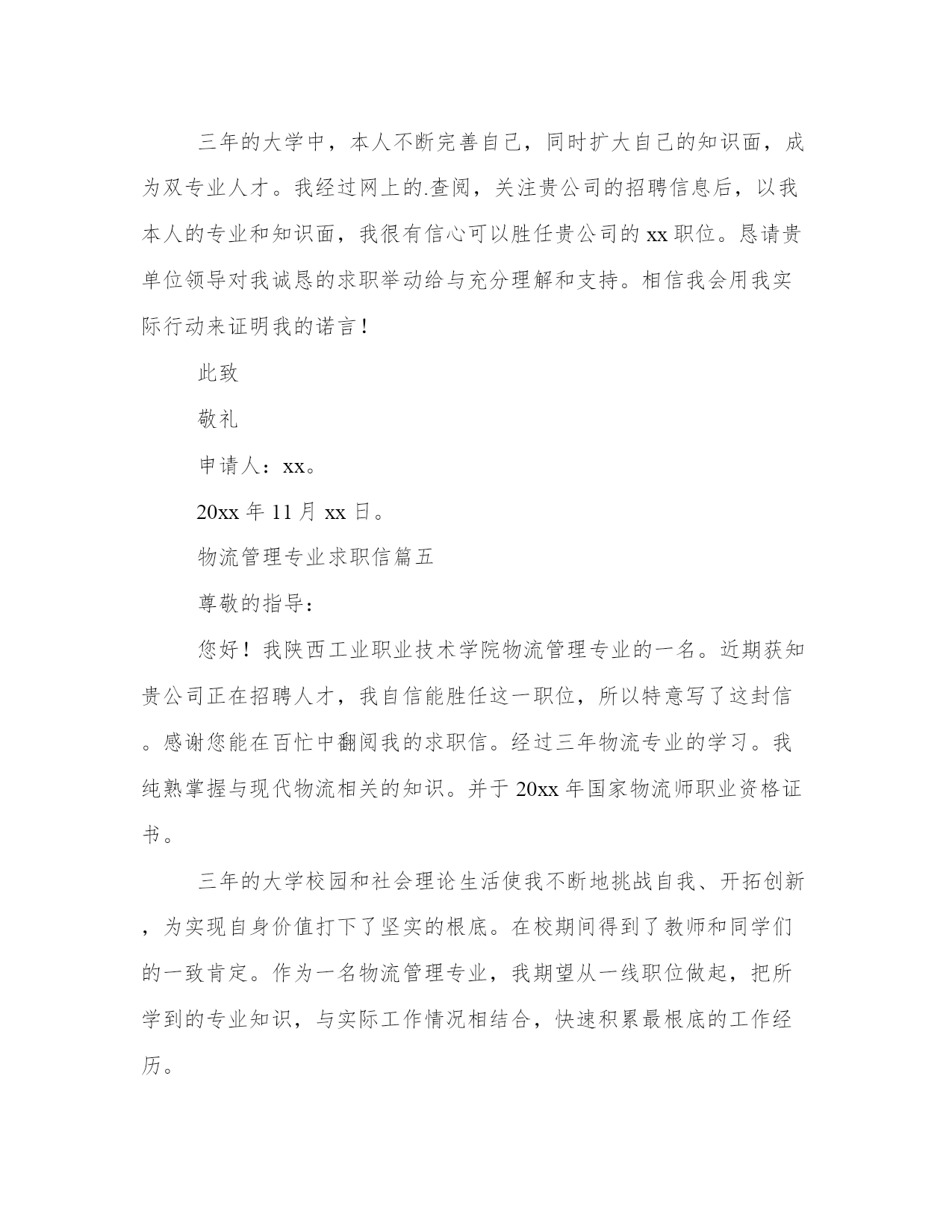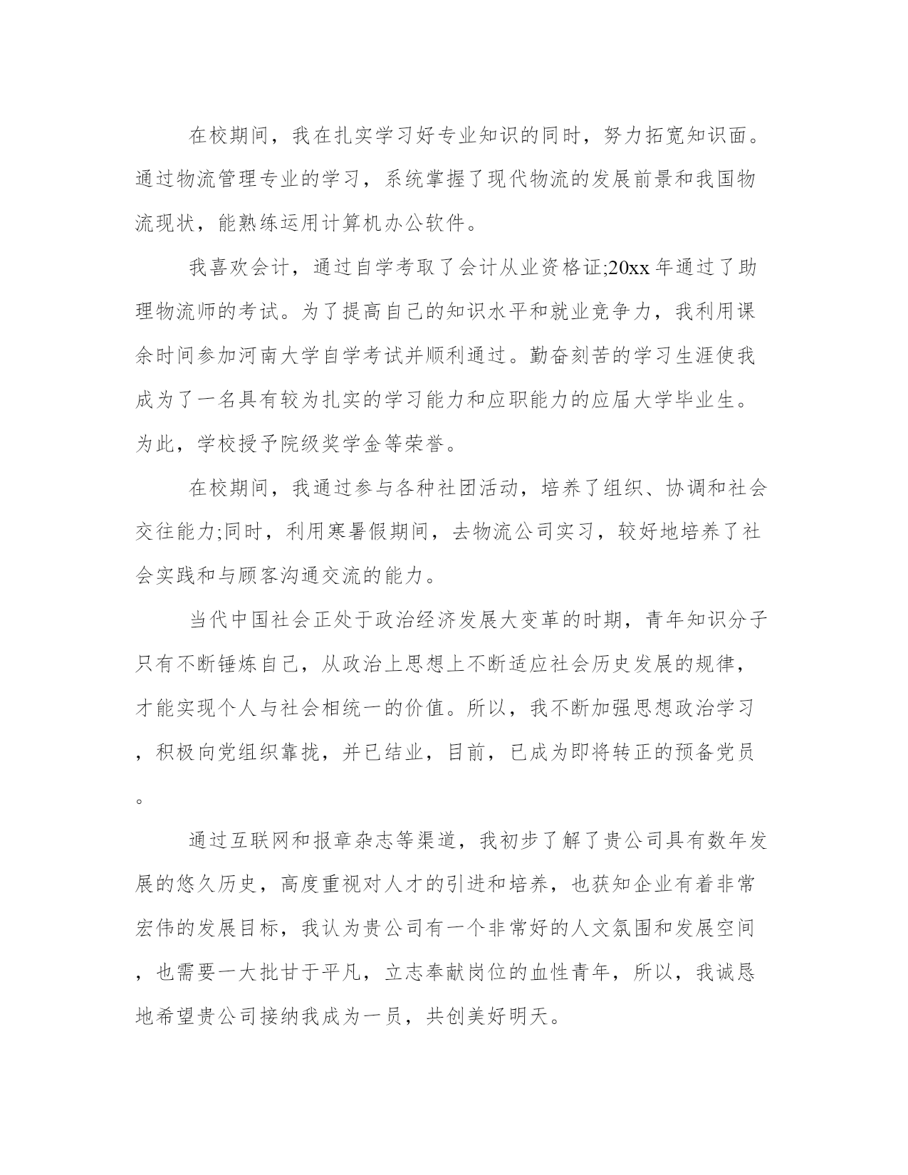 最新物流管理专业求职信(模板15篇)每个人都曾试图在平淡的学习、工作和生活中写一篇文章。写作是培养人的观察、联想、想象、思维和记忆的重要手段。写范文的时候需要注意什么呢?有哪些格式需要注意呢?这里我整理了一些优秀的范文,希望对大家有所帮助,下面我们就来了解一下吧。物流管理专业求职信篇一尊敬的领导:您好!我写此信是为应聘贵公司xxx职位,很快乐在上看到您的招聘信息,并不断希冀加盟贵公司。我行将毕业于西安财经学院,在校时期我学习了很多知识,如报关实务,国际贸易,供给链管理,国际物流,国际货运代理,企业战略管理仓储与配送管理,物流信息管理,推销管理,财务管理,消费与运作管理,企业管理(物流)组织行为学,市场营销,经济学原理物,流学概论,统计学原理,会计学原理,管理学原理等课程。还参与了学校组织的第三方物流实训,物流流程实训,物流实务虚训,仓储业务虚训,网上模仿综合实训等实训操作课,自己具有一定的管理和筹划才能,熟习各种办公软件的操作。团体简历和其他资料已于附件,我非常希望能成为贵公司的无力竞争者,并希望收到面试告诉,电话:xxxxxx。感激您阅读此信并思索我的应聘要求!此致敬礼求职人:xxx。日期:xxx物流管理专业求职信篇二敬爱的先生/女士:您好!我是电子科技大学(珠海学习中心)的一名大二学生,即将踏入社会的我对未来充满着期待,我相信“wellbegunishalfdone”,(好的开端是成功的一半)。我希望贵公司就是我成功的起点,我能有幸同贵公司一起共创明日的辉煌。我出生于风景秀美的湘江小城—衡阳,08年我以优异的成绩考入了电科技大学大学物流管理学院,从此翻开了我人生新的篇章。入学以来我一直担任学校学习部职员,繁忙的工作不仅培养和锻炼了我的工作能力,更加锻炼了我解决问题的能力,使我面临问题的时候能够冷静分析,缜密思考,而这一切对我专业的选择都产生了深刻的影响。我在做好本职工作的同时,还积极参加学校组织的各项活动,并鼓励同学参与,为他们出谋划策;在日常生活中,我能够紧密团结同学,我相信集体的力量是强大的,只有大家拧成一股绳,才能把各项工作做好。社会主义现代化建设需要的是具有综合素质的管理人才,因此我在学好专业知识的同时,主攻英语和计算机,在英语方面,我加强培养我的听、说、读、写能力;在计算机方面,我从基础知识入手,进一步掌握了office的各项功能,同时还自学了internet的基本知识,能够灵活加以运用。在选完专业后,为了拓宽自己的知识面,我还参加了会计电算化的学习,掌握了会计软件的基本应用及excel等应用程序。为了使自己所学的专业知识能够融会贯通,我还研读了mba有关的案例教材,如物流战略管理,公司管理,财务管理,物流成本等,并将其运用到自己的实习工作中。“海阔凭鱼跃,天高任鸟飞”,我希望贵公司能给我一个施展才华的机会,我一定会努力工作,勤奋学习专业知识,不负公司给我的厚望。下页附个人简历表,期盼与您的面谈!此致敬礼xxx。日期物流管理专业求职信篇三:您好!衷心的感谢您在百忙之中翻阅我的这份材料,并祝愿贵单位事业欣欣向荣,蒸蒸日上!知识结构及心理生长成熟的阶段。使我成为了一名复合型人才。时光飞逝,我将怀着我童年的梦想青年的理想离开我的母校,走上工作岗位。成职学院师生中一直流传着这样一句话“今天你以成职院为荣,明天成职院以你为荣”,从入学以来,我一直把它铭记在心,立志要在大学3年里全面发展自己,从适应社会发展的角度提高个人素质。将来真正能在本职工作上做出成绩,为母校争光。我以“严”字当头,在学习上勤奋严谨,对课堂知识不懂就问,力求深刻理解。在掌握了本专业知识的基础上,不忘拓展自己的'知识面,对课外知识也有比较广泛的涉猎。同时,为了全面提升个人素质,我积极参加各种活动,这些经历使我认识到团结合作的重要性,也学到了很多社交方面的知识,增加了阅历,相信这对我今后投身社会将起重要作用。财富能够使我战胜它们。“长风破浪会有时,直挂云帆济沧海”,希望贵公司能给我一个发展的平台,我会好好珍惜它,并全力以赴,为实现自己的人生价值而奋斗,为贵公司的发展贡献力量。请给我一个机会,我将返还你一份惊喜!此致敬礼!求职人:xxx。20xx年xx月xx。物流管理专业求职信篇四敬爱的领导:你好!本人xx,男,是三明职业技术学院经济与管理系的学生,所学专业是物流管理,将于的20xx年7月毕业,物流管理专业毕业生求职信。今天我慎重递上求职信,应聘贵公司的xx职位。在大学的学习中,我认真学好本专业的同时扩大自己的知识面,熟练掌握物流和会计两个专业的知识,系统的掌握了现代物流管理、国际物流实务、物流管理信息系统、供应链管理、物流企业仓储与实务、采购与配送实务,会计基础、财务会计(一)