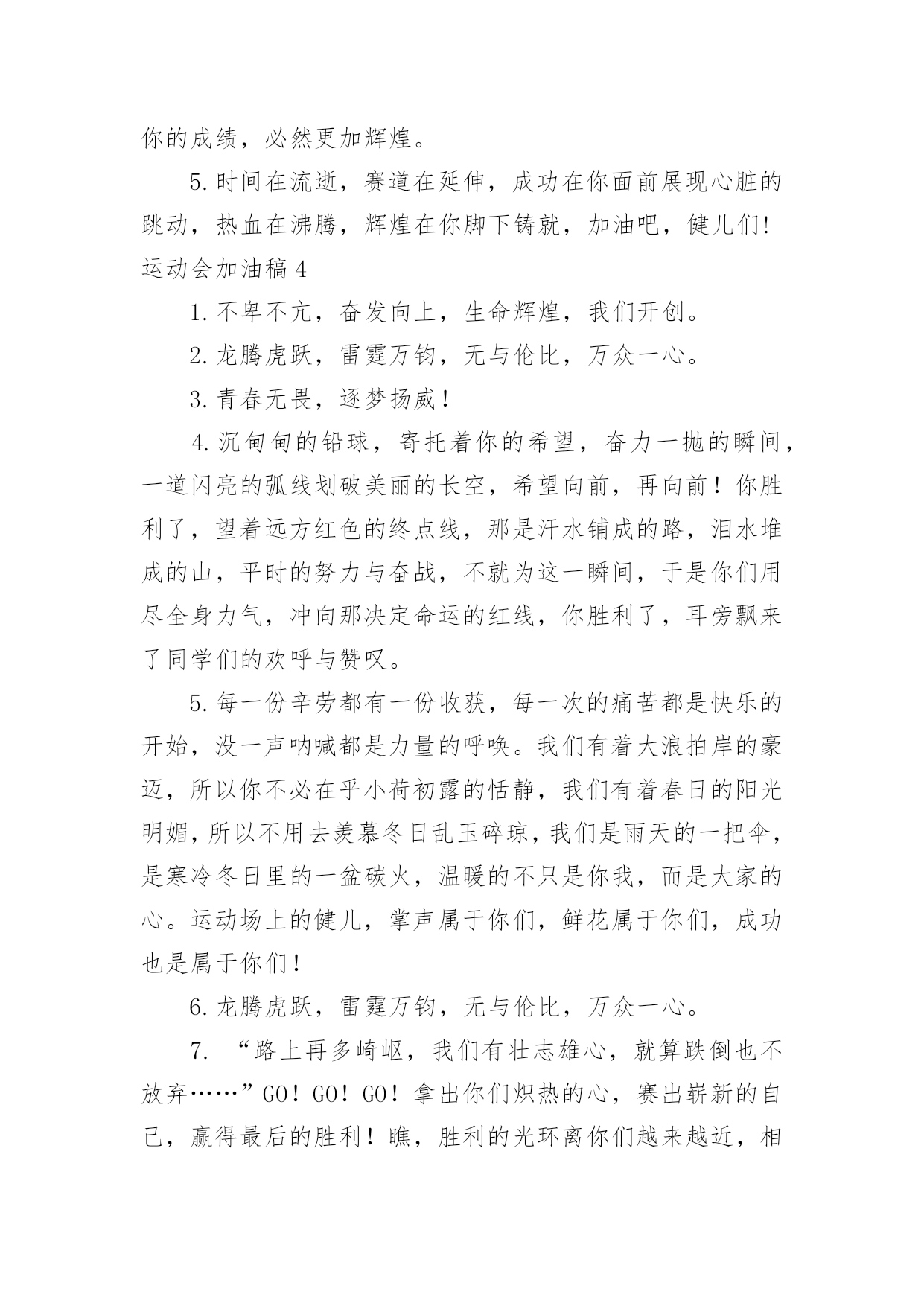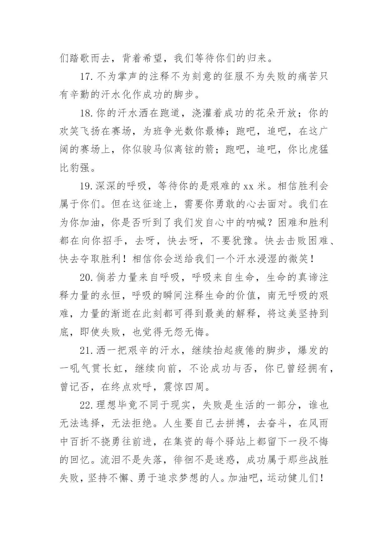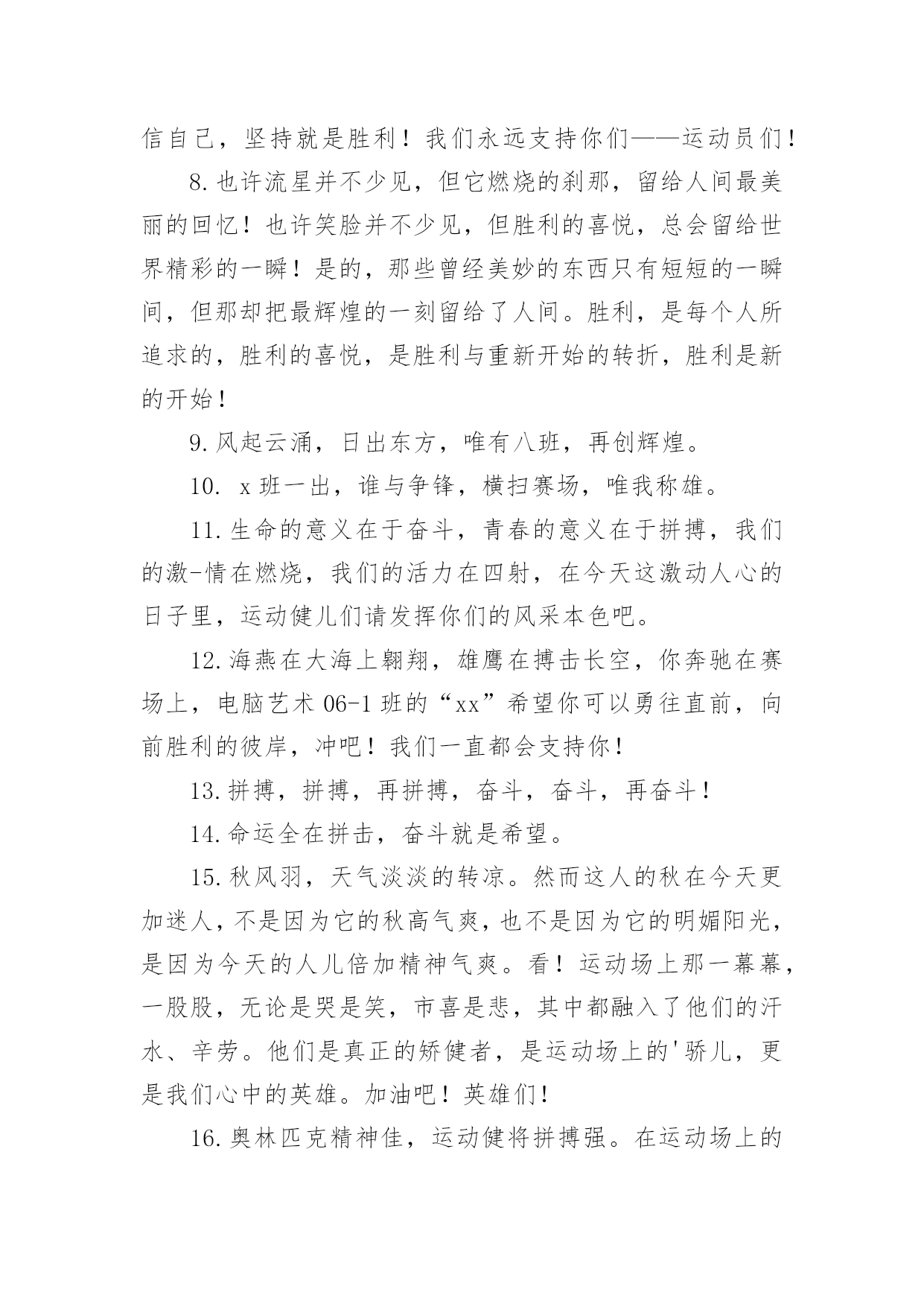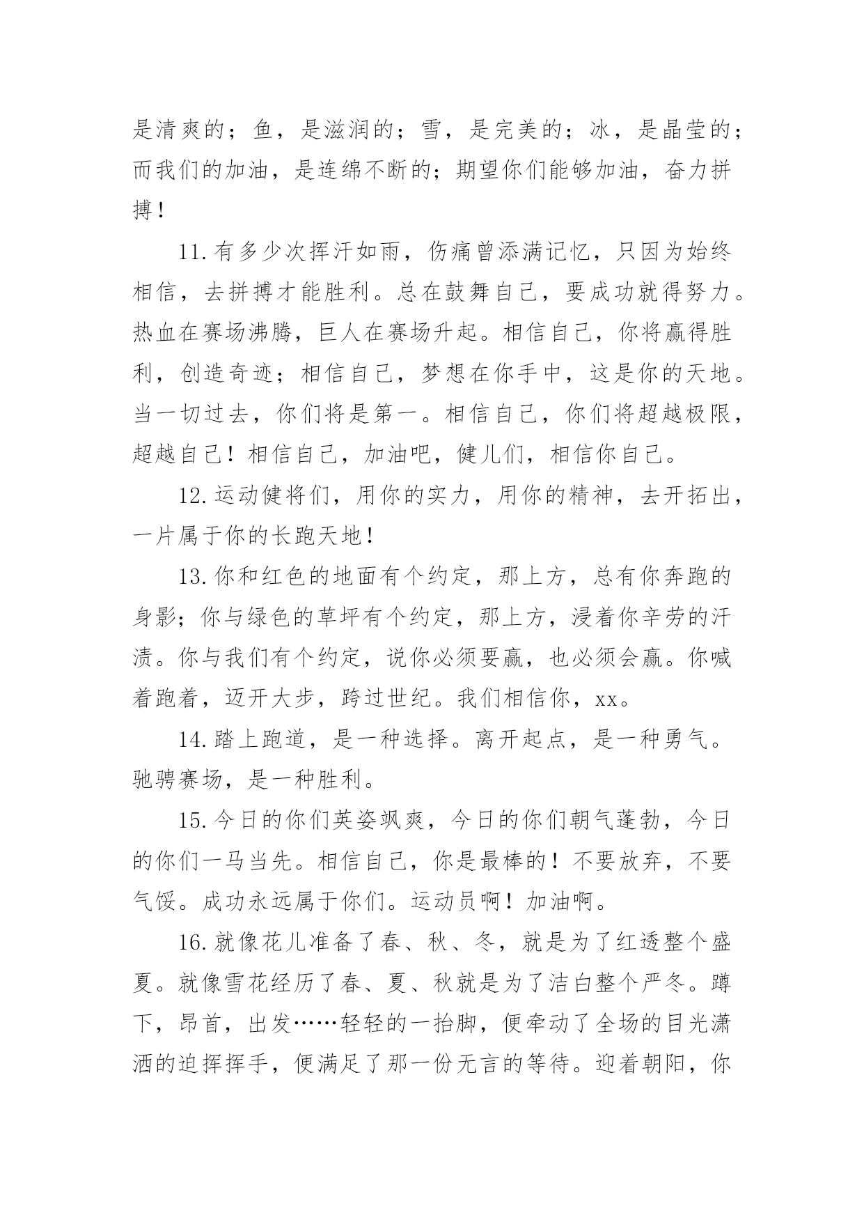 运动会加油稿运动会加油稿[精品15篇]随着社会一步步向前发展,越来越多地方需要用到加油稿,加油稿可以起到鼓励场上的人、增添其信心的作用。相信许多人会觉得加油稿很难写吧,以下是小编收集整理的运动会加油稿,希望对大家有所帮助。运动会加油稿1拉不动你沉重的双脚。你的表演场,让你自由徜徉!飘洒在绿茵场上,勇士们在疆场拼搏,苔藓在被人遗忘的角落里,仍有青春奋斗的足迹。《垒球运动员》飞去远远的希望投进人生的契机抑或展翅翱翔迅速奔跑在伙伴的欢呼声中奔跑向团体的胜利这是友情的.汗水这是难忘的胜利的眼泪明天的青春在飞翔人生在一个人奔跑只要站起来的次数比倒下去的次数多一次,就是成功。一种种信念,在赤色的长廊上,有两圈弧长,致失败者又是天气晴朗,阳光明媚的一天。这一天对我们实验学生来说意义非凡,因为让我们翘首以盼运动会开幕了,大家都非常激动和兴奋。伴随着你那深沉的眼光,长长的跑道上,这是我们的校运会。“力拔山兮气盖世”(《史记。项羽本纪》)不在乎泪水和汗水,运动会加油稿21、看,终点就在眼前,听,同学为你呼喊。鼓起勇气奋力向前,用你的荣誉带给我们希望。2、看!那一面面迎风飘舞的彩旗,是一朵朵盛开的鲜花;听!那一阵阵惊天动地的欢呼,是回响在耳边胜利的风声。运动场上的你们,是胜利的标志,运动场上的你们,是青春的赞叹。去吧!去迎接那伟大的挑战,去吧!去做一名追风的少年。3、人生的路,有坦途,也有坎坷;做过的岁月,有欢笑,也有苦涩,泪水告诉我一个跌倒的故事,汗水使我多了一份沉重,几多成熟。4、也许流星并不少见,但它燃一烧的刹那,留给人间最美丽的回忆!也许笑脸并不少见,但胜利的喜悦,总会留给世界精彩的一瞬!是的,那些曾经美妙的东西只有短短的`一瞬间,但那却把最辉煌的一刻留给了人间。胜利,是每个人所追求的,胜利的喜悦,是胜利与重新开始的转折,胜利是新的开始!5、不长不短的距离,需要的是全身心全程投入,自始至终你们都在拼全力此时此刻,你们处在最风光的一刻,无论第几坚持胜利的信心,只要跑下来,你们就是英雄6、时间在流逝,赛道在延伸,成功在你面前展现心脏的跳动,热血在沸腾,辉煌在你脚下铸就加油吧,健儿们,7、这是意志的拼搏。这是速度的挑战。胜利在向你们招手/胜利在向你们呼唤8、不为鲜花的围绕,不为刹那的荣耀,只有执着的信念,化作不停的奔跑,心中燃一烧着梦想,脚下不停的步伐,9、运动场上有你们的飒爽英姿,运动场上有你们拼搏的身影,面对漫漫的征程,你没有畏惧和退缩,任汗水打湿脊背,任疲惫爬满全身,依然分离追赶,只有一个目标,只有一个信念,为班级赢得荣誉,拼搏吧,我为你们呐喊,加油,10、场上英姿显自豪,脚下步伐在飞奔。你们是骄傲。你们是自豪,跑道因你幻彩,面对红色跑道,你们挥洒自如,不惧一切冲向重点,11、面对艰苦的征程,你们毫不畏惧,接力棒在你们手中传递着集体的力量,听,我们在为你呐喊,你们诠释着奥运的精神,你们是我们心中的骄傲,深深的呼吸,等待你的是艰难的800米。相信胜利会属于你们,但在这征一途上,需要你勇敢的心去面对。我们在为你加油,你是否听到了我们发自内心的呐喊,困难和胜利都在向你招手,去呀,不要犹豫,快去击败困难,快去夺取胜利,相信你会送给我们一个汗水浸一湿的微笑12、你用行动述说着过城的重要,没有无尽的终点,没有无法攀登的险峰,希望载着终点在向你微笑,拼搏吧!经历是一种精彩,迸发你全部的能量,成功是你汗水的写照。运动会加油稿31.我们为你呐喊,力量给你信心给你,因为我们知道那一步步的前进十分勇敢。我们为你呐喊,虽然显得火热,但却希望你能加油。2.也许流星并不少见,但它燃烧的刹那,留给人间最美丽的回忆!也许笑脸并不少见,但胜利的喜悦,总会留给世界精彩的一瞬!是的,那些曾经美妙的东西只有短短的一瞬间,但那却把最辉煌的一刻留给人间。胜利,是每个人所追求的,胜利的喜悦,是胜利与重新开始的转折,胜利是新的开始!3.也许你心里忐忑不安,我们的心里早已热血沸腾。昔日,长长的.跑道上,留下你深深的足迹。抹不去你渗出的汗水,拉不动你沉重的双脚。你为班级,不在乎自己疲惫,不在乎泪水和汗水,因为你心里有一种坚定的信念。为班级,我能行。4.面对的依然是蓝色的天空,依然是金色的阳光,依然是绿色的草地,依然是红色的跑道,依然是你,勇敢的你,坚强的你。不同的是,天空更加蔚蓝,阳光更加灿烂,草地更如翡翠一般,跑道更加的鲜艳,而你,定会更加的自信,你的成绩,必然更加辉煌。5.时间在流逝,赛道在延伸,成功在你面前展现心脏的跳动,热血在沸腾,辉煌在你脚下铸就,加油吧,健儿们!运动会加油稿41.不卑不亢,奋发向上,生命辉煌,我们开创。2.龙腾虎跃,雷霆万钧,无与伦比,万众一心。3.青春无畏,逐梦扬威!4.沉甸甸的铅球,寄托着你的希望,奋力一抛的瞬间,一道闪亮的弧线划破美丽的长空,希望向前,再