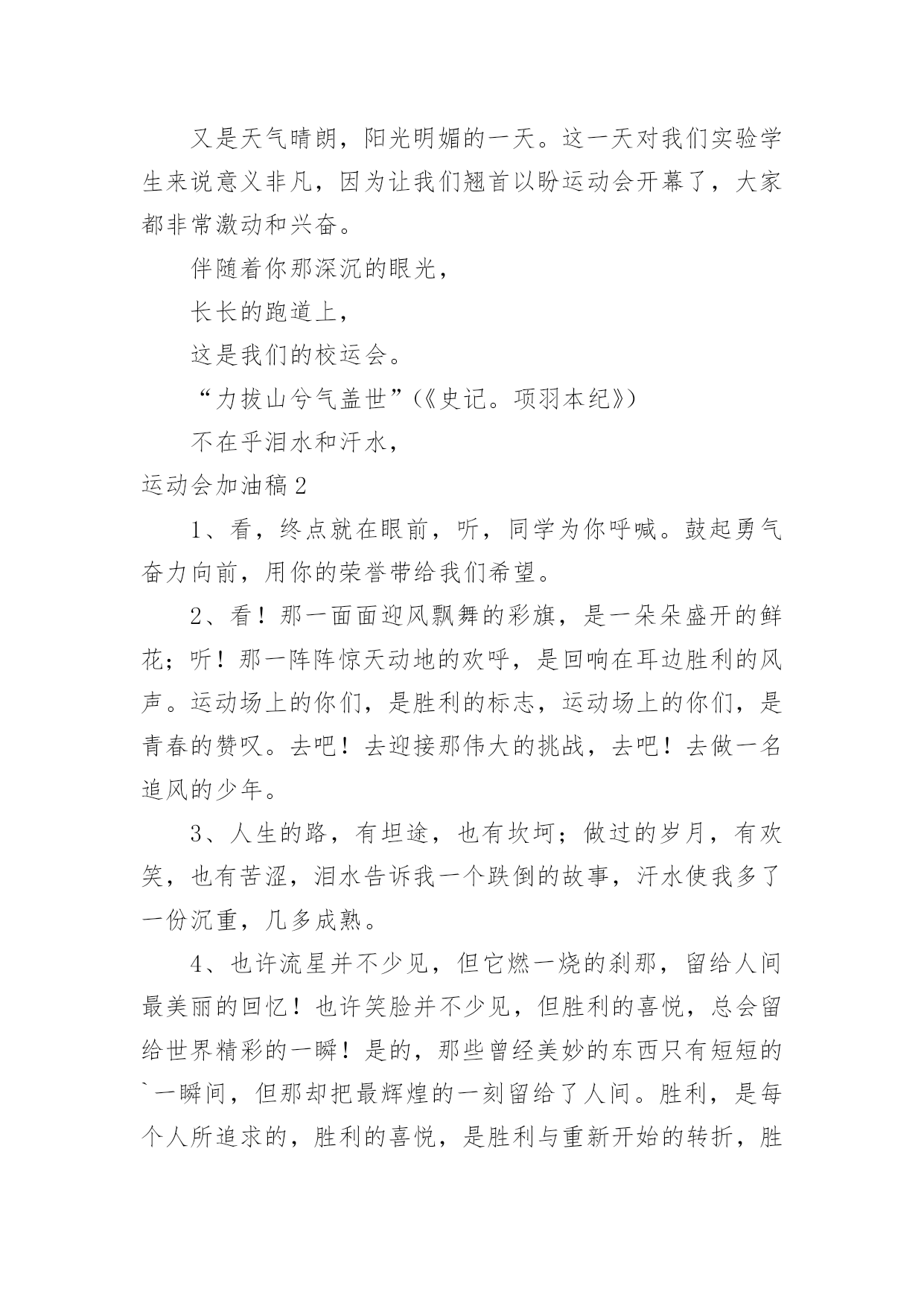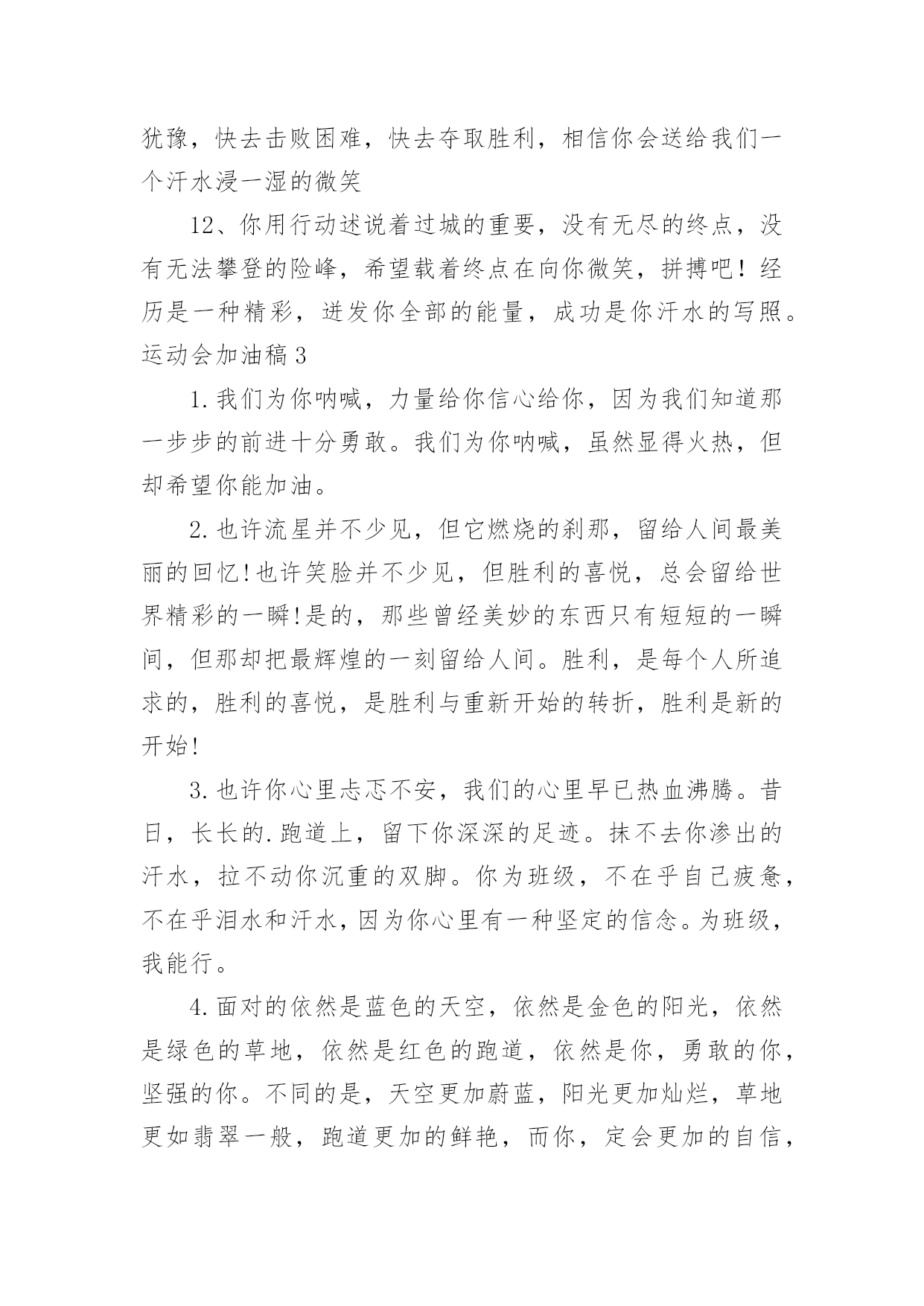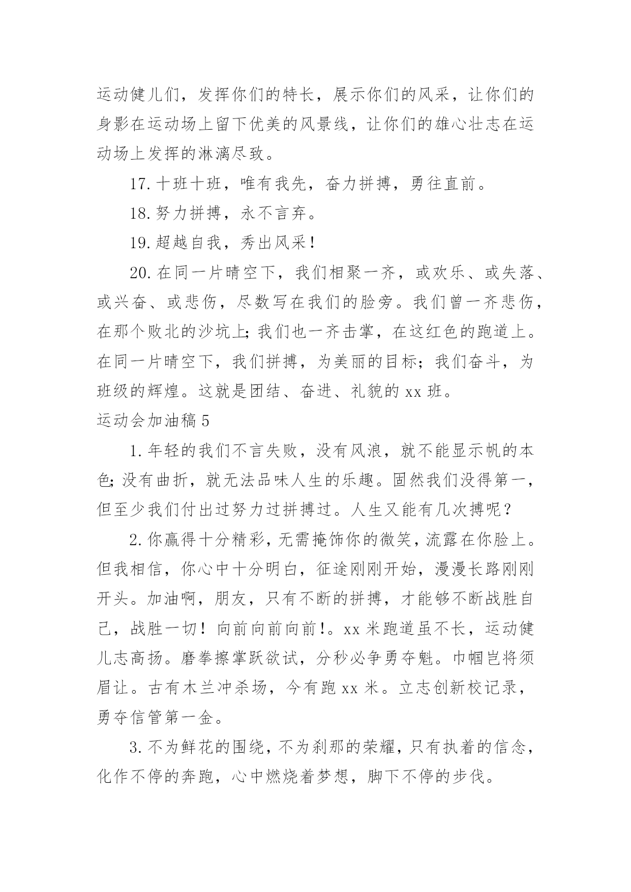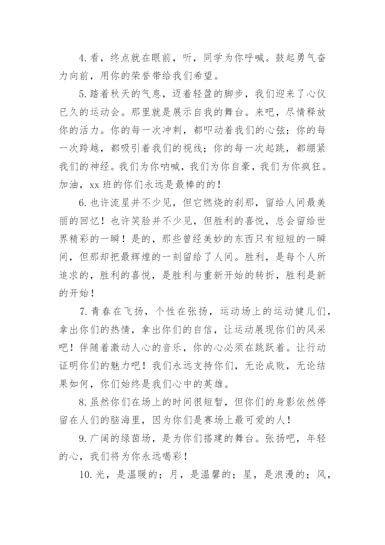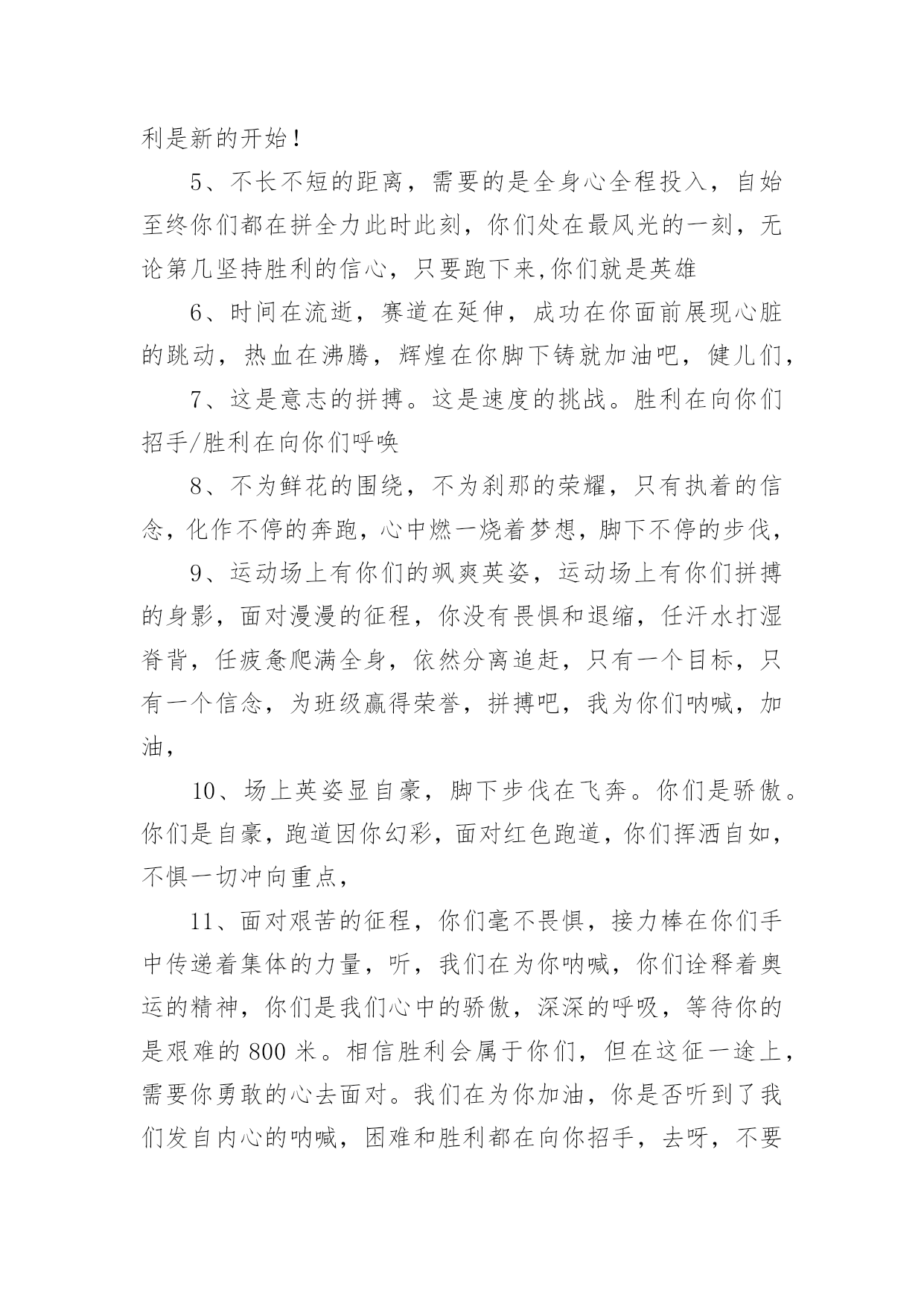 运动会加油稿运动会加油稿[精品15篇]随着社会一步步向前发展,越来越多地方需要用到加油稿,加油稿可以起到鼓励场上的人、增添其信心的作用。相信许多人会觉得加油稿很难写吧,以下是小编收集整理的运动会加油稿,希望对大家有所帮助。运动会加油稿1拉不动你沉重的双脚。你的表演场,让你自由徜徉!飘洒在绿茵场上,勇士们在疆场拼搏,苔藓在被人遗忘的角落里,仍有青春奋斗的足迹。《垒球运动员》飞去远远的希望投进人生的契机抑或展翅翱翔迅速奔跑在伙伴的欢呼声中奔跑向团体的胜利这是友情的.汗水这是难忘的胜利的眼泪明天的青春在飞翔人生在一个人奔跑只要站起来的次数比倒下去的次数多一次,就是成功。一种种信念,在赤色的长廊上,有两圈弧长,致失败者又是天气晴朗,阳光明媚的一天。这一天对我们实验学生来说意义非凡,因为让我们翘首以盼运动会开幕了,大家都非常激动和兴奋。伴随着你那深沉的眼光,长长的跑道上,这是我们的校运会。“力拔山兮气盖世”(《史记。项羽本纪》)不在乎泪水和汗水,运动会加油稿21、看,终点就在眼前,听,同学为你呼喊。鼓起勇气奋力向前,用你的荣誉带给我们希望。2、看!那一面面迎风飘舞的彩旗,是一朵朵盛开的鲜花;听!那一阵阵惊天动地的欢呼,是回响在耳边胜利的风声。运动场上的你们,是胜利的标志,运动场上的你们,是青春的赞叹。去吧!去迎接那伟大的挑战,去吧!去做一名追风的少年。3、人生的路,有坦途,也有坎坷;做过的岁月,有欢笑,也有苦涩,泪水告诉我一个跌倒的故事,汗水使我多了一份沉重,几多成熟。4、也许流星并不少见,但它燃一烧的刹那,留给人间最美丽的回忆!也许笑脸并不少见,但胜利的喜悦,总会留给世界精彩的一瞬!是的,那些曾经美妙的东西只有短短的`一瞬间,但那却把最辉煌的一刻留给了人间。胜利,是每个人所追求的,胜利的喜悦,是胜利与重新开始的转折,胜利是新的开始!5、不长不短的距离,需要的是全身心全程投入,自始至终你们都在拼全力此时此刻,你们处在最风光的一刻,无论第几坚持胜利的信心,只要跑下来,你们就是英雄6、时间在流逝,赛道在延伸,成功在你面前展现心脏的跳动,热血在沸腾,辉煌在你脚下铸就加油吧,健儿们,7、这是意志的拼搏。这是速度的挑战。胜利在向你们招手/胜利在向你们呼唤8、不为鲜花的围绕,不为刹那的荣耀,只有执着的信念,化作不停的奔跑,心中燃一烧着梦想,脚下不停的步伐,9、运动场上有你们的飒爽英姿,运动场上有你们拼搏的身影,面对漫漫的征程,你没有畏惧和退缩,任汗水打湿脊背,任疲惫爬满全身,依然分离追赶,只有一个目标,只有一个信念,为班级赢得荣誉,拼搏吧,我为你们呐喊,加油,10、场上英姿显自豪,脚下步伐在飞奔。你们是骄傲。你们是自豪,跑道因你幻彩,面对红色跑道,你们挥洒自如,不惧一切冲向重点,11、面对艰苦的征程,你们毫不畏惧,接力棒在你们手中传递着集体的力量,听,我们在为你呐喊,你们诠释着奥运的精神,你们是我们心中的骄傲,深深的呼吸,等待你的是艰难的800米。相信胜利会属于你们,但在这征一途上,需要你勇敢的心去面对。我们在为你加油,你是否听到了我们发自内心的呐喊,困难和胜利都在向你招手,去呀,不要犹豫,快去击败困难,快去夺取胜利,相信你会送给我们一个汗水浸一湿的微笑12、你用行动述说着过城的重要,没有无尽的终点,没有无法攀登的险峰,希望载着终点在向你微笑,拼搏吧!经历是一种精彩,迸发你全部的能量,成功是你汗水的写照。运动会加油稿31.我们为你呐喊,力量给你信心给你,因为我们知道那一步步的前进十分勇敢。我们为你呐喊,虽然显得火热,但却希望你能加油。2.也许流星并不少见,但它燃烧的刹那,留给人间最美丽的回忆!也许笑脸并不少见,但胜利的喜悦,总会留给世界精彩的一瞬!是的,那些曾经美妙的东西只有短短的一瞬间,但那却把最辉煌的一刻留给人间。胜利,是每个人所追求的,胜利的喜悦,是胜利与重新开始的转折,胜利是新的开始!3.也许你心里忐忑不安,我们的心里早已热血沸腾。昔日,长长的.跑道上,留下你深深的足迹。抹不去你渗出的汗水,拉不动你沉重的双脚。你为班级,不在乎自己疲惫,不在乎泪水和汗水,因为你心里有一种坚定的信念。为班级,我能行。4.面对的依然是蓝色的天空,依然是金色的阳光,依然是绿色的草地,依然是红色的跑道,依然是你,勇敢的你,坚强的你。不同的是,天空更加蔚蓝,阳光更加灿烂,草地更如翡翠一般,跑道更加的鲜艳,而你,定会更加的自信,你的成绩,必然更加辉煌。5.时间在流逝,赛道在延伸,成功在你面前展现心脏的跳动,热血在沸腾,辉煌在你脚下铸就,加油吧,健儿们!运动会加油稿41.不卑不亢,奋发向上,生命辉煌,我们开创。2.龙腾虎跃,雷霆万钧,无与伦比,万众一心。3.青春无畏,逐梦扬威!4.沉甸甸的铅球,寄托着你的希望,奋力一抛的瞬间,一道闪亮的弧线划破美丽的长空,希望向前,再