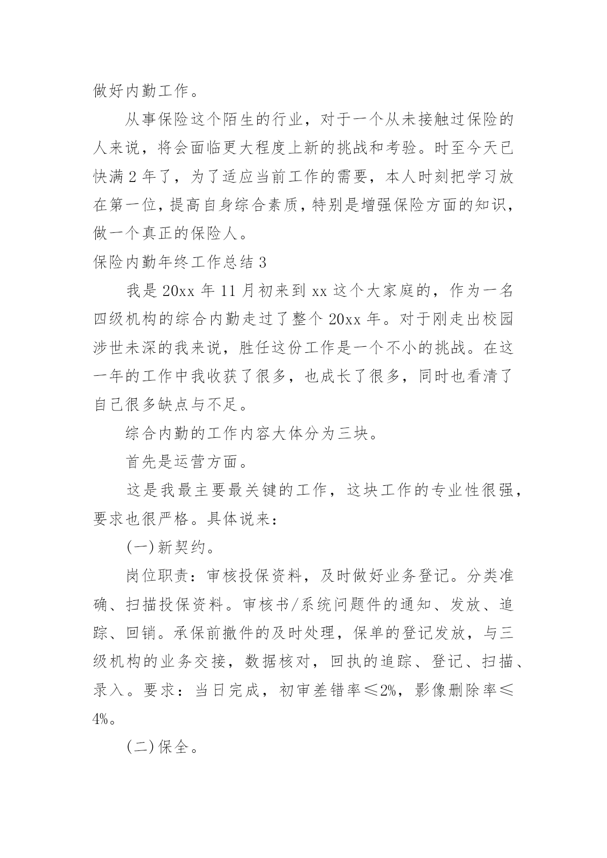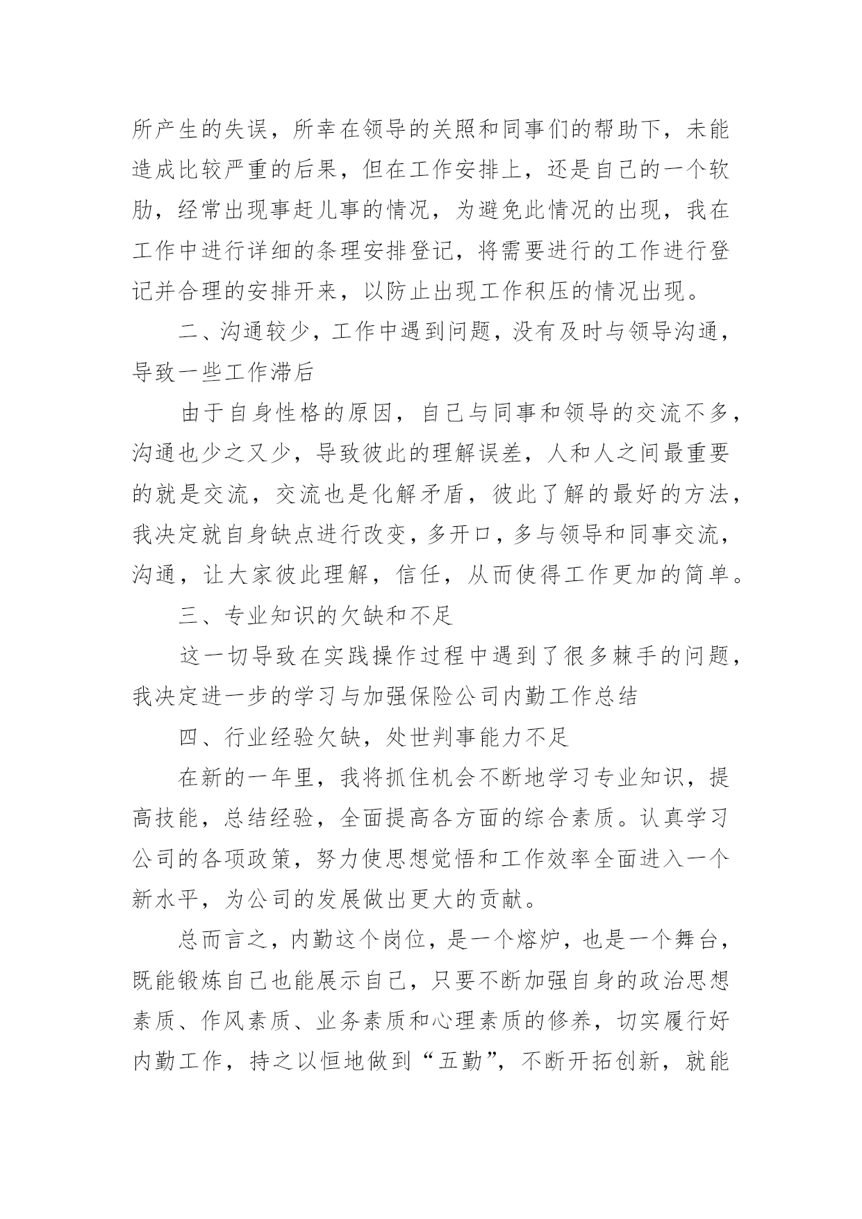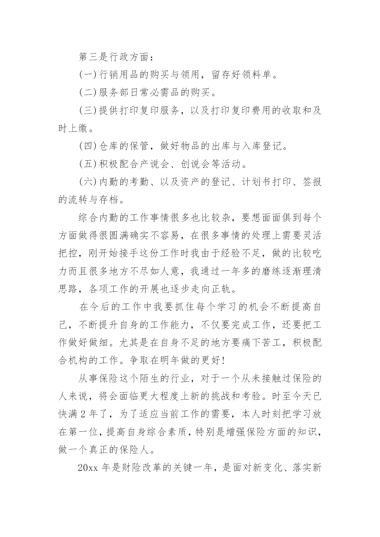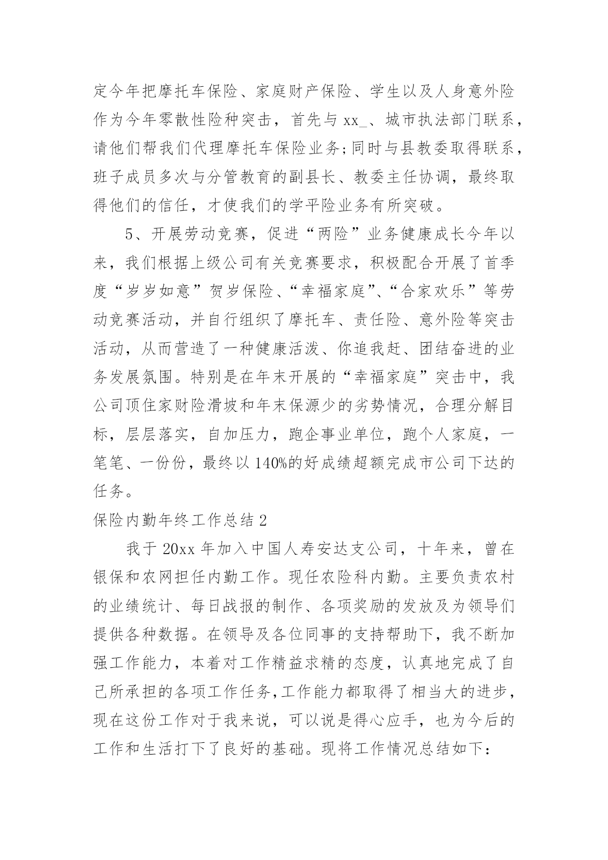 保险内勤年终工作总结保险内勤年终工作总结总结是事后对某一时期、某一项目或某些工作进行回顾和分析,从而做出带有规律性的结论,通过它可以全面地、系统地了解以往的学习和工作情况,我想我们需要写一份总结了吧。那么总结要注意有什么内容呢?以下是小编帮大家整理的保险内勤年终工作总结,欢迎阅读,希望大家能够喜欢。保险内勤年终工作总结11、围绕目标,落实计划,紧抓业务工作计划落实早、措施实20xx年初,我司经理室就针对xx地区保险市场变化及20xx年全年保费收入情况进行综合分析,将上级公司下达我司的各项指标进行层层分解,把计划分解成月计划,月月盘点、月月落实,有效的保证了对计划落实情况及时的进行监控和调整。在制定全年任务时充分考虑险种结构优化和业务承保质量,进一步明确了考核办法,把综合赔付率作为年终测评的重要数据。2、抢占车险市场,加大新工程、新项目的拓展力度,坚决的丢弃“垃圾保费”今年来,我们把稳固车险和企业财产保险,拓展新车市场和新工程新项目作为业务工作数量的基础上,坚决的丢弃屡保屡亏的“垃圾”业务一是确保续保业务及时回笼,我们要求各业务部门按月上报续保业务台帐,由经理室督促考核,并要求提前介入公关。一旦出现脱报,马上在全司公布,其他人员可以参与竞争,从而巩固了原有业务,大大减少了业务的流失,保证了主要险种的市场份额占有率。二是与地方政府有关部门建立联系网络,提前获悉新上项目、新上工程名录,并和xx_部门、汽车销售商建立友好合作关系,请他们帮助我们收集、提供新车信息,对潜在的新业务、新市场做到心中有数,充分把握市场主动,填补了因竞争等客观原因带来的业务不稳定因素。三是已失业务不放弃。我们不仅对20xx年业务台账做到笔笔清晰,并要求业务内勤把20xx年展业过程中流失的业务列出明细,并分解到相关部门,要求加大公关力度,找出脱保原因,确属停产企业、转卖报废车辆的,由经办人提供确切证明;属竞争流失的,我们决不消极退出,而是主动进攻,上门听取意见和建议,改善服务手段,逐个突破,全面争取回流。四是大小齐抓,能保则保。因为企业改制、转产、资金等因素对企业财产保险形成了较大的冲击,加之竞争等因素,使的展业难度和展业成本大大增加。针对这些情况,我们充分动员,统一思想,上下形成合力,迎难而上。做到责任到人,对保费在5万元以上的实行分管经理介入,共同公关。3、在竞争中求生存,在竞争中促发展。xx地区现有10家在我县争夺业务,而xx地区人口少,企业规模小,我司面对外部竞争所带来的业务压力,保持沉着冷静,客观面对现实情况寻求对策,与竞争对手们展开了一场品牌战、服务战:一是做好地方政府主要领导工作。公司经理室多次向县委、县政府主要领导汇报工作,突出汇报我司是如何加大对xx地方经济建设支持力度,是如何围绕地方政府中心开展工作的,我司积极参与了全民创业调研活动,与县领导一道走访个体、私营经济企业,不仅使县委、县政府对我司热心参与地方政府工作表示满意,还对我司正确调整业务发展方向,向中小企业提供保险保障,主动服务于他们,给予肯定。真实的让县委、县政府感到人保财险公司是真心为地方政府服务的,是值得扶持、信赖和帮助的,从而对我司工作给予了很大地倾斜。二是深入老客户企业,在客户企业中聘请信息员、联络员,并从其他保险企业抢挖业务尖子加盟我司,赢得“回流”业务,使其他保险公司的工作处于被动状态。三是服务更加人性化、亲密化,公司经理室成员年初就对县属各大系统骨干企业实行划块包干,进行了多次回访,请他们对我司工作提出意见和建议,这一举措得到了企业的充分肯定,他们认为公司领导主动登门是人保财险的优质服务的充分体现,使客户对我司更加信任。四是要求所有中层干部走出办公室,对所有中小企业必须亲自上门拜访,对所有新保客户必须当面解释条款并承诺服务项目,与企业进行不断的联络,实行零距离接触,只要客户需要必须随叫随到,提供各方面服务。五是按照向社会服务承诺和行业禁令,严格内部管控,以理赔和承保两大服务部门为切入口,全面提高公司整体服务水平。4、以分散性业务为突破口,加大市场占有面根据xx当前阶段的保源情况,年初,经理室经过仔细的分析研究,确定今年把摩托车保险、家庭财产保险、学生以及人身意外险作为今年零散性险种突击,首先与xx_、城市执法部门联系,请他们帮我们代理摩托车保险业务;同时与县教委取得联系,班子成员多次与分管教育的副县长、教委主任协调,最终取得他们的信任,才使我们的学平险业务有所突破。5、开展劳动竞赛,促进“两险”业务健康成长今年以来,我们根据上级公司有关竞赛要求,积极配合开展了首季度“岁岁如意”贺岁保险、“幸福家庭”、“合家欢乐”等劳动竞赛活动,并自行组织了摩托车、责任险、意外险等突击活动,从而营造了一种健康活泼、你追我赶、团结奋进的业务发展氛围。特别是在年末开展的“幸福家庭”突击中,