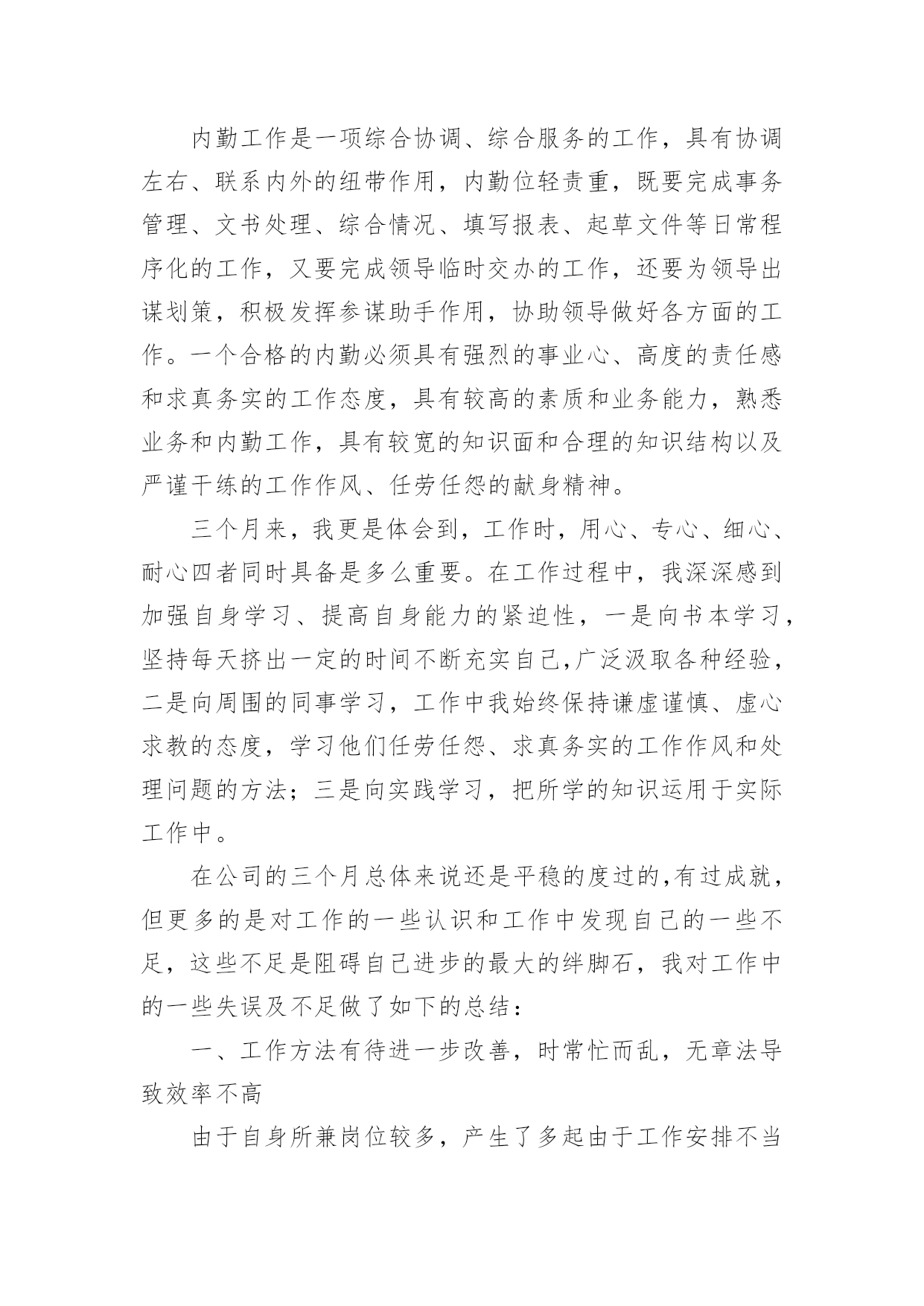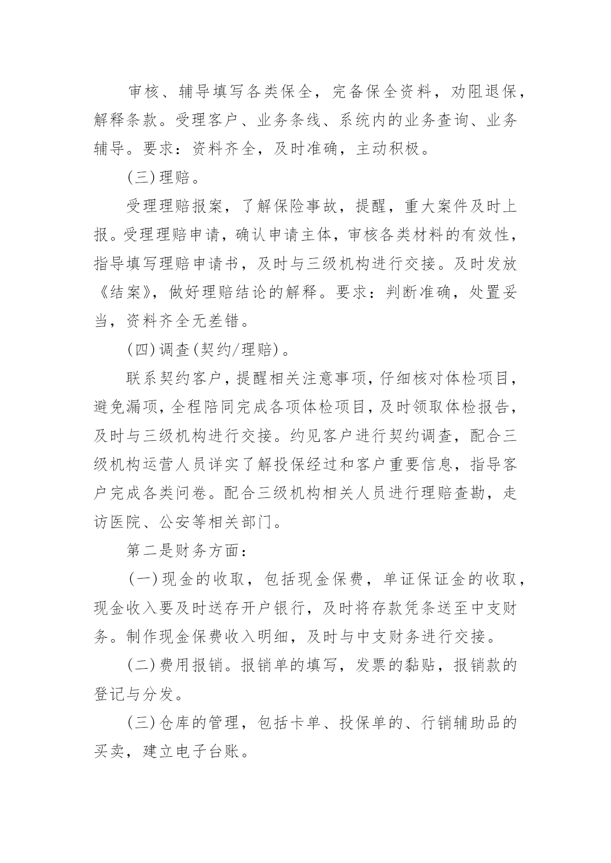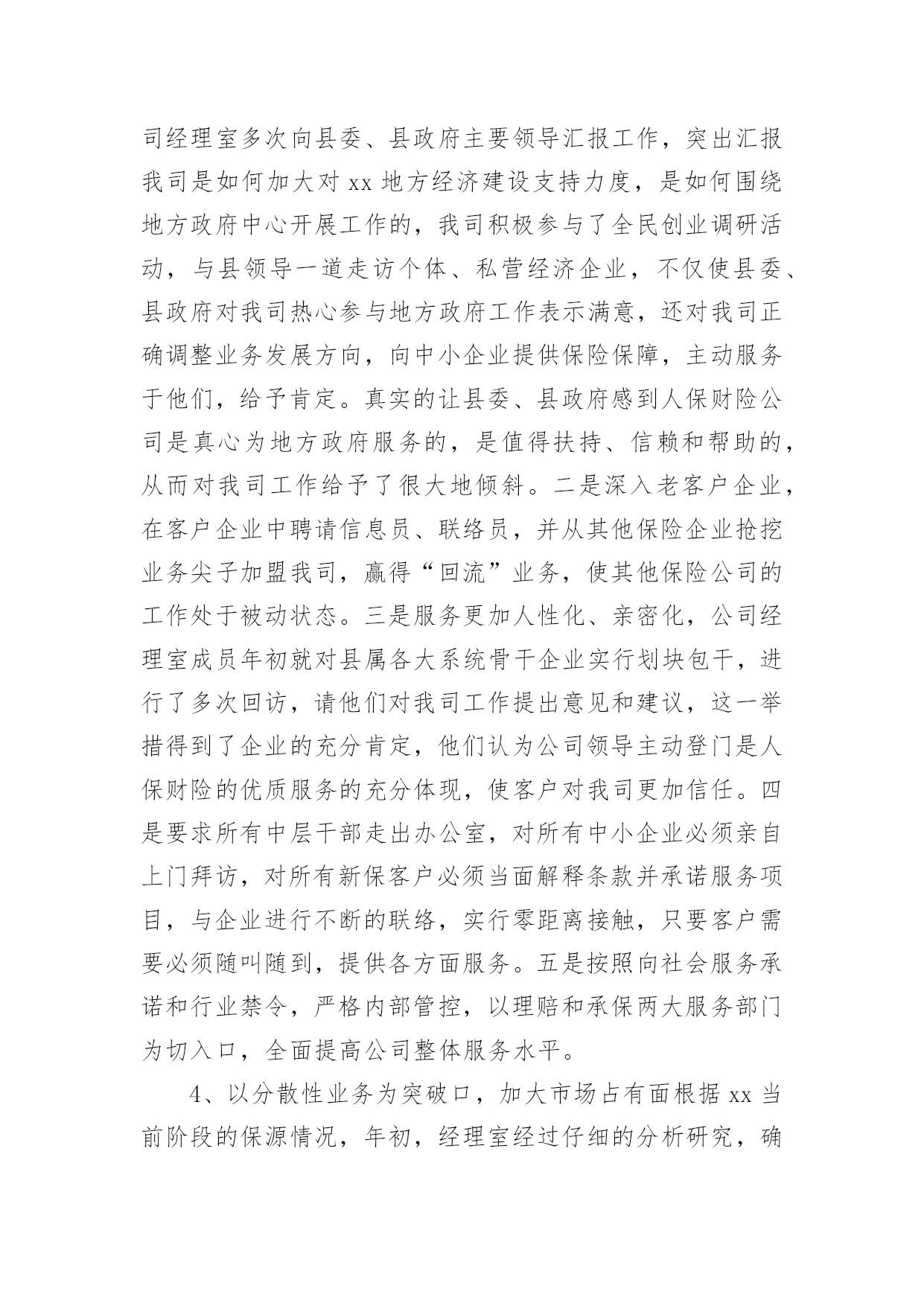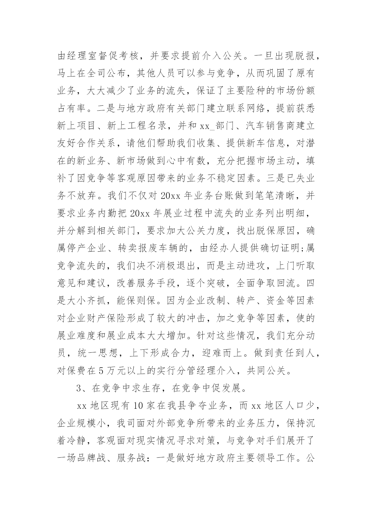 保险内勤年终工作总结保险内勤年终工作总结总结是事后对某一时期、某一项目或某些工作进行回顾和分析,从而做出带有规律性的结论,通过它可以全面地、系统地了解以往的学习和工作情况,我想我们需要写一份总结了吧。那么总结要注意有什么内容呢?以下是小编帮大家整理的保险内勤年终工作总结,欢迎阅读,希望大家能够喜欢。保险内勤年终工作总结11、围绕目标,落实计划,紧抓业务工作计划落实早、措施实20xx年初,我司经理室就针对xx地区保险市场变化及20xx年全年保费收入情况进行综合分析,将上级公司下达我司的各项指标进行层层分解,把计划分解成月计划,月月盘点、月月落实,有效的保证了对计划落实情况及时的进行监控和调整。在制定全年任务时充分考虑险种结构优化和业务承保质量,进一步明确了考核办法,把综合赔付率作为年终测评的重要数据。2、抢占车险市场,加大新工程、新项目的拓展力度,坚决的丢弃“垃圾保费”今年来,我们把稳固车险和企业财产保险,拓展新车市场和新工程新项目作为业务工作数量的基础上,坚决的丢弃屡保屡亏的“垃圾”业务一是确保续保业务及时回笼,我们要求各业务部门按月上报续保业务台帐,由经理室督促考核,并要求提前介入公关。一旦出现脱报,马上在全司公布,其他人员可以参与竞争,从而巩固了原有业务,大大减少了业务的流失,保证了主要险种的市场份额占有率。二是与地方政府有关部门建立联系网络,提前获悉新上项目、新上工程名录,并和xx_部门、汽车销售商建立友好合作关系,请他们帮助我们收集、提供新车信息,对潜在的新业务、新市场做到心中有数,充分把握市场主动,填补了因竞争等客观原因带来的业务不稳定因素。三是已失业务不放弃。我们不仅对20xx年业务台账做到笔笔清晰,并要求业务内勤把20xx年展业过程中流失的业务列出明细,并分解到相关部门,要求加大公关力度,找出脱保原因,确属停产企业、转卖报废车辆的,由经办人提供确切证明;属竞争流失的,我们决不消极退出,而是主动进攻,上门听取意见和建议,改善服务手段,逐个突破,全面争取回流。四是大小齐抓,能保则保。因为企业改制、转产、资金等因素对企业财产保险形成了较大的冲击,加之竞争等因素,使的展业难度和展业成本大大增加。针对这些情况,我们充分动员,统一思想,上下形成合力,迎难而上。做到责任到人,对保费在5万元以上的实行分管经理介入,共同公关。3、在竞争中求生存,在竞争中促发展。xx地区现有10家在我县争夺业务,而xx地区人口少,企业规模小,我司面对外部竞争所带来的业务压力,保持沉着冷静,客观面对现实情况寻求对策,与竞争对手们展开了一场品牌战、服务战:一是做好地方政府主要领导工作。公司经理室多次向县委、县政府主要领导汇报工作,突出汇报我司是如何加大对xx地方经济建设支持力度,是如何围绕地方政府中心开展工作的,我司积极参与了全民创业调研活动,与县领导一道走访个体、私营经济企业,不仅使县委、县政府对我司热心参与地方政府工作表示满意,还对我司正确调整业务发展方向,向中小企业提供保险保障,主动服务于他们,给予肯定。真实的让县委、县政府感到人保财险公司是真心为地方政府服务的,是值得扶持、信赖和帮助的,从而对我司工作给予了很大地倾斜。二是深入老客户企业,在客户企业中聘请信息员、联络员,并从其他保险企业抢挖业务尖子加盟我司,赢得“回流”业务,使其他保险公司的工作处于被动状态。三是服务更加人性化、亲密化,公司经理室成员年初就对县属各大系统骨干企业实行划块包干,进行了多次回访,请他们对我司工作提出意见和建议,这一举措得到了企业的充分肯定,他们认为公司领导主动登门是人保财险的优质服务的充分体现,使客户对我司更加信任。四是要求所有中层干部走出办公室,对所有中小企业必须亲自上门拜访,对所有新保客户必须当面解释条款并承诺服务项目,与企业进行不断的联络,实行零距离接触,只要客户需要必须随叫随到,提供各方面服务。五是按照向社会服务承诺和行业禁令,严格内部管控,以理赔和承保两大服务部门为切入口,全面提高公司整体服务水平。4、以分散性业务为突破口,加大市场占有面根据xx当前阶段的保源情况,年初,经理室经过仔细的分析研究,确定今年把摩托车保险、家庭财产保险、学生以及人身意外险作为今年零散性险种突击,首先与xx_、城市执法部门联系,请他们帮我们代理摩托车保险业务;同时与县教委取得联系,班子成员多次与分管教育的副县长、教委主任协调,最终取得他们的信任,才使我们的学平险业务有所突破。5、开展劳动竞赛,促进“两险”业务健康成长今年以来,我们根据上级公司有关竞赛要求,积极配合开展了首季度“岁岁如意”贺岁保险、“幸福家庭”、“合家欢乐”等劳动竞赛活动,并自行组织了摩托车、责任险、意外险等突击活动,从而营造了一种健康活泼、你追我赶、团结奋进的业务发展氛围。特别是在年末开展的“幸福家庭”突击中,