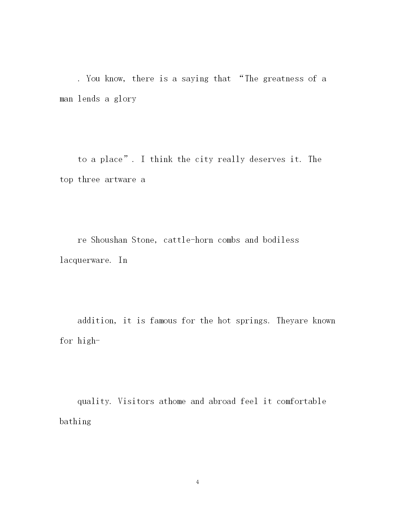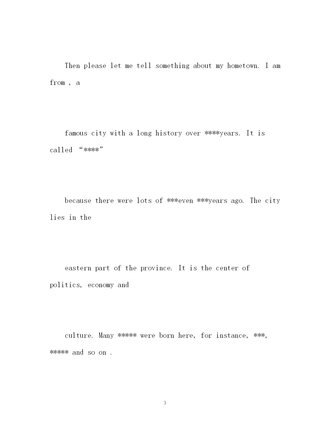 此资料由网络收集而来,如有侵权请告知上传者立即删除。资料共分享,我们负责传递知识。PAGEPAGE5医学研究生英文自我介绍医学研究生英文自我介绍医学研究生英文自我介绍Helloeveryone,Mynameis***,I’m**yearsold.Nowlettellyouaboutmyplansinthepostgraduatestudy.First,IhopeIcanformsystematicviewof*****.Asfor******,myexpresswishistogetacompletecomprehensionoftheformationanddevelopmentaswellas**************.Ifpossible,Iwillgoonwithmystudyfordoctoratedegree.Iamlookingforwardtomakingasolidfoundationforfutureprofessionaftertwoyearsstudyhere.Thenpleaseletmetellsomethingaboutmyhometown.Iamfrom,afamouscitywithalonghistoryover****years.Itiscalled“****”becausetherewerelotsof***even***yearsago.Thecityliesintheeasternpartoftheprovince.Itisthecenterofpolitics,economyandculture.Many*****werebornhere,forinstance,***,*****andsoon..Youknow,thereisasayingthat“Thegreatnessofamanlendsaglorytoaplace”.Ithinkthecityreallydeservesit.ThetopthreeartwareareShoushanStone,cattle-horncombsandbodilesslacquerware.Inaddition,itisfamousforthehotsprings.Theyareknownforhigh-quality.Visitorsathomeandabroadfeelitcomfortablebathinghere.Thereismybelovedhometown.Ithinknotingisdiffficultifyouputyourheartintoit,somyfuturewillbeveryniace,right?