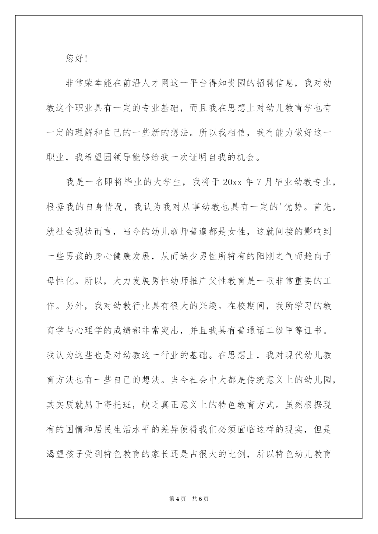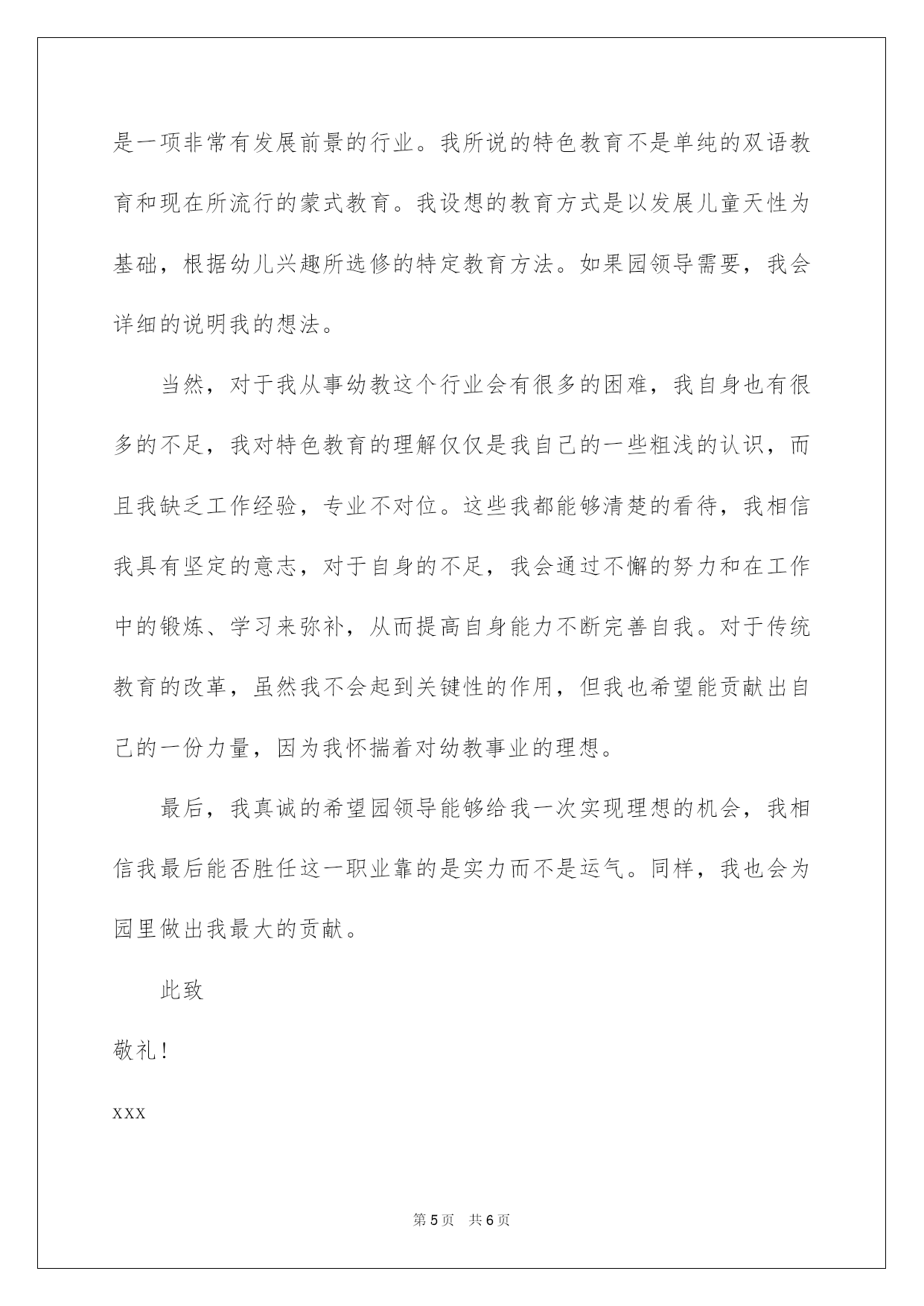 第PAGE\*Arabic\*MERGEFORMAT6页共NUMPAGES\*Arabic\*MERGEFORMAT6页第PAGE\*MERGEFORMAT6页共NUMPAGES\*MERGEFORMAT6页第PAGE\*MERGEFORMAT6页共NUMPAGES\*MERGEFORMAT6页第PAGE\*MERGEFORMAT6页共NUMPAGES\*MERGEFORMAT6页第PAGE\*MERGEFORMAT6页共NUMPAGES\*MERGEFORMAT6页第PAGE\*MERGEFORMAT6页共NUMPAGES\*MERGEFORMAT6页第PAGE\*MERGEFORMAT6页共NUMPAGES\*MERGEFORMAT6页第PAGE\*MERGEFORMAT6页共NUMPAGES\*MERGEFORMAT6页第PAGE\*MERGEFORMAT6页共NUMPAGES\*MERGEFORMAT6页第PAGE\*MERGEFORMAT6页共NUMPAGES\*MERGEFORMAT6页第PAGE\*MERGEFORMAT6页共NUMPAGES\*MERGEFORMAT6页2022幼儿教育求职信三篇幼儿教育求职信三篇在日常生活或是工作学习中,大家都接触过书信吧,书信有助于增进人与人之间的交流。那么你有了解过书信吗?以下是我整理的幼儿教育求职信3篇,仅供参考,希望能够帮助到大家。幼儿教育求职信篇1诚挚的感谢您在百忙之中抽出宝贵的时间来翻阅我的求职书。我叫丘xx,我是广西XX职业学院20xx届的毕业生。我很荣幸有机会向您呈上我的个人资料。在投身社会之际,为了找到适合自己且有兴趣的工作,更好地发挥的才能,实现自己的人生价值,谨向各位领导作一自我推荐。现将自己的情况简要介绍如下:作为一名学前教育专业的大学生,我热爱我的专业并为其投入了巨大的热情和精力。在几年的学习生活中,本人在几年中系统学习了教育学、心理学、普通心理学、声乐、舞蹈、美术、学前教育学、幼儿教育心理学、卫生学、幼儿教育研究方法等课程。我正处于人生中精力充沛的时期,我渴望在更广阔的天地里展露自己的才能,我不满足与现有的知识水平,期望在实践中得到锻炼和提高,因此我希望能够加入你们的单位。我会踏踏实实的做好属于自己的一份工作,竭尽全力的在工作中取得好的成绩。我相信经过自己的勤奋和努力,一定会做出应有的贡献。感谢您在百忙之中所给与我的关注,愿贵单位事业蒸蒸日上,屡创佳绩,祝您的事业白尺竿头,更进一步!我相信领导一定会是伯乐,能在人才之海中用自己不同寻常的眼光找到自己需要的千里之马!此致敬礼!幼儿教育求职信篇2尊敬的校长先生:您好!我是黄山学院初等教育学院20xx年xxx,毕业在际,我已做好各方面的准备,有足够的信心和能力从事幼儿教育工作。衷心希望能到贵校任教,在您麾下效力。我的性格比较开朗,为人直爽,平时爱说爱笑爱玩爱闹,但做起事来认真投入,责任感强,思维比较活跃,具有较强的创新意识和能力。在校期间,主修了音乐舞蹈和幼儿教育学、心理学、卫生学等相关的课程与实验,选修了乒乓球和特岗等课程,学习认真努力,成绩优良。教育实习期间,积极深入班级、悉心研究教法,虚心向师长求教,在教学方面进步很快,受到师生的一致好评,实习成绩优秀。我对自己的能力颇有信心,参加过样校舞蹈大赛的演出及外面活动的演出;我积极参加学校社团的活动锻炼,深入社会,感受颇多;大四的时候去过南京一所幼儿园见实习。作为毕业时选择去向的参考。我是一个敢想敢做的人,犹如此刻,我想着自己的未来,也在做着自己的努力。做一优秀的教师是我一直以来的理想;我所崇高的教育是以人为本,因人施教。教育、教师、学校应该是为学生服务的。为一切学生,为学生的一切,我愿用我毕生精力,精心培育满园桃李!最后,感谢您百忙之中阅读我的求职信,更希望能有机会向您当面致谢!幼儿教育求职信篇3尊敬的园长:您好!非常荣幸能在前沿人才网这一平台得知贵园的招聘信息,我对幼教这个职业具有一定的专业基础,而且我在思想上对幼儿教育学也有一定的理解和自己的一些新的想法。所以我相信,我有能力做好这一职业,我希望园领导能够给我一次证明自我的机会。我是一名即将毕业的大学生,我将于20xx年7月毕业幼教专业,根据我的自身情况,我认为我对从事幼教也具有一定的'优势。首先,就社会现状而言,当今的幼儿教师普遍都是女性,这就间接的影响到一些男孩的身心健康发展,从而缺少男性所特有的阳刚之气而趋向于母性化。所以,大力发展男性幼师推广父性教育是一项非常重要的工作。另外,我对幼教行业具有很大的兴趣。在校期间,我所学习的教育学与心理学的