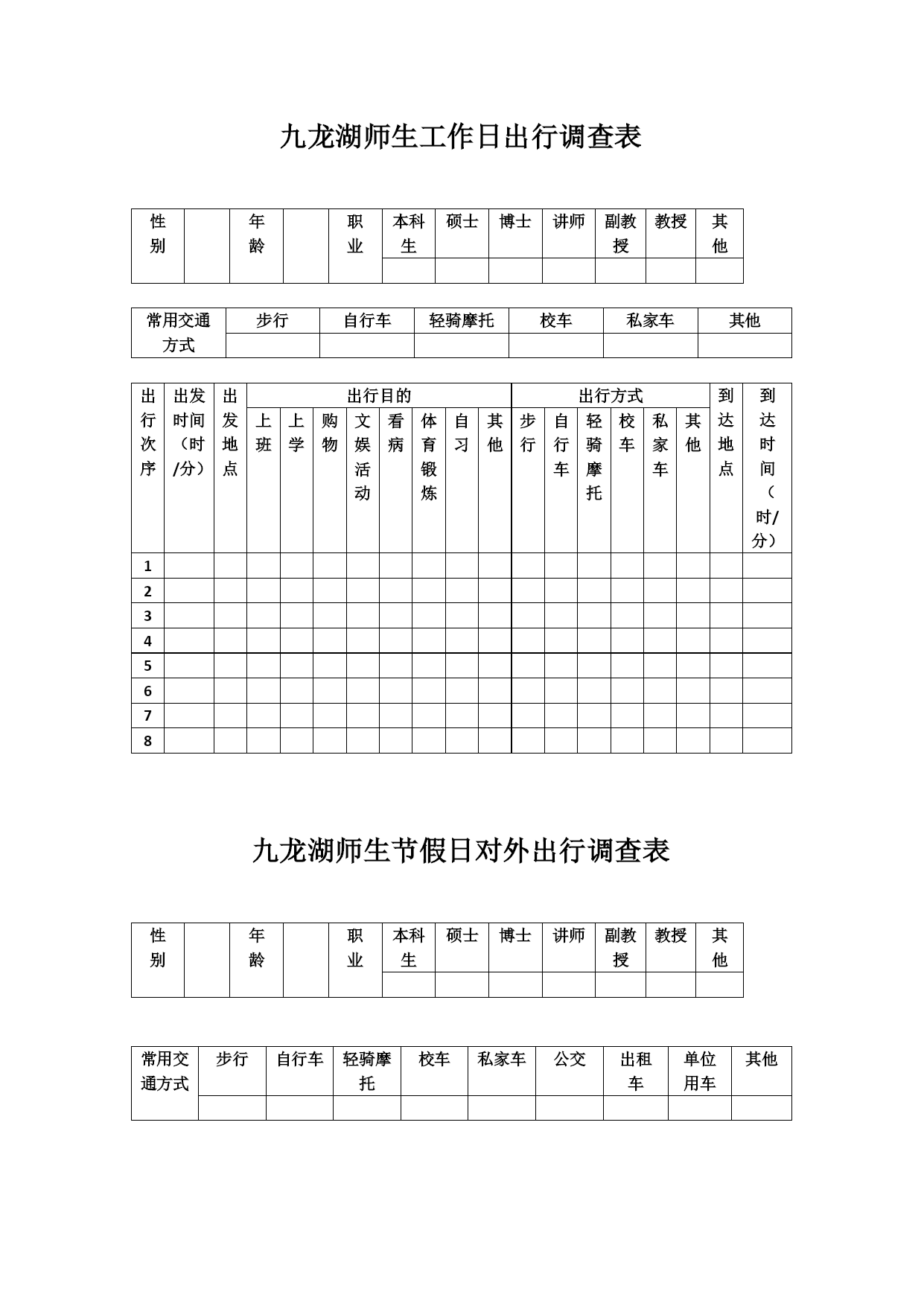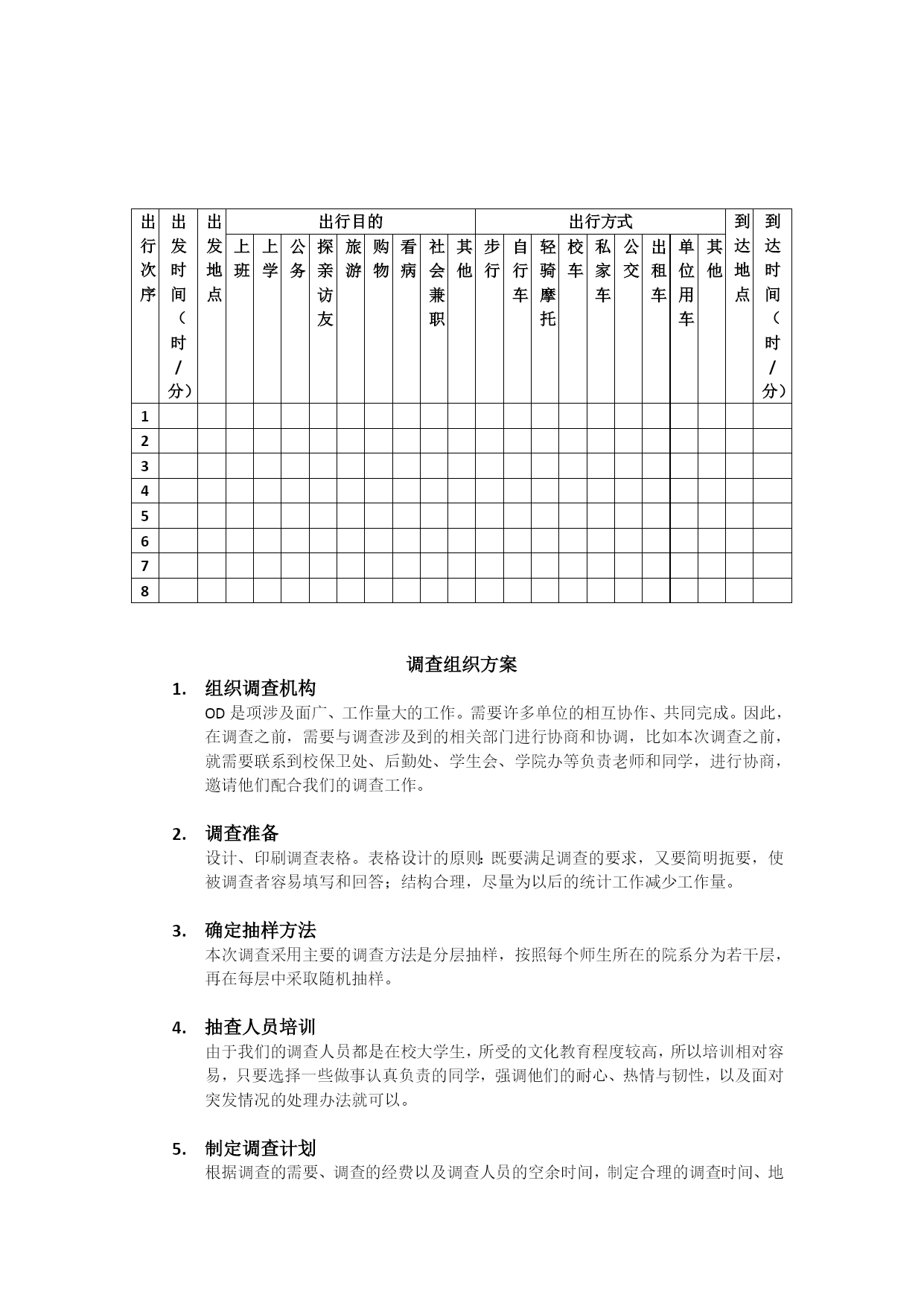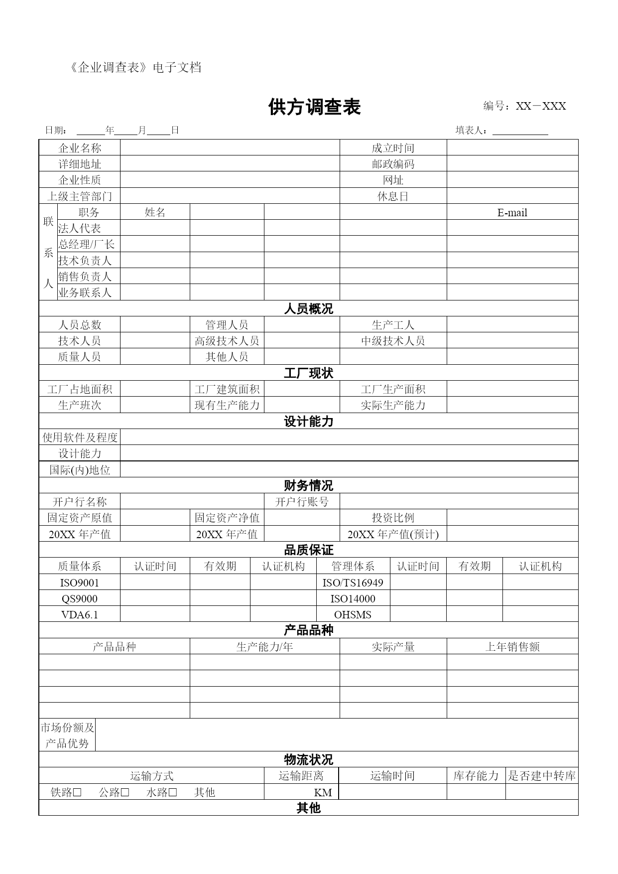 生活垃圾调查表优质资料(可以直接使用,可编辑优质资料,欢迎下载)家庭生活垃圾调查表时间周一周二周三周四周五周六周日合计可回收不可回收厨余垃圾其他垃圾总计家庭生活垃圾调查表时间周一周二周三周四周五周六周日合计可回收不可回收厨余垃圾其他垃圾总计家庭生活垃圾调查表时间周一周二周三周四周五周六周日合计可回收不可回收厨余垃圾其他垃圾总计家庭生活垃圾调查表时间周一周二周三周四周五周六周日合计可回收不可回收厨余垃圾其他垃圾总计家庭生活垃圾调查表时间周一周二周三周四周五周六周日合计可回收不可回收厨余垃圾其他垃圾总计家庭生活垃圾调查表时间周一周二周三周四周五周六周日合计可回收不可回收厨余垃圾其他垃圾总计家庭生活垃圾调查表时间周一周二周三周四周五周六周日合计可回收不可回收厨余垃圾其他垃圾总计家庭生活垃圾调查表时间周一周二周三周四周五周六周日合计可回收不可回收厨余垃圾其他垃圾总计家庭生活垃圾调查表时间周一周二周三周四周五周六周日合计可回收不可回收厨余垃圾其他垃圾总计家庭生活垃圾调查表时间周一周二周三周四周五周六周日合计可回收不可回收厨余垃圾其他垃圾总计九龙湖师生工作日出行调查表性别年龄职业本科生硕士博士讲师副教授教授其他常用交通方式步行自行车轻骑摩托校车私家车其他出行次序出发时间(时/分)出发地点出行目的出行方式到达地点到达时间(时/分)上班上学购物文娱活动看病体育锻炼自习其他步行自行车轻骑摩托校车私家车其他12345678九龙湖师生节假日对外出行调查表性别年龄职业本科生硕士博士讲师副教授教授其他常用交通方式步行自行车轻骑摩托校车私家车公交出租车单位用车其他出行次序出发时间(时/分)出发地点出行目的出行方式到达地点到达时间(时/分)上班上学公务探亲访友旅游购物看病社会兼职其他步行自行车轻骑摩托校车私家车公交出租车单位用车其他12345678调查组织方案组织调查机构OD是项涉及面广、工作量大的工作。需要许多单位的相互协作、共同完成。因此,在调查之前,需要与调查涉及到的相关部门进行协商和协调,比如本次调查之前,就需要联系到校保卫处、后勤处、学生会、学院办等负责老师和同学,进行协商,邀请他们配合我们的调查工作。调查准备设计、印刷调查表格。表格设计的原则:既要满足调查的要求,又要简明扼要,使被调查者容易填写和回答;结构合理,尽量为以后的统计工作减少工作量。确定抽样方法本次调查采用主要的调查方法是分层抽样,按照每个师生所在的院系分为若干层,再在每层中采取随机抽样。抽查人员培训由于我们的调查人员都是在校大学生,所受的文化教育程度较高,所以培训相对容易,只要选择一些做事认真负责的同学,强调他们的耐心、热情与韧性,以及面对突发情况的处理办法就可以。制定调查计划根据调查的需要、调查的经费以及调查人员的空余时间,制定合理的调查时间、地点,使调查高效的完成。典型试验在调查工作开展之前,应先做小范围的典型试验,发现和改善调查计划中不完美的地方,及时纠正,确保达到预期效果。实地调查实地调查过程中,必须严格把关,及时抽查,以发现问题,保证调查的合理性和准确性。《企业调查表》电子文档编号:XX-XXX日期:年月日填表人:供方调查表企业名称成立时间详细地址邮政编码企业性质网址上级主管部门休息日联系人职务姓名E-mail法人代表总经理/厂长技术负责人销售负责人业务联系人人员概况人员总数管理人员生产工人技术人员高级技术人员中级技术人员质量人员其他人员工厂现状工厂占地面积工厂建筑面积工厂生产面积生产班次现有生产能力实际生产能力设计能力使用软件及程度设计能力国际(内)地位财务情况开户行名称开户行账号固定资产原值固定资产净值投资比例20XX年产值20XX年产值20XX年产值(预计)品质保证质量体系认证时间有效期认证机构管理体系认证时间有效期认证机构ISO9001ISO/TS16949QS9000ISO14000VDA6.1OHSMS产品品种产品品种生产能力/年实际产量上年销售额市场份额及产品优势物流状况运输方式运输距离运输时间库存能力是否建中转库铁路公路水路其他KM其他说明:附:组织机构图;附:通过第三方认证的体系认证证书复印件;附:主要客户见《产品配套统计表》、生产设备见《生产设备统计表》、检测试验设备见《检测试验设备统计表》产品配套统计表序号公司名称车型产品上年度配套量份额配套日期目前生产能力主要生产设备统计表序号设备名称规格型号数量(台)生产厂家投入使用日期设备状况备注主要检测、试验设备统计表序号设备名称规格型号数量(台)生产厂家投入使用日期设备状况备注