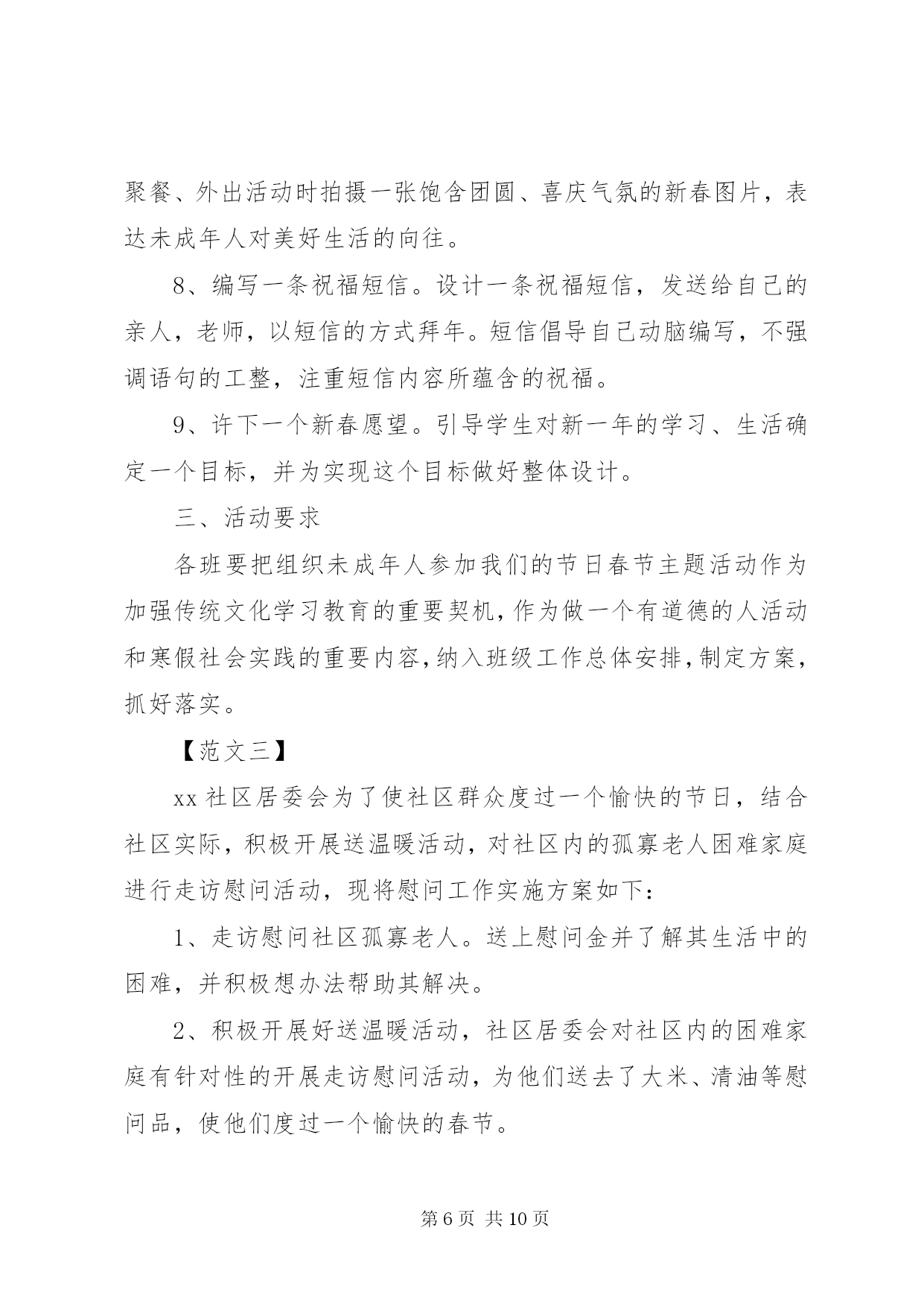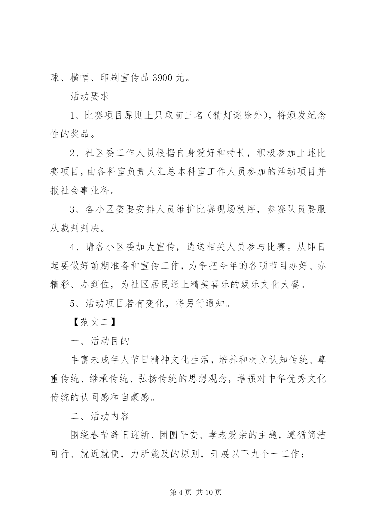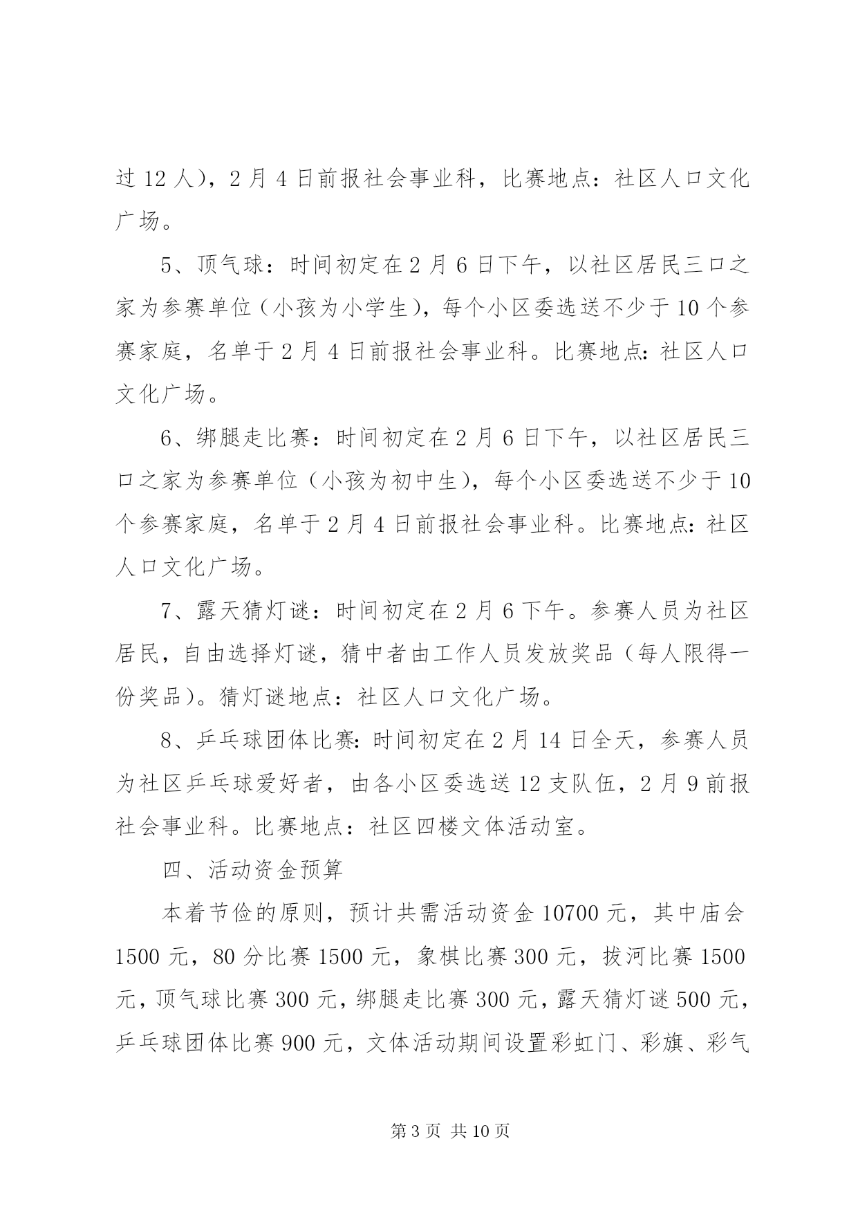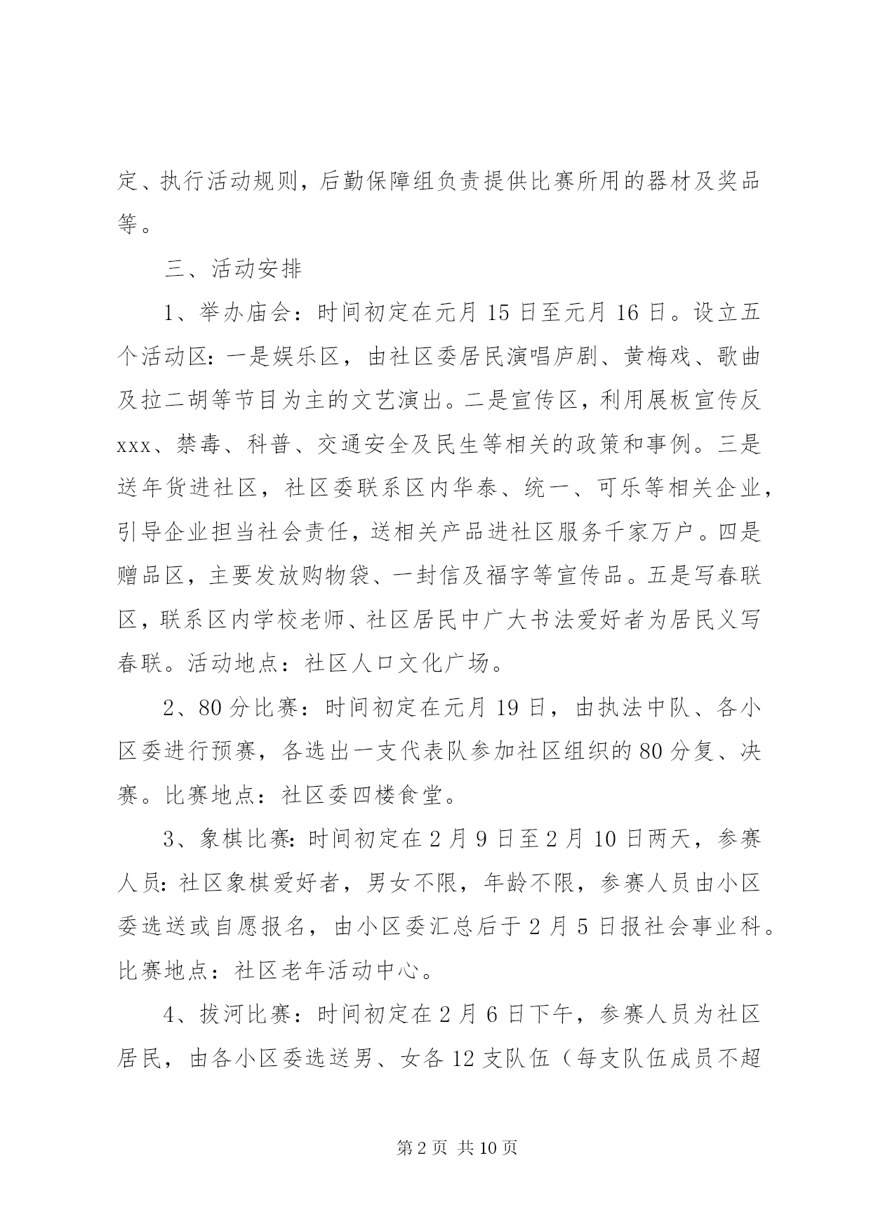 第PAGE\*Arabic\*MERGEFORMAT10页共NUMPAGES\*MERGEFORMAT10页社区春节活动方案社区春节活动方案【范文一】为丰富社区居民的文化生活需求,愉悦身心,陶冶情操,搭建居民之间相互交流沟通平台,增进邻里情,增强社区的凝聚力、向心力,营造出一种团结奋进、文明和谐、喜庆祥和的浓郁氛围,按照区工委办的安排,结合社区实际,制定社区20xx年春节期间文体活动方案。一、指导思想为深入践行三个代表重要思想,努力构建公共文化服务体系,为广大居民提供更多优质文化产品和文化服务,不断满足广大居民对文化生活的需求。全面落实科学发展观,贯彻落实党的十八大会议精神,始终把握社会主义先进文化方向,促进社区物质文明、政治文明和精神文明协调发展,全面建设和谐社区。二、组织领导为切实开展好社区的文体活动,成立社区20xx年春节文体活动筹备组,组长为陈圣炜,副组长为徐祥忠、支云秀、胡正田、邹鹏,成员为聂祖国、吴君来、蔡圣法、王心友、李正保,筹备小组下设评委裁判组和后勤保障组,胡正田兼任裁判组组长,成员为吴永深、徐志军、黄寿余,支云秀兼任后勤保障组组长,成员为卫守才、孙跃华。评委裁判组负责策划、提供活动场地及制定、执行活动规则,后勤保障组负责提供比赛所用的器材及奖品等。三、活动安排1、举办庙会:时间初定在元月15日至元月16日。设立五个活动区:一是娱乐区,由社区委居民演唱庐剧、黄梅戏、歌曲及拉二胡等节目为主的文艺演出。二是宣传区,利用展板宣传反xxx、禁毒、科普、交通安全及民生等相关的政策和事例。三是送年货进社区,社区委联系区内华泰、统一、可乐等相关企业,引导企业担当社会责任,送相关产品进社区服务千家万户。四是赠品区,主要发放购物袋、一封信及福字等宣传品。五是写春联区,联系区内学校老师、社区居民中广大书法爱好者为居民义写春联。活动地点:社区人口文化广场。2、80分比赛:时间初定在元月19日,由执法中队、各小区委进行预赛,各选出一支代表队参加社区组织的80分复、决赛。比赛地点:社区委四楼食堂。3、象棋比赛:时间初定在2月9日至2月10日两天,参赛人员:社区象棋爱好者,男女不限,年龄不限,参赛人员由小区委选送或自愿报名,由小区委汇总后于2月5日报社会事业科。比赛地点:社区老年活动中心。4、拔河比赛:时间初定在2月6日下午,参赛人员为社区居民,由各小区委选送男、女各12支队伍(每支队伍成员不超过12人),2月4日前报社会事业科,比赛地点:社区人口文化广场。5、顶气球:时间初定在2月6日下午,以社区居民三口之家为参赛单位(小孩为小学生),每个小区委选送不少于10个参赛家庭,名单于2月4日前报社会事业科。比赛地点:社区人口文化广场。6、绑腿走比赛:时间初定在2月6日下午,以社区居民三口之家为参赛单位(小孩为初中生),每个小区委选送不少于10个参赛家庭,名单于2月4日前报社会事业科。比赛地点:社区人口文化广场。7、露天猜灯谜:时间初定在2月6下午。参赛人员为社区居民,自由选择灯谜,猜中者由工作人员发放奖品(每人限得一份奖品)。猜灯谜地点:社区人口文化广场。8、乒乓球团体比赛:时间初定在2月14日全天,参赛人员为社区乒乓球爱好者,由各小区委选送12支队伍,2月9前报社会事业科。比赛地点:社区四楼文体活动室。四、活动资金预算本着节俭的原则,预计共需活动资金10700元,其中庙会1500元,80分比赛1500元,象棋比赛300元,拔河比赛1500元,顶气球比赛300元,绑腿走比赛300元,露天猜灯谜500元,乒乓球团体比赛900元,文体活动期间设置彩虹门、彩旗、彩气球、横幅、印刷宣传品3900元。活动要求1、比赛项目原则上只取前三名(猜灯谜除外),将颁发纪念性的奖品。2、社区委工作人员根据自身爱好和特长,积极参加上述比赛项目,由各科室负责人汇总本科室工作人员参加的活动项目并报社会事业科。3、各小区委要安排人员维护比赛现场秩序,参赛队员要服从裁判判决。4、请各小区委加大宣传,选送相关人员参与比赛。从即日起要做好前期准备和宣传工作,力争把今年的各项节目办好、办精彩、办到位,为社区居民送上精美喜乐的娱乐文化大餐。5、活动项目若有变化,将另行通知。【范文二】一、活动目的丰富未成年人节日精神文化生活,培养和树立认知传统、尊重传统、继承传统、弘扬传统的思想观念,增强对中华优秀文化传统的认同感和自豪感。二、活动内容围绕春节辞旧迎新、团圆平安、孝老爱亲的主题,遵循简洁可行、就近就便,力所能及的原则,开展以下九个一工作:1、创编一份节日小报。通过学习节日文化、搜集节日资料、参加民俗活动,深入了解春节的文化内涵,通过自编的节日小报,展示节日收获和感悟。2、参加一次中华经典诵读等各类假期实践活动。通过阅读与春节有关的名篇、典故;观看春节文艺节