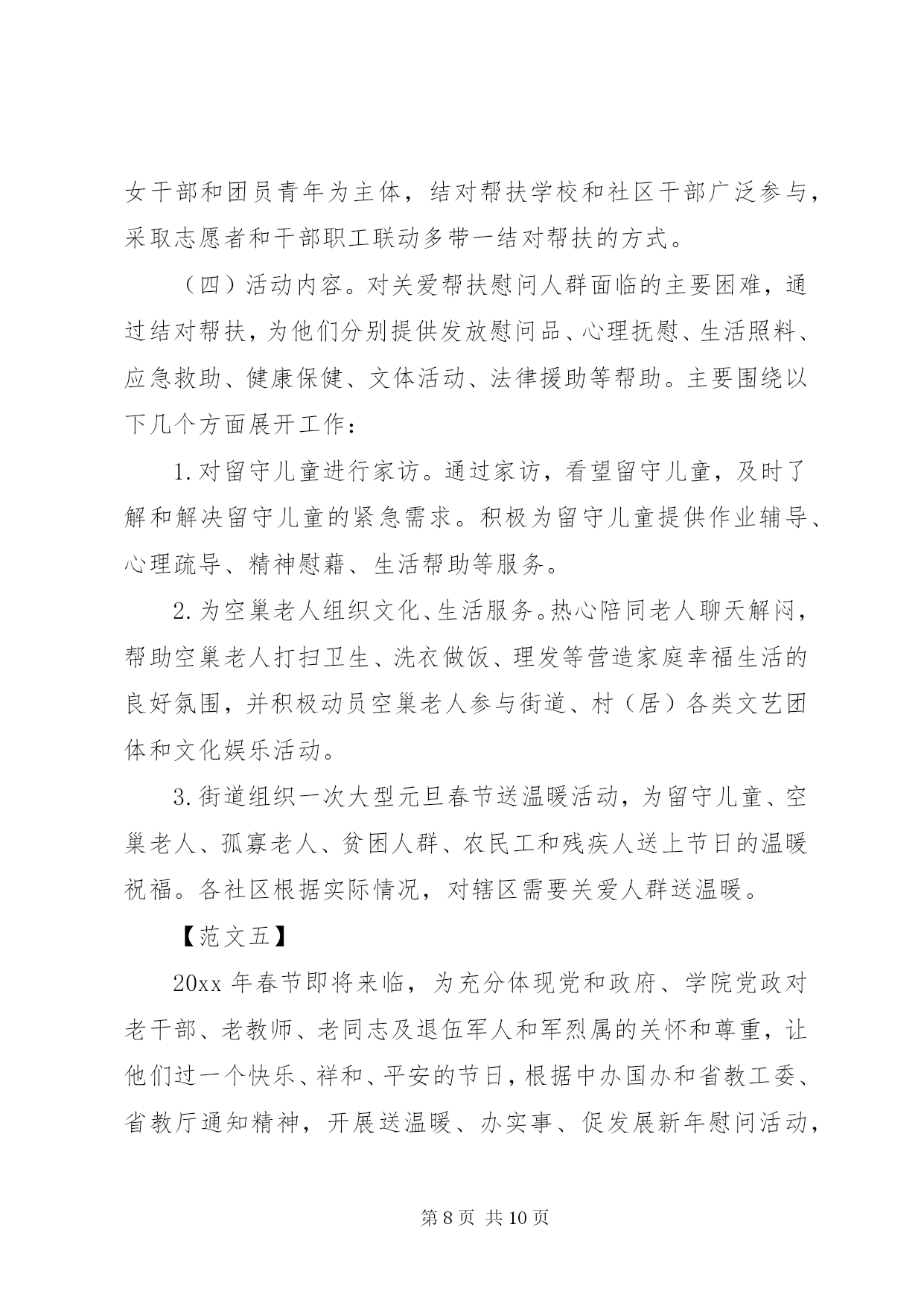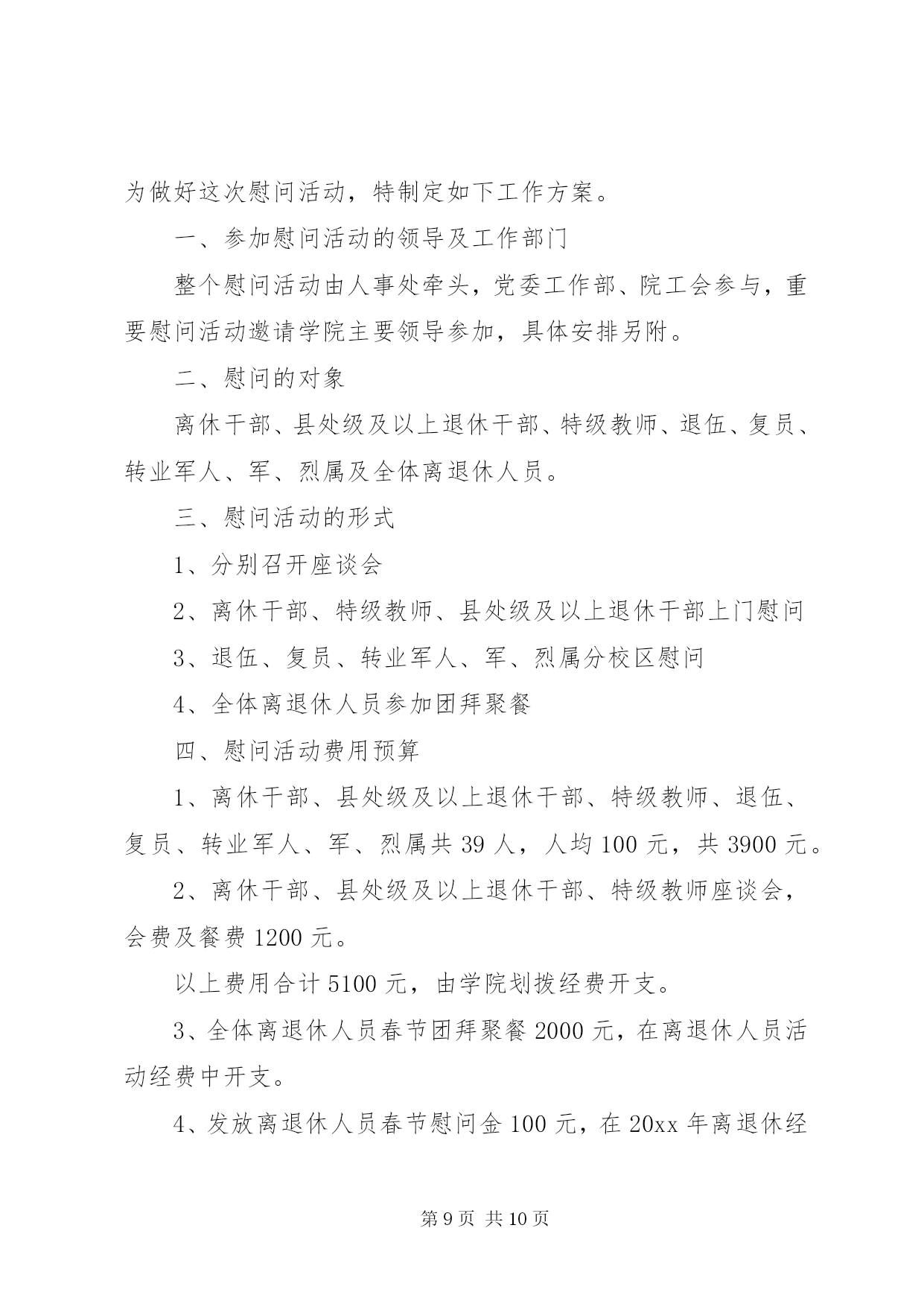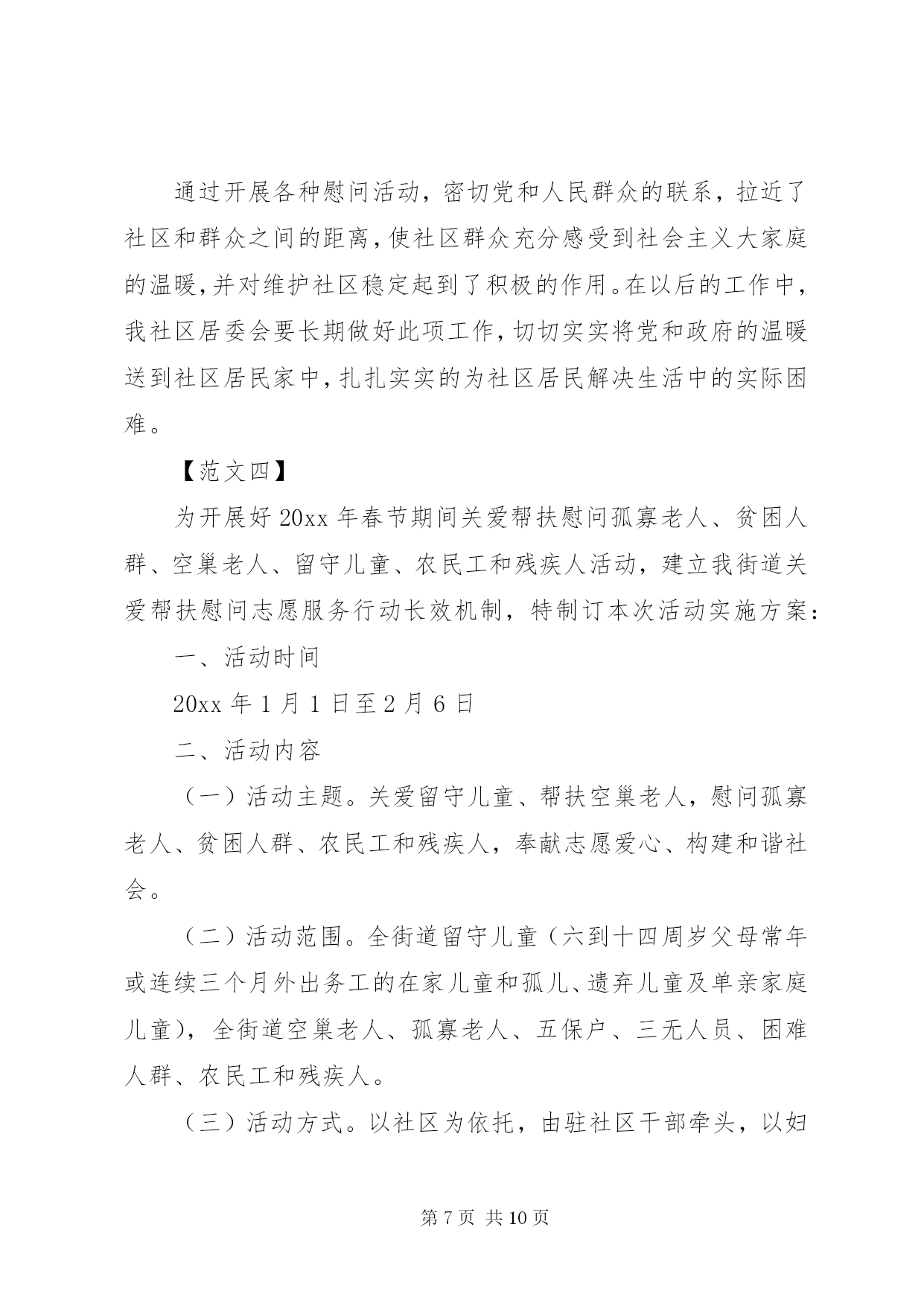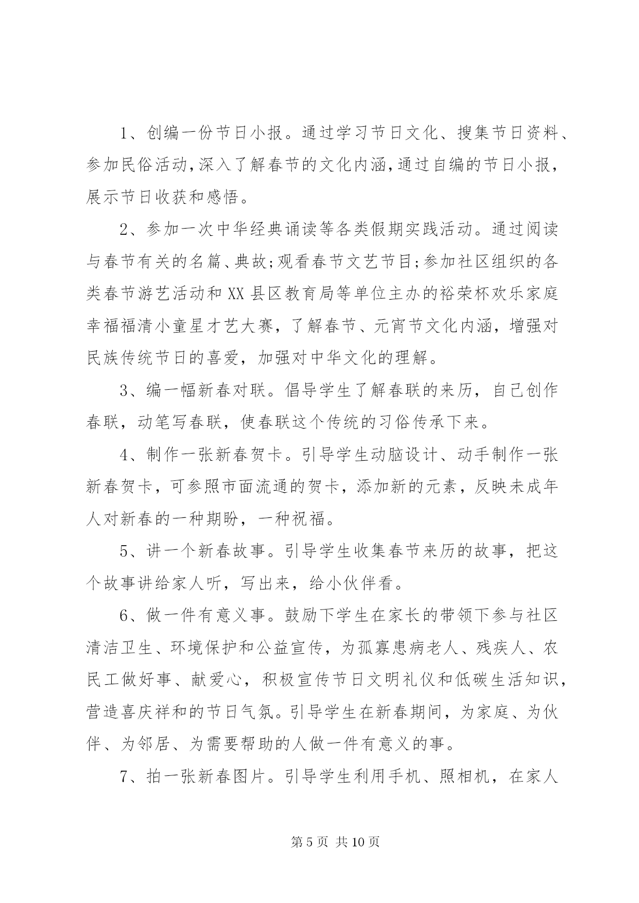 第PAGE\*Arabic\*MERGEFORMAT10页共NUMPAGES\*MERGEFORMAT10页社区春节活动方案社区春节活动方案【范文一】为丰富社区居民的文化生活需求,愉悦身心,陶冶情操,搭建居民之间相互交流沟通平台,增进邻里情,增强社区的凝聚力、向心力,营造出一种团结奋进、文明和谐、喜庆祥和的浓郁氛围,按照区工委办的安排,结合社区实际,制定社区20xx年春节期间文体活动方案。一、指导思想为深入践行三个代表重要思想,努力构建公共文化服务体系,为广大居民提供更多优质文化产品和文化服务,不断满足广大居民对文化生活的需求。全面落实科学发展观,贯彻落实党的十八大会议精神,始终把握社会主义先进文化方向,促进社区物质文明、政治文明和精神文明协调发展,全面建设和谐社区。二、组织领导为切实开展好社区的文体活动,成立社区20xx年春节文体活动筹备组,组长为陈圣炜,副组长为徐祥忠、支云秀、胡正田、邹鹏,成员为聂祖国、吴君来、蔡圣法、王心友、李正保,筹备小组下设评委裁判组和后勤保障组,胡正田兼任裁判组组长,成员为吴永深、徐志军、黄寿余,支云秀兼任后勤保障组组长,成员为卫守才、孙跃华。评委裁判组负责策划、提供活动场地及制定、执行活动规则,后勤保障组负责提供比赛所用的器材及奖品等。三、活动安排1、举办庙会:时间初定在元月15日至元月16日。设立五个活动区:一是娱乐区,由社区委居民演唱庐剧、黄梅戏、歌曲及拉二胡等节目为主的文艺演出。二是宣传区,利用展板宣传反xxx、禁毒、科普、交通安全及民生等相关的政策和事例。三是送年货进社区,社区委联系区内华泰、统一、可乐等相关企业,引导企业担当社会责任,送相关产品进社区服务千家万户。四是赠品区,主要发放购物袋、一封信及福字等宣传品。五是写春联区,联系区内学校老师、社区居民中广大书法爱好者为居民义写春联。活动地点:社区人口文化广场。2、80分比赛:时间初定在元月19日,由执法中队、各小区委进行预赛,各选出一支代表队参加社区组织的80分复、决赛。比赛地点:社区委四楼食堂。3、象棋比赛:时间初定在2月9日至2月10日两天,参赛人员:社区象棋爱好者,男女不限,年龄不限,参赛人员由小区委选送或自愿报名,由小区委汇总后于2月5日报社会事业科。比赛地点:社区老年活动中心。4、拔河比赛:时间初定在2月6日下午,参赛人员为社区居民,由各小区委选送男、女各12支队伍(每支队伍成员不超过12人),2月4日前报社会事业科,比赛地点:社区人口文化广场。5、顶气球:时间初定在2月6日下午,以社区居民三口之家为参赛单位(小孩为小学生),每个小区委选送不少于10个参赛家庭,名单于2月4日前报社会事业科。比赛地点:社区人口文化广场。6、绑腿走比赛:时间初定在2月6日下午,以社区居民三口之家为参赛单位(小孩为初中生),每个小区委选送不少于10个参赛家庭,名单于2月4日前报社会事业科。比赛地点:社区人口文化广场。7、露天猜灯谜:时间初定在2月6下午。参赛人员为社区居民,自由选择灯谜,猜中者由工作人员发放奖品(每人限得一份奖品)。猜灯谜地点:社区人口文化广场。8、乒乓球团体比赛:时间初定在2月14日全天,参赛人员为社区乒乓球爱好者,由各小区委选送12支队伍,2月9前报社会事业科。比赛地点:社区四楼文体活动室。四、活动资金预算本着节俭的原则,预计共需活动资金10700元,其中庙会1500元,80分比赛1500元,象棋比赛300元,拔河比赛1500元,顶气球比赛300元,绑腿走比赛300元,露天猜灯谜500元,乒乓球团体比赛900元,文体活动期间设置彩虹门、彩旗、彩气球、横幅、印刷宣传品3900元。活动要求1、比赛项目原则上只取前三名(猜灯谜除外),将颁发纪念性的奖品。2、社区委工作人员根据自身爱好和特长,积极参加上述比赛项目,由各科室负责人汇总本科室工作人员参加的活动项目并报社会事业科。3、各小区委要安排人员维护比赛现场秩序,参赛队员要服从裁判判决。4、请各小区委加大宣传,选送相关人员参与比赛。从即日起要做好前期准备和宣传工作,力争把今年的各项节目办好、办精彩、办到位,为社区居民送上精美喜乐的娱乐文化大餐。5、活动项目若有变化,将另行通知。【范文二】一、活动目的丰富未成年人节日精神文化生活,培养和树立认知传统、尊重传统、继承传统、弘扬传统的思想观念,增强对中华优秀文化传统的认同感和自豪感。二、活动内容围绕春节辞旧迎新、团圆平安、孝老爱亲的主题,遵循简洁可行、就近就便,力所能及的原则,开展以下九个一工作:1、创编一份节日小报。通过学习节日文化、搜集节日资料、参加民俗活动,深入了解春节的文化内涵,通过自编的节日小报,展示节日收获和感悟。2、参加一次中华经典诵读等各类假期实践活动。通过阅读与春节有关的名篇、典故;观看春节文艺节