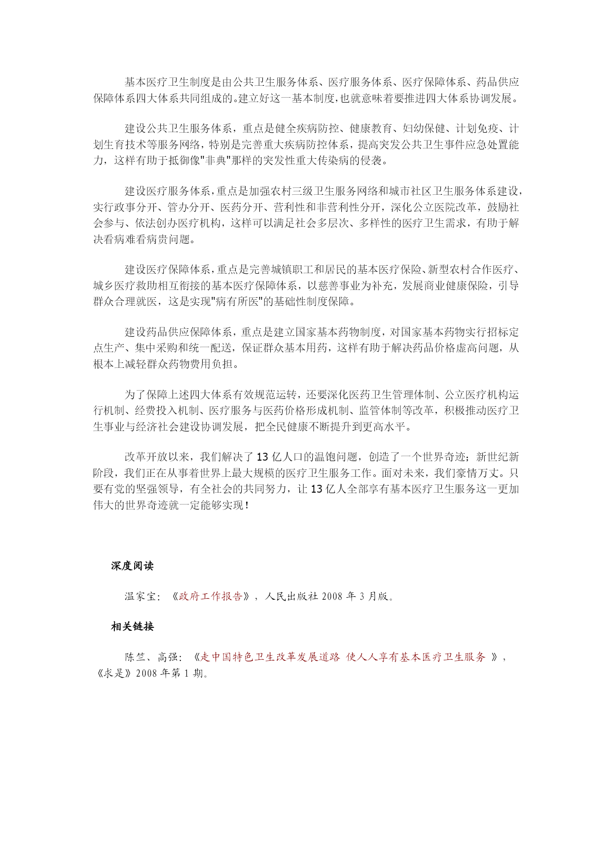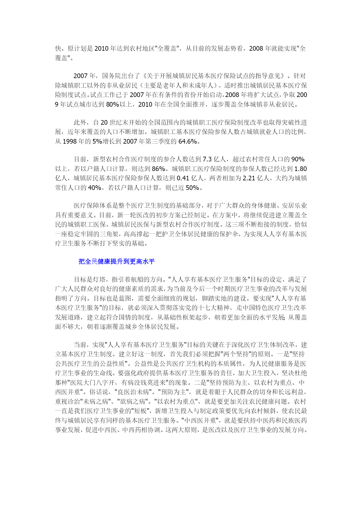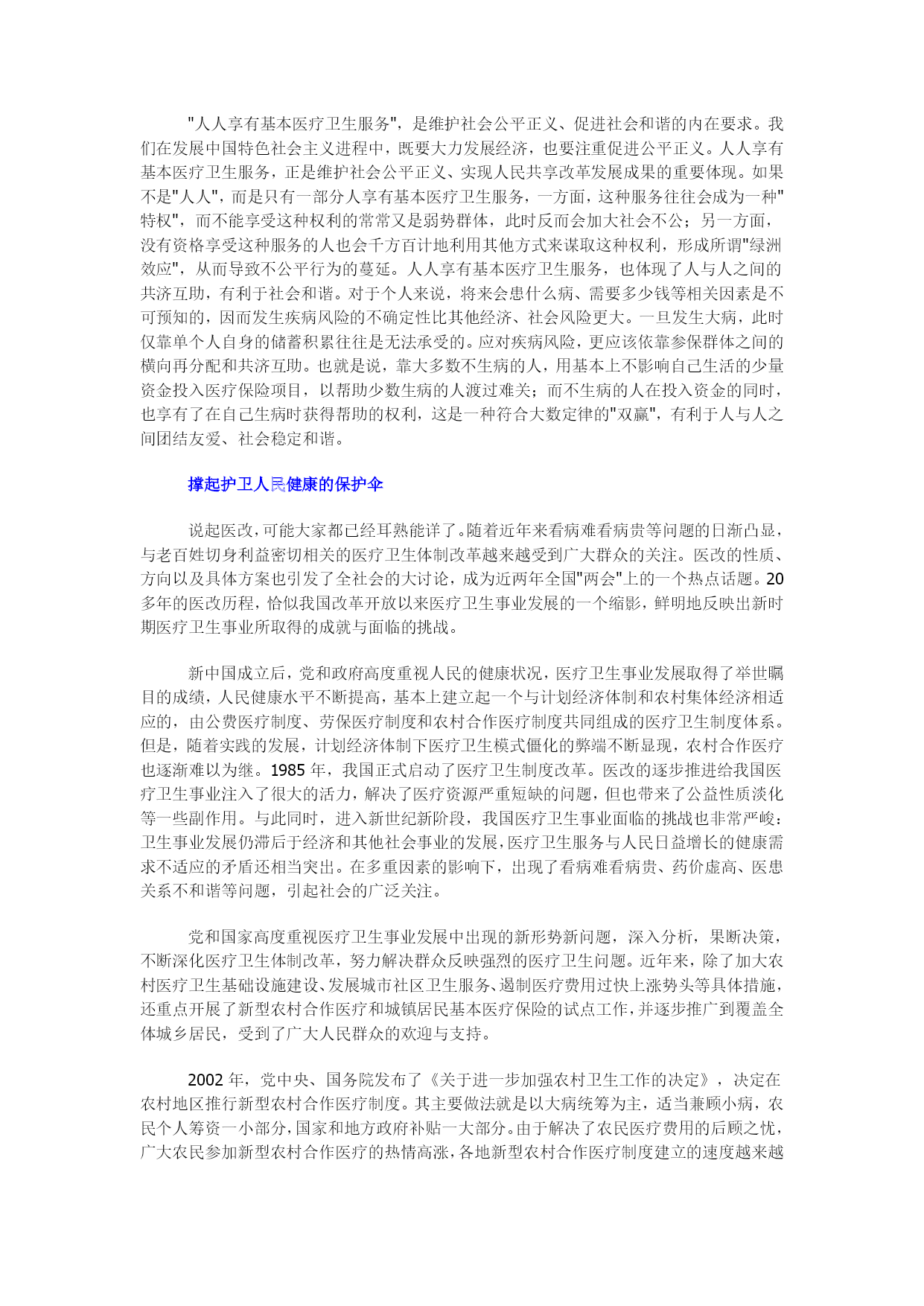 理论热点面对面之二十:从7.3亿农民参加新型农村合作医疗谈起从7.3亿农民参加新型农村合作医疗谈起——为什么要让人人享有基本医疗卫生服务近日,只有小学文化水平的重庆市江津区的徐云贵老人,写下平生第一篇散文,歌颂新型农村合作医疗制度。原来,老人2007年患脑溢血住院用去1.2万元,却拿到了1.075万元的报销款。2007年,全国2448个县(区、市)里有7.3亿像徐云贵一样的农村居民参加了新型农村合作医疗制度,参合率达到86%,累计受益人次接近2亿。这种合作医疗制度作为党和政府推进医疗卫生事业发展、保障人民健康的重要举措之一,受到了广大农村居民的热烈欢迎。目前,新型农村合作医疗制度正在与其他惠民利民的基本医疗卫生制度一起,朝着党的十七大报告中提出的"人人享有基本医疗卫生服务"的目标稳步推进。促进社会公平正义的重要体现"有健康,才有将来。"健康是每个人生存与发展的基础,与千家万户的幸福生活息息相关。然而,在生命的旅程中,每个人随时都有罹患疾病的风险,这时就需要求医看病以恢复健康。因此,医疗卫生作为服务于每个社会成员身心健康的社会事业,是当今世界各国为其国民提供的基本公共服务之一。由于社会制度、发展水平等方面的差异,不同国家为其国民提供的医疗卫生服务的水平与覆盖面相差很大。我国是社会主义国家,发展医疗卫生事业,提高人民群众健康水平,一向受到党和国家的高度重视。在党的十七大报告中,明确提出要让"人人享有基本医疗卫生服务",并将其作为全面建设小康社会奋斗目标新要求中的一项具体内容,还把"病有所医"列为社会建设的"五有"目标之一。这是新世纪新阶段,我们党针对我国经济社会发展和医疗卫生事业出现的新形势,为在经济发展的基础上不断提高全体人民健康水平而提出的重大战略部署。"人人享有基本医疗卫生服务"目标的亮点在于"人人享有"。这鲜明体现了我们党全心全意为人民服务的根本宗旨,体现了科学发展观以人为本的精神,贯彻了"发展为了人民、发展依靠人民、发展成果由人民共享"的要求,具有极为重要的现实意义。"人人享有基本医疗卫生服务",是促进人的全面发展、体现社会主义制度优越性的根本要求。马克思主义历来把人的自由而全面的发展当做自己的理想目标,并认为这是一个在社会主义社会就要持续推进、进而在共产主义社会最终实现的价值目标。人的全面发展,不仅需要以发达的生产力、累积的社会财富为现实基础,更需要以发展的主体--广大人民群众自身的健康为前提条件。作为一个人来说,如果没有健康,就会失去一切,更谈不上全面发展了。只有让每个人都能享受到便捷、价廉的医疗卫生服务,人民群众的健康才有最基本的保障,全面建设小康社会才有最稳固的基础,人的全面发展才有最坚实的支撑。此外,社会主义为人的全面发展提供了制度保障,"人人享有基本医疗卫生服务"目标的设定,确立了我国医疗卫生事业为人民服务的宗旨,要求基本医疗卫生制度逐步向覆盖全体居民发展。这不仅有利于社会全体成员共同受益,也有助于减少疾病流行,使社会主义制度的优越性得到充分体现。"人人享有基本医疗卫生服务",是维护社会公平正义、促进社会和谐的内在要求。我们在发展中国特色社会主义进程中,既要大力发展经济,也要注重促进公平正义。人人享有基本医疗卫生服务,正是维护社会公平正义、实现人民共享改革发展成果的重要体现。如果不是"人人",而是只有一部分人享有基本医疗卫生服务,一方面,这种服务往往会成为一种"特权",而不能享受这种权利的常常又是弱势群体,此时反而会加大社会不公;另一方面,没有资格享受这种服务的人也会千方百计地利用其他方式来谋取这种权利,形成所谓"绿洲效应",从而导致不公平行为的蔓延。人人享有基本医疗卫生服务,也体现了人与人之间的共济互助,有利于社会和谐。对于个人来说,将来会患什么病、需要多少钱等相关因素是不可预知的,因而发生疾病风险的不确定性比其他经济、社会风险更大。一旦发生大病,此时仅靠单个人自身的储蓄积累往往是无法承受的。应对疾病风险,更应该依靠参保群体之间的横向再分配和共济互助。也就是说,靠大多数不生病的人,用基本上不影响自己生活的少量资金投入医疗保险项目,以帮助少数生病的人渡过难关;而不生病的人在投入资金的同时,也享有了在自己生病时获得帮助的权利,这是一种符合大数定律的"双赢",有利于人与人之间团结友爱、社会稳定和谐。撑起护卫人民健康的保护伞说起医改,可能大家都已经耳熟能详了。随着近年来看病难看病贵等问题的日渐凸显,与老百姓切身利益密切相关的医疗卫生体制改革越来越受到广大群众的关注。医改的性质、方向以及具体方案也引发了全社会的大讨论,成为近两年全国"两会"上的一个热点话题。20多年的医改历程,恰似我国改革开放以来医疗卫生事业发展的一个缩影,鲜明地反映出新时期医疗卫生事业所取得的成就与面临的挑战。新中国成立后,党