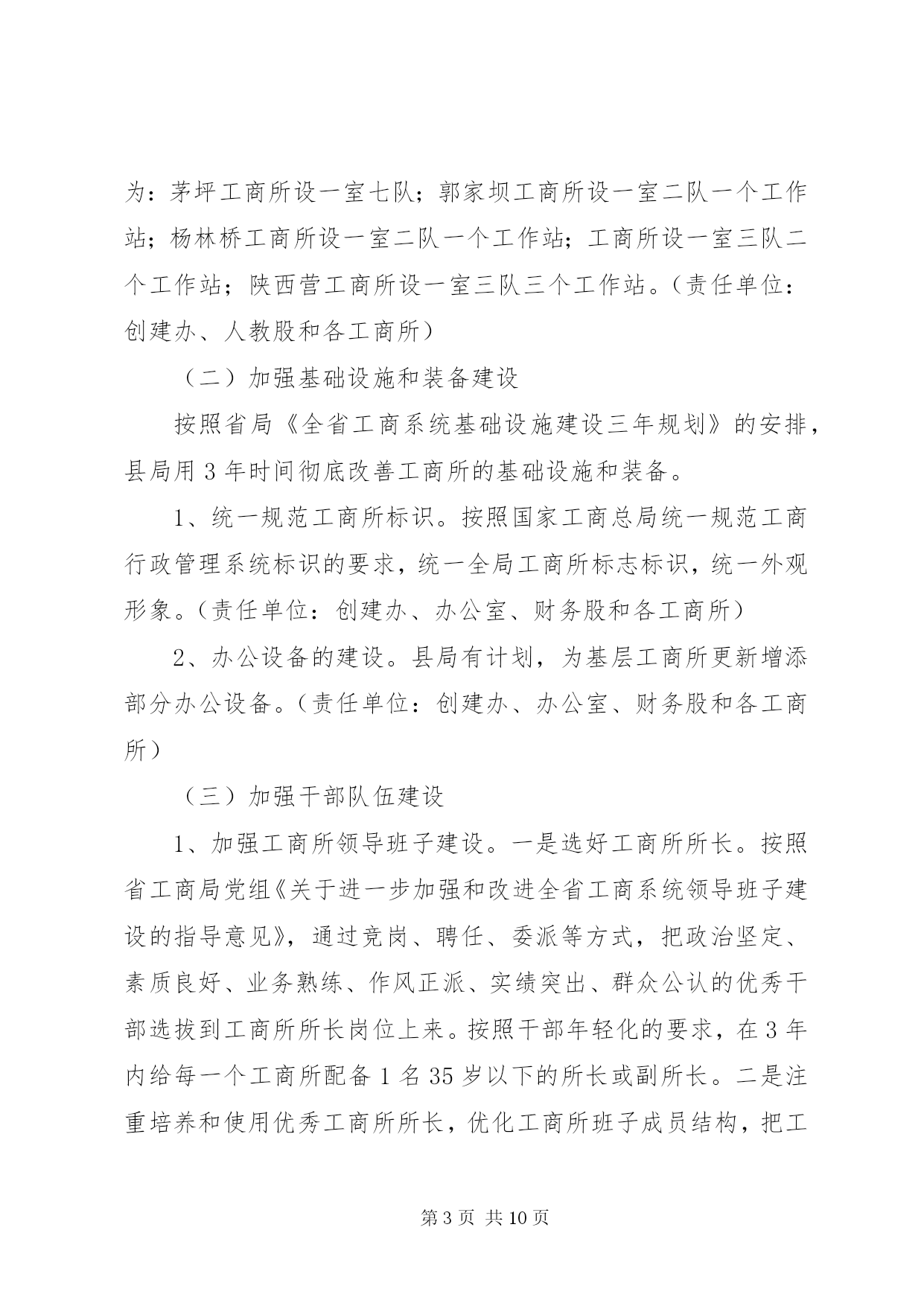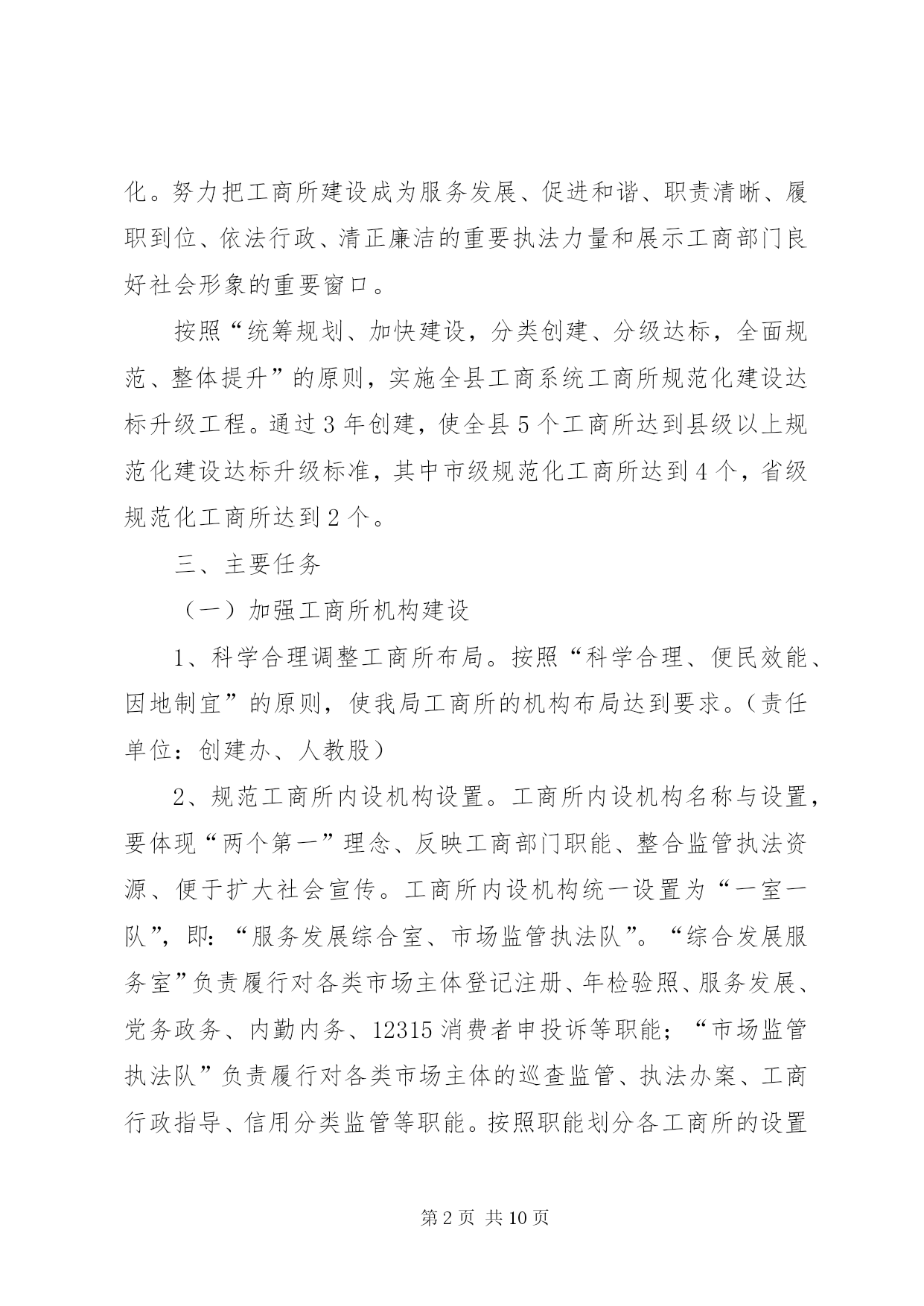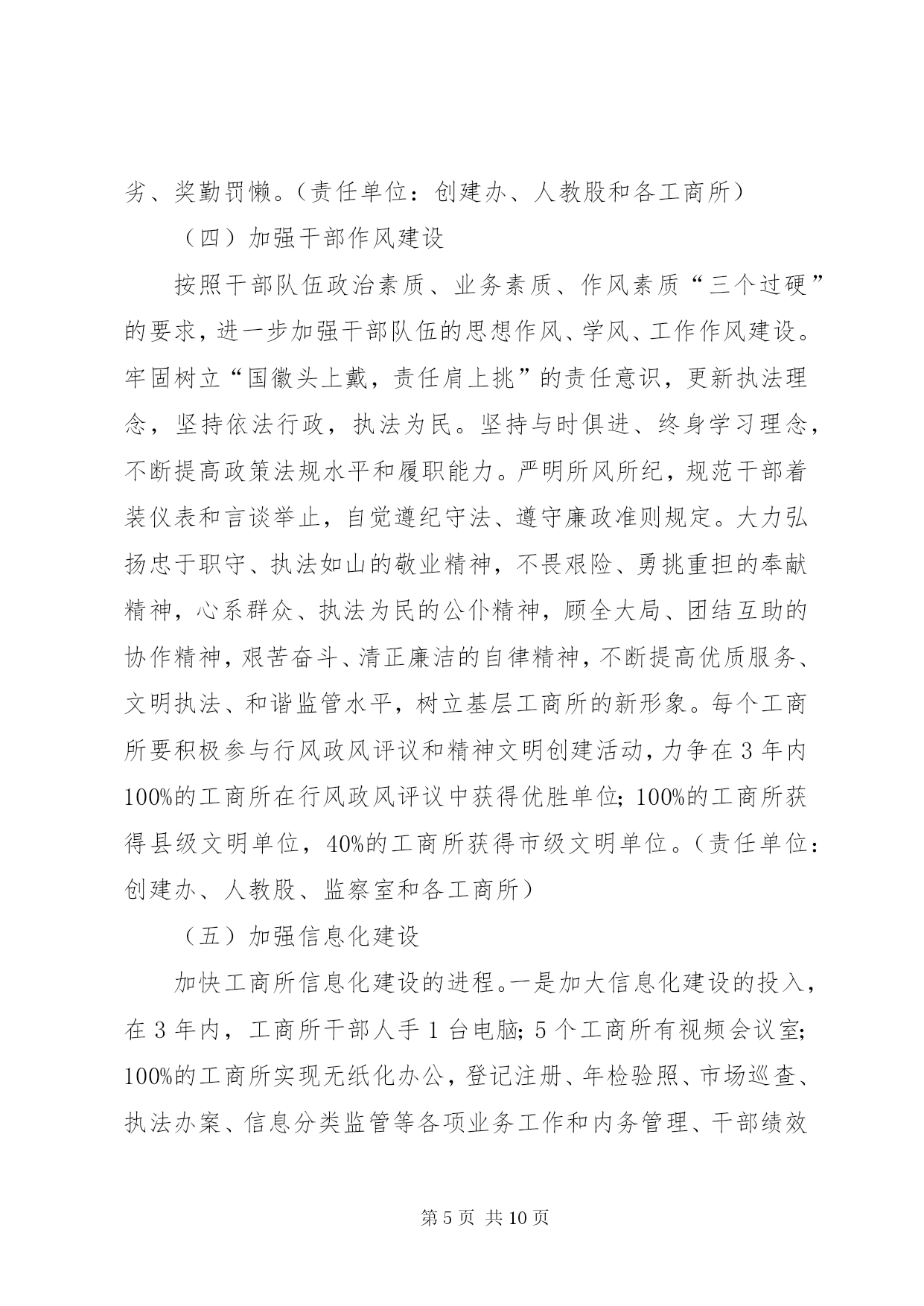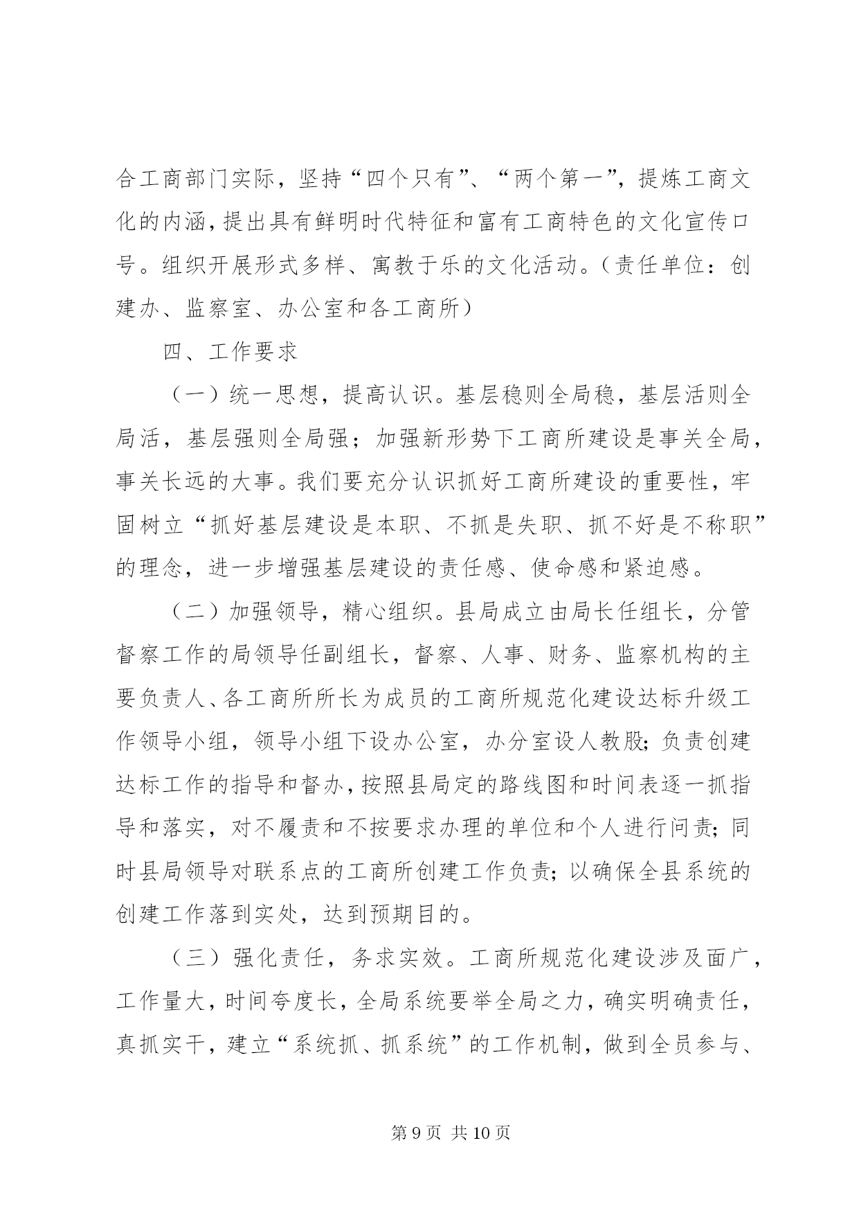 第PAGE\*Arabic\*MERGEFORMAT10页共NUMPAGES\*MERGEFORMAT10页工商所规范化建设活动方案为了认真贯彻执行鄂工商督[2013]174文件精神,进一步加大工商系统工商所规范化建设的力度,不断提升基层工商所制度化、规范化、程序化、法制化水平,特制定本实施方案。一、指导思想坚持以科学发展观为指导,立足当前,按照国家工商总局“四个只有”、“四个统一”、“四化建设”、“四个转变”、“四高目标”等工作要求,坚持“两个第一”的工作理念,以推进基层职能转变,提高履职能力为主题,以提高干部综合素质和业务能力为核心,以创新监管服务体制机制,提高科学管理水平为导向,以改善基层基础设施、加强信息化和执法装备现代化建设为保障,着力加强工商所的机构建设,设施装备建设,干部队伍建设。作风建设、信息化建设、制度机制建设、基层党的建设、工商文化建设等“八大建设”,推动全县工商系统工商所规范化建设达标升级,促进基层工商职能转型升级,更好地服务全县经济社会科学发展。二、目标要求通过3年的努力,到2013年12月31日止,使全县工商所规范化建设达到“六个进一步”的工作目标,即:执法理念进一步更新,监管服务效能进一步提高,工作机制进一步完善,能力素质进一步提升,基础设施装备进一步改善,执法保障进一步强化。努力把工商所建设成为服务发展、促进和谐、职责清晰、履职到位、依法行政、清正廉洁的重要执法力量和展示工商部门良好社会形象的重要窗口。按照“统筹规划、加快建设,分类创建、分级达标,全面规范、整体提升”的原则,实施全县工商系统工商所规范化建设达标升级工程。通过3年创建,使全县5个工商所达到县级以上规范化建设达标升级标准,其中市级规范化工商所达到4个,省级规范化工商所达到2个。三、主要任务(一)加强工商所机构建设1、科学合理调整工商所布局。按照“科学合理、便民效能、因地制宜”的原则,使我局工商所的机构布局达到要求。(责任单位:创建办、人教股)2、规范工商所内设机构设置。工商所内设机构名称与设置,要体现“两个第一”理念、反映工商部门职能、整合监管执法资源、便于扩大社会宣传。工商所内设机构统一设置为“一室一队”,即:“服务发展综合室、市场监管执法队”。“综合发展服务室”负责履行对各类市场主体登记注册、年检验照、服务发展、党务政务、内勤内务、12315消费者申投诉等职能;“市场监管执法队”负责履行对各类市场主体的巡查监管、执法办案、工商行政指导、信用分类监管等职能。按照职能划分各工商所的设置为:茅坪工商所设一室七队;郭家坝工商所设一室二队一个工作站;杨林桥工商所设一室二队一个工作站;工商所设一室三队二个工作站;陕西营工商所设一室三队三个工作站。(责任单位:创建办、人教股和各工商所)(二)加强基础设施和装备建设按照省局《全省工商系统基础设施建设三年规划》的安排,县局用3年时间彻底改善工商所的基础设施和装备。1、统一规范工商所标识。按照国家工商总局统一规范工商行政管理系统标识的要求,统一全局工商所标志标识,统一外观形象。(责任单位:创建办、办公室、财务股和各工商所)2、办公设备的建设。县局有计划,为基层工商所更新增添部分办公设备。(责任单位:创建办、办公室、财务股和各工商所)(三)加强干部队伍建设1、加强工商所领导班子建设。一是选好工商所所长。按照省工商局党组《关于进一步加强和改进全省工商系统领导班子建设的指导意见》,通过竞岗、聘任、委派等方式,把政治坚定、素质良好、业务熟练、作风正派、实绩突出、群众公认的优秀干部选拔到工商所所长岗位上来。按照干部年轻化的要求,在3年内给每一个工商所配备1名35岁以下的所长或副所长。二是注重培养和使用优秀工商所所长,优化工商所班子成员结构,把工商所的班子建设成为执行力强,团结实干,勤政廉政的班子。(责任单位:创建办、人教股和各工商所)2、充实和优化工商所执法力量。按照新“三定”方案和“精局强所”的要求,进一步精简县局机关人员编制,充实工商所一线执法力量,做到监管力量和监管重心下移,确保工商所人数占县局总人数的70%。我局现有公务员73人,应在工商所工作的人员是51人,而实际在工商所工作人员只有43人,只占总人数的58.1%。同时,按照辖区监管面积、人口总量、经济户口数量、监管难易程度、地理环境等状况,我局工商所人员(公务员)力量拟配置为:茅坪工商所19人;陕西营工商所13人;工商所10人;郭家坝工商所9人;杨林桥工商所8人。力争在3年内招录公务员24人,进一步充实一线执法力量。(责任单位:创建办、人教股和各工商所)3、着力提升干部能力素质。一是组织干部集中学习时间不少于12天,学习时间累积不少于110小时。通过各种形式的激励政策,引导干部自学,力争3年内使工商所大专以上学历人员达到80