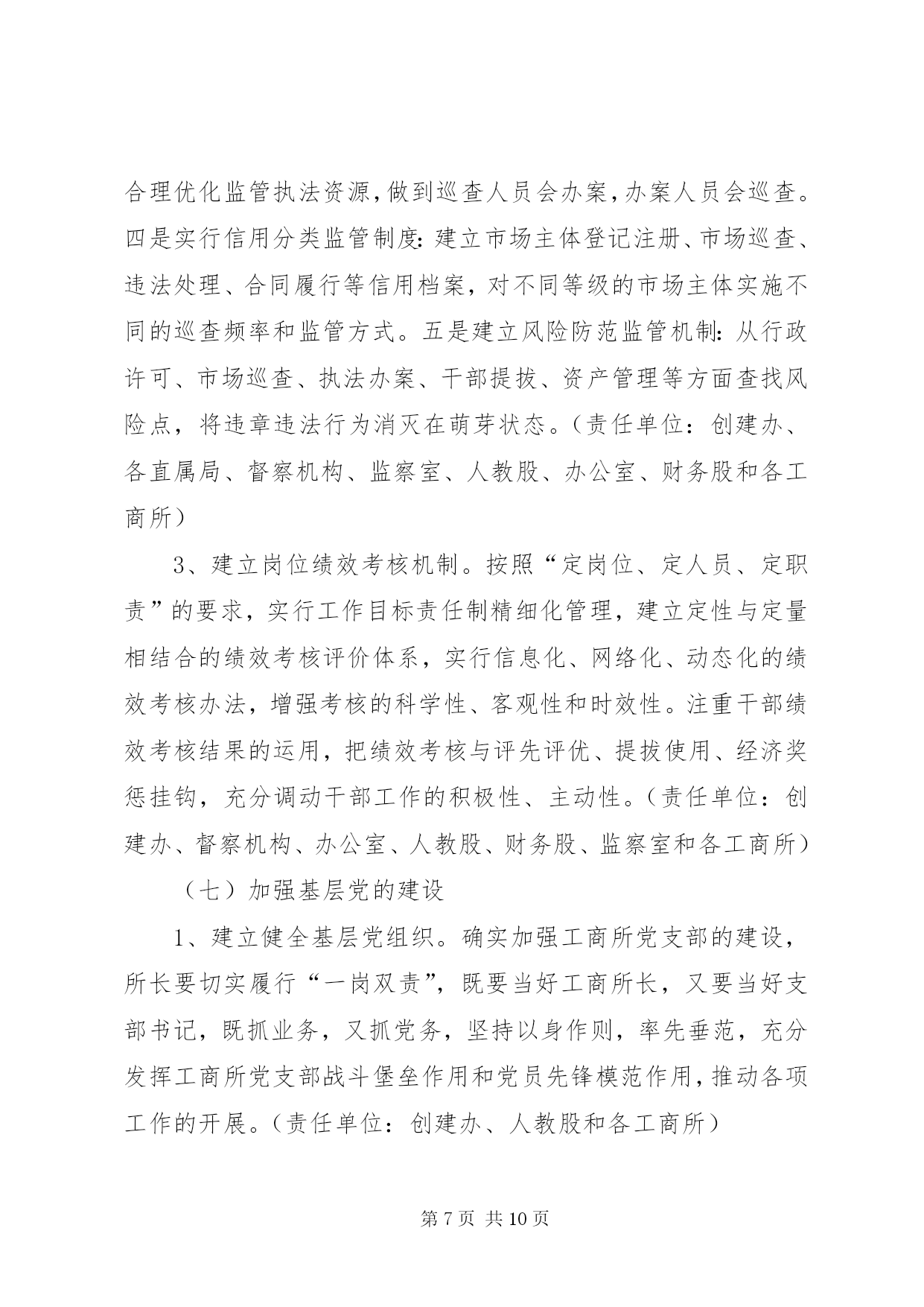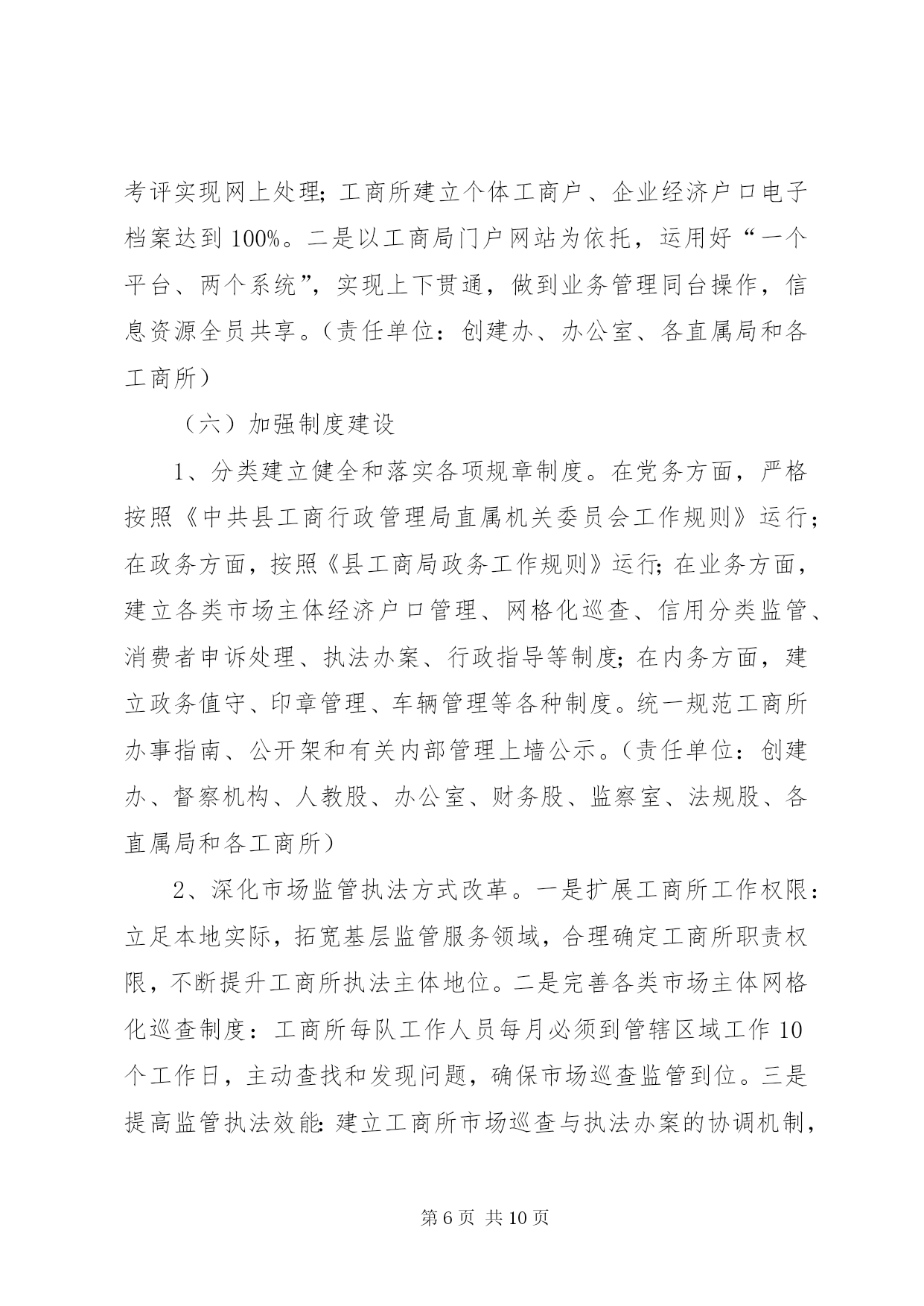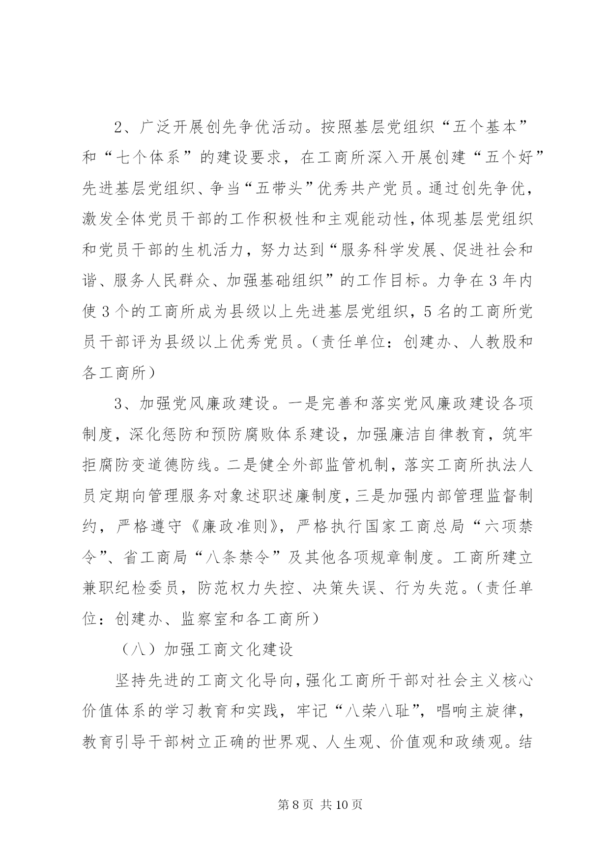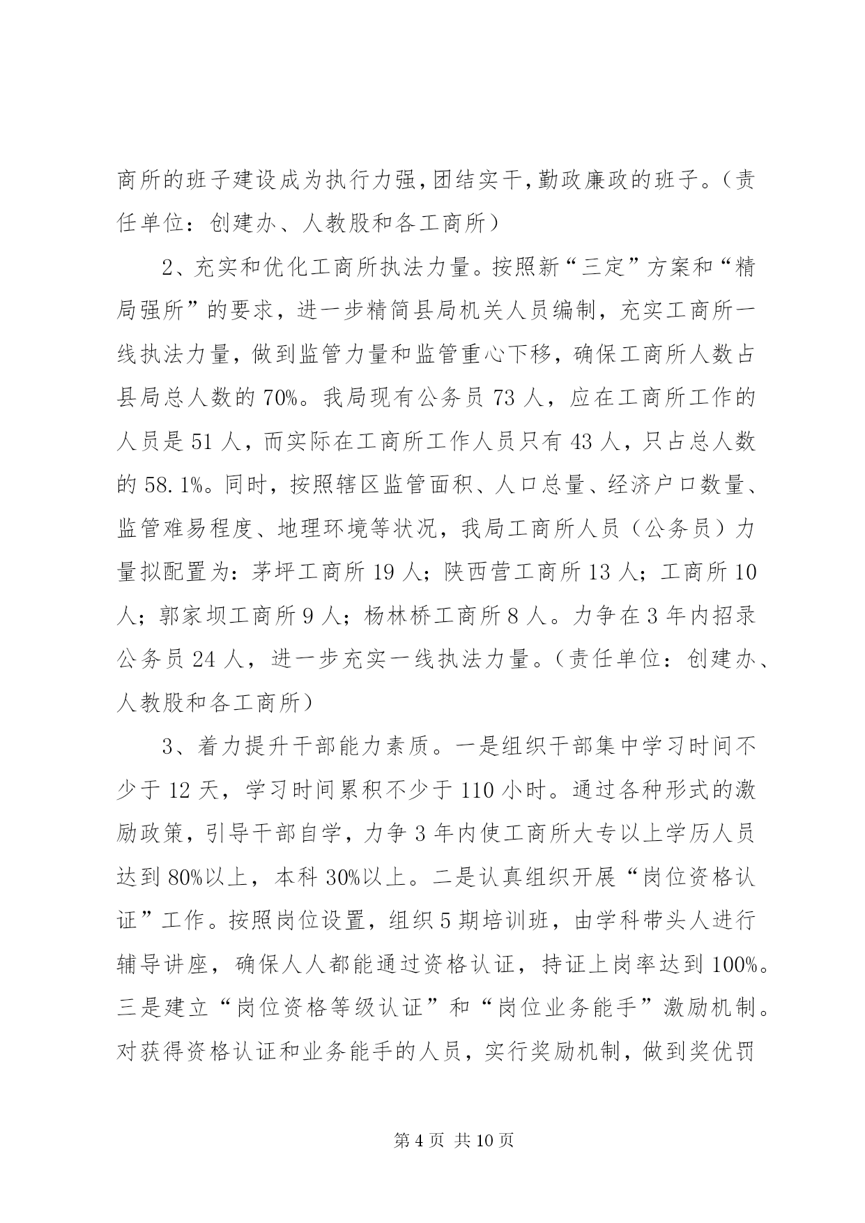 第PAGE\*Arabic\*MERGEFORMAT10页共NUMPAGES\*MERGEFORMAT10页工商所规范化建设活动方案为了认真贯彻执行鄂工商督[2013]174文件精神,进一步加大工商系统工商所规范化建设的力度,不断提升基层工商所制度化、规范化、程序化、法制化水平,特制定本实施方案。一、指导思想坚持以科学发展观为指导,立足当前,按照国家工商总局“四个只有”、“四个统一”、“四化建设”、“四个转变”、“四高目标”等工作要求,坚持“两个第一”的工作理念,以推进基层职能转变,提高履职能力为主题,以提高干部综合素质和业务能力为核心,以创新监管服务体制机制,提高科学管理水平为导向,以改善基层基础设施、加强信息化和执法装备现代化建设为保障,着力加强工商所的机构建设,设施装备建设,干部队伍建设。作风建设、信息化建设、制度机制建设、基层党的建设、工商文化建设等“八大建设”,推动全县工商系统工商所规范化建设达标升级,促进基层工商职能转型升级,更好地服务全县经济社会科学发展。二、目标要求通过3年的努力,到2013年12月31日止,使全县工商所规范化建设达到“六个进一步”的工作目标,即:执法理念进一步更新,监管服务效能进一步提高,工作机制进一步完善,能力素质进一步提升,基础设施装备进一步改善,执法保障进一步强化。努力把工商所建设成为服务发展、促进和谐、职责清晰、履职到位、依法行政、清正廉洁的重要执法力量和展示工商部门良好社会形象的重要窗口。按照“统筹规划、加快建设,分类创建、分级达标,全面规范、整体提升”的原则,实施全县工商系统工商所规范化建设达标升级工程。通过3年创建,使全县5个工商所达到县级以上规范化建设达标升级标准,其中市级规范化工商所达到4个,省级规范化工商所达到2个。三、主要任务(一)加强工商所机构建设1、科学合理调整工商所布局。按照“科学合理、便民效能、因地制宜”的原则,使我局工商所的机构布局达到要求。(责任单位:创建办、人教股)2、规范工商所内设机构设置。工商所内设机构名称与设置,要体现“两个第一”理念、反映工商部门职能、整合监管执法资源、便于扩大社会宣传。工商所内设机构统一设置为“一室一队”,即:“服务发展综合室、市场监管执法队”。“综合发展服务室”负责履行对各类市场主体登记注册、年检验照、服务发展、党务政务、内勤内务、12315消费者申投诉等职能;“市场监管执法队”负责履行对各类市场主体的巡查监管、执法办案、工商行政指导、信用分类监管等职能。按照职能划分各工商所的设置为:茅坪工商所设一室七队;郭家坝工商所设一室二队一个工作站;杨林桥工商所设一室二队一个工作站;工商所设一室三队二个工作站;陕西营工商所设一室三队三个工作站。(责任单位:创建办、人教股和各工商所)(二)加强基础设施和装备建设按照省局《全省工商系统基础设施建设三年规划》的安排,县局用3年时间彻底改善工商所的基础设施和装备。1、统一规范工商所标识。按照国家工商总局统一规范工商行政管理系统标识的要求,统一全局工商所标志标识,统一外观形象。(责任单位:创建办、办公室、财务股和各工商所)2、办公设备的建设。县局有计划,为基层工商所更新增添部分办公设备。(责任单位:创建办、办公室、财务股和各工商所)(三)加强干部队伍建设1、加强工商所领导班子建设。一是选好工商所所长。按照省工商局党组《关于进一步加强和改进全省工商系统领导班子建设的指导意见》,通过竞岗、聘任、委派等方式,把政治坚定、素质良好、业务熟练、作风正派、实绩突出、群众公认的优秀干部选拔到工商所所长岗位上来。按照干部年轻化的要求,在3年内给每一个工商所配备1名35岁以下的所长或副所长。二是注重培养和使用优秀工商所所长,优化工商所班子成员结构,把工商所的班子建设成为执行力强,团结实干,勤政廉政的班子。(责任单位:创建办、人教股和各工商所)2、充实和优化工商所执法力量。按照新“三定”方案和“精局强所”的要求,进一步精简县局机关人员编制,充实工商所一线执法力量,做到监管力量和监管重心下移,确保工商所人数占县局总人数的70%。我局现有公务员73人,应在工商所工作的人员是51人,而实际在工商所工作人员只有43人,只占总人数的58.1%。同时,按照辖区监管面积、人口总量、经济户口数量、监管难易程度、地理环境等状况,我局工商所人员(公务员)力量拟配置为:茅坪工商所19人;陕西营工商所13人;工商所10人;郭家坝工商所9人;杨林桥工商所8人。力争在3年内招录公务员24人,进一步充实一线执法力量。(责任单位:创建办、人教股和各工商所)3、着力提升干部能力素质。一是组织干部集中学习时间不少于12天,学习时间累积不少于110小时。通过各种形式的激励政策,引导干部自学,力争3年内使工商所大专以上学历人员达到80
