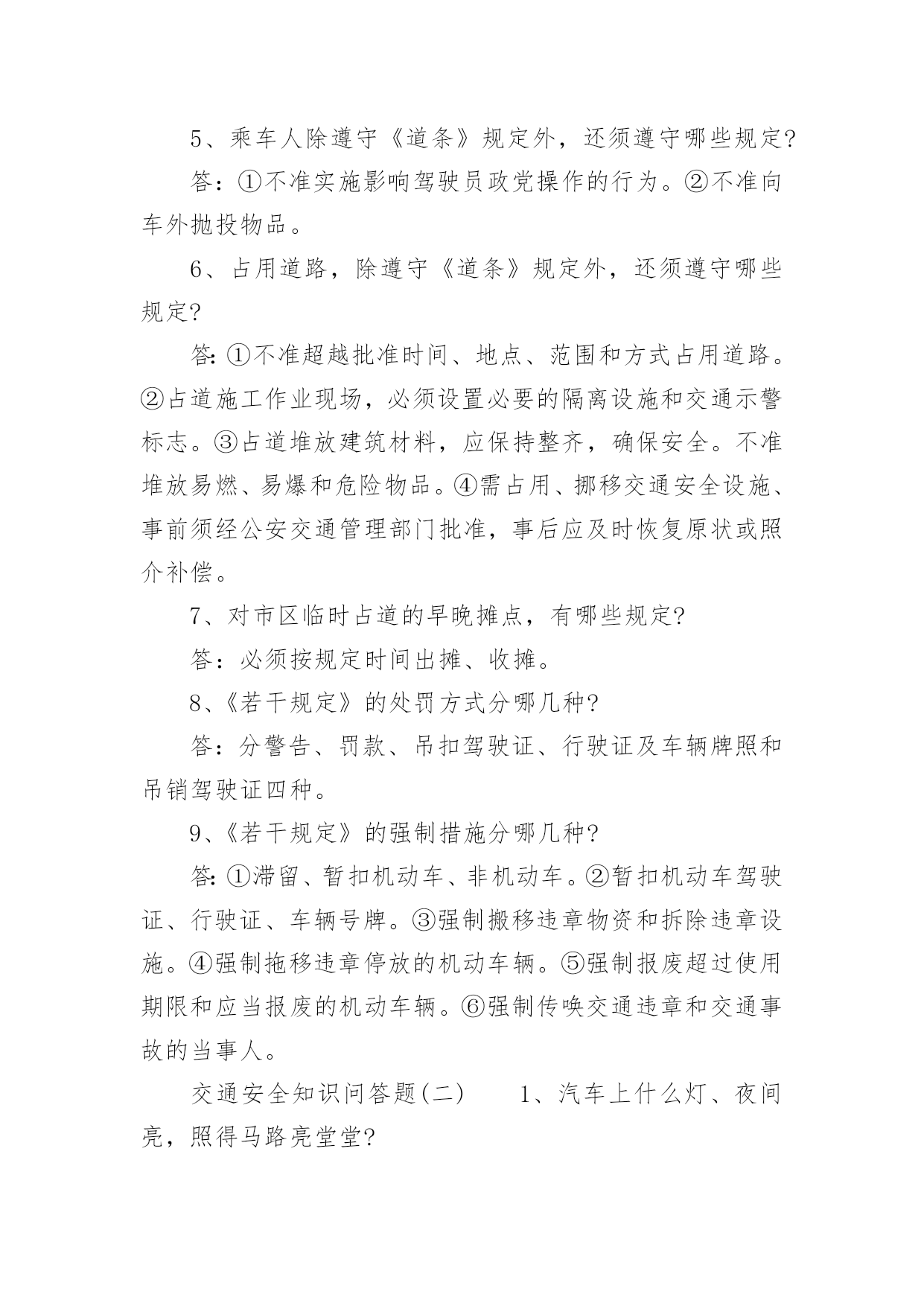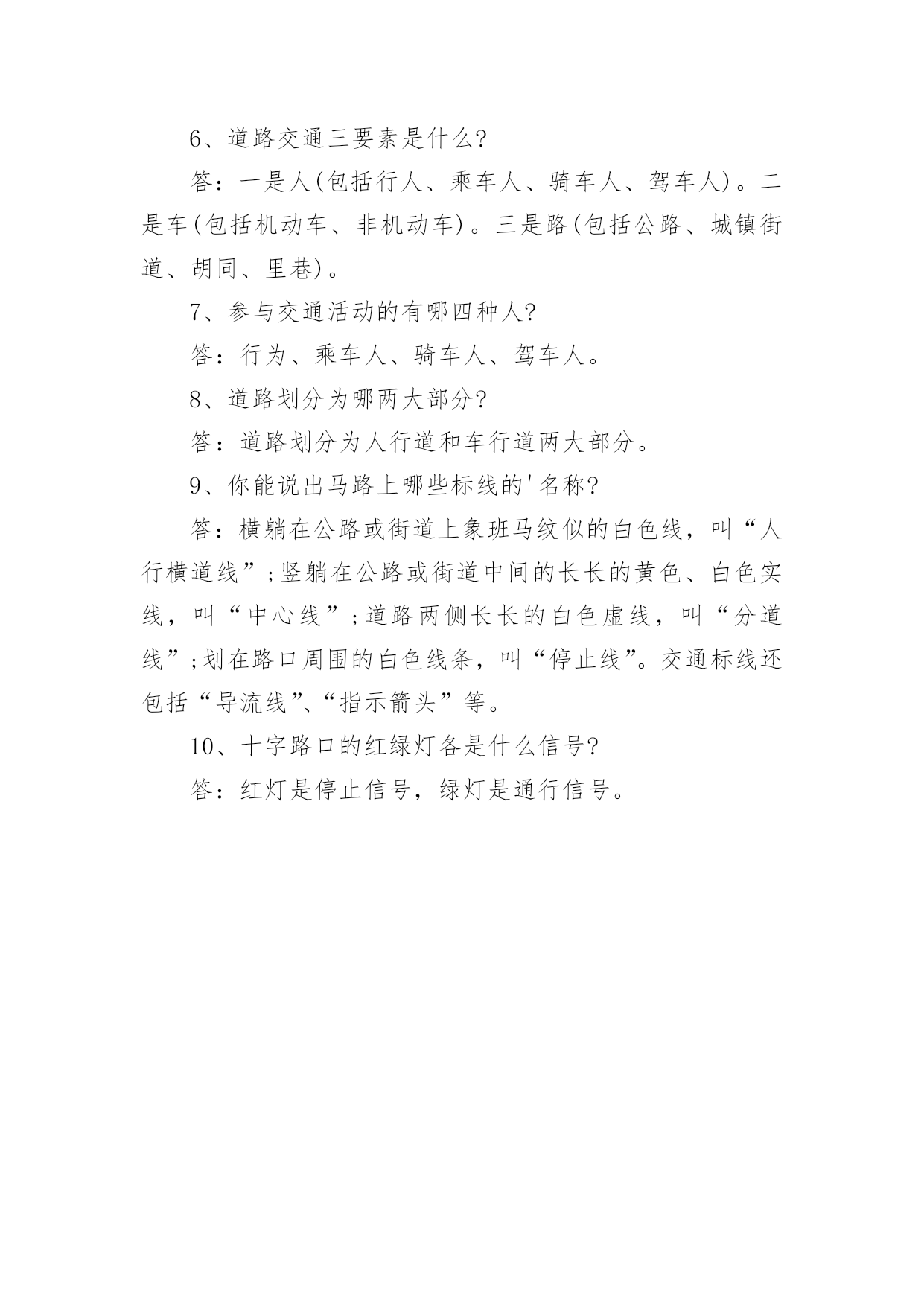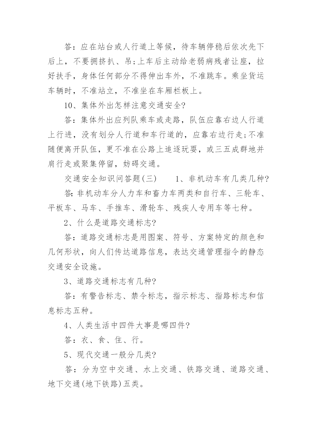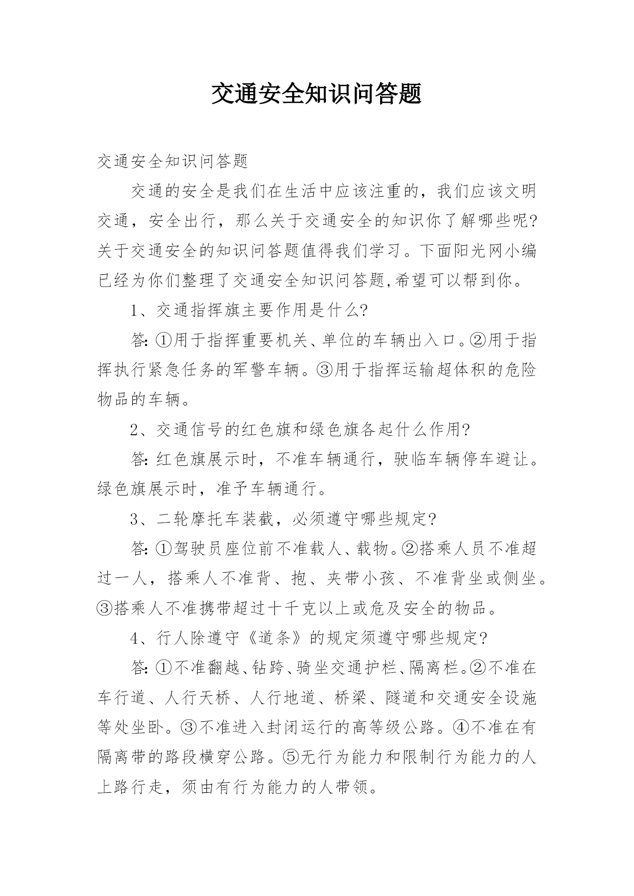 交通安全知识问答题交通安全知识问答题交通的安全是我们在生活中应该注重的,我们应该文明交通,安全出行,那么关于交通安全的知识你了解哪些呢?关于交通安全的知识问答题值得我们学习。下面阳光网小编已经为你们整理了交通安全知识问答题,希望可以帮到你。1、交通指挥旗主要作用是什么?答:①用于指挥重要机关、单位的车辆出入口。②用于指挥执行紧急任务的军警车辆。③用于指挥运输超体积的危险物品的车辆。2、交通信号的红色旗和绿色旗各起什么作用?答:红色旗展示时,不准车辆通行,驶临车辆停车避让。绿色旗展示时,准予车辆通行。3、二轮摩托车装截,必须遵守哪些规定?答:①驾驶员座位前不准载人、载物。②搭乘人员不准超过一人,搭乘人不准背、抱、夹带小孩、不准背坐或侧坐。③搭乘人不准携带超过十千克以上或危及安全的物品。4、行人除遵守《道条》的规定须遵守哪些规定?答:①不准翻越、钻跨、骑坐交通护栏、隔离栏。②不准在车行道、人行天桥、人行地道、桥梁、隧道和交通安全设施等处坐卧。③不准进入封闭运行的高等级公路。④不准在有隔离带的路段横穿公路。⑤无行为能力和限制行为能力的人上路行走,须由有行为能力的人带领。5、乘车人除遵守《道条》规定外,还须遵守哪些规定?答:①不准实施影响驾驶员政党操作的行为。②不准向车外抛投物品。6、占用道路,除遵守《道条》规定外,还须遵守哪些规定?答:①不准超越批准时间、地点、范围和方式占用道路。②占道施工作业现场,必须设置必要的隔离设施和交通示警标志。③占道堆放建筑材料,应保持整齐,确保安全。不准堆放易燃、易爆和危险物品。④需占用、挪移交通安全设施、事前须经公安交通管理部门批准,事后应及时恢复原状或照介补偿。7、对市区临时占道的早晚摊点,有哪些规定?答:必须按规定时间出摊、收摊。8、《若干规定》的处罚方式分哪几种?答:分警告、罚款、吊扣驾驶证、行驶证及车辆牌照和吊销驾驶证四种。9、《若干规定》的强制措施分哪几种?答:①滞留、暂扣机动车、非机动车。②暂扣机动车驾驶证、行驶证、车辆号牌。③强制搬移违章物资和拆除违章设施。④强制拖移违章停放的机动车辆。⑤强制报废超过使用期限和应当报废的机动车辆。⑥强制传唤交通违章和交通事故的当事人。交通安全知识问答题(二)1、汽车上什么灯、夜间亮,照得马路亮堂堂?答:汽车前面象两只大眼睛,叫“大光灯”夜间亮,照得马路亮堂堂。2、汽车上什么灯,闪闪亮,汽车转弯它指方向?答:汽车前面象两只小眼睛,叫“方向灯”,闪闪亮,汽车转弯它指方向。3、汽车上什么灯发红光,保持距离,别相撞?答:汽车后面两个红色灯,叫“刹车灯”,发红光,保持距离,别相撞。4、在公路上做哪些活动是妨碍交通,也是不安全的?答:在公路或街道上玩球类、滑旱冰、坐滑轮车、追逐玩耍等,都是妨碍交通和不安全的。5、设在人行道和车行道之间的交通护栏的作用是什么?答:用来保护行人在人行道上行走安全和防止行人走入车行道或随意横穿车行道。6、参与道路交通活动,应树立哪“三个”观念?答:应树立机动车先行、公交客车优先通行和让他人先行的观念。7、在没有划分人行道和车行道上行走,怎样确保安全?答:要紧靠路边行走并随时注意避让车辆。8、行人怎样安全过马路?答:走人行横道、人行天桥或地道;没有设人行横道、人行天桥或地道的路段,要注意左右来车,特别是不要在车辆临近时突然横穿公路;要在确保安全的`情况下迅速通过。9、怎样文明乘车?答:应在站台或人行道上等候,待车辆停稳后依次先下后上,不要拥挤扒、吊;上车后主动给老弱病残者让座,拉好扶手,身体任何部分不得伸出车外,不准跳车。乘坐货运车辆时,不准站立,不准坐在车厢栏板上。10、集体外出怎样注意交通安全?答:集体外出应列队乘车或走路,队伍应靠右边人行道上行进,没有划分人行道和车行道的,应靠右边行走;不准随便离开队伍,更不准在公路上追逐玩耍,或三五成群地并肩行走或聚集停留,妨碍交通。交通安全知识问答题(三)1、非机动车有几类几种?答:非机动车分人力车和畜力车两类和自行车、三轮车、平板车、马车、手推车、滑轮车、残疾人专用车等七种。2、什么是道路交通标志?答:道路交通标志是用图案、符号、方案特定的颜色和几何形状,向人们传达道路信息,表达交通管理指令的静态交通安全设施。3、道路交通标志有几种?答:有警告标志、禁令标志,指示标志、指路标志和信息标志五种。4、人类生活中四件大事是哪四件?答:衣、食、住、行。5、现代交通一般分几类?答:分为空中交通、水上交通、铁路交通、道路交通、地下交通(地下铁路)五类。6、道路交通三要素是什么?答:一是人(包括行人、乘车人、骑车人、驾车人)。二是车(包括机动车、非机动车)。三是路(包括公路、城镇街道、胡同、里巷)。7、参与交通活动的有哪四种人?答:行为、乘车人、骑车人、驾车人。8、道路划分为哪两大部分?答:道路划分为人行