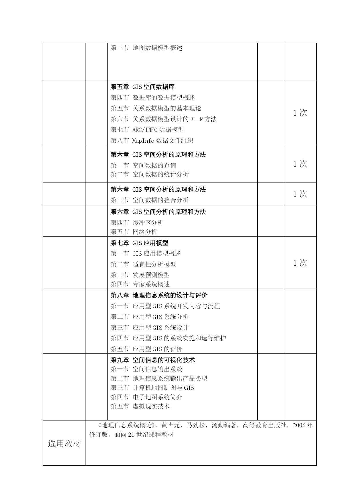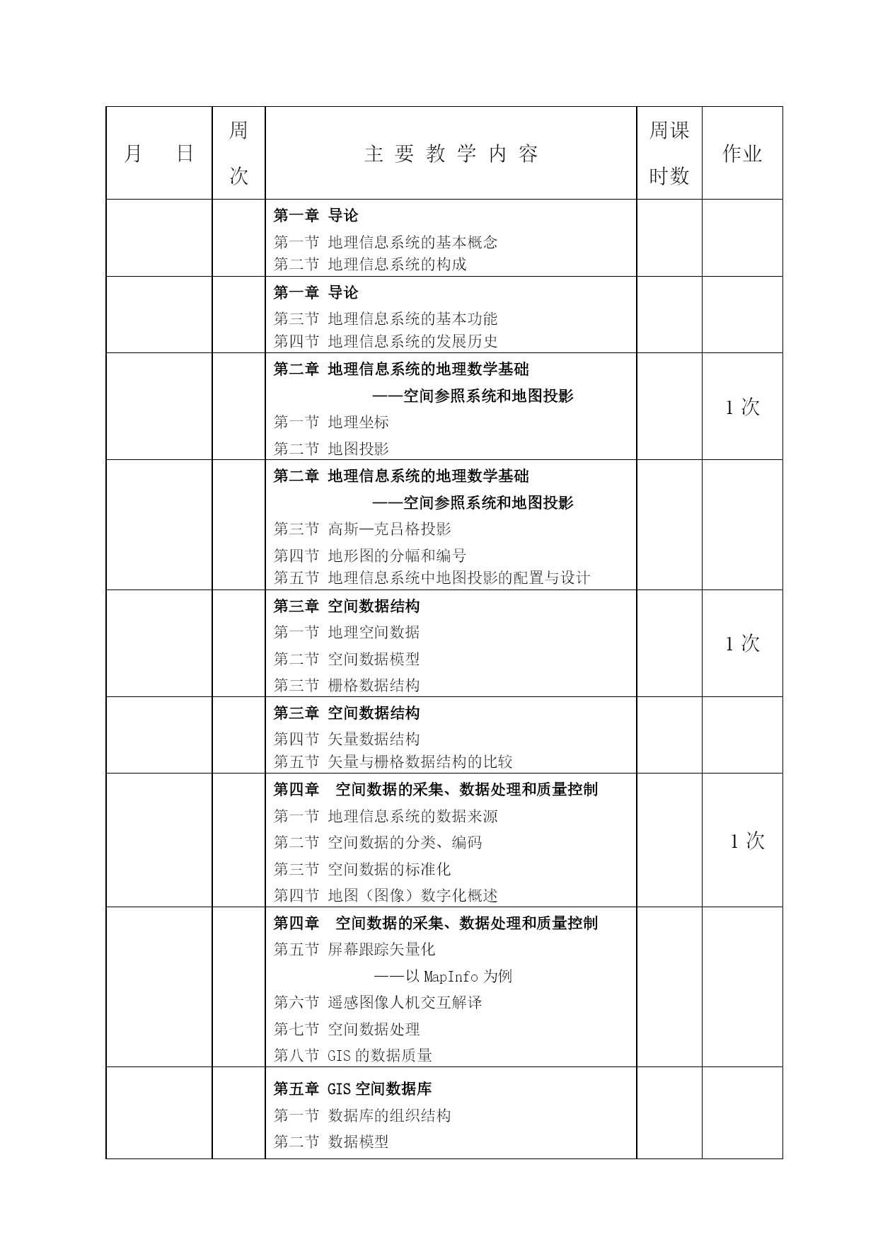 教学进度表(2010–2011学年第2学期)课程名称地理信息系统学期计划学时数64(理论32,实验32)授课班级地理科学0901,0902班授课教师雷能忠皖西学院教务处制填表须知1、每门课程须填写本进度表一式两份,由教研室组织授课教师填写,系(部)主任审查批准,系(部)和授课教师本人各执一份。2、教学时间和周次均按“校历”安排填写,法定节假日、运动会等停课,在相应周次注明,不计入进度学时。3、实习、实验、课程设计等实践性教学环节按照教学计划安排在相应周次注明,不填写周课时数。4、每周作业布置(包括次数题数),填写在作业栏内。5、选用教材须填写教材名称、主编姓名、出版社名称及出版时间、版次。6、教学进度表须保证培养方案中课程计划学时的完成,审批后的教学进度表不得擅自变动。因特殊原因确需变动者,须经所在系(部)批准,并报教务处备案。7、如有需要说明的问题,请在说明栏内填写清楚。填报时间:2011年2月19日月日周次主要教学内容周课时数作业第一章导论第一节地理信息系统的基本概念第二节地理信息系统的构成导论第三节地理信息系统的基本功能第四节地理信息系统的发展历史第二章地理信息系统的地理数学基础——空间参照系统和地图投影第一节地理坐标第二节地图投影1次第二章地理信息系统的地理数学基础——空间参照系统和地图投影第三节高斯—克吕格投影第四节地形图的分幅和编号第五节地理信息系统中地图投影的配置与设计第三章空间数据结构第一节地理空间数据第二节空间数据模型第三节栅格数据结构1次第三章空间数据结构第四节矢量数据结构第五节矢量与栅格数据结构的比较第四章空间数据的采集、数据处理和质量控制第一节地理信息系统的数据来源第二节空间数据的分类、编码第三节空间数据的标准化第四节地图(图像)数字化概述1次第四章空间数据的采集、数据处理和质量控制第五节屏幕跟踪矢量化——以MapInfo为例第六节遥感图像人机交互解译第七节空间数据处理第八节GIS的数据质量第五章GIS空间数据库第一节数据库的组织结构第二节数据模型第三节地图数据模型概述第五章GIS空间数据库第四节数据库的数据模型概述第五节关系数据模型的基本理论第六节关系数据模型设计的E—R方法第七节ARC/INFO数据模型第八节MapInfo数据文件组织1次第六章GIS空间分析的原理和方法第一节空间数据的查询第二节空间数据的统计分析1次第六章GIS空间分析的原理和方法第三节空间数据的叠合分析1次第六章GIS空间分析的原理和方法第四节缓冲区分析第五节网络分析第七章GIS应用模型第一节GIS应用模型概述第二节适宜性分析模型第三节发展预测模型第四节专家系统概述1次第八章地理信息系统的设计与评价第一节应用型GIS系统开发内容与流程第二节应用型GIS系统分析第三节应用型GIS系统设计第四节应用型GIS的系统实施和运行维护第五节应用型GIS的评价第九章空间信息的可视化技术第一节空间信息输出系统第二节地理信息系统输出产品类型第三节计算机地图制图与GIS第四节电子地图系统简介第五节虚拟现实技术选用教材《地理信息系统概论》,黄杏元,马劲松,汤勤编著,高等教育出版社,2006年修订版,面向21世纪课程教材说明审批意见教研室负责人签字:年月日系(部)主任签字:系(部)签章:年月日