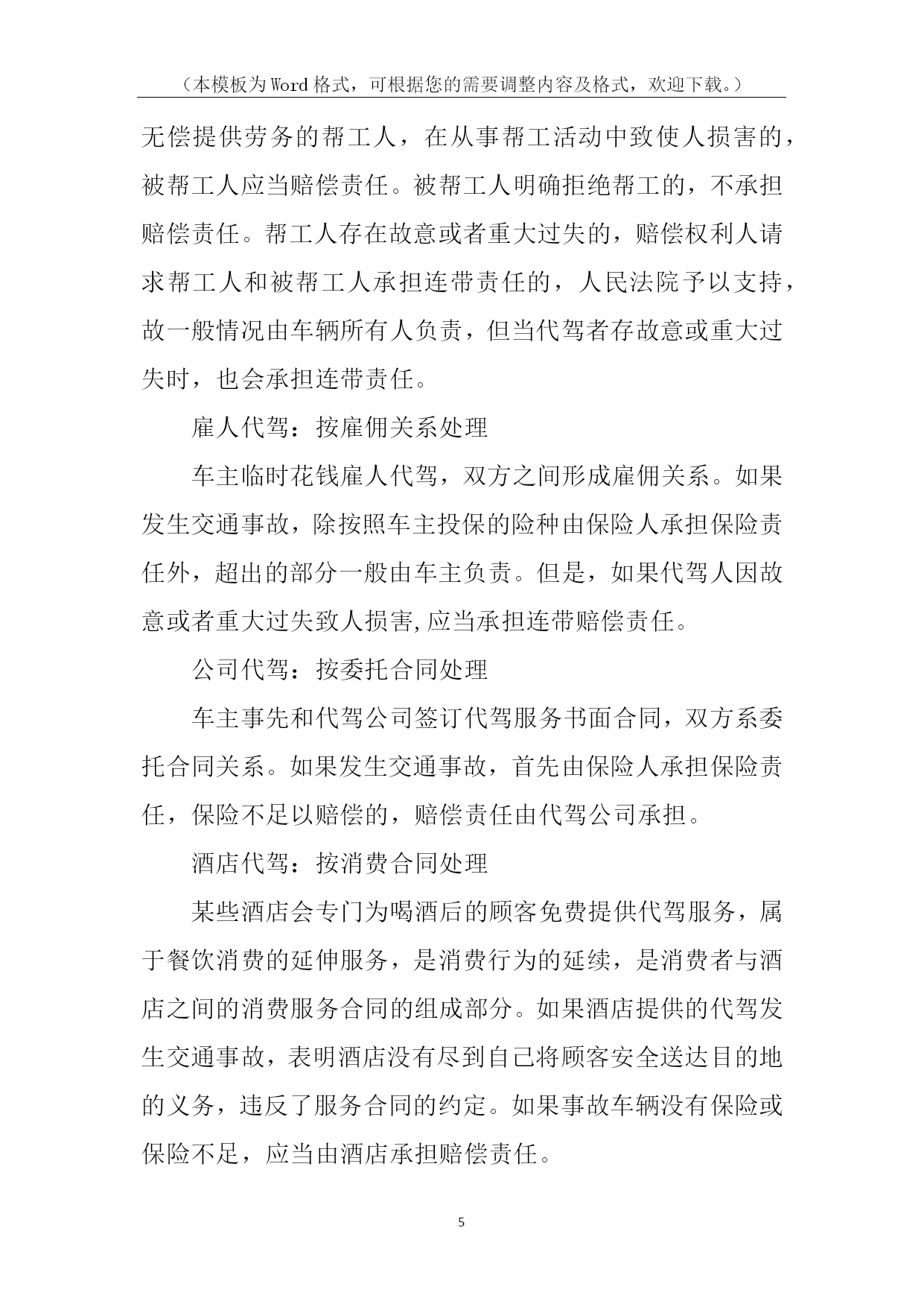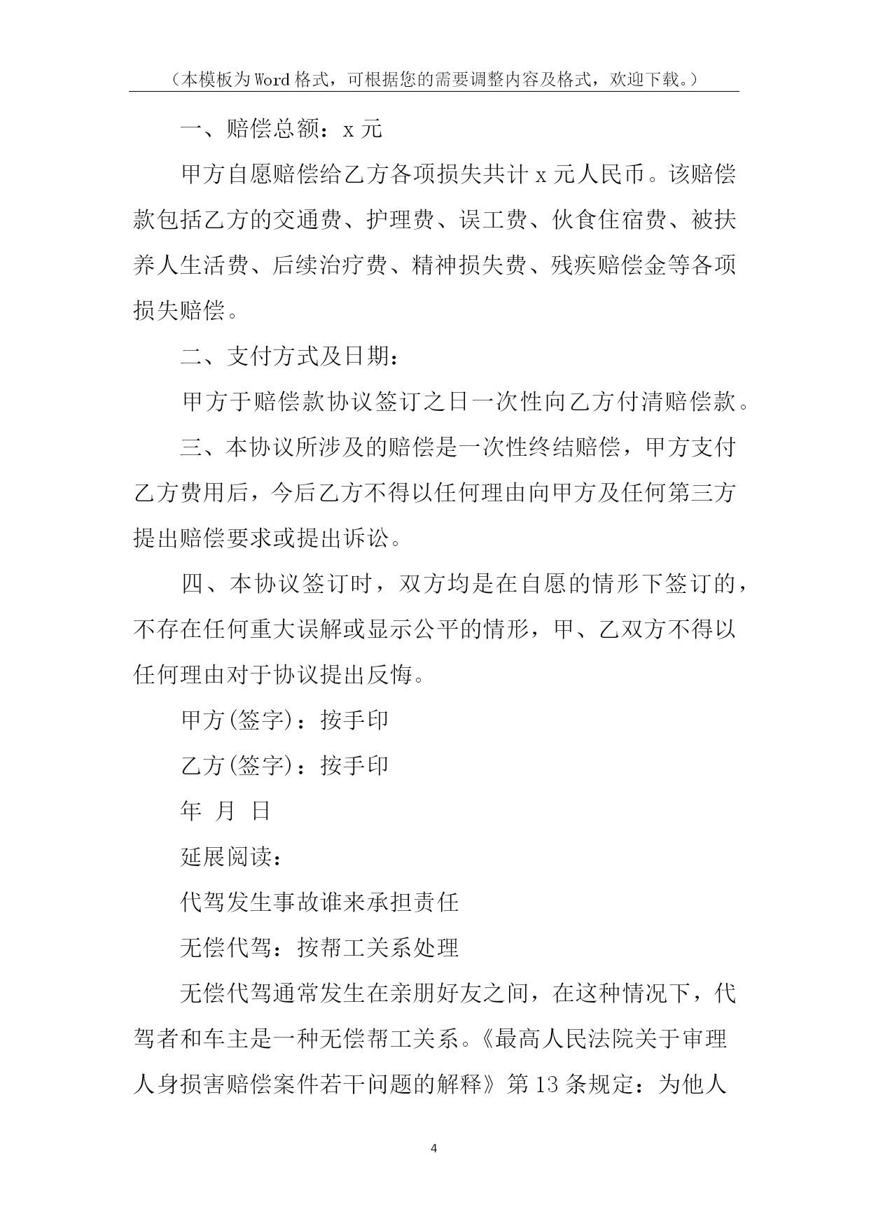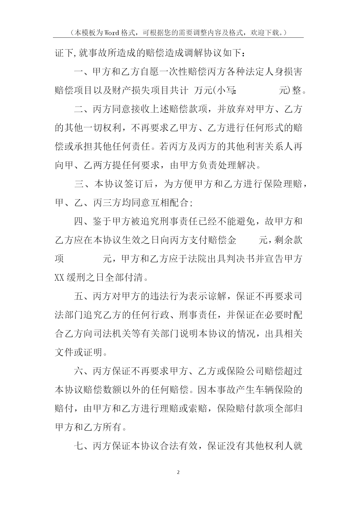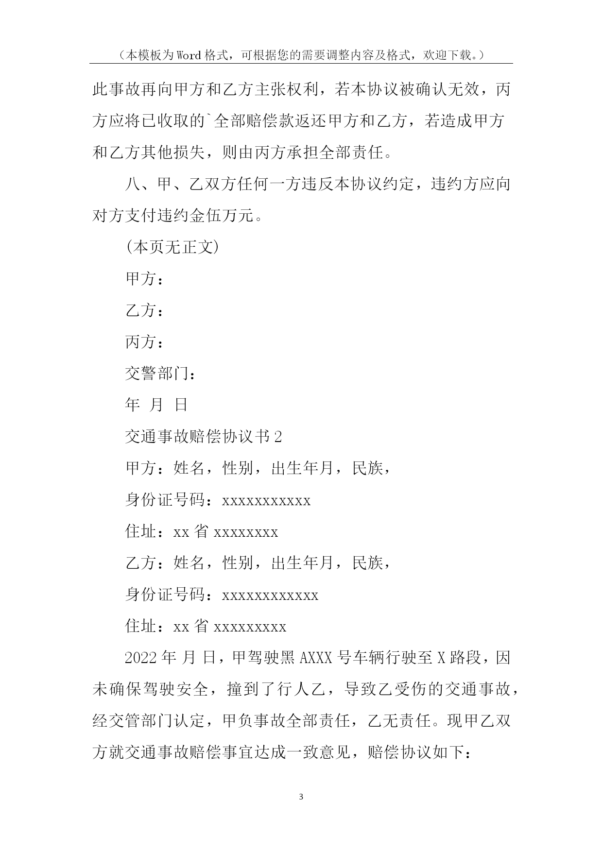 (本模板为Word格式,可根据您的需要调整内容及格式,欢迎下载。)PAGE\*MERGEFORMAT6交通事故赔偿协议书交通事故赔偿协议书1甲方(赔偿义务人):姓名、性别、年龄、住址、身份证号码,工作单位,系辽AXXXXX车辆驾驶员乙方(赔偿义务人):姓名、性别、年龄、住址、身份证号码,工作单位,系辽AXXXXX登记车主丙方(赔偿权利人):姓名、性别、年龄、住址、身份证号码,工作单位,系受害人XXX(包括配偶、父母、子女)2022年X月X日,甲方XXX驾驶辽AXXXX号XX牌轿车行驶至XXX路段XX公里处与受害人XXX发生碰撞,至受害人XXX当场死亡的后果。本起事故经沈阳市公安局沈北新区交警大队认定,在此次交通事故中车辆方负事故的全部责任;现辽AXXXX号车辆驾驶员被刑事拘留。经依法查明,辽AXXXX车在交管部门登记的实际车主为乙方XXX,该车在XXX保险公司XX支公司投保了交通事故强制保险。甲乙丙三方在平等、自愿的基础,依据《中华人民道路交通安全法》、《道路负事故处理办法》、《道路交通事故处理程序规定》、《最高人民法院关于胜利人身损害赔偿若干问题解释》的规定,经沈阳市公安局沈北新区交警大队的见证下,就事故所造成的赔偿造成调解协议如下:一、甲方和乙方自愿一次性赔偿丙方各种法定人身损害赔偿项目以及财产损失项目共计万元(小写:元)整。二、丙方同意接收上述赔偿款项,并放弃对甲方、乙方的其他一切权利,不再要求乙甲方、乙方进行任何形式的赔偿或承担其他任何责任。若丙方及丙方的其他利害关系人再向甲、乙两方提任何要求,由甲方负责处理解决。三、本协议签订后,为方便甲方和乙方进行保险理赔,甲、乙、丙三方均同意互相配合;四、鉴于甲方被追究刑事责任已经不能避免,故甲方和乙方应在本协议生效之日向丙方支付赔偿金元,剩余款项元,甲方和乙方应于法院出具判决书并宣告甲方XX缓刑之日全部付清。五、丙方对甲方的违法行为表示谅解,保证不再要求司法部门追究乙方的任何行政、刑事责任,并保证在必要时配合乙方向司法机关等有关部门说明本协议的情况,出具相关文件或证明。六、丙方保证不再要求甲方、乙方或保险公司赔偿超过本协议赔偿数额以外的任何赔偿。因本事故产生车辆保险的赔付,由甲方和乙方进行理赔或索赔,保险赔付款项全部归甲方和乙方所有。七、丙方保证本协议合法有效,保证没有其他权利人就此事故再向甲方和乙方主张权利,若本协议被确认无效,丙方应将已收取的`全部赔偿款返还甲方和乙方,若造成甲方和乙方其他损失,则由丙方承担全部责任。八、甲、乙双方任何一方违反本协议约定,违约方应向对方支付违约金伍万元。(本页无正文)甲方:乙方:丙方:交警部门:年月日交通事故赔偿协议书2甲方:姓名,性别,出生年月,民族,身份证号码:xxxxxxxxxxx住址:xx省xxxxxxxx乙方:姓名,性别,出生年月,民族,身份证号码:xxxxxxxxxxxx住址:xx省xxxxxxxxx2022年月日,甲驾驶黑AXXX号车辆行驶至X路段,因未确保驾驶安全,撞到了行人乙,导致乙受伤的交通事故,经交管部门认定,甲负事故全部责任,乙无责任。现甲乙双方就交通事故赔偿事宜达成一致意见,赔偿协议如下:一、赔偿总额:x元甲方自愿赔偿给乙方各项损失共计x元人民币。该赔偿款包括乙方的交通费、护理费、误工费、伙食住宿费、被扶养人生活费、后续治疗费、精神损失费、残疾赔偿金等各项损失赔偿。二、支付方式及日期:甲方于赔偿款协议签订之日一次性向乙方付清赔偿款。三、本协议所涉及的赔偿是一次性终结赔偿,甲方支付乙方费用后,今后乙方不得以任何理由向甲方及任何第三方提出赔偿要求或提出诉讼。四、本协议签订时,双方均是在自愿的情形下签订的,不存在任何重大误解或显示公平的情形,甲、乙双方不得以任何理由对于协议提出反悔。甲方(签字):按手印乙方(签字):按手印年月日延展阅读:代驾发生事故谁来承担责任无偿代驾:按帮工关系处理无偿代驾通常发生在亲朋好友之间,在这种情况下,代驾者和车主是一种无偿帮工关系。《最高人民法院关于审理人身损害赔偿案件若干问题的解释》第13条规定:为他人无偿提供劳务的帮工人,在从事帮工活动中致使人损害的,被帮工人应当赔偿责任。被帮工人明确拒绝帮工的,不承担赔偿责任。帮工人存在故意或者重大过失的,赔偿权利人请求帮工人和被帮工人承担连带责任的,人民法院予以支持,故一般情况由车辆所有人负责,但当代驾者存故意或重大过失时,也会承担连带责任。雇人代驾:按雇佣关系处理车主临时花钱雇人代驾,双方之间形成雇佣关系。如果发生交通事故,除按照车主投保的险种由保险人承担保险责任外,超出的部分一般由车主负责。但是,如果代驾人因故意或者重大过失致人损害,应当承担连带赔偿责任。公司代驾:按委托合同处理车主事先和代驾公司签订代驾服务书面合同,双方系委托合