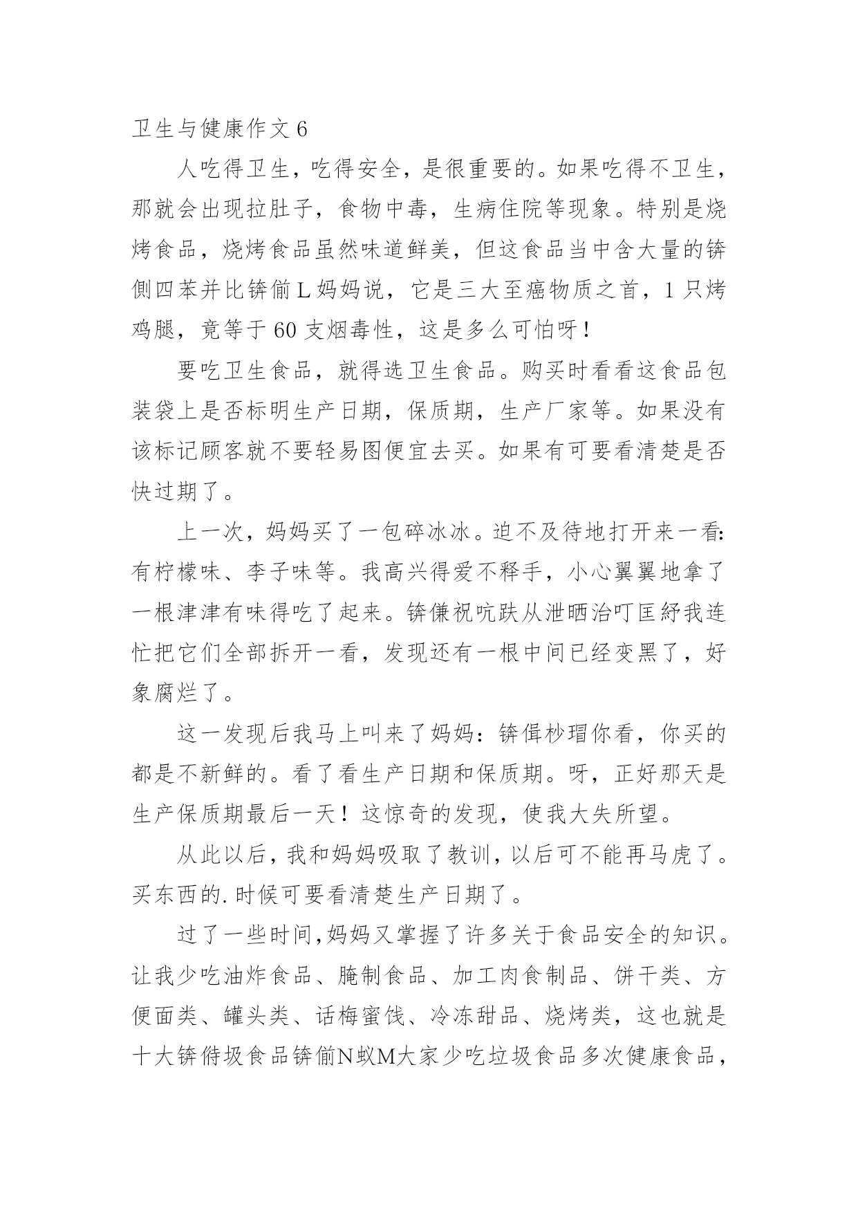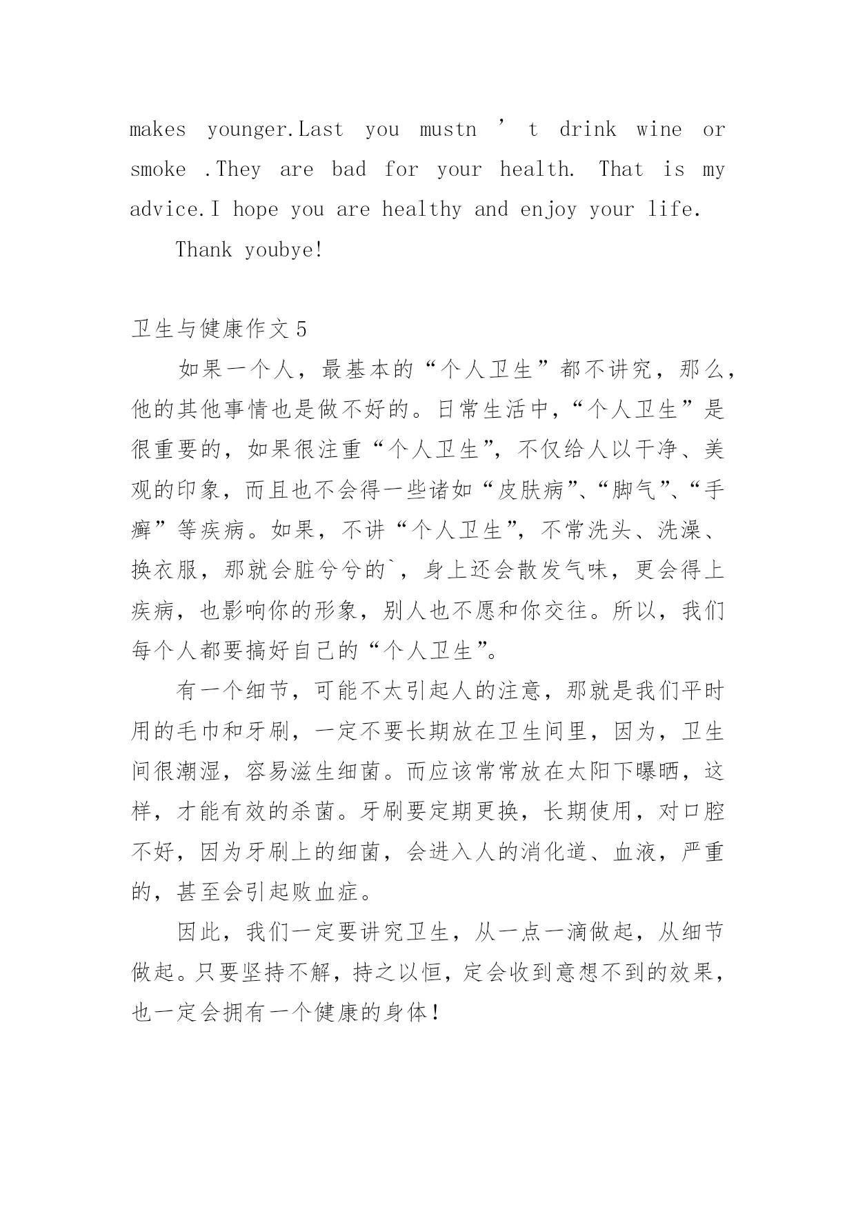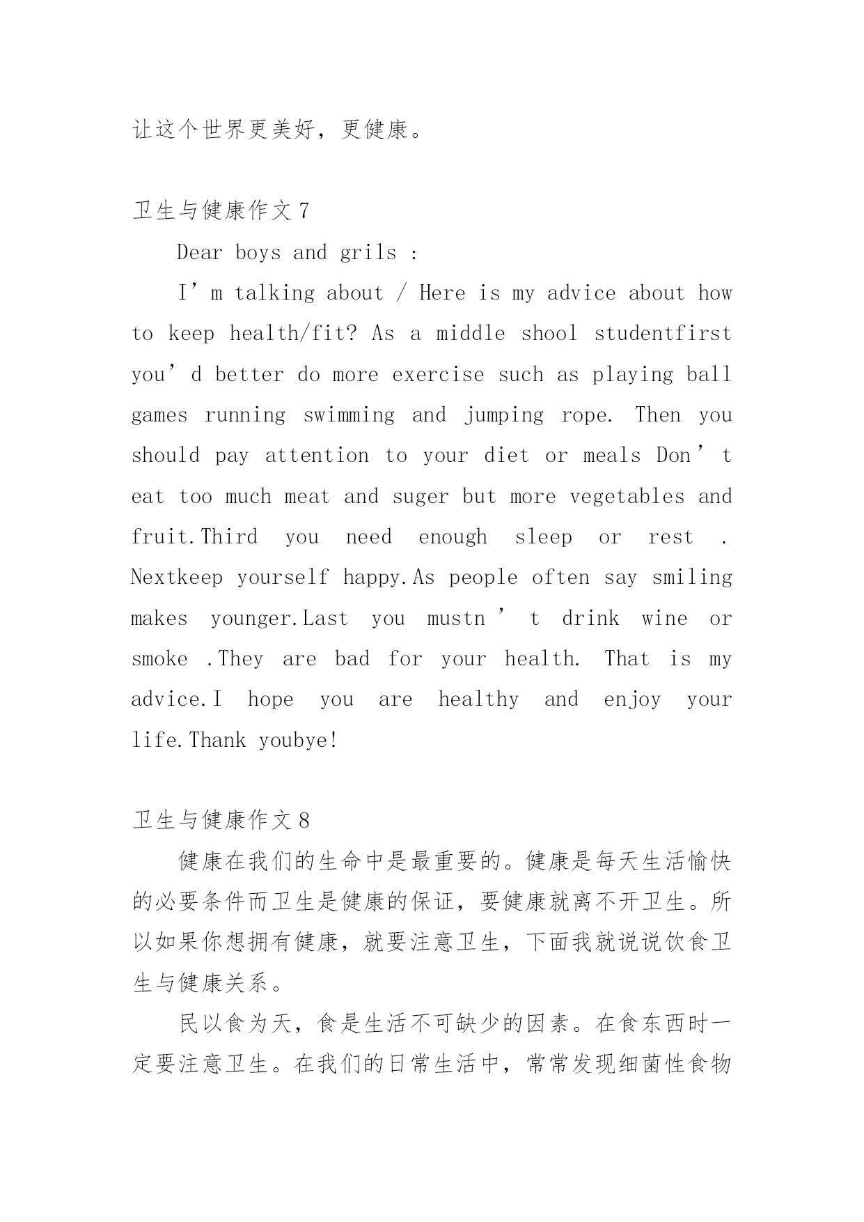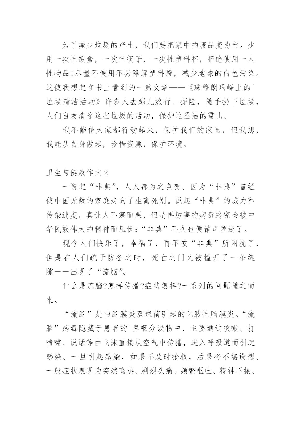 卫生与健康作文1卫生与健康作文无论是身处学校还是步入社会,说到作文,大家肯定都不陌生吧,根据写作命题的特点,作文可以分为命题作文和非命题作文。为了让您在写作文时更加简单方便,以下是小编为大家整理的卫生与健康作文,仅供参考,大家一起来看看吧。卫生与健康作文1你们知道中国的版图有多大?呈什么形状吗?也许大多数人会说:“版图形状像大公鸡!”但在陆地资源缺乏的今天,国人的观念还依然把大陆架遗弃在国土之外,难怪外国人侵占或掠夺我们的海上资源,我们竟是那么宽容或无可奈何。祖国现有一千二百六十万平方公里为黄色国土,三百万为蓝色国土,地图呈火炬形。人们的观点开始了变化。把海洋当作了废水排泄场。原本干净的大海变得脏兮兮的,发出一阵阵恶臭。许多鱼儿也受到了感染,翻起了白肚子。以北京市为例:现在北京人均日产垃圾千克,全市日产垃圾吨。如按载重4吨的卡车计算,每天要运出2875卡车垃圾。这些数据实在很“可怕”。但在其中还有许多没统计到的垃圾呢!全国现在约13亿人,如果人均日产生活垃圾都为千克,那么我们可以算一算:13亿乘以千克等于万吨!多么大的一个数字。几乎可以与一千零六十六头大象重量划上等号了!为了减少垃圾的产生,我们要把家中的废品变为宝。少用一次性饭盒,一次性筷子,一次性塑料杯,拒绝使用一人性物品!尽量不使用不易降解塑料袋,减少地球的白色污染。这使我想起在书上看到的一篇文章——《珠穆朗玛峰上的'垃圾清洁活动》许多人去那儿旅行、探险,随手扔下垃圾,人们自发清除这些垃圾的活动,保护这圣洁的雪山。我不能使大家都行动起来,保护我们的家园,但我想,我能从自身做起,珍惜资源,保护环境。卫生与健康作文2一说起“非典”,人人都为之色变。因为“非典”曾经使中国无数的家庭走向了生离死别。说起“非典”的威力和传染速度,真让人不寒而栗,但是再厉害的病毒终究会被中华民族伟大的精神而压倒:“非典”不久也便销声匿迹了。现今人们快乐了,幸福了,再不被“非典”所困扰了,但是在人们疏于防备之时,死亡之门又被撞开了一条缝隙――出现了“流脑”。什么是流脑?怎样传播?症状怎样?一系列的问题随之而来。“流脑”是由脑膜炎双球菌引起的化脓性脑膜炎。“流脑”病毒隐藏于患者的`鼻咽分泌物中,主要通过咳嗽、打喷嚏、说话等由飞沫直接从空气中传播,进入呼吸道而引起感染。一旦引起感染,如果不及时抢救,后果将不堪设想。一般症状表现为突然高热、剧烈头痛、频繁呕吐、精神不振、颈项强直,重者可出现昏迷、抽搐等症状。“流脑”一般倾向于15岁以下的儿童,病情常分为普通型和爆发型两种,爆发型常在24小时内置人于死地。其隐蔽性极高,常被人们误认为普通感冒,从而耽误了诊疗期,以至危及生命。我们要用我们民族的伟大精神去征服“流脑”。人们常说“一物降一物”。“流脑”也不例外,只要做好预防工作,“流脑”病毒再也不会光顾我们的身体。“流脑”的预防主要是注意通风,保持个人卫生,多晒太阳,合理饮食。我相信:只要我们提高警惕,防患于未然,众志成城,万众一心,阳光总会灿烂!让健康遍布全国,让笑容挂满脸颊,让幸福和快乐永存!卫生与健康作文3我生活在一个幸福的家庭,每天早晨吃的东西也不错,不是馒头、粽子就是面包。但是我们大家都知道,吃东西讲究的是卫生,如果东西不卫生,人们也自然不会吃了。还有些事往往在你知情的时候发生的。在我们这个景色优美人人都安居乐业的.小镇上,有那么一些黑良心的老板,用一些过期的,发霉、发臭、不合格的食品来做面包或一些别的食品。这样的事,我呀可碰到过不少!就在前几天,我突然很想吃面包,于是爸爸就去一家面包店去买了几个面包,我开心极了,第二天一早我吃起了好吃的面包,正当我吃的津津有味的时候妈妈也过来吃早饭,只见她拿起一个夹着火腿肠的面包,拆掉外面的包装,“啊”妈妈尖叫一声,连忙把面包丢向桌子,我不解的去看了看面包,“呀!怎么会是这样!”我大声喊道。原来,是那火腿肠的质量出了问题,只见那火腿肠的下半部分不再是正常的了,而是白色的,黏乎乎的,还有一股酸味,根本就是变质了,可包装外面的生产日期却怎么也找不到。不能再食用了,唉,只好丢了。我对此非常气恼,想去面包店讨个说法,但妈妈不同意,原因有二,一是可能讲不清楚,二是可能会发生争执得不偿失。妈妈说这件事情也是一个教训。今后对食品卫生都要多长个心眼,以把好“病从口入”关。妈妈还列举了许多有关不卫生食品的事列,如蔬菜打农药后还没过安全期就拔下来卖、注水肉、涂黄粉的小黄鱼等等。因此我们一定要多长个心眼哦!卫生与健康作文4I’mtalkingabout/Hereismyadviceabouthowtokeephealth/fit?Asamiddleshoolstudentfirstyou’dbetterdomoreexercisesuchasplayingballgamesrunning
