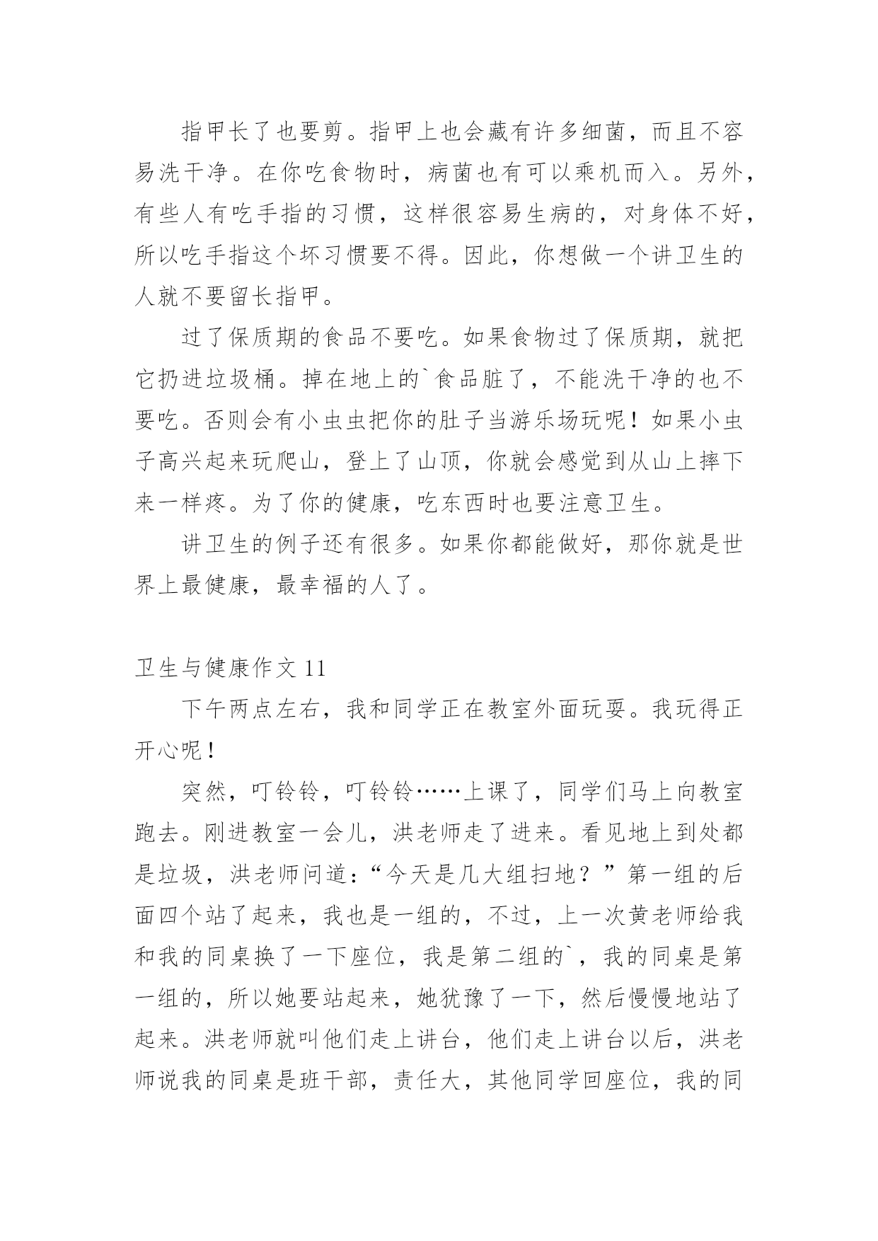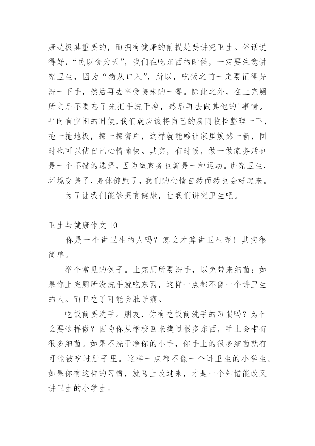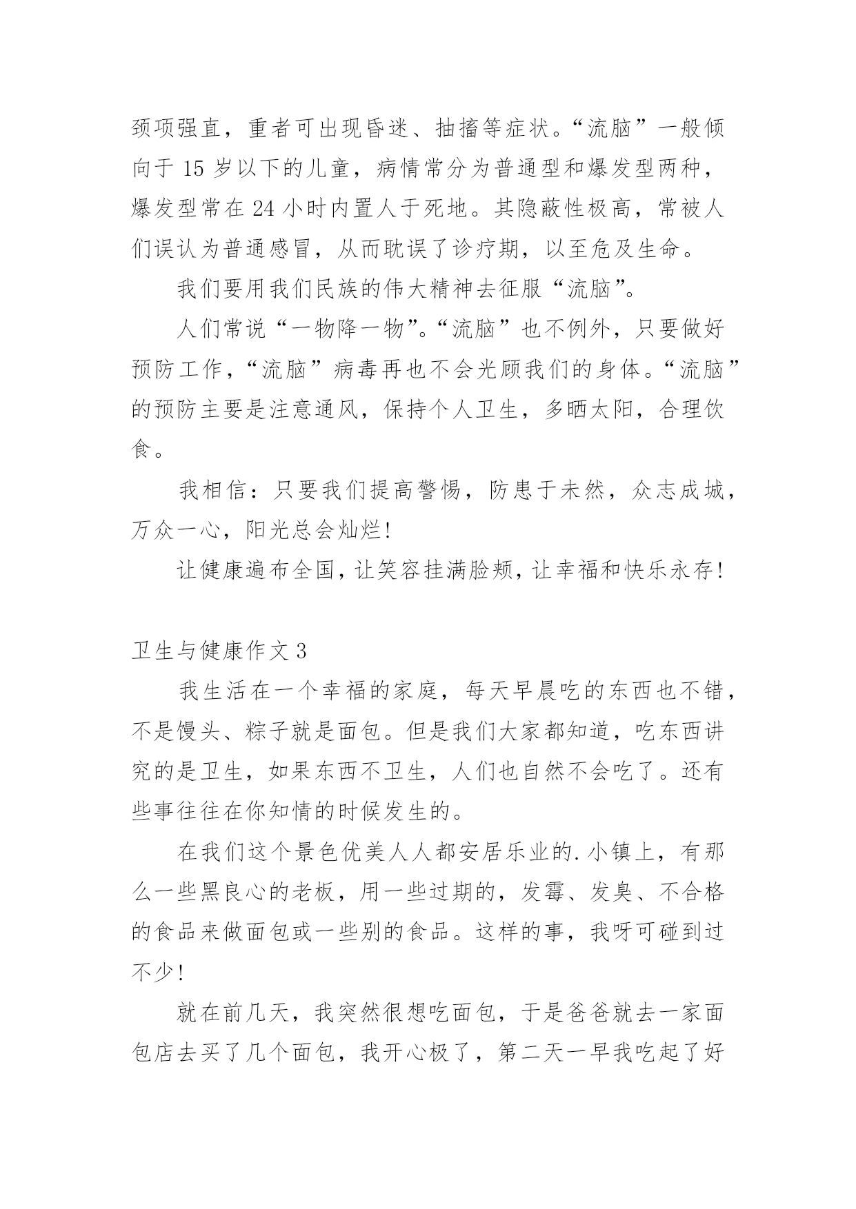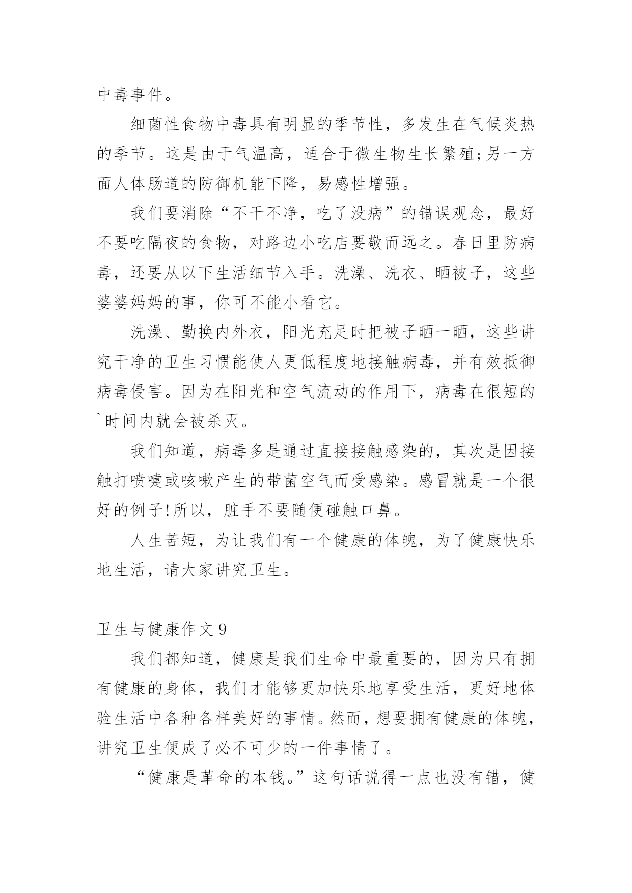 卫生与健康作文1卫生与健康作文无论是身处学校还是步入社会,说到作文,大家肯定都不陌生吧,根据写作命题的特点,作文可以分为命题作文和非命题作文。为了让您在写作文时更加简单方便,以下是小编为大家整理的卫生与健康作文,仅供参考,大家一起来看看吧。卫生与健康作文1你们知道中国的版图有多大?呈什么形状吗?也许大多数人会说:“版图形状像大公鸡!”但在陆地资源缺乏的今天,国人的观念还依然把大陆架遗弃在国土之外,难怪外国人侵占或掠夺我们的海上资源,我们竟是那么宽容或无可奈何。祖国现有一千二百六十万平方公里为黄色国土,三百万为蓝色国土,地图呈火炬形。人们的观点开始了变化。把海洋当作了废水排泄场。原本干净的大海变得脏兮兮的,发出一阵阵恶臭。许多鱼儿也受到了感染,翻起了白肚子。以北京市为例:现在北京人均日产垃圾千克,全市日产垃圾吨。如按载重4吨的卡车计算,每天要运出2875卡车垃圾。这些数据实在很“可怕”。但在其中还有许多没统计到的垃圾呢!全国现在约13亿人,如果人均日产生活垃圾都为千克,那么我们可以算一算:13亿乘以千克等于万吨!多么大的一个数字。几乎可以与一千零六十六头大象重量划上等号了!为了减少垃圾的产生,我们要把家中的废品变为宝。少用一次性饭盒,一次性筷子,一次性塑料杯,拒绝使用一人性物品!尽量不使用不易降解塑料袋,减少地球的白色污染。这使我想起在书上看到的一篇文章——《珠穆朗玛峰上的'垃圾清洁活动》许多人去那儿旅行、探险,随手扔下垃圾,人们自发清除这些垃圾的活动,保护这圣洁的雪山。我不能使大家都行动起来,保护我们的家园,但我想,我能从自身做起,珍惜资源,保护环境。卫生与健康作文2一说起“非典”,人人都为之色变。因为“非典”曾经使中国无数的家庭走向了生离死别。说起“非典”的威力和传染速度,真让人不寒而栗,但是再厉害的病毒终究会被中华民族伟大的精神而压倒:“非典”不久也便销声匿迹了。现今人们快乐了,幸福了,再不被“非典”所困扰了,但是在人们疏于防备之时,死亡之门又被撞开了一条缝隙――出现了“流脑”。什么是流脑?怎样传播?症状怎样?一系列的问题随之而来。“流脑”是由脑膜炎双球菌引起的化脓性脑膜炎。“流脑”病毒隐藏于患者的`鼻咽分泌物中,主要通过咳嗽、打喷嚏、说话等由飞沫直接从空气中传播,进入呼吸道而引起感染。一旦引起感染,如果不及时抢救,后果将不堪设想。一般症状表现为突然高热、剧烈头痛、频繁呕吐、精神不振、颈项强直,重者可出现昏迷、抽搐等症状。“流脑”一般倾向于15岁以下的儿童,病情常分为普通型和爆发型两种,爆发型常在24小时内置人于死地。其隐蔽性极高,常被人们误认为普通感冒,从而耽误了诊疗期,以至危及生命。我们要用我们民族的伟大精神去征服“流脑”。人们常说“一物降一物”。“流脑”也不例外,只要做好预防工作,“流脑”病毒再也不会光顾我们的身体。“流脑”的预防主要是注意通风,保持个人卫生,多晒太阳,合理饮食。我相信:只要我们提高警惕,防患于未然,众志成城,万众一心,阳光总会灿烂!让健康遍布全国,让笑容挂满脸颊,让幸福和快乐永存!卫生与健康作文3我生活在一个幸福的家庭,每天早晨吃的东西也不错,不是馒头、粽子就是面包。但是我们大家都知道,吃东西讲究的是卫生,如果东西不卫生,人们也自然不会吃了。还有些事往往在你知情的时候发生的。在我们这个景色优美人人都安居乐业的.小镇上,有那么一些黑良心的老板,用一些过期的,发霉、发臭、不合格的食品来做面包或一些别的食品。这样的事,我呀可碰到过不少!就在前几天,我突然很想吃面包,于是爸爸就去一家面包店去买了几个面包,我开心极了,第二天一早我吃起了好吃的面包,正当我吃的津津有味的时候妈妈也过来吃早饭,只见她拿起一个夹着火腿肠的面包,拆掉外面的包装,“啊”妈妈尖叫一声,连忙把面包丢向桌子,我不解的去看了看面包,“呀!怎么会是这样!”我大声喊道。原来,是那火腿肠的质量出了问题,只见那火腿肠的下半部分不再是正常的了,而是白色的,黏乎乎的,还有一股酸味,根本就是变质了,可包装外面的生产日期却怎么也找不到。不能再食用了,唉,只好丢了。我对此非常气恼,想去面包店讨个说法,但妈妈不同意,原因有二,一是可能讲不清楚,二是可能会发生争执得不偿失。妈妈说这件事情也是一个教训。今后对食品卫生都要多长个心眼,以把好“病从口入”关。妈妈还列举了许多有关不卫生食品的事列,如蔬菜打农药后还没过安全期就拔下来卖、注水肉、涂黄粉的小黄鱼等等。因此我们一定要多长个心眼哦!卫生与健康作文4I’mtalkingabout/Hereismyadviceabouthowtokeephealth/fit?Asamiddleshoolstudentfirstyou’dbetterdomoreexercisesuchasplayingballgamesrunning