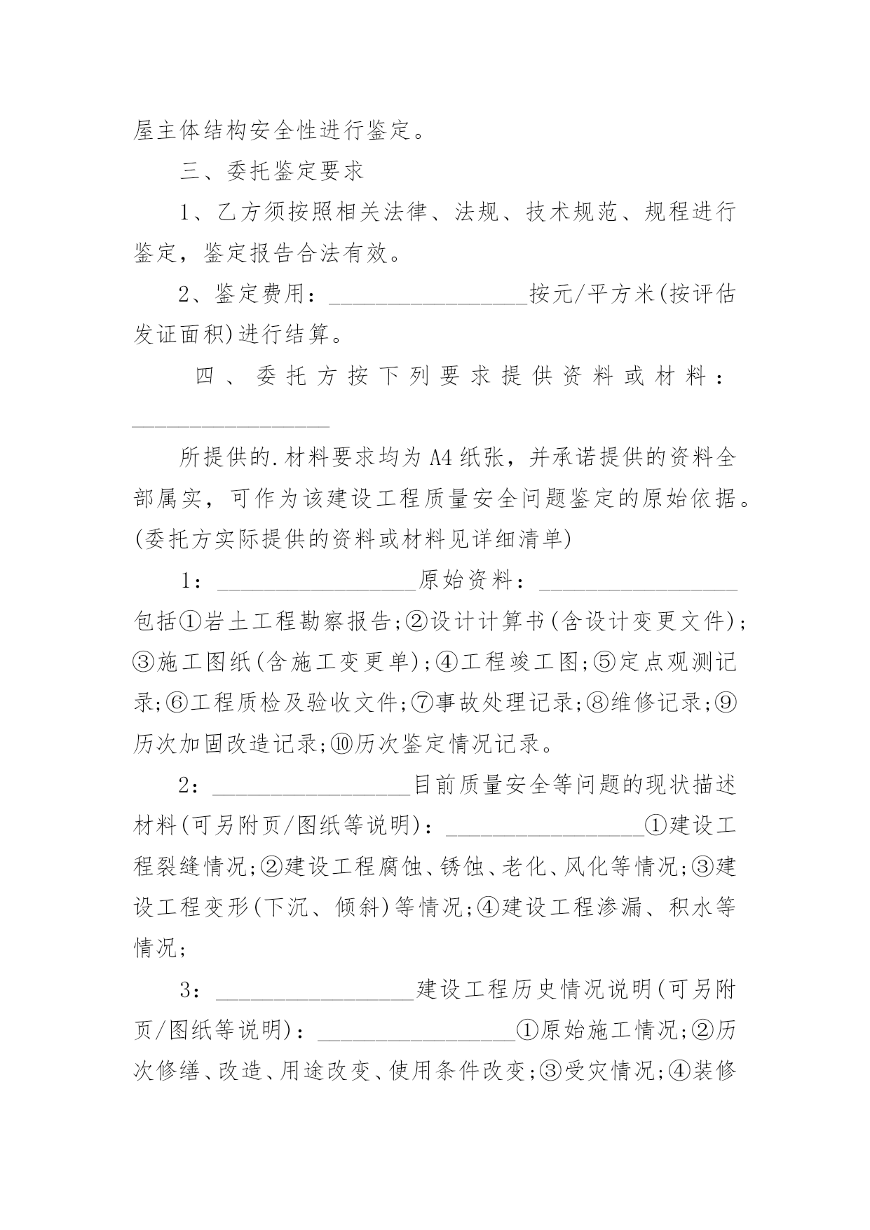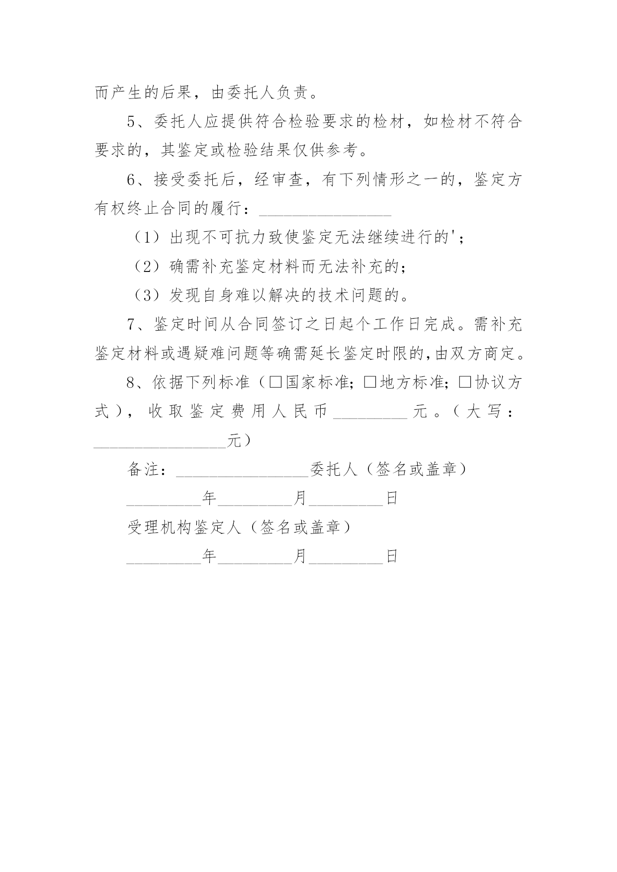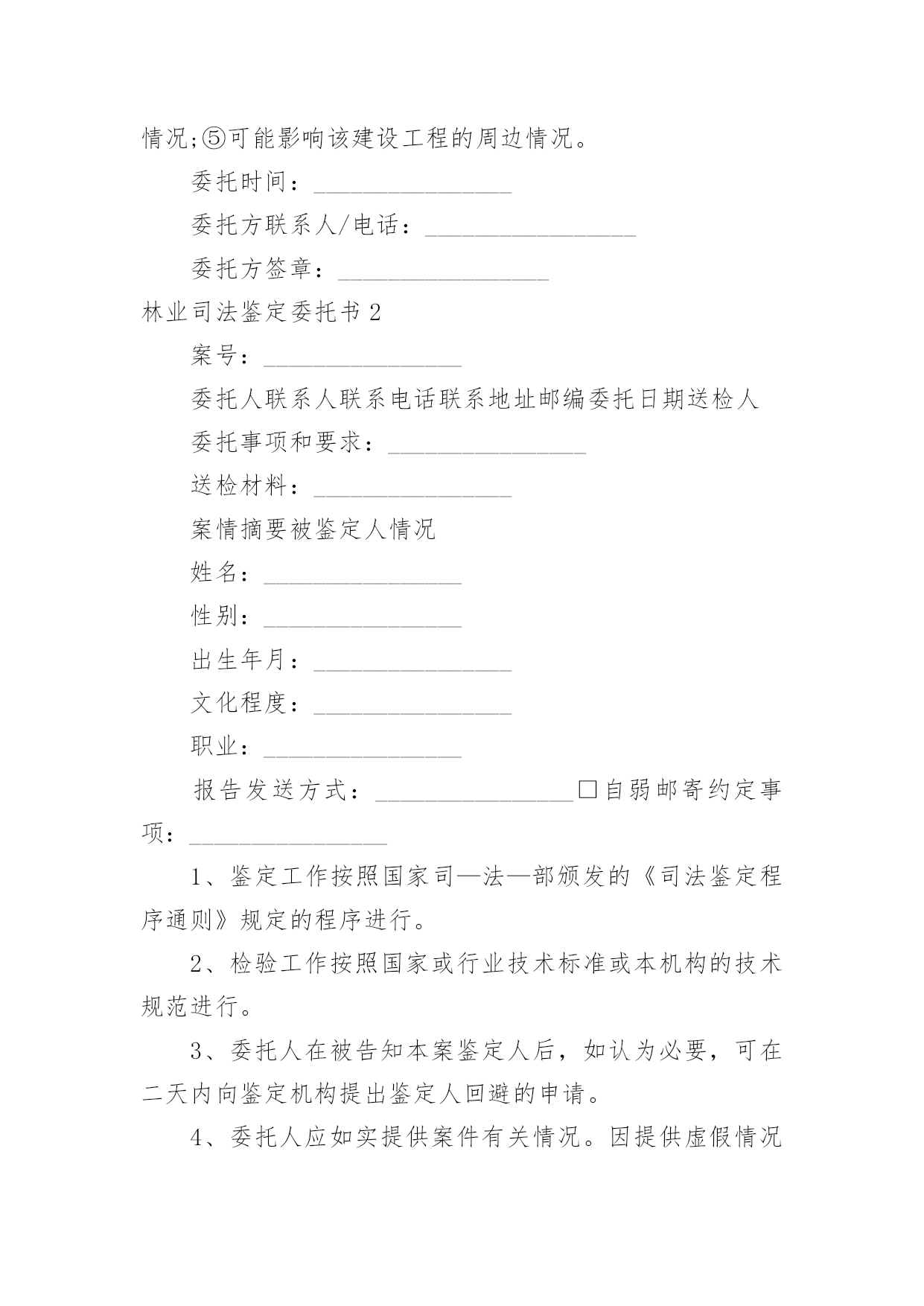 林业司法鉴定委托书林业司法鉴定委托书委托书具有不可撤销性,委托人不得以任何理由反悔委托事项。在我们平凡的日常里,在处理事务上需要使用委托书的情况越来越多,相信写委托书是一个让许多人都头痛的问题,下面是小编为大家整理的林业司法鉴定委托书,仅供参考,欢迎大家阅读。林业司法鉴定委托书1编号:_________________委托方:_________________受托方:_________________兹有我单位建筑工程现存在_____________问题,特委托进行鉴定。一、工程概况:_________________1、工程名称:_________________2、工程地址:_________________3、建造年份:_________________4、设计单位:_________________5、施工单位:_________________6、建筑面积、层数:_________________7、结构类型:_________________二、委托鉴定的目的、内容:_________________对房屋主体结构安全性进行鉴定。三、委托鉴定要求1、乙方须按照相关法律、法规、技术规范、规程进行鉴定,鉴定报告合法有效。2、鉴定费用:_________________按元/平方米(按评估发证面积)进行结算。四、委托方按下列要求提供资料或材料:_________________所提供的.材料要求均为A4纸张,并承诺提供的资料全部属实,可作为该建设工程质量安全问题鉴定的原始依据。(委托方实际提供的资料或材料见详细清单)1:_________________原始资料:_________________包括①岩土工程勘察报告;②设计计算书(含设计变更文件);③施工图纸(含施工变更单);④工程竣工图;⑤定点观测记录;⑥工程质检及验收文件;⑦事故处理记录;⑧维修记录;⑨历次加固改造记录;⑩历次鉴定情况记录。2:_________________目前质量安全等问题的现状描述材料(可另附页/图纸等说明):_________________①建设工程裂缝情况;②建设工程腐蚀、锈蚀、老化、风化等情况;③建设工程变形(下沉、倾斜)等情况;④建设工程渗漏、积水等情况;3:_________________建设工程历史情况说明(可另附页/图纸等说明):_________________①原始施工情况;②历次修缮、改造、用途改变、使用条件改变;③受灾情况;④装修情况;⑤可能影响该建设工程的周边情况。委托时间:________________委托方联系人/电话:_________________委托方签章:_________________林业司法鉴定委托书2案号:________________委托人联系人联系电话联系地址邮编委托日期送检人委托事项和要求:________________送检材料:________________案情摘要被鉴定人情况姓名:________________性别:________________出生年月:________________文化程度:________________职业:________________报告发送方式:________________□自弱邮寄约定事项:________________1、鉴定工作按照国家司—法—部颁发的《司法鉴定程序通则》规定的程序进行。2、检验工作按照国家或行业技术标准或本机构的技术规范进行。3、委托人在被告知本案鉴定人后,如认为必要,可在二天内向鉴定机构提出鉴定人回避的申请。4、委托人应如实提供案件有关情况。因提供虚假情况而产生的后果,由委托人负责。5、委托人应提供符合检验要求的检材,如检材不符合要求的,其鉴定或检验结果仅供参考。6、接受委托后,经审查,有下列情形之一的,鉴定方有权终止合同的履行:________________(1)出现不可抗力致使鉴定无法继续进行的';(2)确需补充鉴定材料而无法补充的;(3)发现自身难以解决的技术问题的。7、鉴定时间从合同签订之日起个工作日完成。需补充鉴定材料或遇疑难问题等确需延长鉴定时限的,由双方商定。8、依据下列标准(□国家标准;□地方标准;□协议方式),收取鉴定费用人民币_________元。(大写:________________元)备注:________________委托人(签名或盖章)_________年_________月_________日受理机构鉴定人(签名或盖章)_________年_________月_________日