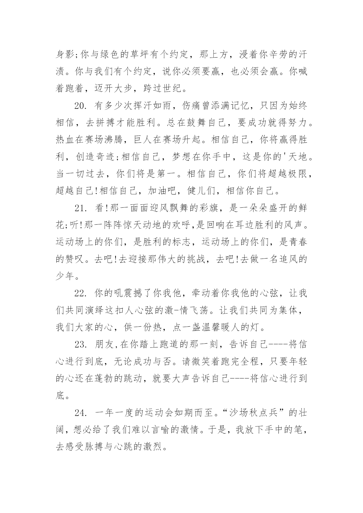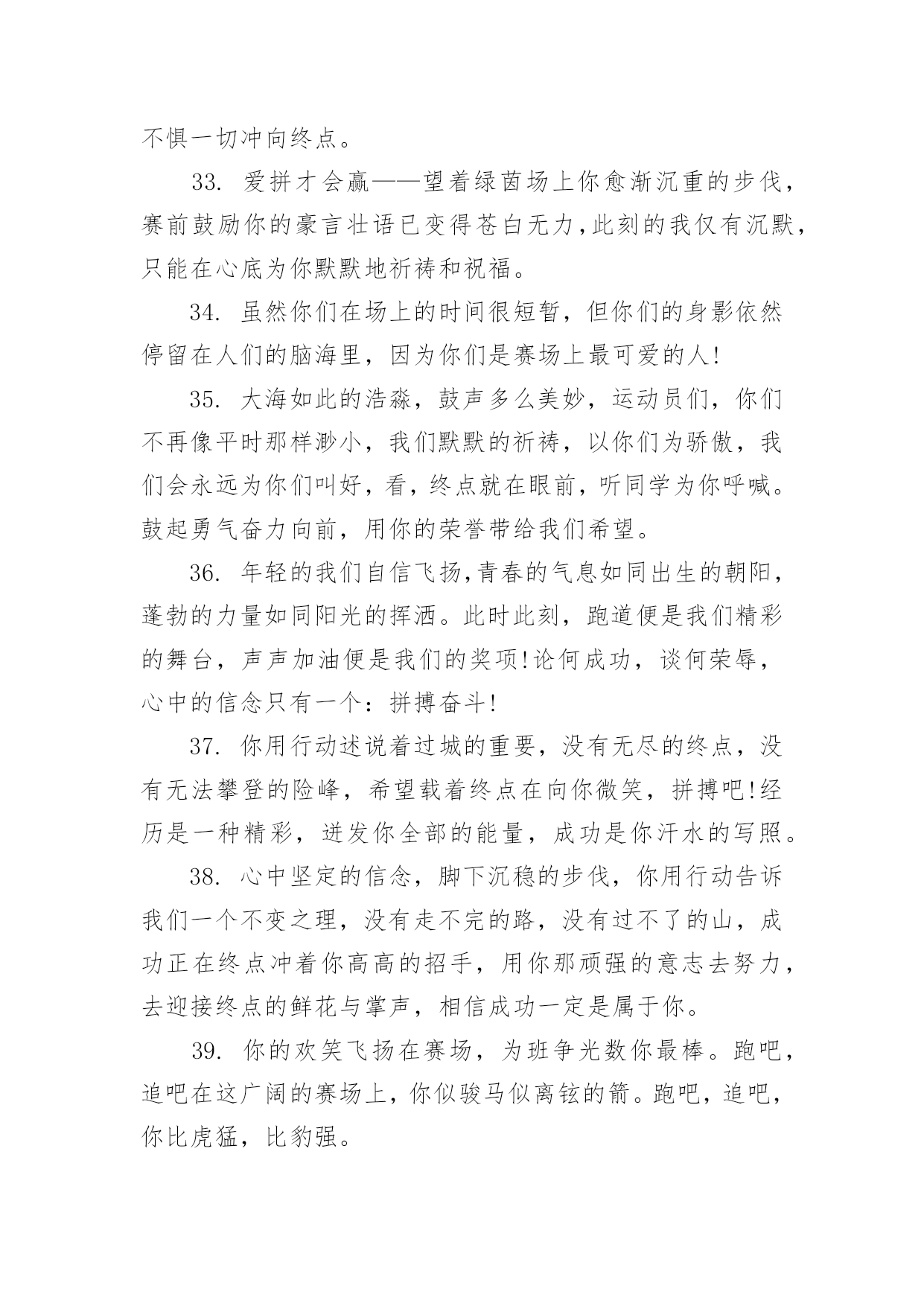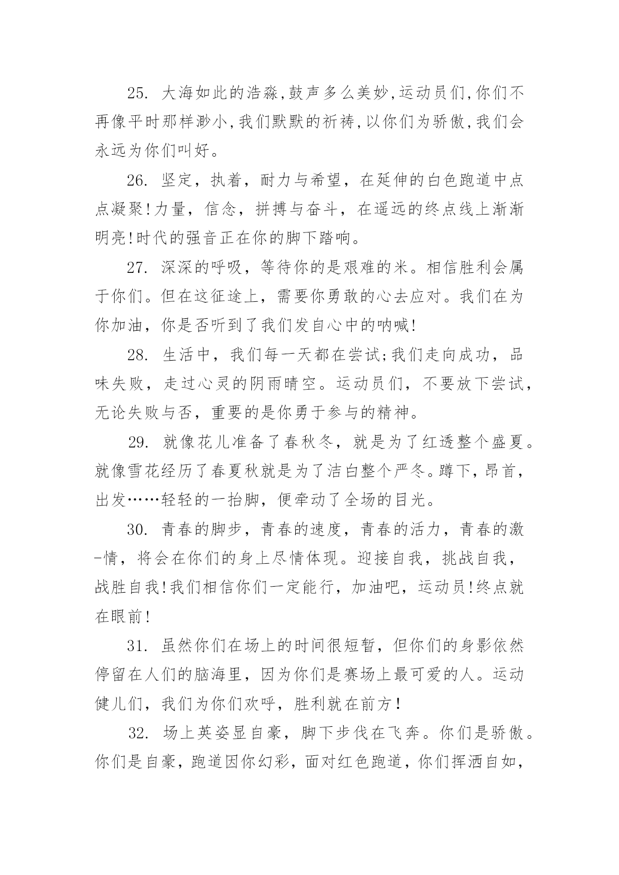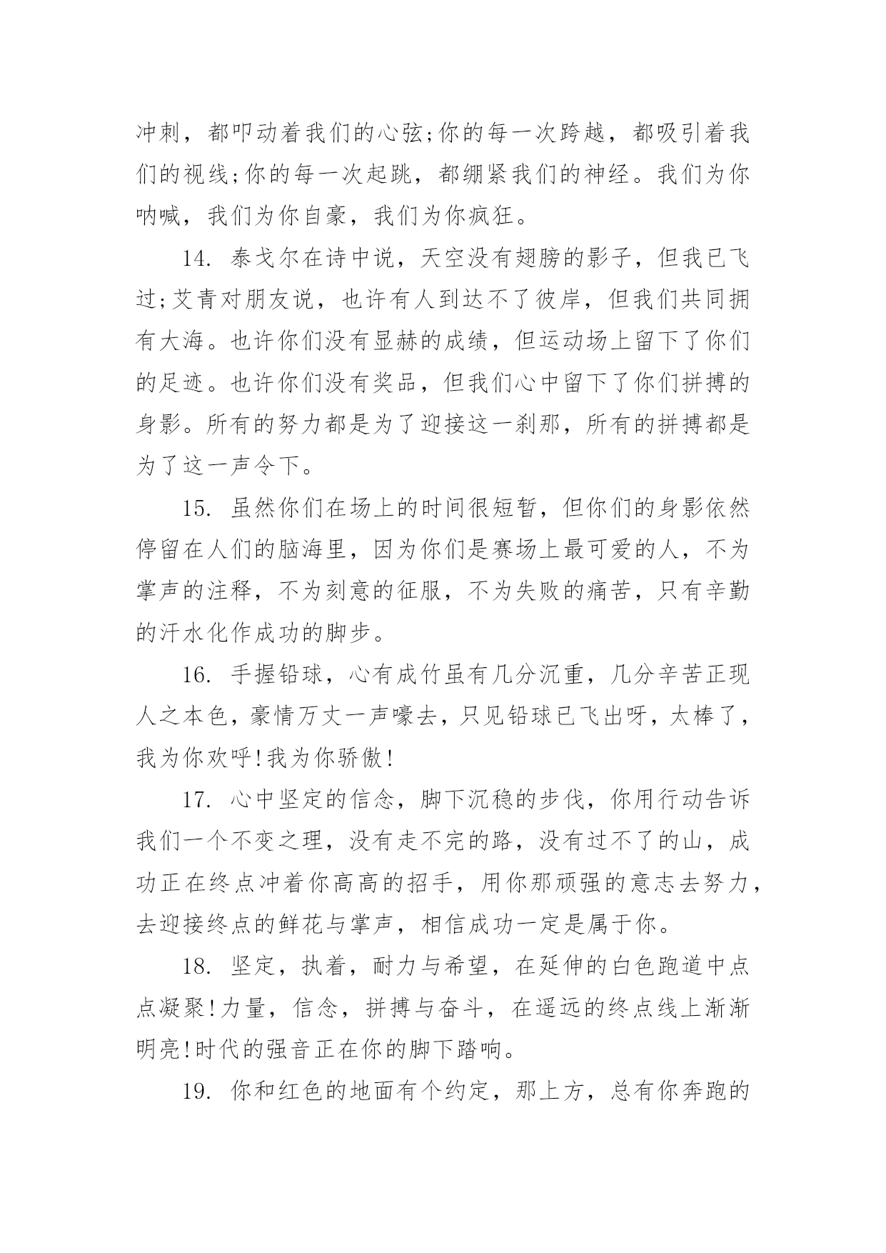 运动会加油稿在日新月异的现代社会中,我们都可能会用到加油稿,借助加油稿可以激励他人的士气。写加油稿的注意事项有许多,你确定会写吗?以下是小编为大家整理的运动会加油稿,欢迎大家借鉴与参考,希望对大家有所帮助。运动会加油稿1就让这灼目的骄阳,在你自信满满的目光下黯然失,就让这绚烂的繁花,在你矫健挺拔的身姿前兀自凋零,就让这激情呐喊,为你添一分风雨无惧的'豪迈,就让这连绵欢唱,为你奏一曲凯旋之歌,向前冲刺吧!勇敢的运动员们!运动会加油稿21.青春的脚步,青春的速度,青春的活力,青春的激情,将会在你们的身上尽情体现。迎接自我,挑战自我,战胜自我!我们相信你们一定能行,加油吧,运动员!终点就在眼前!2.温暖的阳光洒在赛场上,男子乙组标枪的比赛即将开始。赛场上,一道道优美的弧线将轻盈地划过天空。健儿们用手中的标枪向距离的权限发起一轮又一轮的挑战。标枪在空中轻盈的姿态,是健儿们强健的力量和熟练的技巧的结合。谁能在这场激烈的竞争中获胜?让我们拭目以待,让我们为他们呐喊、助威吧!只有将力量与技巧合二为一的人,才能获得胜利的桂冠!3.年轻的我们自信飞扬,青春的气息如同出生的朝阳,蓬勃的力量如同阳光的挥洒。此时此刻,跑道便是我们精彩的舞台,声声加油便是我们最高的奖项!论何成功,谈何荣辱,心中的信念只有一个:拼搏!萧瑟的秋风,挡不住你们破竹的锐气。4.不长不短的距离,需要的是全身心全程投入,自始至终你们都在拼全力此时此刻,你们处在最风光的一刻,无论第几坚持胜利的信心,只要跑下来,你们就是英雄。5.广阔的绿茵场,是为你们搭建的舞台。张扬吧,年轻的心,我们将为你永远喝彩!泰戈尔在诗中说,天空没有翅膀的影子,但我已飞过;艾青对朋友说,也许有人到达不了彼岸,但我们共同拥有大海。也许你们没有显赫的成绩,但运动场上留下了你们的足迹。也许你们没有奖品,但我们心中留下了你们拼搏的身影。所有的努力都是为了迎接这一刹那,所有的拼搏都是为了这一声令下。6.就像花儿准备了春、秋、冬,就是为了红透整个盛夏。就像雪花经历了春、夏、秋就是为了洁白整个严冬。蹲下,昂首,出发……轻轻的一抬脚,便牵动了全场的目光潇洒的迫挥挥手,便满足了那一份无言的等待。迎着朝阳,你们踏歌而去,背着希望,我们等待你们的归来。7.百米迸发的是无穷的力量,温暖的是我们的家,演绎的是团结友爱。也许你心理忐忑不安,我们的心里早已热血沸腾。8.昔日,长长的跑道上,留下了你深深的足迹,抹不去你渗出的汗水,拉不动你沉重的双脚,你为分院,不在乎自己的疲倦,不在乎汗水和泪水,因为你心里有一种坚定的信念,诺大的竞技场期待着你矫健的身影,瑟瑟的秋风为你送来爽朗的气息。9.也许流星并不少见,但它燃烧的刹那,留给人间最美丽的回忆!也许笑脸并不少见,但胜利的喜悦,总会留给世界精彩的一瞬!是的,那些曾经美妙的东西只有短短的一瞬间,但那却把最辉煌的一刻留给了人间。胜利,是每个人所追求的,胜利的喜悦,是胜利与重新开始的转折,胜利是新的开始!10.踏上跑道,是一种选择。离开起点,是一种勇气。驰骋赛场,是一种胜利。11.人生的路,有坦途,也有坎坷;做过的岁月,有欢笑,也有苦涩,泪水告诉我一个跌倒的故事,汗水使我多了一份沉重,几多成熟。12.理想毕竟不同于现实,失败是生活的一部分,谁也无法选择,无法拒绝。人生要自己去拼搏,去奋斗,在风雨中百折不挠勇往前进,在集资的每个驿站上都留下一段不悔的回忆。流泪不是失落,徘徊不是迷惑,成功属于那些战胜失败,坚持不懈勇于追求梦想的人。加油吧,运动健儿们!13.踏着春天的气息,迈着轻盈的脚步,我们迎来了心仪已久的运动会。这里就是展示自我的舞台。我们向往高山的坚忍不拔,我们渴望大海的博大精深,还有,我们更痴迷于你们的速度激情。来吧,尽情释放你的活力。你的每一次冲刺,都叩动着我们的心弦;你的每一次跨越,都吸引着我们的视线;你的每一次起跳,都绷紧我们的神经。我们为你呐喊,我们为你自豪,我们为你疯狂。14.泰戈尔在诗中说,天空没有翅膀的影子,但我已飞过;艾青对朋友说,也许有人到达不了彼岸,但我们共同拥有大海。也许你们没有显赫的成绩,但运动场上留下了你们的足迹。也许你们没有奖品,但我们心中留下了你们拼搏的身影。所有的努力都是为了迎接这一刹那,所有的拼搏都是为了这一声令下。15.虽然你们在场上的时间很短暂,但你们的身影依然停留在人们的脑海里,因为你们是赛场上最可爱的人,不为掌声的注释,不为刻意的征服,不为失败的痛苦,只有辛勤的汗水化作成功的脚步。16.手握铅球,心有成竹虽有几分沉重,几分辛苦正现人之本色,豪情万丈一声嚎去,只见铅球已飞出呀,太棒了,我为你欢呼!我为你骄傲!17.心中坚定的信念,脚下沉稳的步伐,你用行动告诉我们一个不变之理,没有走不完的路,没有过不了的山,成功正在终点冲着你高高的招手,用你那顽强的意志去
