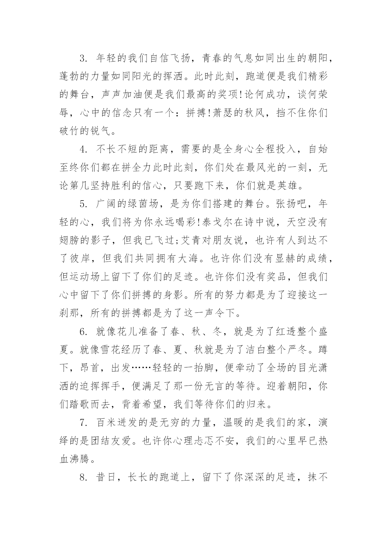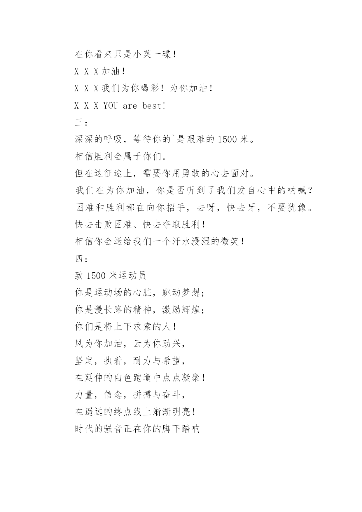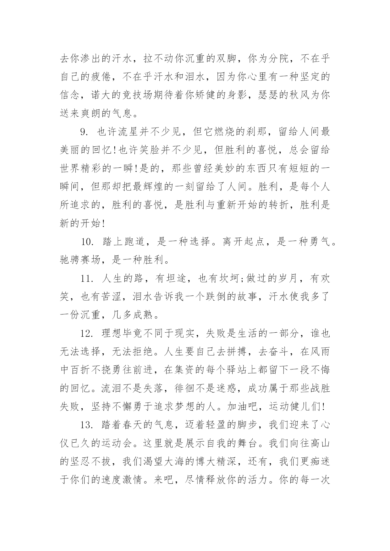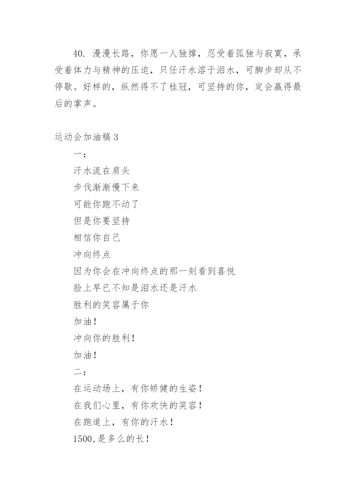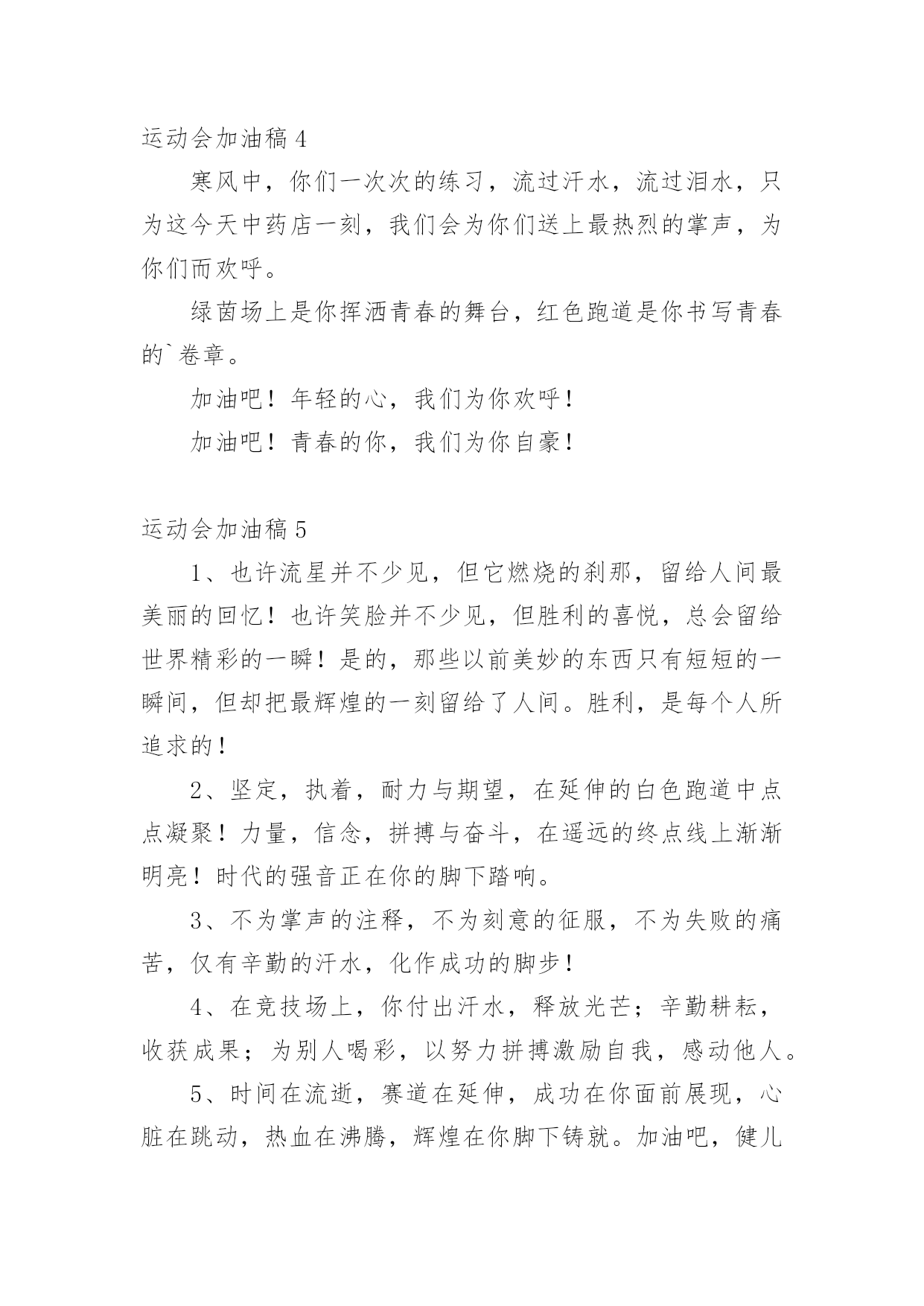 运动会加油稿在日新月异的现代社会中,我们都可能会用到加油稿,借助加油稿可以激励他人的士气。写加油稿的注意事项有许多,你确定会写吗?以下是小编为大家整理的运动会加油稿,欢迎大家借鉴与参考,希望对大家有所帮助。运动会加油稿1就让这灼目的骄阳,在你自信满满的目光下黯然失,就让这绚烂的繁花,在你矫健挺拔的身姿前兀自凋零,就让这激情呐喊,为你添一分风雨无惧的'豪迈,就让这连绵欢唱,为你奏一曲凯旋之歌,向前冲刺吧!勇敢的运动员们!运动会加油稿21.青春的脚步,青春的速度,青春的活力,青春的激情,将会在你们的身上尽情体现。迎接自我,挑战自我,战胜自我!我们相信你们一定能行,加油吧,运动员!终点就在眼前!2.温暖的阳光洒在赛场上,男子乙组标枪的比赛即将开始。赛场上,一道道优美的弧线将轻盈地划过天空。健儿们用手中的标枪向距离的权限发起一轮又一轮的挑战。标枪在空中轻盈的姿态,是健儿们强健的力量和熟练的技巧的结合。谁能在这场激烈的竞争中获胜?让我们拭目以待,让我们为他们呐喊、助威吧!只有将力量与技巧合二为一的人,才能获得胜利的桂冠!3.年轻的我们自信飞扬,青春的气息如同出生的朝阳,蓬勃的力量如同阳光的挥洒。此时此刻,跑道便是我们精彩的舞台,声声加油便是我们最高的奖项!论何成功,谈何荣辱,心中的信念只有一个:拼搏!萧瑟的秋风,挡不住你们破竹的锐气。4.不长不短的距离,需要的是全身心全程投入,自始至终你们都在拼全力此时此刻,你们处在最风光的一刻,无论第几坚持胜利的信心,只要跑下来,你们就是英雄。5.广阔的绿茵场,是为你们搭建的舞台。张扬吧,年轻的心,我们将为你永远喝彩!泰戈尔在诗中说,天空没有翅膀的影子,但我已飞过;艾青对朋友说,也许有人到达不了彼岸,但我们共同拥有大海。也许你们没有显赫的成绩,但运动场上留下了你们的足迹。也许你们没有奖品,但我们心中留下了你们拼搏的身影。所有的努力都是为了迎接这一刹那,所有的拼搏都是为了这一声令下。6.就像花儿准备了春、秋、冬,就是为了红透整个盛夏。就像雪花经历了春、夏、秋就是为了洁白整个严冬。蹲下,昂首,出发……轻轻的一抬脚,便牵动了全场的目光潇洒的迫挥挥手,便满足了那一份无言的等待。迎着朝阳,你们踏歌而去,背着希望,我们等待你们的归来。7.百米迸发的是无穷的力量,温暖的是我们的家,演绎的是团结友爱。也许你心理忐忑不安,我们的心里早已热血沸腾。8.昔日,长长的跑道上,留下了你深深的足迹,抹不去你渗出的汗水,拉不动你沉重的双脚,你为分院,不在乎自己的疲倦,不在乎汗水和泪水,因为你心里有一种坚定的信念,诺大的竞技场期待着你矫健的身影,瑟瑟的秋风为你送来爽朗的气息。9.也许流星并不少见,但它燃烧的刹那,留给人间最美丽的回忆!也许笑脸并不少见,但胜利的喜悦,总会留给世界精彩的一瞬!是的,那些曾经美妙的东西只有短短的一瞬间,但那却把最辉煌的一刻留给了人间。胜利,是每个人所追求的,胜利的喜悦,是胜利与重新开始的转折,胜利是新的开始!10.踏上跑道,是一种选择。离开起点,是一种勇气。驰骋赛场,是一种胜利。11.人生的路,有坦途,也有坎坷;做过的岁月,有欢笑,也有苦涩,泪水告诉我一个跌倒的故事,汗水使我多了一份沉重,几多成熟。12.理想毕竟不同于现实,失败是生活的一部分,谁也无法选择,无法拒绝。人生要自己去拼搏,去奋斗,在风雨中百折不挠勇往前进,在集资的每个驿站上都留下一段不悔的回忆。流泪不是失落,徘徊不是迷惑,成功属于那些战胜失败,坚持不懈勇于追求梦想的人。加油吧,运动健儿们!13.踏着春天的气息,迈着轻盈的脚步,我们迎来了心仪已久的运动会。这里就是展示自我的舞台。我们向往高山的坚忍不拔,我们渴望大海的博大精深,还有,我们更痴迷于你们的速度激情。来吧,尽情释放你的活力。你的每一次冲刺,都叩动着我们的心弦;你的每一次跨越,都吸引着我们的视线;你的每一次起跳,都绷紧我们的神经。我们为你呐喊,我们为你自豪,我们为你疯狂。14.泰戈尔在诗中说,天空没有翅膀的影子,但我已飞过;艾青对朋友说,也许有人到达不了彼岸,但我们共同拥有大海。也许你们没有显赫的成绩,但运动场上留下了你们的足迹。也许你们没有奖品,但我们心中留下了你们拼搏的身影。所有的努力都是为了迎接这一刹那,所有的拼搏都是为了这一声令下。15.虽然你们在场上的时间很短暂,但你们的身影依然停留在人们的脑海里,因为你们是赛场上最可爱的人,不为掌声的注释,不为刻意的征服,不为失败的痛苦,只有辛勤的汗水化作成功的脚步。16.手握铅球,心有成竹虽有几分沉重,几分辛苦正现人之本色,豪情万丈一声嚎去,只见铅球已飞出呀,太棒了,我为你欢呼!我为你骄傲!17.心中坚定的信念,脚下沉稳的步伐,你用行动告诉我们一个不变之理,没有走不完的路,没有过不了的山,成功正在终点冲着你高高的招手,用你那顽强的意志去
