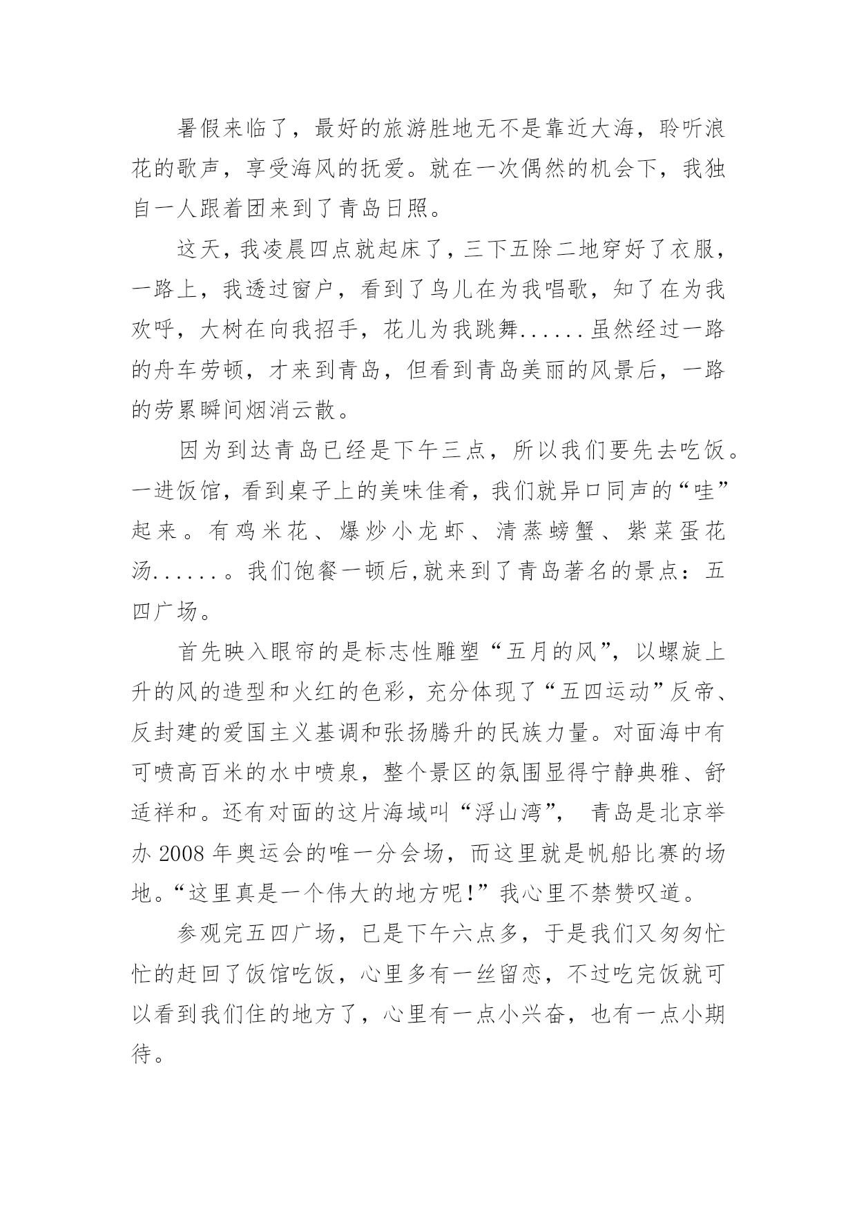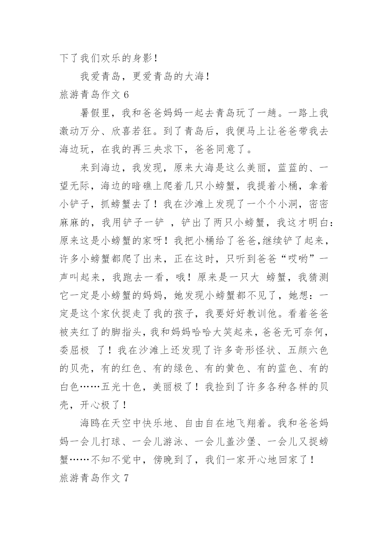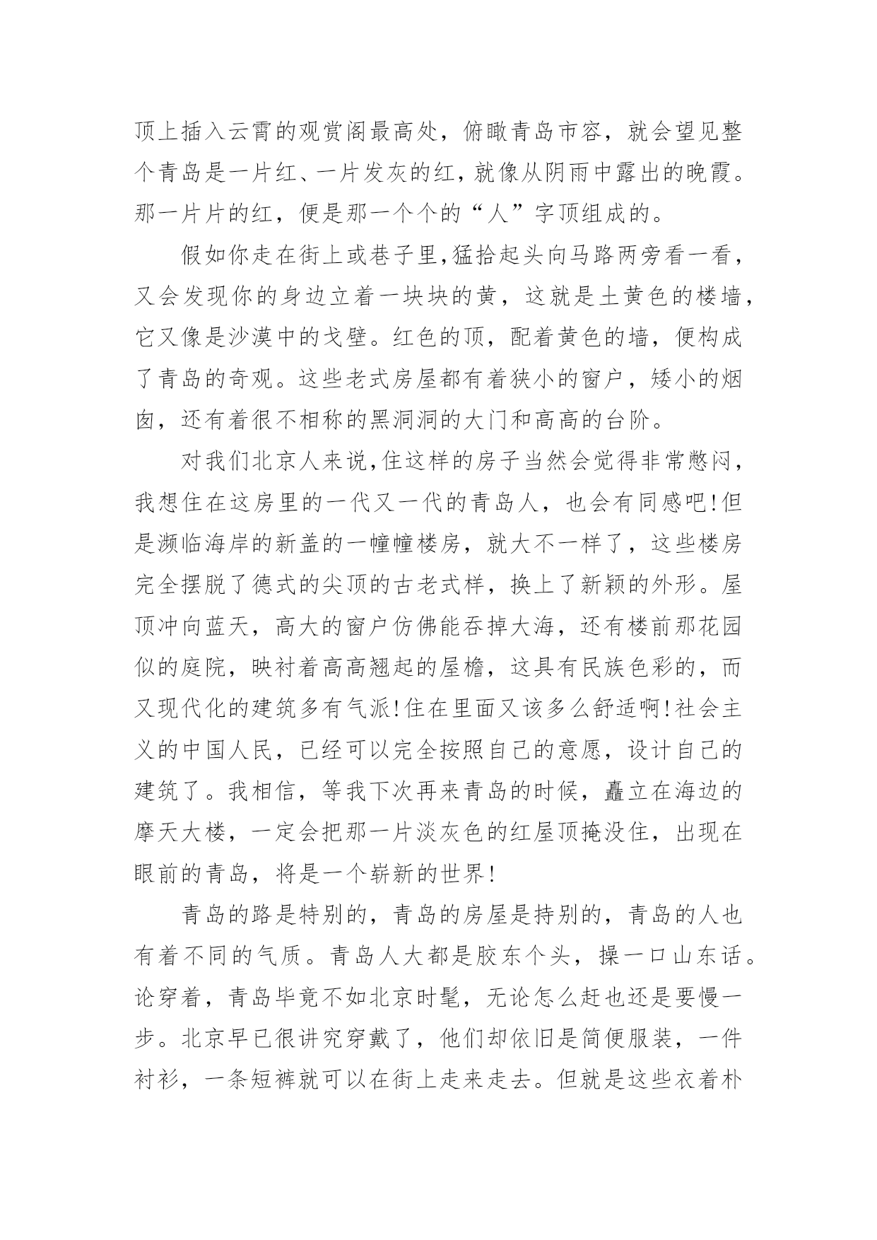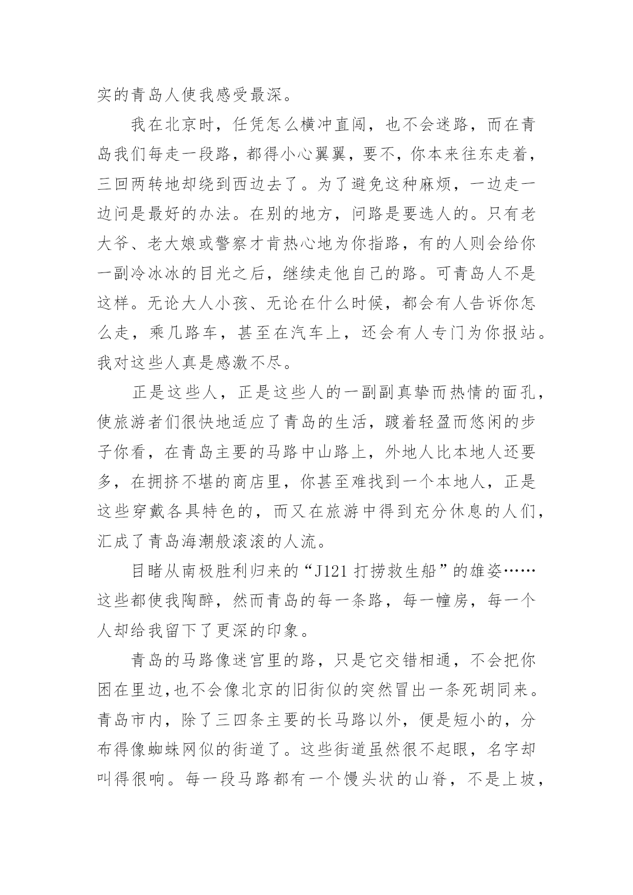 旅游青岛作文旅游青岛作文15篇在生活、工作和学习中,大家总少不了接触作文吧,作文是从内部言语向外部言语的过渡,即从经过压缩的简要的、自己能明白的语言,向开展的、具有规范语法结构的、能为他人所理解的外部语言形式的转化。那么,怎么去写作文呢?下面是小编帮大家整理的旅游青岛作文,供大家参考借鉴,希望可以帮助到有需要的朋友。旅游青岛作文1暑假我到了青岛,在碧波翻滚的海湾中畅游;在延伸到海面的栈桥上观赏“大雨落幽燕”的奇景;在出海遨游的客轮上。卷着白色的浪花向你涌来,就是看见各式小楼静卧在绿树丛中。每一个“馒头”的脊背后面都有着不同的画面。越走越想看,越看越想走,每次从海边游泳归来,我都很愿意步行一段路,以饱览沿途的风光。如果在这儿多呆几天,再厚的鞋底也会磨薄。我敢保证,经过这样一番徒步锻炼之后,再去登珠穆朗玛峰就不会感到困难了。在一条条诱人的马路两旁,便是青岛那密密麻麻的、式样奇特的房屋了。在这里德国人留下的痕迹随处可见。最明显的恐怕要算这些耸立在马路两旁的“人”字顶的楼房了。“人”字顶的楼房北京也有,可没有这里的多。登上小渔山顶上插入云霄的观赏阁最高处,俯瞰青岛市容,就会望见整个青岛是一片红、一片发灰的红,就像从阴雨中露出的晚霞。那一片片的红,便是那一个个的“人”字顶组成的。假如你走在街上或巷子里,猛拾起头向马路两旁看一看,又会发现你的身边立着一块块的黄,这就是土黄色的楼墙,它又像是沙漠中的戈壁。红色的顶,配着黄色的墙,便构成了青岛的奇观。这些老式房屋都有着狭小的窗户,矮小的烟囱,还有着很不相称的黑洞洞的大门和高高的台阶。对我们北京人来说,住这样的房子当然会觉得非常憋闷,我想住在这房里的一代又一代的青岛人,也会有同感吧!但是濒临海岸的新盖的一幢幢楼房,就大不一样了,这些楼房完全摆脱了德式的尖顶的古老式样,换上了新颖的外形。屋顶冲向蓝天,高大的窗户仿佛能吞掉大海,还有楼前那花园似的庭院,映衬着高高翘起的屋檐,这具有民族色彩的,而又现代化的建筑多有气派!住在里面又该多么舒适啊!社会主义的中国人民,已经可以完全按照自己的意愿,设计自己的建筑了。我相信,等我下次再来青岛的时候,矗立在海边的摩天大楼,一定会把那一片淡灰色的红屋顶掩没住,出现在眼前的青岛,将是一个崭新的世界!青岛的路是特别的,青岛的房屋是持别的,青岛的人也有着不同的气质。青岛人大都是胶东个头,操一口山东话。论穿着,青岛毕竟不如北京时髦,无论怎么赶也还是要慢一步。北京早已很讲究穿戴了,他们却依旧是简便服装,一件衬衫,一条短裤就可以在街上走来走去。但就是这些衣着朴实的青岛人使我感受最深。我在北京时,任凭怎么横冲直闯,也不会迷路,而在青岛我们每走一段路,都得小心翼翼,要不,你本来往东走着,三回两转地却绕到西边去了。为了避免这种麻烦,一边走一边问是最好的办法。在别的地方,问路是要选人的。只有老大爷、老大娘或警察才肯热心地为你指路,有的人则会给你一副冷冰冰的目光之后,继续走他自己的路。可青岛人不是这样。无论大人小孩、无论在什么时候,都会有人告诉你怎么走,乘几路车,甚至在汽车上,还会有人专门为你报站。我对这些人真是感激不尽。正是这些人,正是这些人的一副副真挚而热情的面孔,使旅游者们很快地适应了青岛的生活,踱着轻盈而悠闲的步子你看,在青岛主要的马路中山路上,外地人比本地人还要多,在拥挤不堪的商店里,你甚至难找到一个本地人,正是这些穿戴各具特色的,而又在旅游中得到充分休息的人们,汇成了青岛海潮般滚滚的人流。目睹从南极胜利归来的“J121打捞救生船”的雄姿……这些都使我陶醉,然而青岛的每一条路,每一幢房,每一个人却给我留下了更深的印象。青岛的马路像迷宫里的路,只是它交错相通,不会把你困在里边,也不会像北京的旧街似的突然冒出一条死胡同来。青岛市内,除了三四条主要的长马路以外,便是短小的,分布得像蜘蛛网似的街道了。这些街道虽然很不起眼,名字却叫得很响。每一段马路都有一个馒头状的山脊,不是上坡,便是下坡。上坡不难,很容易登上“馒头”的脊背,而下坡时就有趣了,不时望见蓝色的海水。记得在我们踏上归程的那一天,在青岛火车站的月台上,我快活得像一只小鸟。是呀!马上就要回家了。然而随着汽笛的长鸣,当我感到火车启动的那一瞬间,我的心中却燃起了一股留恋之情,我猛地走向窗口,目送着这座渐渐远去的海滨之城。在火车上经过一夜的颠荡,我们终于到了家,出站走了不远,前门的广告牌就跃入眼帘,四个巨大的字--“青岛啤洒”被鲜艳的底画托着,使人感到那么亲切!顿时,我仿佛又回到了青岛,仿佛又走在那曲折的小巷里,又站在那戈壁式的房檐下,又汇入了那海潮般的人流……旅游青岛作文2一天傍晚,妈妈收到了哥哥的电话。妈妈对我说:“明天我们全家和你建鑫表哥去青岛游玩。”我听了一蹦三尺高,表哥也很高兴。妈妈说:“不要高兴的太早,明天要很早起床。