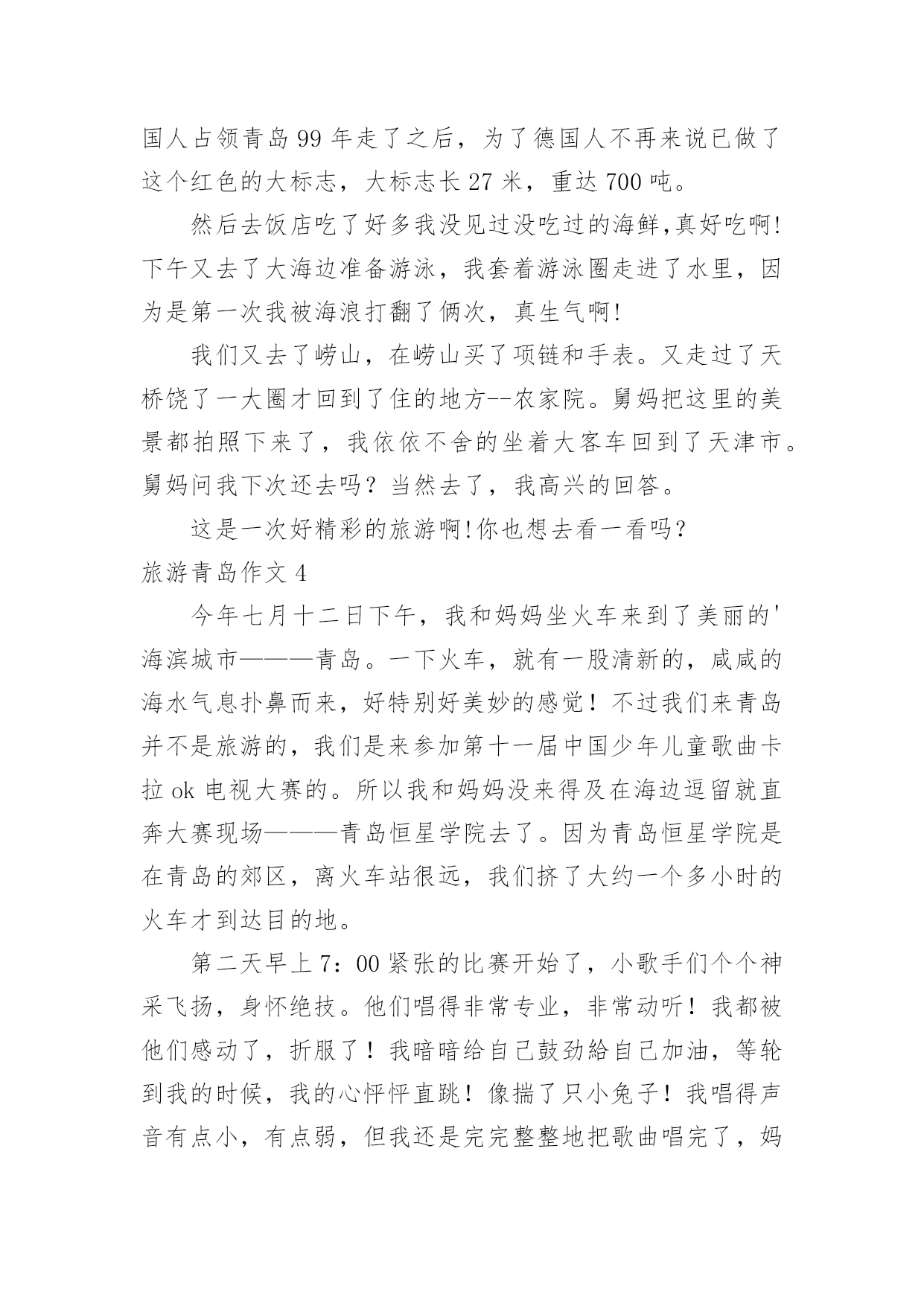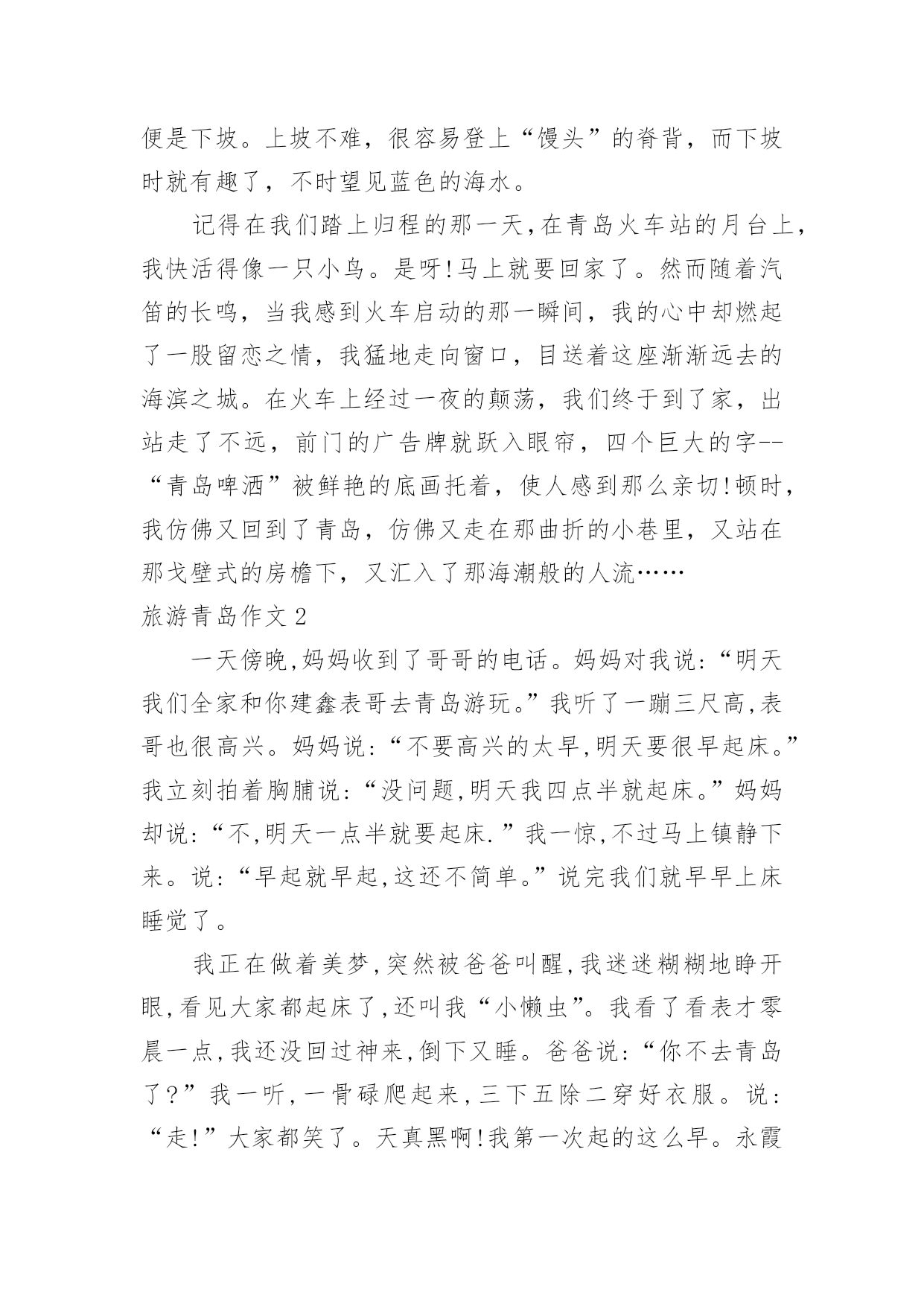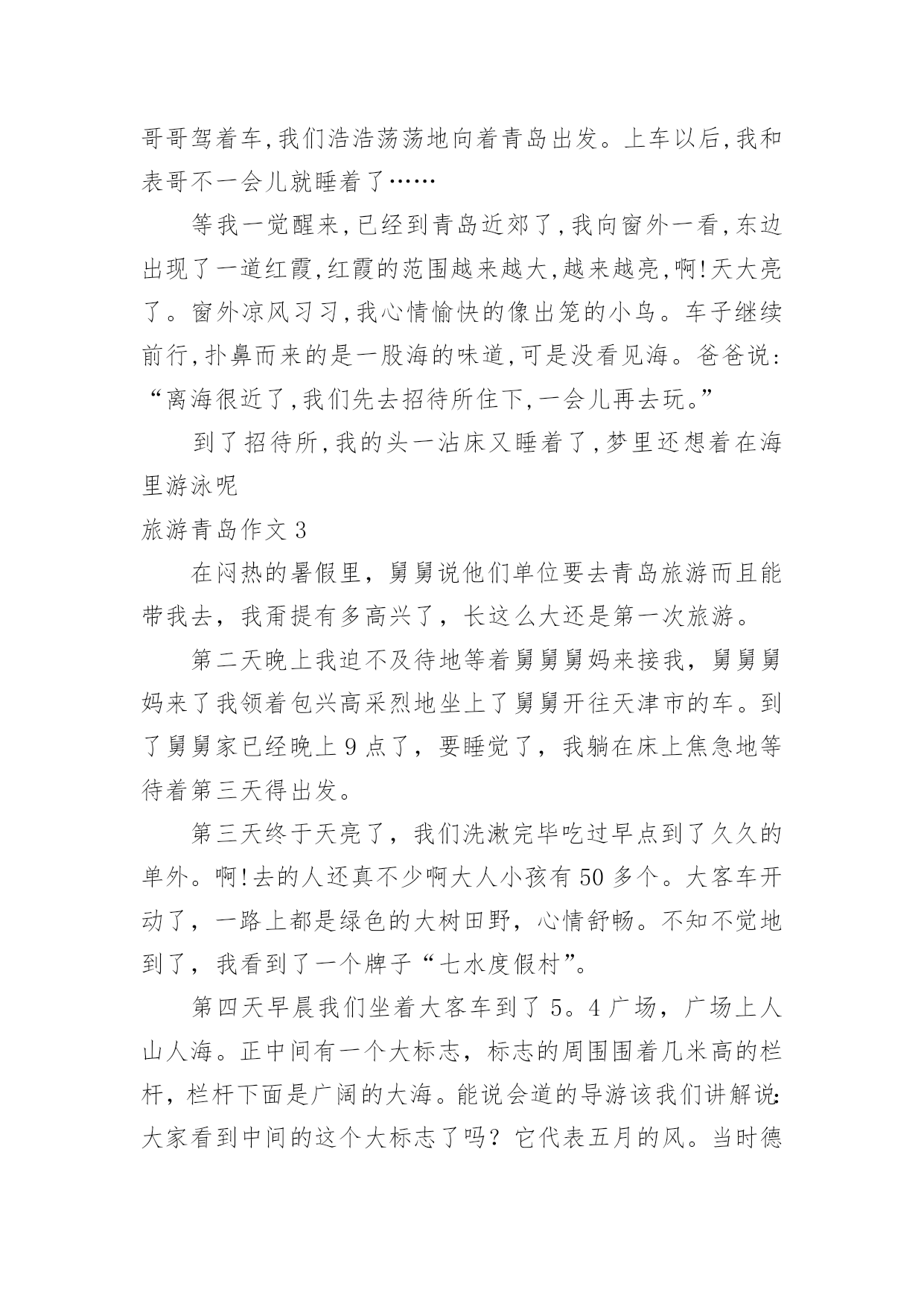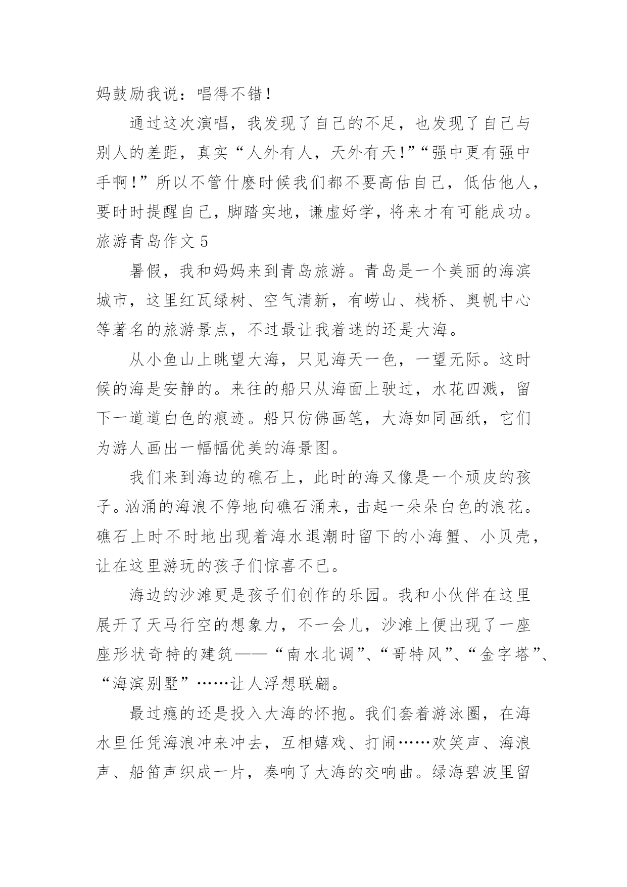 旅游青岛作文旅游青岛作文15篇在生活、工作和学习中,大家总少不了接触作文吧,作文是从内部言语向外部言语的过渡,即从经过压缩的简要的、自己能明白的语言,向开展的、具有规范语法结构的、能为他人所理解的外部语言形式的转化。那么,怎么去写作文呢?下面是小编帮大家整理的旅游青岛作文,供大家参考借鉴,希望可以帮助到有需要的朋友。旅游青岛作文1暑假我到了青岛,在碧波翻滚的海湾中畅游;在延伸到海面的栈桥上观赏“大雨落幽燕”的奇景;在出海遨游的客轮上。卷着白色的浪花向你涌来,就是看见各式小楼静卧在绿树丛中。每一个“馒头”的脊背后面都有着不同的画面。越走越想看,越看越想走,每次从海边游泳归来,我都很愿意步行一段路,以饱览沿途的风光。如果在这儿多呆几天,再厚的鞋底也会磨薄。我敢保证,经过这样一番徒步锻炼之后,再去登珠穆朗玛峰就不会感到困难了。在一条条诱人的马路两旁,便是青岛那密密麻麻的、式样奇特的房屋了。在这里德国人留下的痕迹随处可见。最明显的恐怕要算这些耸立在马路两旁的“人”字顶的楼房了。“人”字顶的楼房北京也有,可没有这里的多。登上小渔山顶上插入云霄的观赏阁最高处,俯瞰青岛市容,就会望见整个青岛是一片红、一片发灰的红,就像从阴雨中露出的晚霞。那一片片的红,便是那一个个的“人”字顶组成的。假如你走在街上或巷子里,猛拾起头向马路两旁看一看,又会发现你的身边立着一块块的黄,这就是土黄色的楼墙,它又像是沙漠中的戈壁。红色的顶,配着黄色的墙,便构成了青岛的奇观。这些老式房屋都有着狭小的窗户,矮小的烟囱,还有着很不相称的黑洞洞的大门和高高的台阶。对我们北京人来说,住这样的房子当然会觉得非常憋闷,我想住在这房里的一代又一代的青岛人,也会有同感吧!但是濒临海岸的新盖的一幢幢楼房,就大不一样了,这些楼房完全摆脱了德式的尖顶的古老式样,换上了新颖的外形。屋顶冲向蓝天,高大的窗户仿佛能吞掉大海,还有楼前那花园似的庭院,映衬着高高翘起的屋檐,这具有民族色彩的,而又现代化的建筑多有气派!住在里面又该多么舒适啊!社会主义的中国人民,已经可以完全按照自己的意愿,设计自己的建筑了。我相信,等我下次再来青岛的时候,矗立在海边的摩天大楼,一定会把那一片淡灰色的红屋顶掩没住,出现在眼前的青岛,将是一个崭新的世界!青岛的路是特别的,青岛的房屋是持别的,青岛的人也有着不同的气质。青岛人大都是胶东个头,操一口山东话。论穿着,青岛毕竟不如北京时髦,无论怎么赶也还是要慢一步。北京早已很讲究穿戴了,他们却依旧是简便服装,一件衬衫,一条短裤就可以在街上走来走去。但就是这些衣着朴实的青岛人使我感受最深。我在北京时,任凭怎么横冲直闯,也不会迷路,而在青岛我们每走一段路,都得小心翼翼,要不,你本来往东走着,三回两转地却绕到西边去了。为了避免这种麻烦,一边走一边问是最好的办法。在别的地方,问路是要选人的。只有老大爷、老大娘或警察才肯热心地为你指路,有的人则会给你一副冷冰冰的目光之后,继续走他自己的路。可青岛人不是这样。无论大人小孩、无论在什么时候,都会有人告诉你怎么走,乘几路车,甚至在汽车上,还会有人专门为你报站。我对这些人真是感激不尽。正是这些人,正是这些人的一副副真挚而热情的面孔,使旅游者们很快地适应了青岛的生活,踱着轻盈而悠闲的步子你看,在青岛主要的马路中山路上,外地人比本地人还要多,在拥挤不堪的商店里,你甚至难找到一个本地人,正是这些穿戴各具特色的,而又在旅游中得到充分休息的人们,汇成了青岛海潮般滚滚的人流。目睹从南极胜利归来的“J121打捞救生船”的雄姿……这些都使我陶醉,然而青岛的每一条路,每一幢房,每一个人却给我留下了更深的印象。青岛的马路像迷宫里的路,只是它交错相通,不会把你困在里边,也不会像北京的旧街似的突然冒出一条死胡同来。青岛市内,除了三四条主要的长马路以外,便是短小的,分布得像蜘蛛网似的街道了。这些街道虽然很不起眼,名字却叫得很响。每一段马路都有一个馒头状的山脊,不是上坡,便是下坡。上坡不难,很容易登上“馒头”的脊背,而下坡时就有趣了,不时望见蓝色的海水。记得在我们踏上归程的那一天,在青岛火车站的月台上,我快活得像一只小鸟。是呀!马上就要回家了。然而随着汽笛的长鸣,当我感到火车启动的那一瞬间,我的心中却燃起了一股留恋之情,我猛地走向窗口,目送着这座渐渐远去的海滨之城。在火车上经过一夜的颠荡,我们终于到了家,出站走了不远,前门的广告牌就跃入眼帘,四个巨大的字--“青岛啤洒”被鲜艳的底画托着,使人感到那么亲切!顿时,我仿佛又回到了青岛,仿佛又走在那曲折的小巷里,又站在那戈壁式的房檐下,又汇入了那海潮般的人流……旅游青岛作文2一天傍晚,妈妈收到了哥哥的电话。妈妈对我说:“明天我们全家和你建鑫表哥去青岛游玩。”我听了一蹦三尺高,表哥也很高兴。妈妈说:“不要高兴的太早,明天要很早起床。