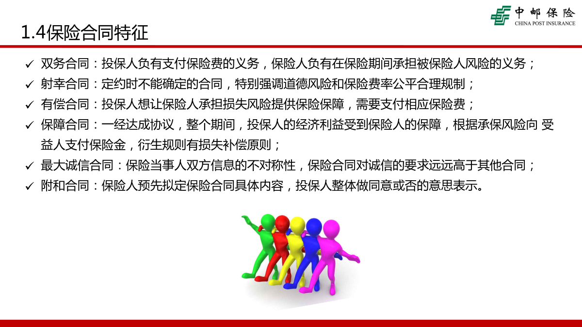 3保险合同内容是指保险合同当事人双方权利义务为核心的全部事项,保险合同主要包括下列事项:(一)保险人的名称和住所;(二)投保人、被保险人的姓名或者名称、住所,以及人身保险的受益人的姓名或者名称、住所;(三)保险标的(保险险种);(四)保险责任和责任免除;(五)保险期间和保险责任开始时间;(六)保险金额;(七)保险费以及支付办法;(八)保险金赔偿或者给付办法;(九)违约责任和争议处理;(十)订立合同的年、月、日。1.6保险合同种类2.1保险合同主体2.1保险合同主体—当事人2.1保险合同主体—关系人保险合同客体是投保人对保险标的所具有的法律上承认的利益,即保险利益,人身保险是以人的寿命和身体为保险标的的保险。保险标的是利益载体,保险标的(保险保障险种或保险计划)合同体现为:保险金额、保险条款(保险责任和责任免除、权利和义务、违约责任和争议处理)、保险期间和保险责任开始时间、订立合同的年、月、日等。182.4保险责任—人寿保险2.4保险责任—意外保险2.4保险责任—健康保险2.4保险责任—团体保险2.5保险责任免除3.1保险合同订立保险合同的成立保险合同的成立是指投保人与保险人就合同的条款达成协议。《中华人民共和国保险法》第十三条规定:“投保人提出保险要求,经保险人同意承保,保险合同成立”在实务操作中,当保险人审核投保人投保申请资料表示同意承保时,即意味着保险合同的成立,但是,保险合同的成立并不一定意味着保险责任的开始。保险合同无效是成立的保险合同不符合法律有效条件,保险合同不具有法律效力保护,导致保险合同无效的主要原因有:保险责任开始时间是指保险人开始承担保险责任的起点时间,通常某年、某月、某日、某时表示,我国保险实践中普遍推行的“零时起保制”,保险责任开始时间是保险合同成立并收费成功的次日零时或双方约定并得到认可的某一日的零时。《中华人民共和国保险法》第十四条规定:“保险合同成立后,投保人按照约定交付保险费,保险人按照约定的时间开始承担保险责任。”即保险责任开始的时间为合同成立时或由双方在保险合同中约定。在保险实务中,保险责任的开始时间可能与保险期间一致,也可能不一致,保险责任开始时间可以相对生效时间可以提前也可以延后。3.5保险合同内容变更保险合同效力变动是指保险合同生效后,并维持到效力终止整个保险期间保险合同的效力的变化,主要有合同中止、合同复效、解除合同、合同终止四种。3.6保险合同效力变动—合同中止与合同复效3.6保险合同效力变动—合同终止3.6保险合同效力变动—解除合同3.6保险合同效力变动—解除合同3.7保险合同质押4.1保险合同权利与义务4.2保险人的义务4.4投保人、被保险人和受益人的义务4.4投保人、被保险人和受益人的义务4.5投保人、被保险人和受益人的权利5.1保险合同条款的解释效力(1)文义解释原则即按照保险合同条款通常的文字含义并结合上下文解释的原则。(2)意图解释原则指必须尊重双方当事人在订约时的真实意图进行解释的原则。(3)有利于被保险人和受益人的原则,《中华人民共和国保险法》第三十条规定,保险人与投保人、被保险人或者受益人对合同条款有争议的,应当按照通常理解予以解释。对合同条款有两种以上解释的,人民法院或者仲裁机构应当作出有利于被保险人和受益人的解释。(4)批注优于正文,后批优于先批的解释原则;(5)补充解释原则,指当保险合同条款约定内容有遗漏或不完整时,借助商业习惯、国际惯例、公平原则等对保险合同的内容进行务实、合理的补充解释,以便合同的继续执行。5.3保险合同争议处理方式不可抗辩条款:超过法定时限(通常规定为2年)后,保险人将不得以投保人和被保险人在投保时违反如实告知(如误告、漏告、隐瞒某些事实)为理由,而主张保险合同无效或拒绝给付保险金,涉及有健康告知、年龄等。不丧失价值任选条款:期交寿险合同中,当投保人没有能力或不愿意继续交纳保险费时,保险单项下已经积存的责任准备金价值不丧失,投保人可以任意选择处理,方式有退保、减额交清等。自动垫交保险费条款,人寿保险合同生效满一定期限(一般为1年或2年)后,如果投保人选择自动垫交保险费,到期未交纳保险费,保险人则自动以保险单项下责任准备金垫付保险费,保险合同继续有效。对年龄误告的处理被保险人有效身份证件出生日期和保险合同不相符,处理如下:(1)被保险人真实年龄不在合同约定年龄限制范围内的,解除合同并退还保险单的现金价值;(2)被保险人真实年龄大于投保年龄,致使保险费少于应付保险费的,变更为真实年龄并补交保险费,或者在给付保险金时按照实付保险费与应付保险费的比例支付;(3)保险人真实年龄小于投保年龄,致使您支付的保险费多于应付保险费的,变更后多收的保险费退还投保人。宣告死亡处理被保险人在保险责任期间内失踪,后被人民法院宣告死