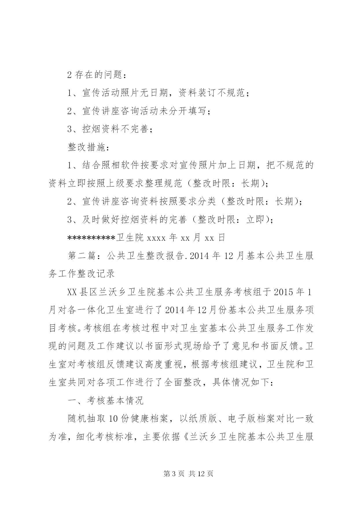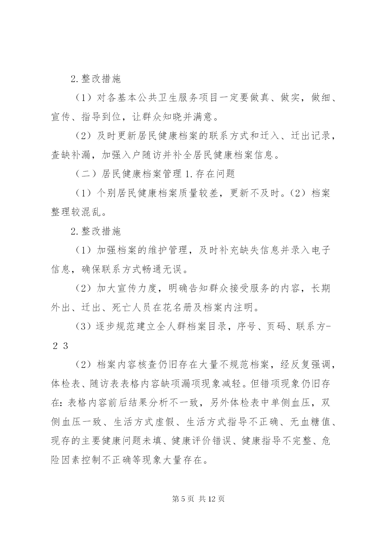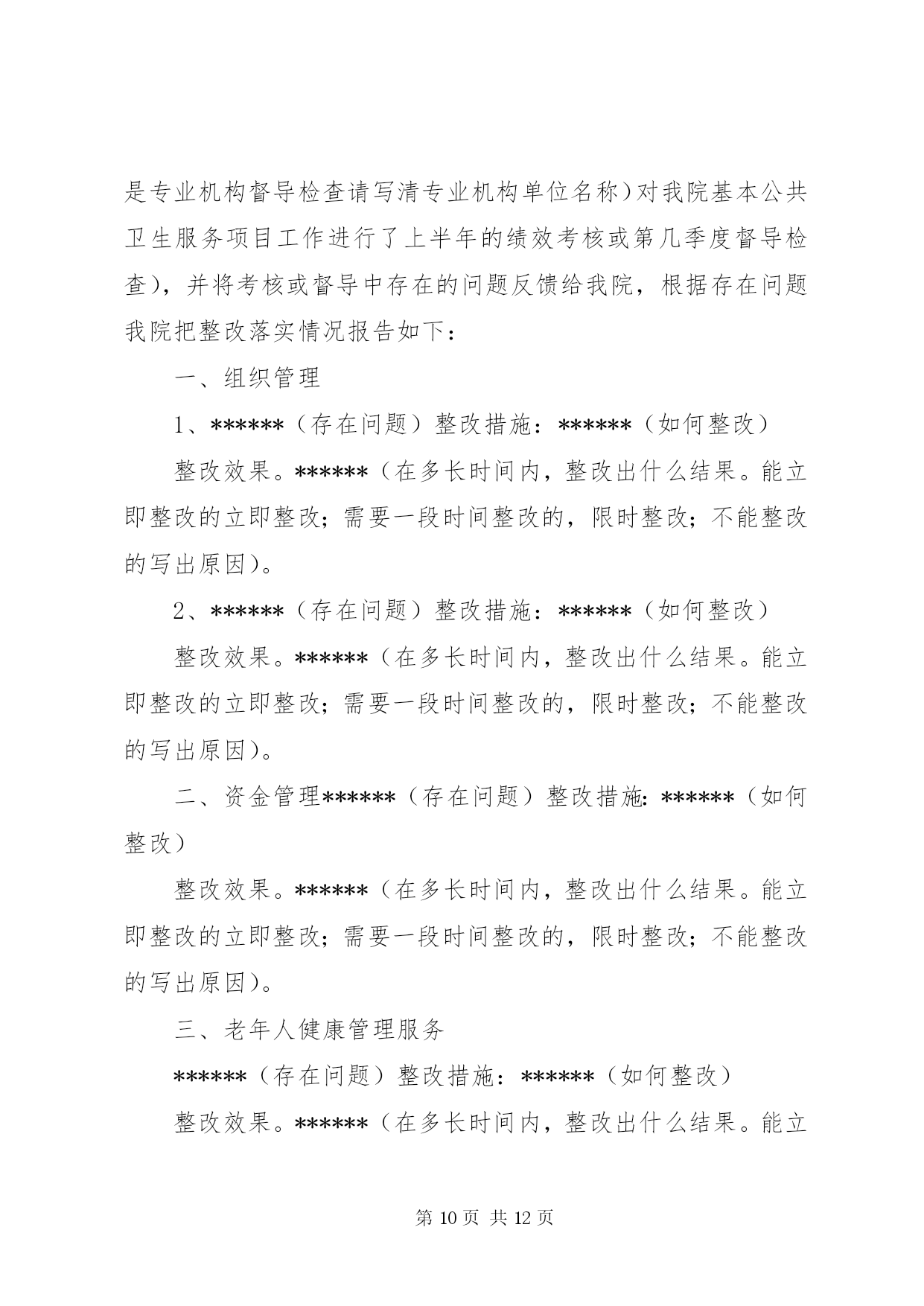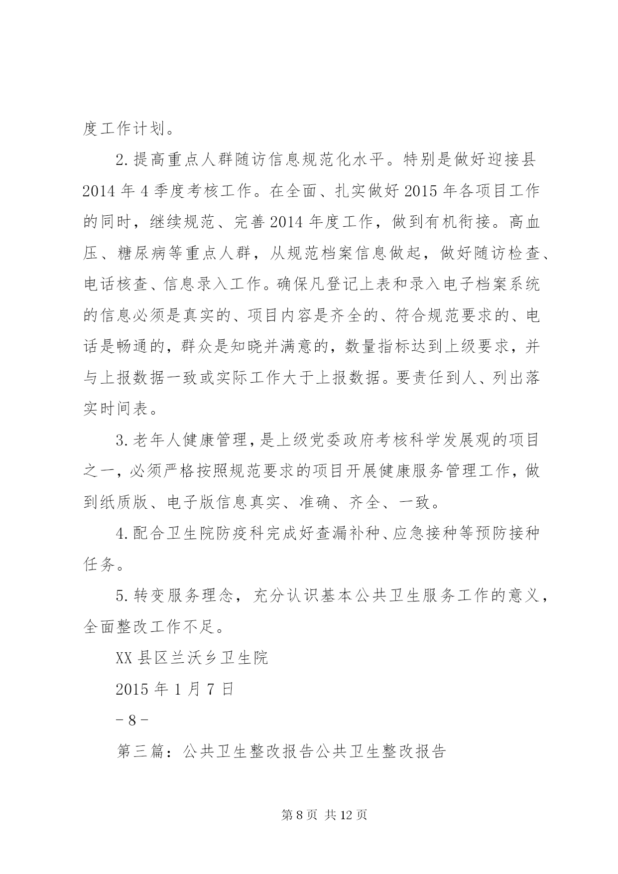 第PAGE\*Arabic\*MERGEFORMAT12页共NUMPAGES\*MERGEFORMAT12页公共卫生整改报告.20XX年.11.12xxxx年xx月xx日,卫生局领导对我院基本公共卫生做了年终检查,针对缺陷管理检查,提出了我院基本公共卫生服务项目工作中存在的问题,xxxx年xx月xx日,我院召开了全院职工大会,要求相关负责人发掘存在问题的根源,充分认识工作中存在的不足之处,并落实到今后工作中去,有效提高基本公共卫生服务工作,努力实现来年新的目标,现将我院的整改情况汇报如下:一、慢病管理存在的问题:1、传染病防治培训资料不齐;2、结核、艾滋病宣传力度不足;3、精神病管理小组文件不规范;4、高血压、糖尿病每年村级宣传次数不足6次,慢病筛查率不足,高危人群建档不规范,未按进度完成活动性肺结核和涂阳肺结核发现任务。整改措施:1、按要求进一步收集、整理、完善慢病管理相关资料,按时下乡做慢病宣传(整改时限:xxxx年xx月xx日前)。2、加强对医务人员结核病诊断标准的培训,对可疑肺结核患者进行及时转诊(整改时限:长期)。二、计免工作1存在问题:网络(小豆苗)安装软件使用率不达标。整改措施。每次接种时间做好家长宣传,加强推广。(整改时限。长期)。三、卫生执法存在问题:公共场所持证未达到80%,执法文书手写部分不足,录入时间与督导时间不一致。整改措施:加强对公共场所督导,力争2017年持证率达80%,执法文书时间不符及时整改(及时)四、妇幼工作存在的问题:1、孕产妇、儿童保健存在漏项、空项;2、“三病”项目无每季度督导记录;整改措施:1、按规范要求为孕产妇、儿童提供服务,分类整理归档,并且完善档案资料内容,不错项、不漏项(整改时限:长期);2、完善“三病”项目村级督导,并做好记录(整改时限:长期);五、健康教育2存在的问题:1、宣传活动照片无日期,资料装订不规范;2、宣传讲座咨询活动未分开填写;3、控烟资料不完善;整改措施:1、结合照相软件按要求对宣传照片加上日期,把不规范的资料立即按照上级要求整理规范(整改时限:长期);2、宣传讲座咨询资料按照要求分类(整改时限:长期);3、及时做好控烟资料的完善(整改时限:立即);**********卫生院xxxx年xx月xx日第二篇:公共卫生整改报告.2014年12月基本公共卫生服务工作整改记录XX县区兰沃乡卫生院基本公共卫生服务考核组于2015年1月对各一体化卫生室进行了2014年12月份基本公共卫生服务项目考核。考核组在考核过程中对卫生室基本公共卫生服务工作发现的问题及工作建议以书面形式现场给予了意见和书面反馈。卫生室对考核组反馈建议高度重视,根据考核组建议,卫生院和卫生室共同对各项工作进行了全面整改,具体情况如下:一、考核基本情况随机抽取10份健康档案,以纸质版、电子版档案对比一致为准,细化考核标准,主要依据《兰沃乡卫生院基本公共卫生服务项目绩效考核实施方案》。考核的数据以2014年12月基本公共卫生信息系统数据为依据,针对2014年12月基本公共卫生服务项目的进展情况,采取查阅资料、现场查看、电话访谈等形式进行较为全面的核查和评价。二、取得的成效本次考核发现,通过近期卫生院和卫生室的不懈努力,辖区基本公共卫生工作得到了进一步的提升,主要体现在以下几个方面工作:1.卫生室档案规范率大幅提高。以往由于卫生室居民健康档案、重点人群等资料填写不规范,导致电子纸质档案存在内容不对应。通过此次考核发现,卫生室全面更新了大部分健康档案,填写基本完整,不存在明显错项、漏项。2.各服务项目的工作得到规范和提高。卫生室加班加点抓落实工作,各项目工作持续得到规范和提高。3.项目知晓率和满意度得到了进一步提高。此次考核发现,通过对居民健康档案的更新维护,群众对基本公共卫生服务项目的知晓率和满意度进一步得到提高。三、考核中发现的问题(一)项目管理1.存在问题老年人查体表填写不齐全、信息反馈不及时。转档操作不规范,死亡迁出的档案处理不及时等等。2.整改措施(1)对各基本公共卫生服务项目一定要做真、做实,做细、宣传、指导到位,让群众知晓并满意。(2)及时更新居民健康档案的联系方式和迁入、迁出记录,查缺补漏,加强入户随访并补全居民健康档案信息。(二)居民健康档案管理1.存在问题(1)个别居民健康档案质量较差,更新不及时。(2)档案整理较混乱。2.整改措施(1)加强档案的维护管理,及时补充缺失信息并录入电子信息,确保联系方式畅通无误。(2)加大宣传力度,明确告知群众接受服务的内容,长期外出、迁出、死亡人员在花名册及档案内注明。(3)逐步规范建立全人群档案目录,序号、页码、联系方-23(2)档案内容核查仍旧存在大量不规范档案,经反复强调,体检表、随访表表格内容缺项漏项现象减轻。但错项现象仍