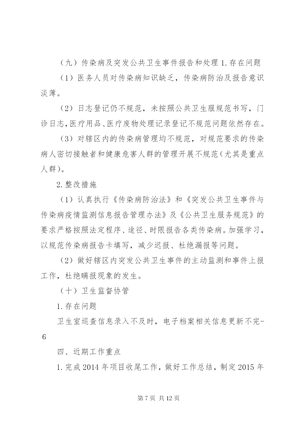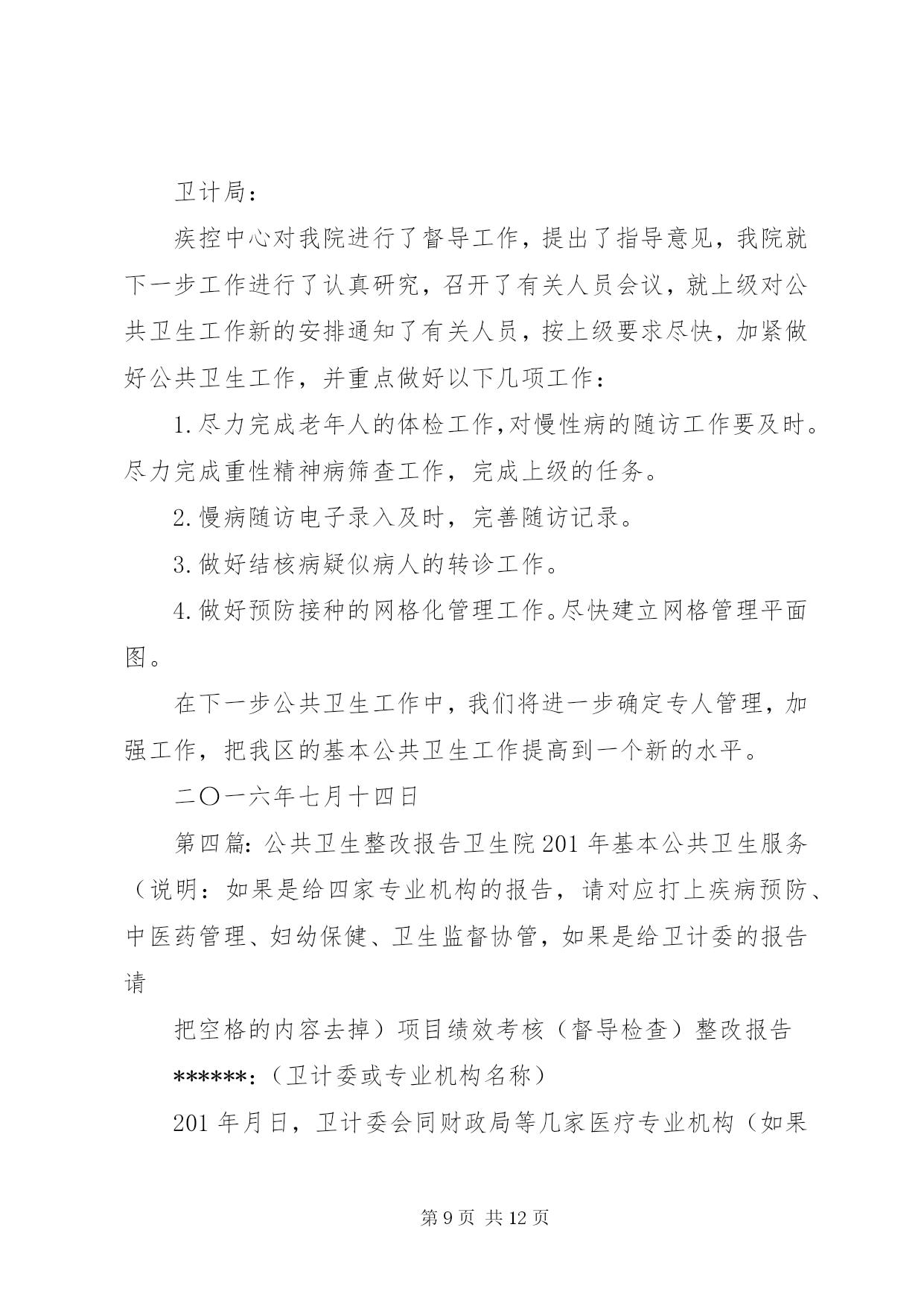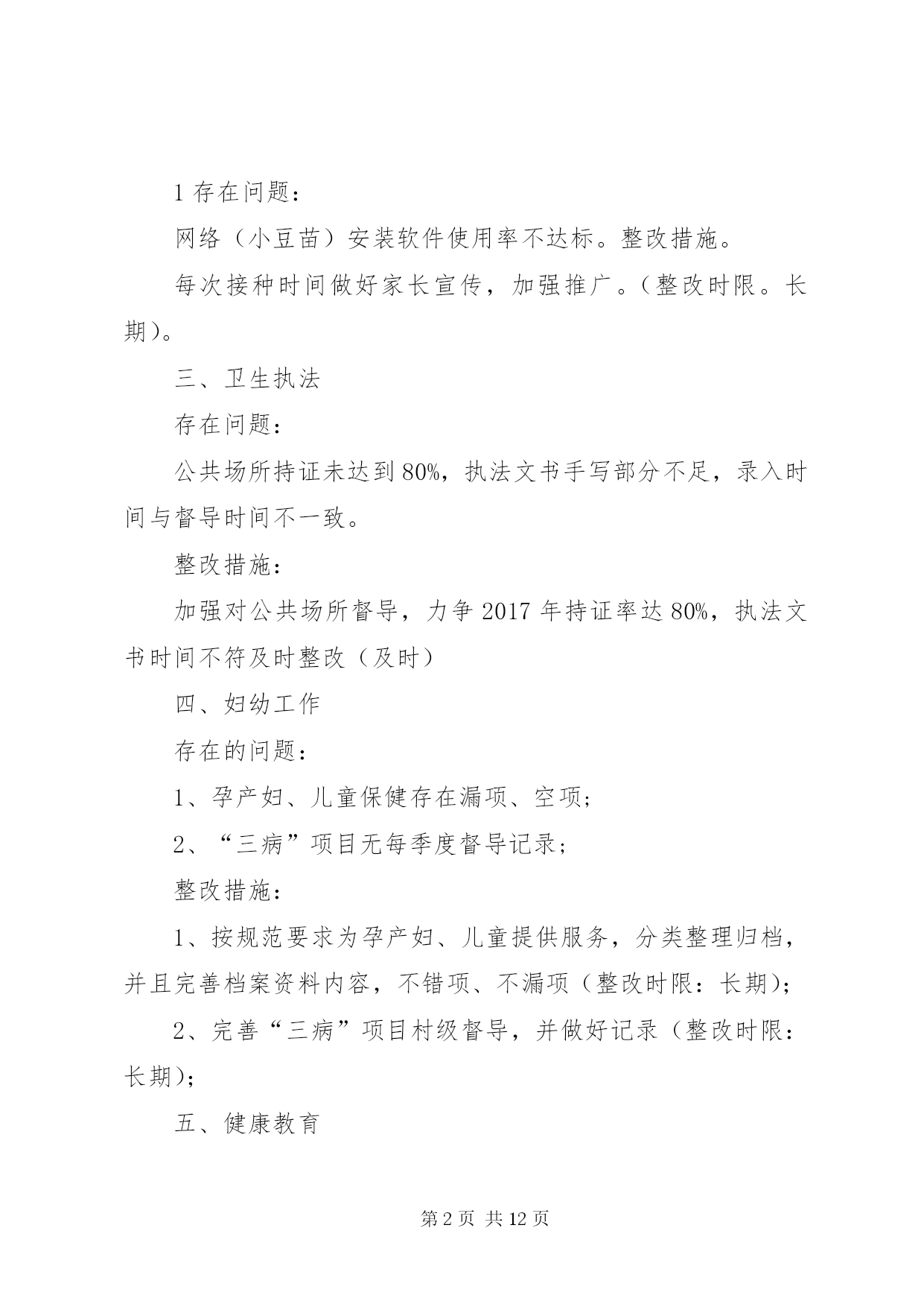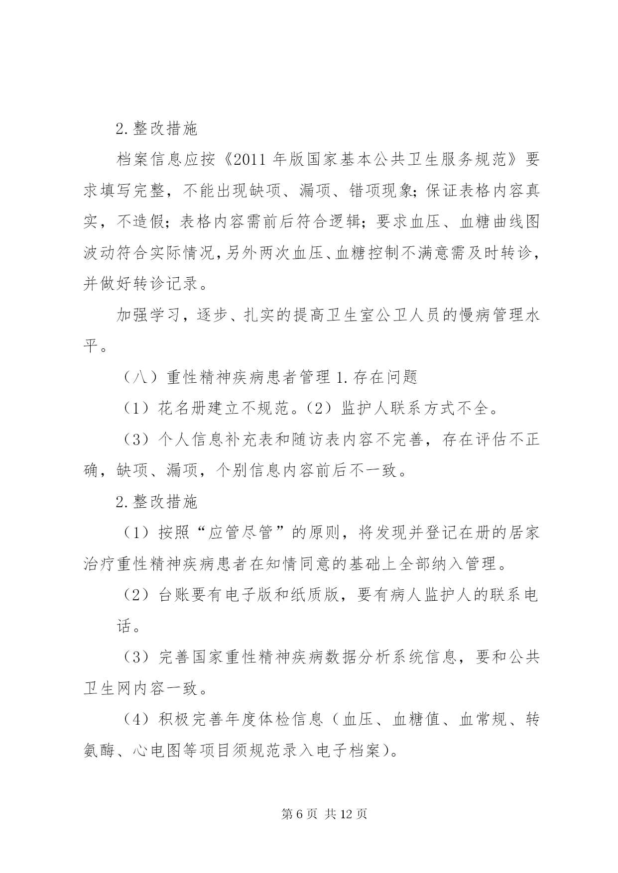 第PAGE\*Arabic\*MERGEFORMAT12页共NUMPAGES\*MERGEFORMAT12页公共卫生整改报告.20XX年.11.12xxxx年xx月xx日,卫生局领导对我院基本公共卫生做了年终检查,针对缺陷管理检查,提出了我院基本公共卫生服务项目工作中存在的问题,xxxx年xx月xx日,我院召开了全院职工大会,要求相关负责人发掘存在问题的根源,充分认识工作中存在的不足之处,并落实到今后工作中去,有效提高基本公共卫生服务工作,努力实现来年新的目标,现将我院的整改情况汇报如下:一、慢病管理存在的问题:1、传染病防治培训资料不齐;2、结核、艾滋病宣传力度不足;3、精神病管理小组文件不规范;4、高血压、糖尿病每年村级宣传次数不足6次,慢病筛查率不足,高危人群建档不规范,未按进度完成活动性肺结核和涂阳肺结核发现任务。整改措施:1、按要求进一步收集、整理、完善慢病管理相关资料,按时下乡做慢病宣传(整改时限:xxxx年xx月xx日前)。2、加强对医务人员结核病诊断标准的培训,对可疑肺结核患者进行及时转诊(整改时限:长期)。二、计免工作1存在问题:网络(小豆苗)安装软件使用率不达标。整改措施。每次接种时间做好家长宣传,加强推广。(整改时限。长期)。三、卫生执法存在问题:公共场所持证未达到80%,执法文书手写部分不足,录入时间与督导时间不一致。整改措施:加强对公共场所督导,力争2017年持证率达80%,执法文书时间不符及时整改(及时)四、妇幼工作存在的问题:1、孕产妇、儿童保健存在漏项、空项;2、“三病”项目无每季度督导记录;整改措施:1、按规范要求为孕产妇、儿童提供服务,分类整理归档,并且完善档案资料内容,不错项、不漏项(整改时限:长期);2、完善“三病”项目村级督导,并做好记录(整改时限:长期);五、健康教育2存在的问题:1、宣传活动照片无日期,资料装订不规范;2、宣传讲座咨询活动未分开填写;3、控烟资料不完善;整改措施:1、结合照相软件按要求对宣传照片加上日期,把不规范的资料立即按照上级要求整理规范(整改时限:长期);2、宣传讲座咨询资料按照要求分类(整改时限:长期);3、及时做好控烟资料的完善(整改时限:立即);**********卫生院xxxx年xx月xx日第二篇:公共卫生整改报告.2014年12月基本公共卫生服务工作整改记录XX县区兰沃乡卫生院基本公共卫生服务考核组于2015年1月对各一体化卫生室进行了2014年12月份基本公共卫生服务项目考核。考核组在考核过程中对卫生室基本公共卫生服务工作发现的问题及工作建议以书面形式现场给予了意见和书面反馈。卫生室对考核组反馈建议高度重视,根据考核组建议,卫生院和卫生室共同对各项工作进行了全面整改,具体情况如下:一、考核基本情况随机抽取10份健康档案,以纸质版、电子版档案对比一致为准,细化考核标准,主要依据《兰沃乡卫生院基本公共卫生服务项目绩效考核实施方案》。考核的数据以2014年12月基本公共卫生信息系统数据为依据,针对2014年12月基本公共卫生服务项目的进展情况,采取查阅资料、现场查看、电话访谈等形式进行较为全面的核查和评价。二、取得的成效本次考核发现,通过近期卫生院和卫生室的不懈努力,辖区基本公共卫生工作得到了进一步的提升,主要体现在以下几个方面工作:1.卫生室档案规范率大幅提高。以往由于卫生室居民健康档案、重点人群等资料填写不规范,导致电子纸质档案存在内容不对应。通过此次考核发现,卫生室全面更新了大部分健康档案,填写基本完整,不存在明显错项、漏项。2.各服务项目的工作得到规范和提高。卫生室加班加点抓落实工作,各项目工作持续得到规范和提高。3.项目知晓率和满意度得到了进一步提高。此次考核发现,通过对居民健康档案的更新维护,群众对基本公共卫生服务项目的知晓率和满意度进一步得到提高。三、考核中发现的问题(一)项目管理1.存在问题老年人查体表填写不齐全、信息反馈不及时。转档操作不规范,死亡迁出的档案处理不及时等等。2.整改措施(1)对各基本公共卫生服务项目一定要做真、做实,做细、宣传、指导到位,让群众知晓并满意。(2)及时更新居民健康档案的联系方式和迁入、迁出记录,查缺补漏,加强入户随访并补全居民健康档案信息。(二)居民健康档案管理1.存在问题(1)个别居民健康档案质量较差,更新不及时。(2)档案整理较混乱。2.整改措施(1)加强档案的维护管理,及时补充缺失信息并录入电子信息,确保联系方式畅通无误。(2)加大宣传力度,明确告知群众接受服务的内容,长期外出、迁出、死亡人员在花名册及档案内注明。(3)逐步规范建立全人群档案目录,序号、页码、联系方-23(2)档案内容核查仍旧存在大量不规范档案,经反复强调,体检表、随访表表格内容缺项漏项现象减轻。但错项现象仍