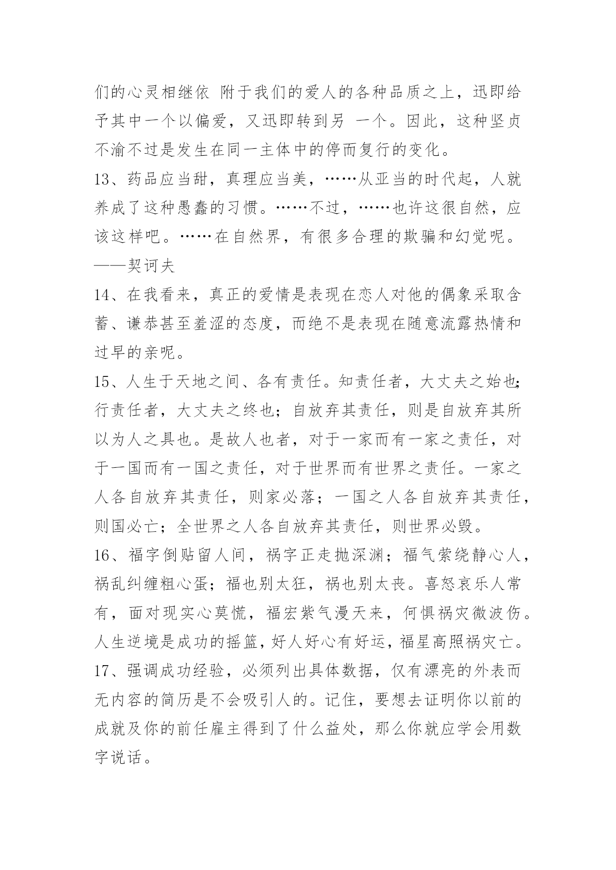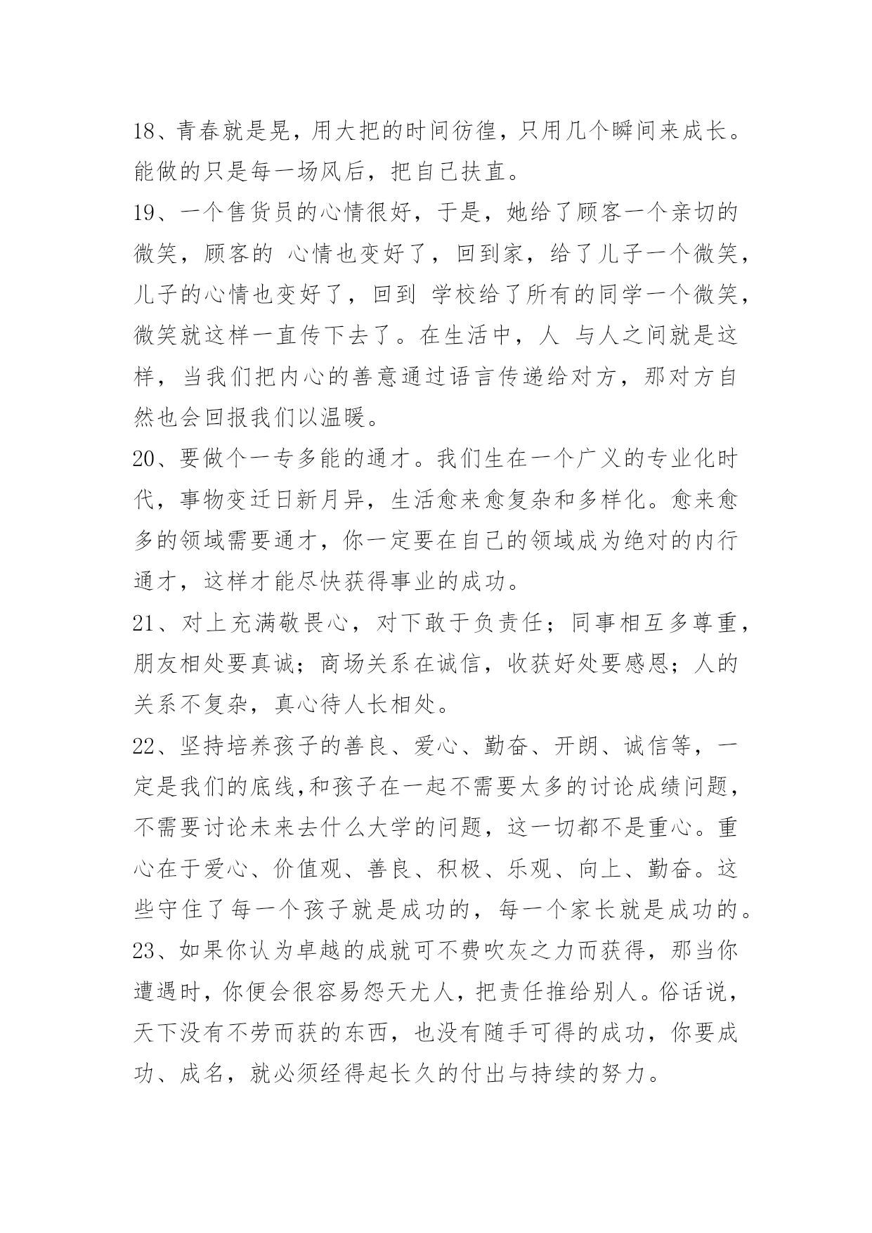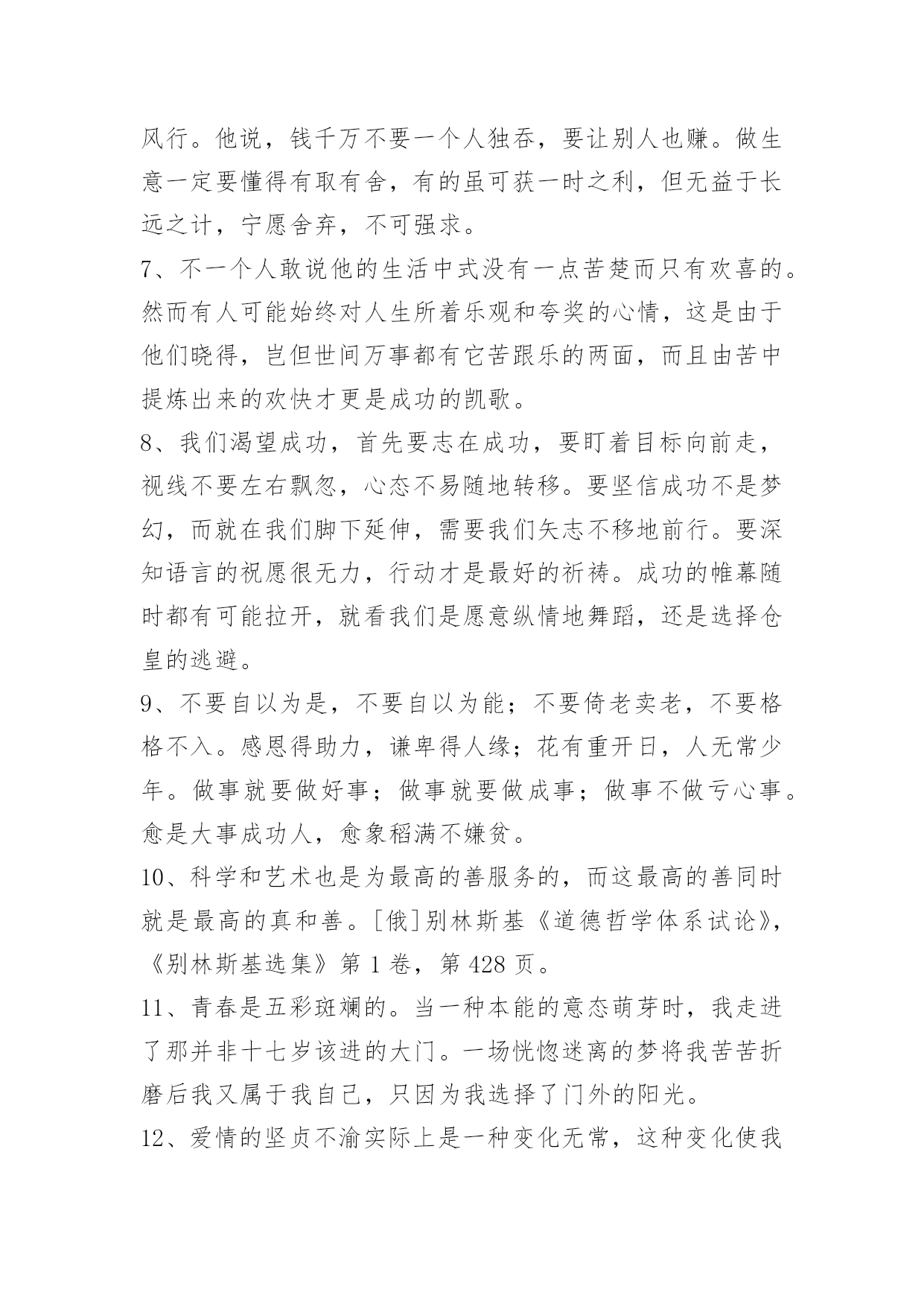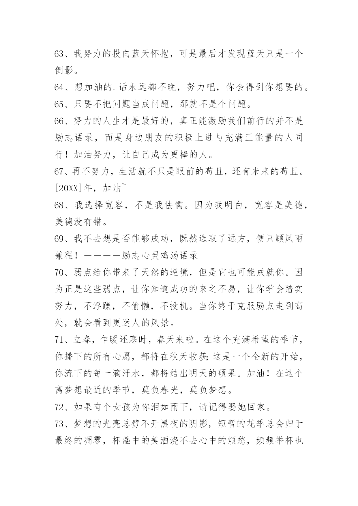 工作励志语录90条【必备】2021年工作励志语录汇编90条你知道我的理想,我知道你的追求。可惜我们只能做朋友。以下是小编整理的工作励志语录90条,欢迎大家借鉴与参考,希望对大家有所帮助。1、忍不住想要爱你的冲动,却不得不止于你看她的眼中。2、在逆境中,要看到生活的美;在希望中,别忘记不断地奋斗。3、一个成功的人,需要多方面的修养。有勇无谋难以获得成功,这样毫无目的性,只能越来越乱;有谋无勇更不行,这样再巧妙的计谋也不能得到有效的施展。勇气需要我们不断积累,最终就能战胜一切困难。4、年轻的时候,我们追求的是知识与理想。中年的时候,我们追求的是事业的成功与发展。在现实生活中,我们往往忽略了爱的存在,学会了爱,才能懂得奉献爱。在人生的道路,让我们的爱纵横驰骋吧。5、一个人要想成功,必须成为创新人才,而创造性思维是创新人才最基础的素质。心理学之父威廉·詹姆斯说过,我们这个时代最伟大的发现就是人们可以通过改变思维方式来改变自己的生活,而思维方式是一种选择,我们可以用积极的思想对待事物,也可以用消极的思想对待事物。6、我没有什么秘诀,一是做事必须勤奋;二是锲而不舍,有始有终;三是一定要有好帮手;四是待人忠厚,做事雷厉风行。他说,钱千万不要一个人独吞,要让别人也赚。做生意一定要懂得有取有舍,有的虽可获一时之利,但无益于长远之计,宁愿舍弃,不可强求。7、不一个人敢说他的生活中式没有一点苦楚而只有欢喜的。然而有人可能始终对人生所着乐观和夸奖的心情,这是由于他们晓得,岂但世间万事都有它苦跟乐的两面,而且由苦中提炼出来的欢快才更是成功的凯歌。8、我们渴望成功,首先要志在成功,要盯着目标向前走,视线不要左右飘忽,心态不易随地转移。要坚信成功不是梦幻,而就在我们脚下延伸,需要我们矢志不移地前行。要深知语言的祝愿很无力,行动才是最好的祈祷。成功的帷幕随时都有可能拉开,就看我们是愿意纵情地舞蹈,还是选择仓皇的逃避。9、不要自以为是,不要自以为能;不要倚老卖老,不要格格不入。感恩得助力,谦卑得人缘;花有重开日,人无常少年。做事就要做好事;做事就要做成事;做事不做亏心事。愈是大事成功人,愈象稻满不嫌贫。10、科学和艺术也是为最高的善服务的,而这最高的善同时就是最高的真和善。[俄]别林斯基《道德哲学体系试论》,《别林斯基选集》第1卷,。11、青春是五彩斑斓的。当一种本能的意态萌芽时,我走进了那并非十七岁该进的大门。一场恍惚迷离的梦将我苦苦折磨后我又属于我自己,只因为我选择了门外的阳光。12、爱情的坚贞不渝实际上是一种变化无常,这种变化使我们的心灵相继依附于我们的爱人的各种品质之上,迅即给予其中一个以偏爱,又迅即转到另一个。因此,这种坚贞不渝不过是发生在同一主体中的停而复行的变化。13、药品应当甜,真理应当美,……从亚当的时代起,人就养成了这种愚蠢的习惯。……不过,……也许这很自然,应该这样吧。……在自然界,有很多合理的欺骗和幻觉呢。——契诃夫14、在我看来,真正的爱情是表现在恋人对他的偶象采取含蓄、谦恭甚至羞涩的态度,而绝不是表现在随意流露热情和过早的亲呢。15、人生于天地之间、各有责任。知责任者,大丈夫之始也;行责任者,大丈夫之终也;自放弃其责任,则是自放弃其所以为人之具也。是故人也者,对于一家而有一家之责任,对于一国而有一国之责任,对于世界而有世界之责任。一家之人各自放弃其责任,则家必落;一国之人各自放弃其责任,则国必亡;全世界之人各自放弃其责任,则世界必毁。16、福字倒贴留人间,祸字正走抛深渊;福气萦绕静心人,祸乱纠缠粗心蛋;福也别太狂,祸也别太丧。喜怒哀乐人常有,面对现实心莫慌,福宏紫气漫天来,何惧祸灾微波伤。人生逆境是成功的摇篮,好人好心有好运,福星高照祸灾亡。17、强调成功经验,必须列出具体数据,仅有漂亮的外表而无内容的简历是不会吸引人的。记住,要想去证明你以前的成就及你的前任雇主得到了什么益处,那么你就应学会用数字说话。18、青春就是晃,用大把的时间彷徨,只用几个瞬间来成长。能做的只是每一场风后,把自己扶直。19、一个售货员的心情很好,于是,她给了顾客一个亲切的微笑,顾客的心情也变好了,回到家,给了儿子一个微笑,儿子的心情也变好了,回到学校给了所有的同学一个微笑,微笑就这样一直传下去了。在生活中,人与人之间就是这样,当我们把内心的善意通过语言传递给对方,那对方自然也会回报我们以温暖。20、要做个一专多能的通才。我们生在一个广义的专业化时代,事物变迁日新月异,生活愈来愈复杂和多样化。愈来愈多的领域需要通才,你一定要在自己的领域成为绝对的内行通才,这样才能尽快获得事业的成功。21、对上充满敬畏心,对下敢于负责任;同事相互多尊重,朋友相处要真诚;商场关系在诚信,收获好处要感恩;人的关系不复杂,真心待人长相处。22、坚持培养孩子的善良、爱心、勤奋、开朗