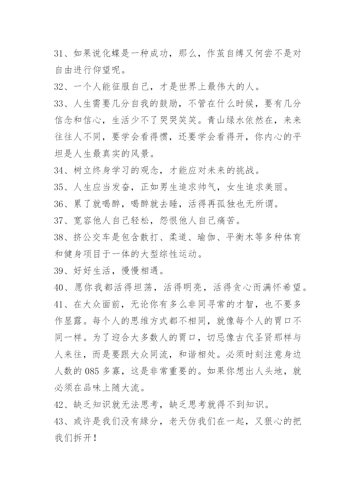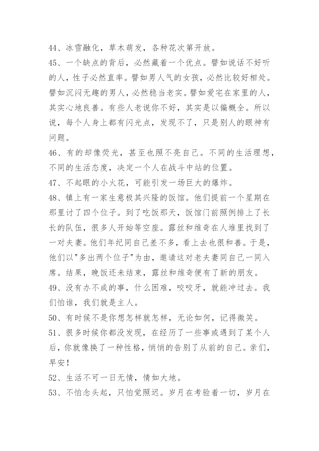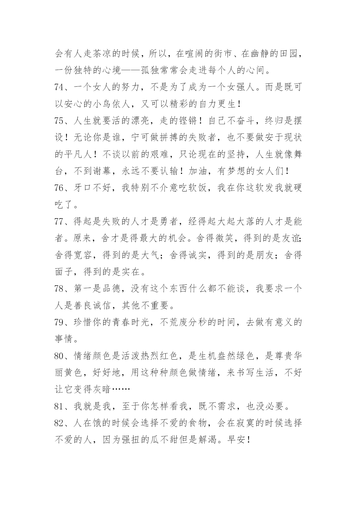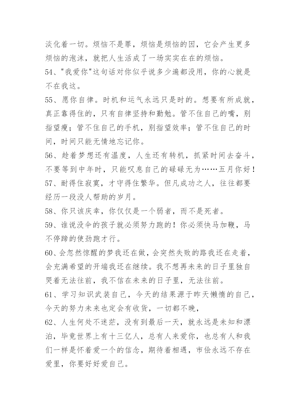工作励志语录90条【必备】2021年工作励志语录汇编90条你知道我的理想,我知道你的追求。可惜我们只能做朋友。以下是小编整理的工作励志语录90条,欢迎大家借鉴与参考,希望对大家有所帮助。1、忍不住想要爱你的冲动,却不得不止于你看她的眼中。2、在逆境中,要看到生活的美;在希望中,别忘记不断地奋斗。3、一个成功的人,需要多方面的修养。有勇无谋难以获得成功,这样毫无目的性,只能越来越乱;有谋无勇更不行,这样再巧妙的计谋也不能得到有效的施展。勇气需要我们不断积累,最终就能战胜一切困难。4、年轻的时候,我们追求的是知识与理想。中年的时候,我们追求的是事业的成功与发展。在现实生活中,我们往往忽略了爱的存在,学会了爱,才能懂得奉献爱。在人生的道路,让我们的爱纵横驰骋吧。5、一个人要想成功,必须成为创新人才,而创造性思维是创新人才最基础的素质。心理学之父威廉·詹姆斯说过,我们这个时代最伟大的发现就是人们可以通过改变思维方式来改变自己的生活,而思维方式是一种选择,我们可以用积极的思想对待事物,也可以用消极的思想对待事物。6、我没有什么秘诀,一是做事必须勤奋;二是锲而不舍,有始有终;三是一定要有好帮手;四是待人忠厚,做事雷厉风行。他说,钱千万不要一个人独吞,要让别人也赚。做生意一定要懂得有取有舍,有的虽可获一时之利,但无益于长远之计,宁愿舍弃,不可强求。7、不一个人敢说他的生活中式没有一点苦楚而只有欢喜的。然而有人可能始终对人生所着乐观和夸奖的心情,这是由于他们晓得,岂但世间万事都有它苦跟乐的两面,而且由苦中提炼出来的欢快才更是成功的凯歌。8、我们渴望成功,首先要志在成功,要盯着目标向前走,视线不要左右飘忽,心态不易随地转移。要坚信成功不是梦幻,而就在我们脚下延伸,需要我们矢志不移地前行。要深知语言的祝愿很无力,行动才是最好的祈祷。成功的帷幕随时都有可能拉开,就看我们是愿意纵情地舞蹈,还是选择仓皇的逃避。9、不要自以为是,不要自以为能;不要倚老卖老,不要格格不入。感恩得助力,谦卑得人缘;花有重开日,人无常少年。做事就要做好事;做事就要做成事;做事不做亏心事。愈是大事成功人,愈象稻满不嫌贫。10、科学和艺术也是为最高的善服务的,而这最高的善同时就是最高的真和善。[俄]别林斯基《道德哲学体系试论》,《别林斯基选集》第1卷,。11、青春是五彩斑斓的。当一种本能的意态萌芽时,我走进了那并非十七岁该进的大门。一场恍惚迷离的梦将我苦苦折磨后我又属于我自己,只因为我选择了门外的阳光。12、爱情的坚贞不渝实际上是一种变化无常,这种变化使我们的心灵相继依附于我们的爱人的各种品质之上,迅即给予其中一个以偏爱,又迅即转到另一个。因此,这种坚贞不渝不过是发生在同一主体中的停而复行的变化。13、药品应当甜,真理应当美,……从亚当的时代起,人就养成了这种愚蠢的习惯。……不过,……也许这很自然,应该这样吧。……在自然界,有很多合理的欺骗和幻觉呢。——契诃夫14、在我看来,真正的爱情是表现在恋人对他的偶象采取含蓄、谦恭甚至羞涩的态度,而绝不是表现在随意流露热情和过早的亲呢。15、人生于天地之间、各有责任。知责任者,大丈夫之始也;行责任者,大丈夫之终也;自放弃其责任,则是自放弃其所以为人之具也。是故人也者,对于一家而有一家之责任,对于一国而有一国之责任,对于世界而有世界之责任。一家之人各自放弃其责任,则家必落;一国之人各自放弃其责任,则国必亡;全世界之人各自放弃其责任,则世界必毁。16、福字倒贴留人间,祸字正走抛深渊;福气萦绕静心人,祸乱纠缠粗心蛋;福也别太狂,祸也别太丧。喜怒哀乐人常有,面对现实心莫慌,福宏紫气漫天来,何惧祸灾微波伤。人生逆境是成功的摇篮,好人好心有好运,福星高照祸灾亡。17、强调成功经验,必须列出具体数据,仅有漂亮的外表而无内容的简历是不会吸引人的。记住,要想去证明你以前的成就及你的前任雇主得到了什么益处,那么你就应学会用数字说话。18、青春就是晃,用大把的时间彷徨,只用几个瞬间来成长。能做的只是每一场风后,把自己扶直。19、一个售货员的心情很好,于是,她给了顾客一个亲切的微笑,顾客的心情也变好了,回到家,给了儿子一个微笑,儿子的心情也变好了,回到学校给了所有的同学一个微笑,微笑就这样一直传下去了。在生活中,人与人之间就是这样,当我们把内心的善意通过语言传递给对方,那对方自然也会回报我们以温暖。20、要做个一专多能的通才。我们生在一个广义的专业化时代,事物变迁日新月异,生活愈来愈复杂和多样化。愈来愈多的领域需要通才,你一定要在自己的领域成为绝对的内行通才,这样才能尽快获得事业的成功。21、对上充满敬畏心,对下敢于负责任;同事相互多尊重,朋友相处要真诚;商场关系在诚信,收获好处要感恩;人的关系不复杂,真心待人长相处。22、坚持培养孩子的善良、爱心、勤奋、开朗