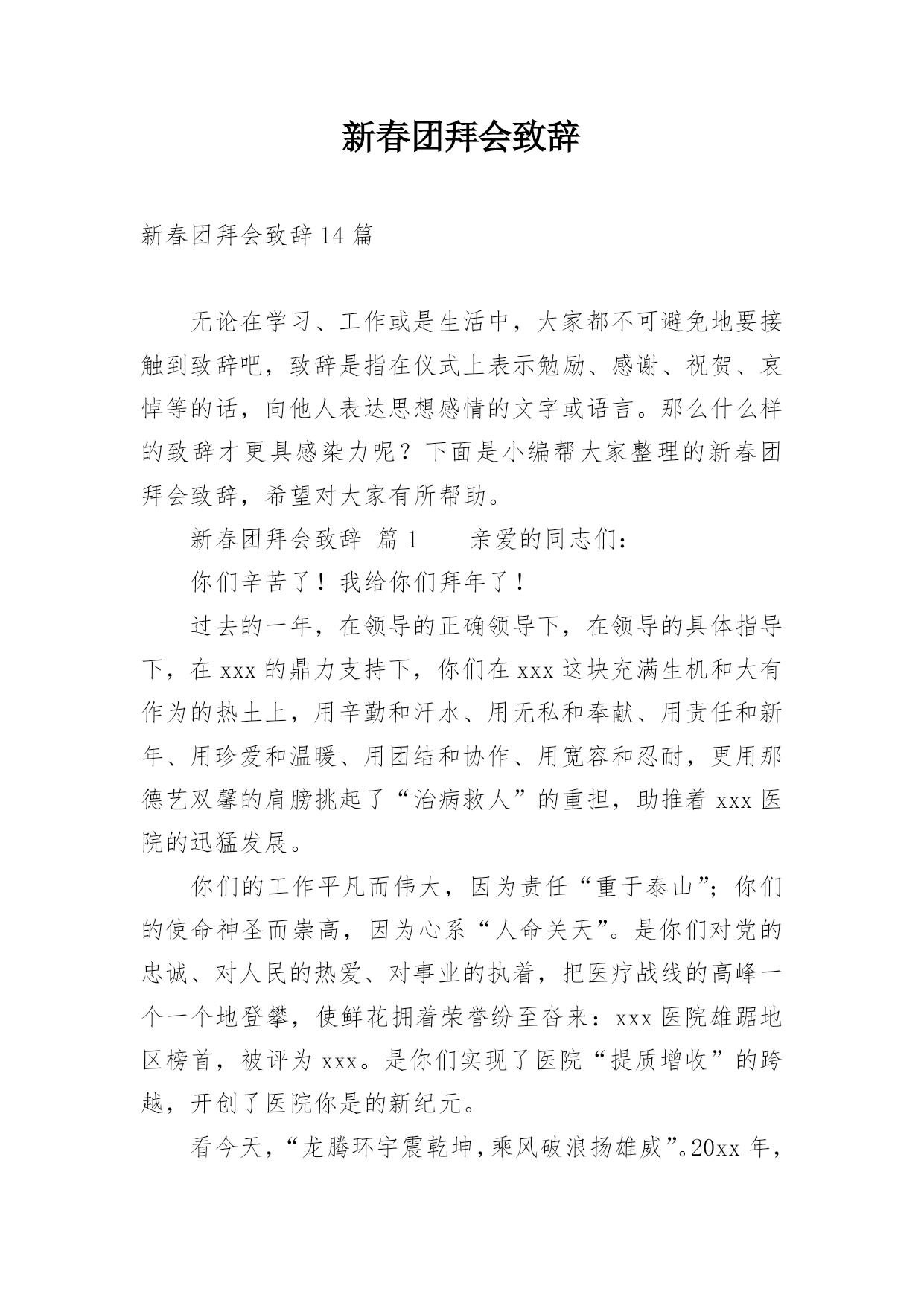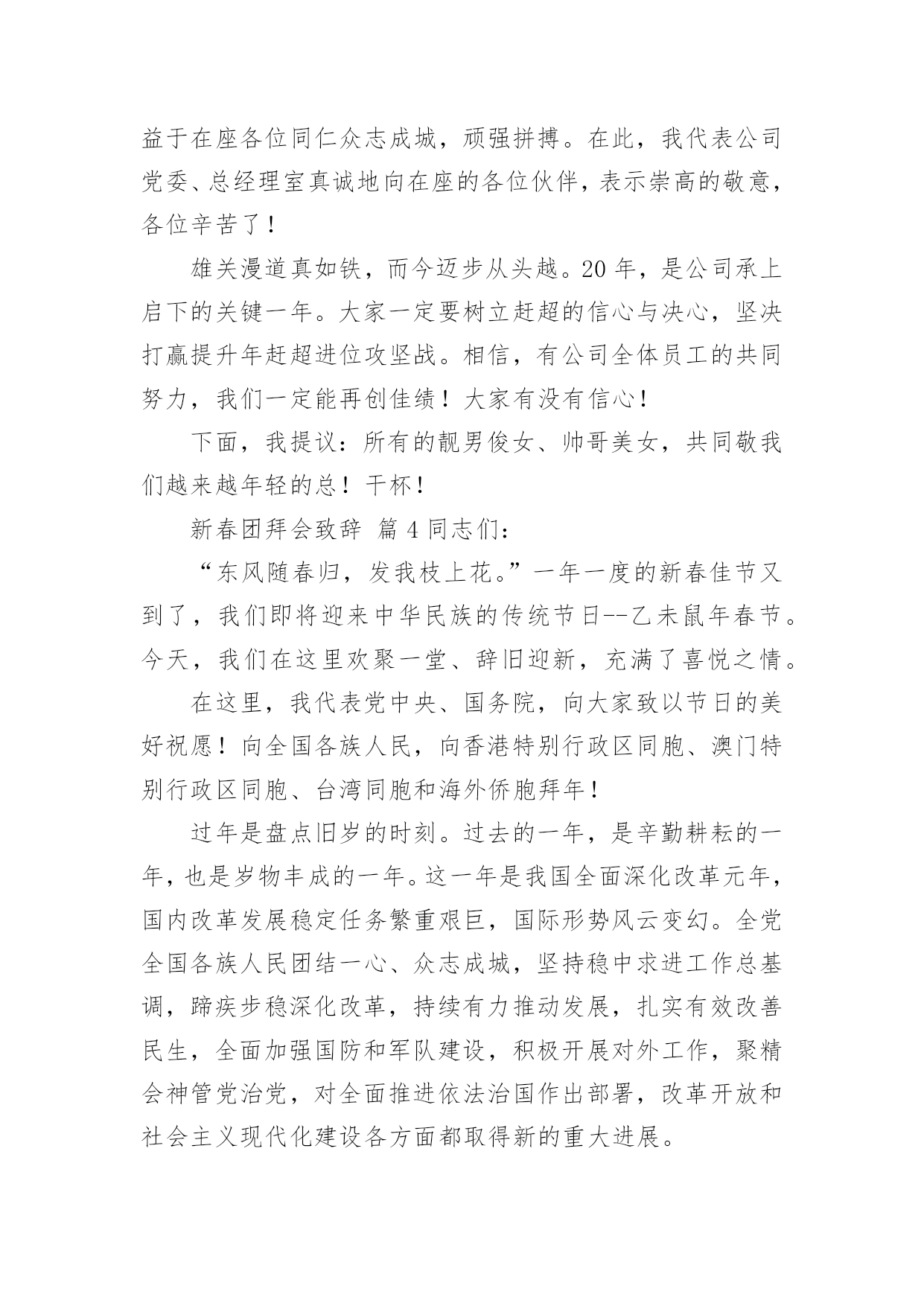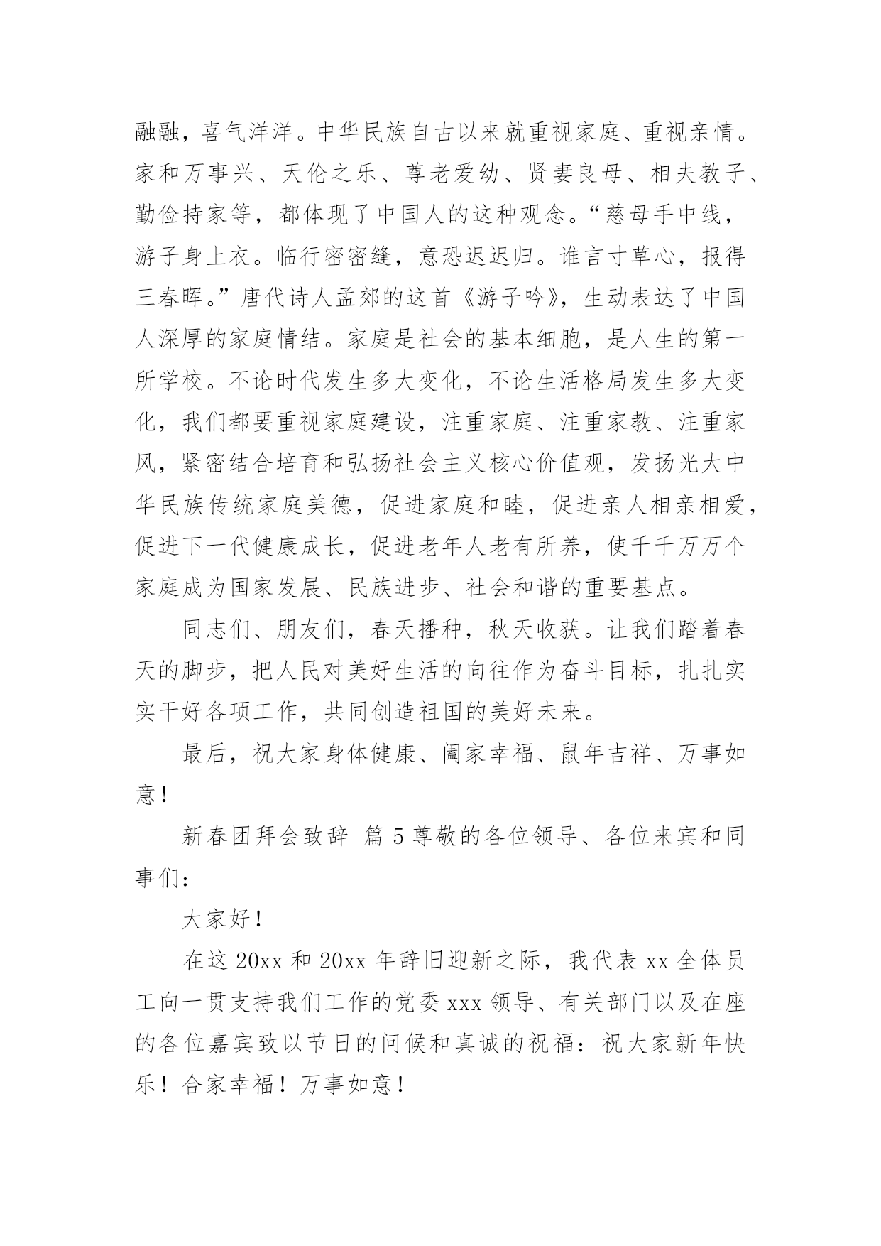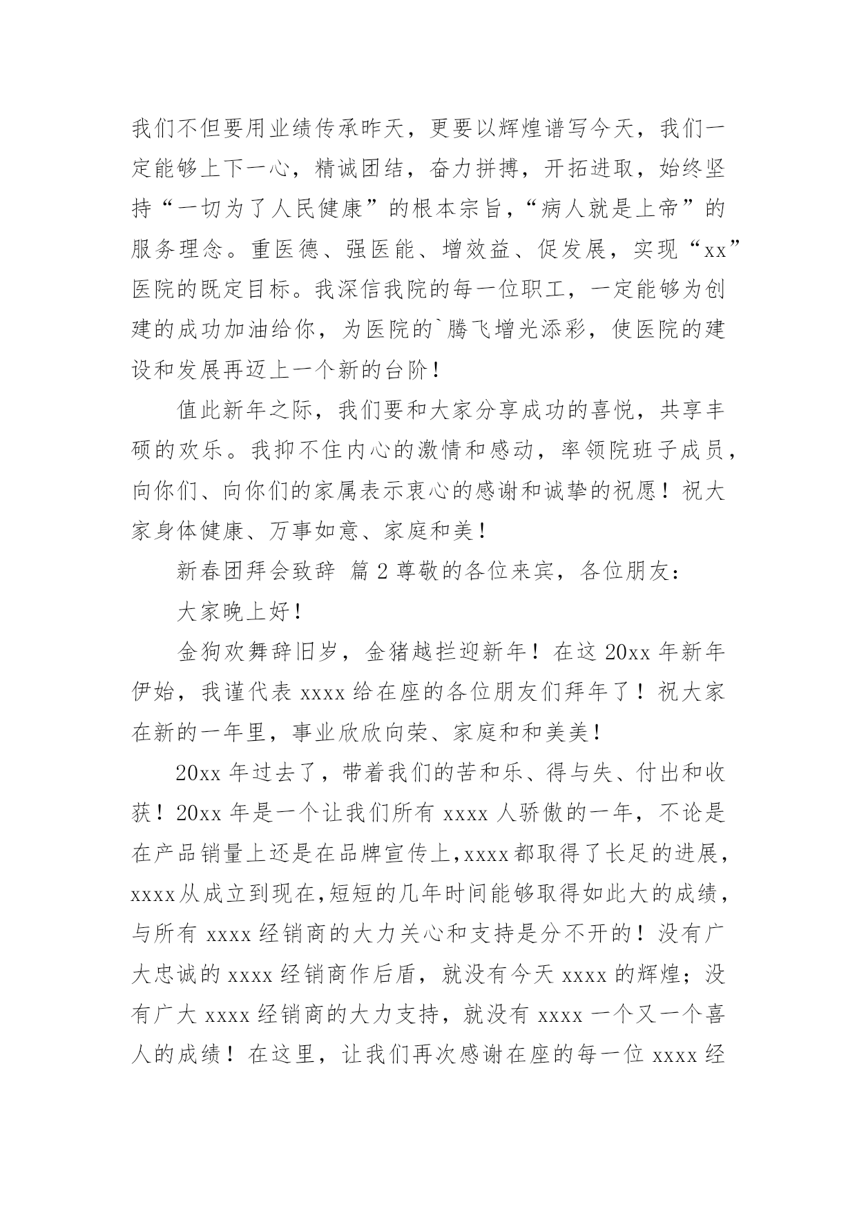 新春团拜会致辞新春团拜会致辞14篇无论在学习、工作或是生活中,大家都不可避免地要接触到致辞吧,致辞是指在仪式上表示勉励、感谢、祝贺、哀悼等的话,向他人表达思想感情的文字或语言。那么什么样的致辞才更具感染力呢?下面是小编帮大家整理的新春团拜会致辞,希望对大家有所帮助。新春团拜会致辞篇1亲爱的同志们:你们辛苦了!我给你们拜年了!过去的一年,在领导的正确领导下,在领导的具体指导下,在xxx的鼎力支持下,你们在xxx这块充满生机和大有作为的热土上,用辛勤和汗水、用无私和奉献、用责任和新年、用珍爱和温暖、用团结和协作、用宽容和忍耐,更用那德艺双馨的肩膀挑起了“治病救人”的重担,助推着xxx医院的迅猛发展。你们的工作平凡而伟大,因为责任“重于泰山”;你们的使命神圣而崇高,因为心系“人命关天”。是你们对党的忠诚、对人民的热爱、对事业的执着,把医疗战线的高峰一个一个地登攀,使鲜花拥着荣誉纷至沓来:xxx医院雄踞地区榜首,被评为xxx。是你们实现了医院“提质增收”的跨越,开创了医院你是的新纪元。看今天,“龙腾环宇震乾坤,乘风破浪扬雄威”。20xx年,我们不但要用业绩传承昨天,更要以辉煌谱写今天,我们一定能够上下一心,精诚团结,奋力拼搏,开拓进取,始终坚持“一切为了人民健康”的根本宗旨,“病人就是上帝”的服务理念。重医德、强医能、增效益、促发展,实现“xx”医院的既定目标。我深信我院的每一位职工,一定能够为创建的成功加油给你,为医院的`腾飞增光添彩,使医院的建设和发展再迈上一个新的台阶!值此新年之际,我们要和大家分享成功的喜悦,共享丰硕的欢乐。我抑不住内心的激情和感动,率领院班子成员,向你们、向你们的家属表示衷心的感谢和诚挚的祝愿!祝大家身体健康、万事如意、家庭和美!新春团拜会致辞篇2尊敬的各位来宾,各位朋友:大家晚上好!金狗欢舞辞旧岁,金猪越拦迎新年!在这20xx年新年伊始,我谨代表xxxx给在座的各位朋友们拜年了!祝大家在新的一年里,事业欣欣向荣、家庭和和美美!20xx年过去了,带着我们的苦和乐、得与失、付出和收获!20xx年是一个让我们所有xxxx人骄傲的一年,不论是在产品销量上还是在品牌宣传上,xxxx都取得了长足的进展,xxxx从成立到现在,短短的几年时间能够取得如此大的成绩,与所有xxxx经销商的大力关心和支持是分不开的!没有广大忠诚的xxxx经销商作后盾,就没有今天xxxx的辉煌;没有广大xxxx经销商的大力支持,就没有xxxx一个又一个喜人的成绩!在这里,让我们再次感谢在座的每一位xxxx经销商为xxxx所付出的点点滴滴,感谢您们为xxxx的无私奉献!xxxx是一个大集体,它融汇了大家的智慧;xxxx是一个大家庭,它凝聚了众人的`力量,我们相信,在我们大家的共同努力下,在我们不懈的追求和创新下,xxxx一定会:乘东风,破巨浪,展鸿途,创佳绩!20xx年正向我们走来,她朝气蓬勃,她生机盎然,她处处暗示着我们xxxx又将有一个崭新的春天!好年头有好气象,好气象就有好收成!最后,我祝大家,在崭新的20xx年:财源滚滚来,好运连连到!谢谢大家!新春团拜会致辞篇3尊敬的、各位优秀的伙伴:大家晚上好!风雨送春归,飞雪迎春到。在春天的脚步越来越近之时,利用周末召开了公司20年工作会议。今天的会议开的很成功,参会的人员都是各经营单位团队长以上人员和内勤骨干人员,是我们市公司现在和未来发展的'栋梁。借此机会,公司党委、总经理室隆重举行晚宴,邀请大家齐聚一堂,回顾20年取得的辉煌成绩,畅谈公司20年业务发展的雄伟蓝图。回想刚刚过去的一年,对公司来说确实是非常不平凡的一年。在总的带领下,业务突破一个亿,提前一年实现了累计盈利,各项关键指标居于全省前列,为上级公司达成10个亿做出了特殊贡献。这些成绩的取得,主要得益于上级公司以x总为首党委的英明决策,得益于总的正确领导,更得益于在座各位同仁众志成城,顽强拼搏。在此,我代表公司党委、总经理室真诚地向在座的各位伙伴,表示崇高的敬意,各位辛苦了!雄关漫道真如铁,而今迈步从头越。20年,是公司承上启下的关键一年。大家一定要树立赶超的信心与决心,坚决打赢提升年赶超进位攻坚战。相信,有公司全体员工的共同努力,我们一定能再创佳绩!大家有没有信心!下面,我提议:所有的靓男俊女、帅哥美女,共同敬我们越来越年轻的总!干杯!新春团拜会致辞篇4同志们:“东风随春归,发我枝上花。”一年一度的新春佳节又到了,我们即将迎来中华民族的传统节日--乙未鼠年春节。今天,我们在这里欢聚一堂、辞旧迎新,充满了喜悦之情。在这里,我代表党中央、国务院,向大家致以节日的美好祝愿!向全国各族人民,向香港特别行政区同胞、澳门特别行政区同胞、台湾同胞和海外侨胞拜年!过年是盘点旧岁的时刻。过去的一年,是辛勤耕耘的一年,也是岁物丰成的一年。这一年是我国全面