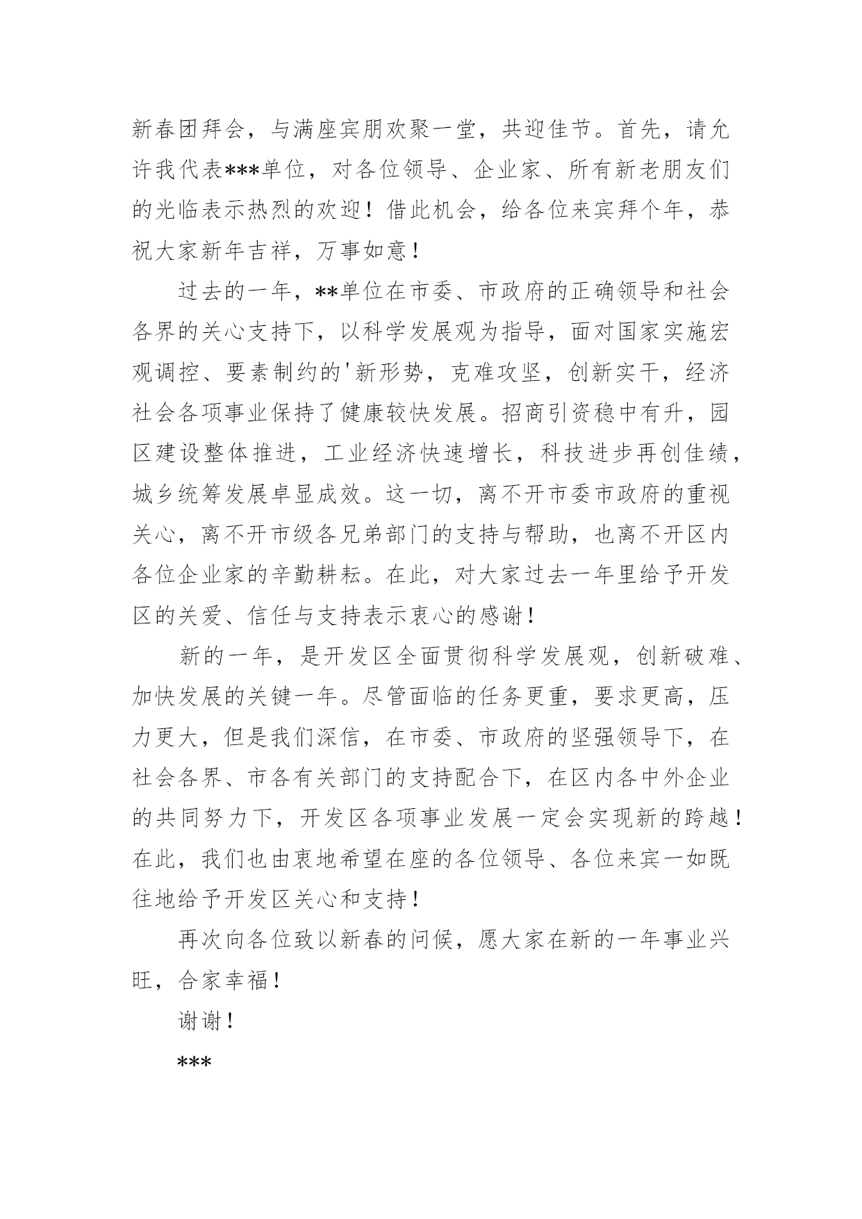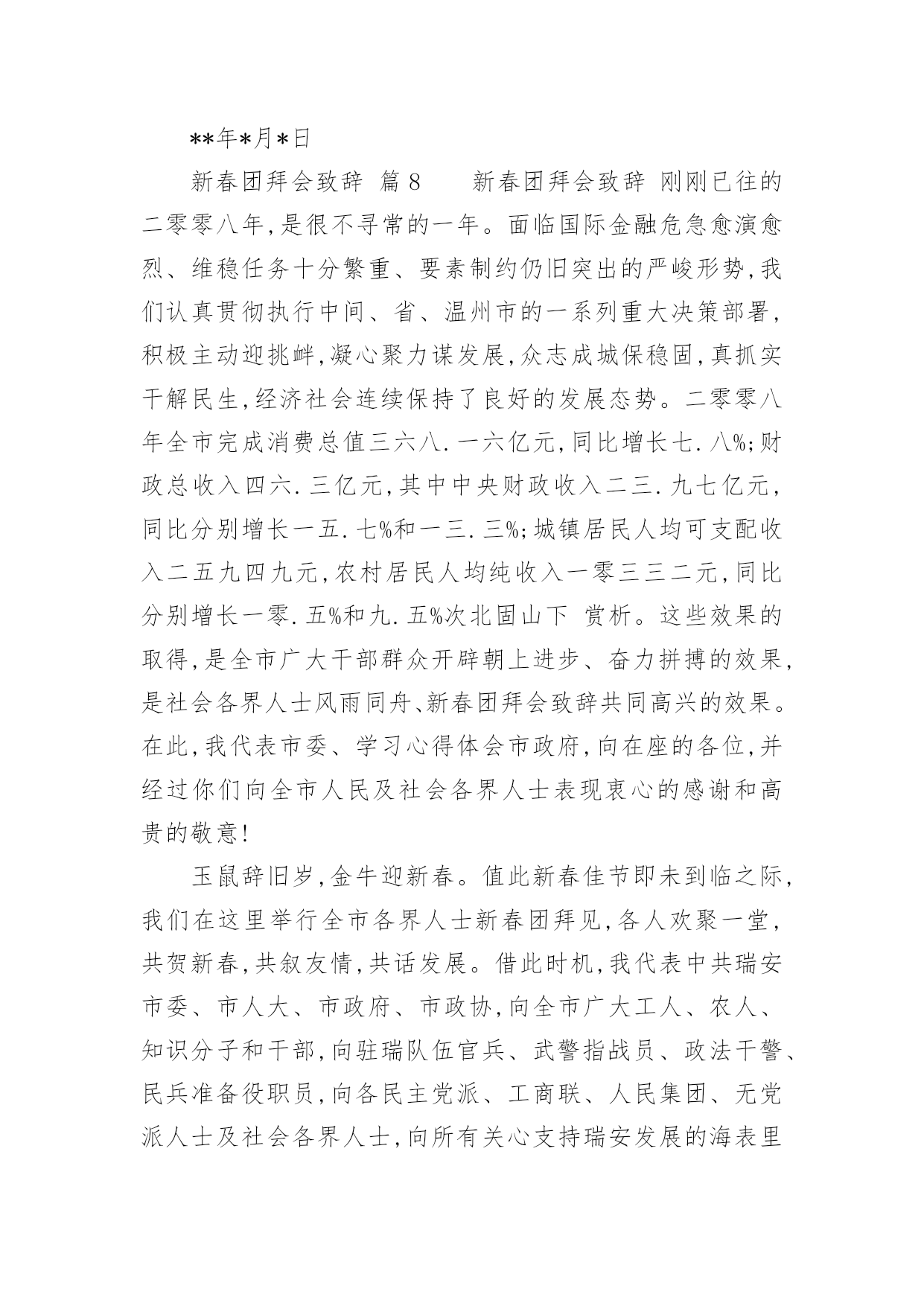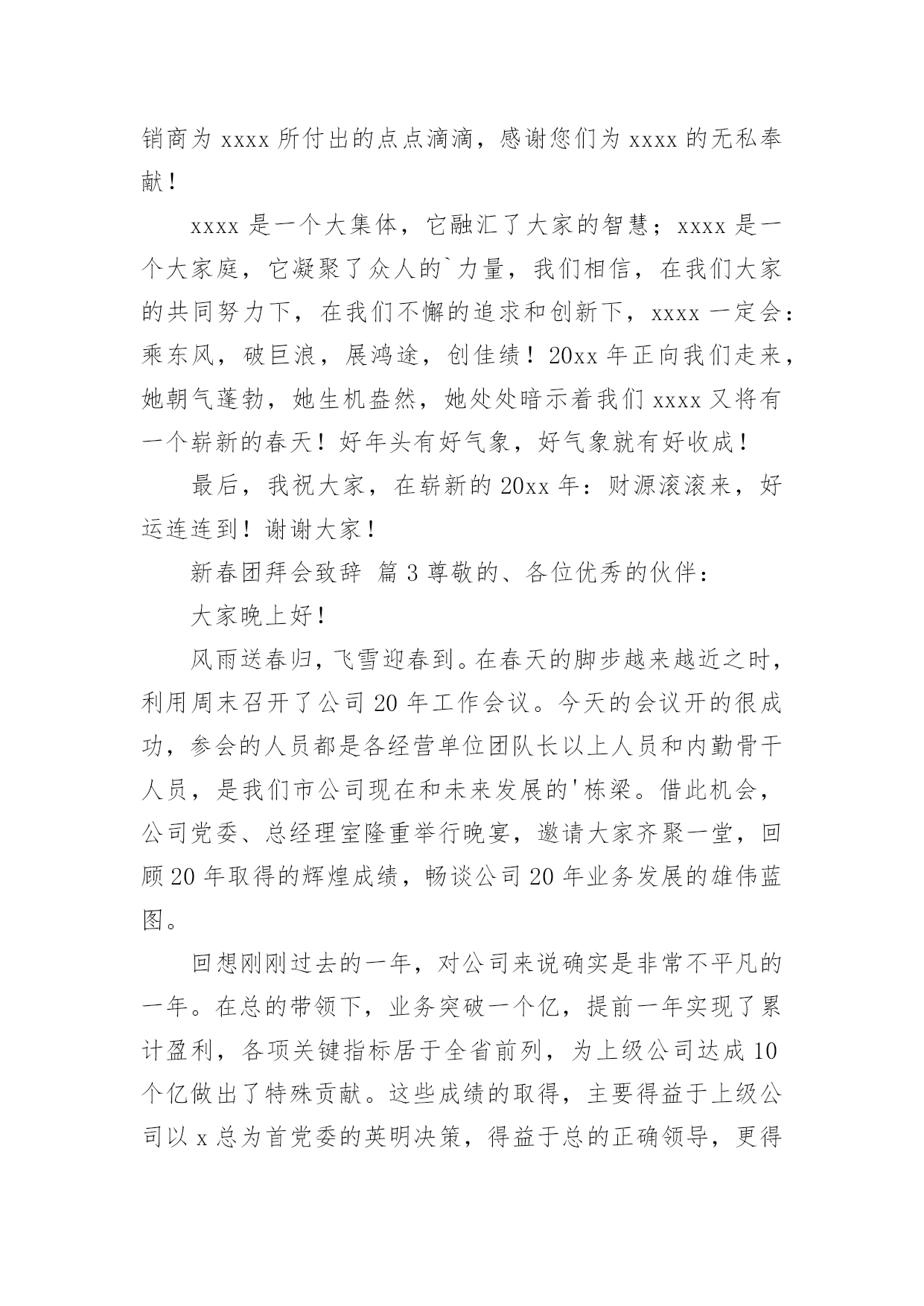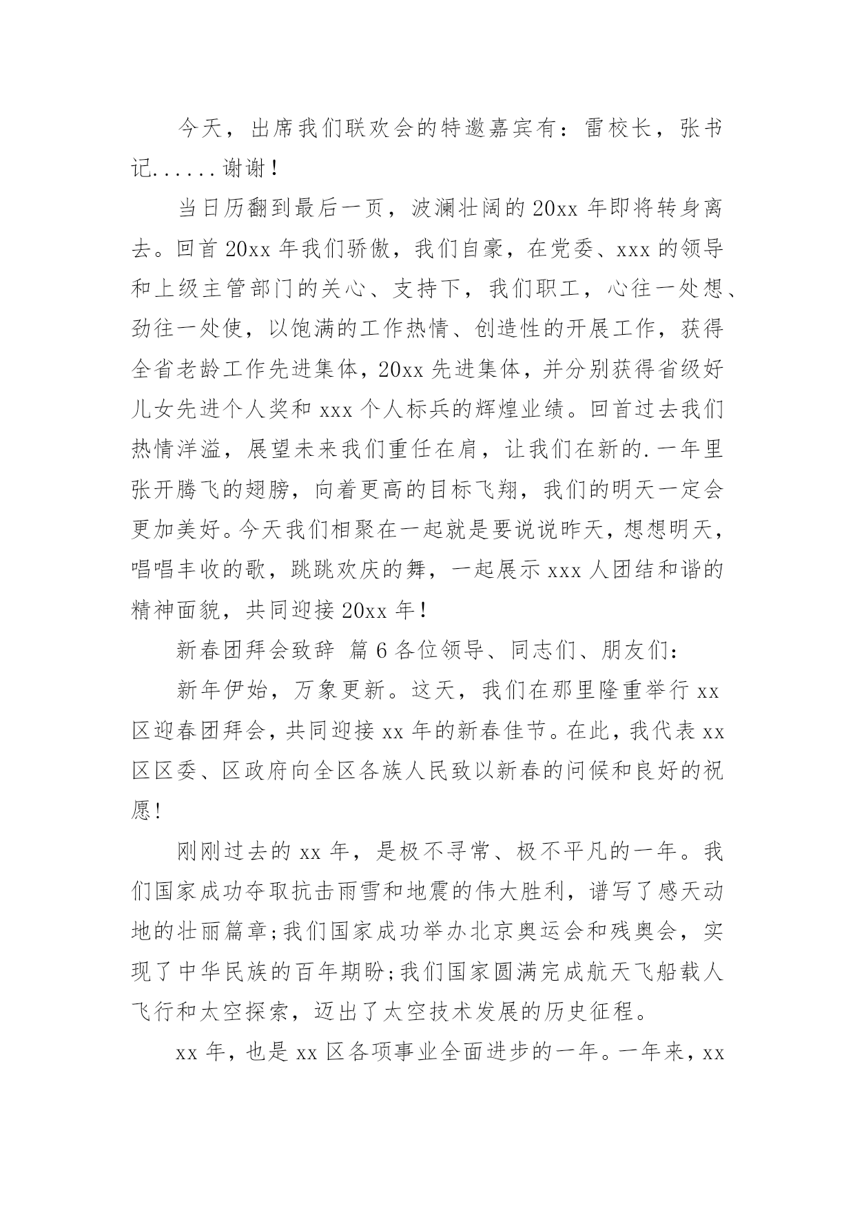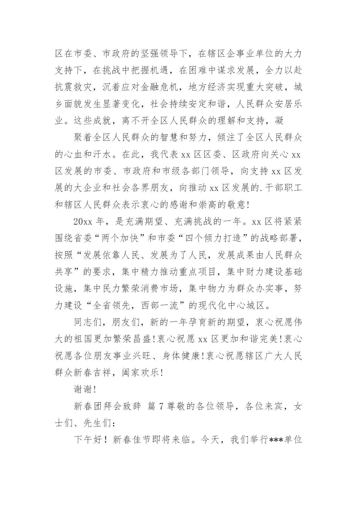 新春团拜会致辞新春团拜会致辞14篇无论在学习、工作或是生活中,大家都不可避免地要接触到致辞吧,致辞是指在仪式上表示勉励、感谢、祝贺、哀悼等的话,向他人表达思想感情的文字或语言。那么什么样的致辞才更具感染力呢?下面是小编帮大家整理的新春团拜会致辞,希望对大家有所帮助。新春团拜会致辞篇1亲爱的同志们:你们辛苦了!我给你们拜年了!过去的一年,在领导的正确领导下,在领导的具体指导下,在xxx的鼎力支持下,你们在xxx这块充满生机和大有作为的热土上,用辛勤和汗水、用无私和奉献、用责任和新年、用珍爱和温暖、用团结和协作、用宽容和忍耐,更用那德艺双馨的肩膀挑起了“治病救人”的重担,助推着xxx医院的迅猛发展。你们的工作平凡而伟大,因为责任“重于泰山”;你们的使命神圣而崇高,因为心系“人命关天”。是你们对党的忠诚、对人民的热爱、对事业的执着,把医疗战线的高峰一个一个地登攀,使鲜花拥着荣誉纷至沓来:xxx医院雄踞地区榜首,被评为xxx。是你们实现了医院“提质增收”的跨越,开创了医院你是的新纪元。看今天,“龙腾环宇震乾坤,乘风破浪扬雄威”。20xx年,我们不但要用业绩传承昨天,更要以辉煌谱写今天,我们一定能够上下一心,精诚团结,奋力拼搏,开拓进取,始终坚持“一切为了人民健康”的根本宗旨,“病人就是上帝”的服务理念。重医德、强医能、增效益、促发展,实现“xx”医院的既定目标。我深信我院的每一位职工,一定能够为创建的成功加油给你,为医院的`腾飞增光添彩,使医院的建设和发展再迈上一个新的台阶!值此新年之际,我们要和大家分享成功的喜悦,共享丰硕的欢乐。我抑不住内心的激情和感动,率领院班子成员,向你们、向你们的家属表示衷心的感谢和诚挚的祝愿!祝大家身体健康、万事如意、家庭和美!新春团拜会致辞篇2尊敬的各位来宾,各位朋友:大家晚上好!金狗欢舞辞旧岁,金猪越拦迎新年!在这20xx年新年伊始,我谨代表xxxx给在座的各位朋友们拜年了!祝大家在新的一年里,事业欣欣向荣、家庭和和美美!20xx年过去了,带着我们的苦和乐、得与失、付出和收获!20xx年是一个让我们所有xxxx人骄傲的一年,不论是在产品销量上还是在品牌宣传上,xxxx都取得了长足的进展,xxxx从成立到现在,短短的几年时间能够取得如此大的成绩,与所有xxxx经销商的大力关心和支持是分不开的!没有广大忠诚的xxxx经销商作后盾,就没有今天xxxx的辉煌;没有广大xxxx经销商的大力支持,就没有xxxx一个又一个喜人的成绩!在这里,让我们再次感谢在座的每一位xxxx经销商为xxxx所付出的点点滴滴,感谢您们为xxxx的无私奉献!xxxx是一个大集体,它融汇了大家的智慧;xxxx是一个大家庭,它凝聚了众人的`力量,我们相信,在我们大家的共同努力下,在我们不懈的追求和创新下,xxxx一定会:乘东风,破巨浪,展鸿途,创佳绩!20xx年正向我们走来,她朝气蓬勃,她生机盎然,她处处暗示着我们xxxx又将有一个崭新的春天!好年头有好气象,好气象就有好收成!最后,我祝大家,在崭新的20xx年:财源滚滚来,好运连连到!谢谢大家!新春团拜会致辞篇3尊敬的、各位优秀的伙伴:大家晚上好!风雨送春归,飞雪迎春到。在春天的脚步越来越近之时,利用周末召开了公司20年工作会议。今天的会议开的很成功,参会的人员都是各经营单位团队长以上人员和内勤骨干人员,是我们市公司现在和未来发展的'栋梁。借此机会,公司党委、总经理室隆重举行晚宴,邀请大家齐聚一堂,回顾20年取得的辉煌成绩,畅谈公司20年业务发展的雄伟蓝图。回想刚刚过去的一年,对公司来说确实是非常不平凡的一年。在总的带领下,业务突破一个亿,提前一年实现了累计盈利,各项关键指标居于全省前列,为上级公司达成10个亿做出了特殊贡献。这些成绩的取得,主要得益于上级公司以x总为首党委的英明决策,得益于总的正确领导,更得益于在座各位同仁众志成城,顽强拼搏。在此,我代表公司党委、总经理室真诚地向在座的各位伙伴,表示崇高的敬意,各位辛苦了!雄关漫道真如铁,而今迈步从头越。20年,是公司承上启下的关键一年。大家一定要树立赶超的信心与决心,坚决打赢提升年赶超进位攻坚战。相信,有公司全体员工的共同努力,我们一定能再创佳绩!大家有没有信心!下面,我提议:所有的靓男俊女、帅哥美女,共同敬我们越来越年轻的总!干杯!新春团拜会致辞篇4同志们:“东风随春归,发我枝上花。”一年一度的新春佳节又到了,我们即将迎来中华民族的传统节日--乙未鼠年春节。今天,我们在这里欢聚一堂、辞旧迎新,充满了喜悦之情。在这里,我代表党中央、国务院,向大家致以节日的美好祝愿!向全国各族人民,向香港特别行政区同胞、澳门特别行政区同胞、台湾同胞和海外侨胞拜年!过年是盘点旧岁的时刻。过去的一年,是辛勤耕耘的一年,也是岁物丰成的一年。这一年是我国全面