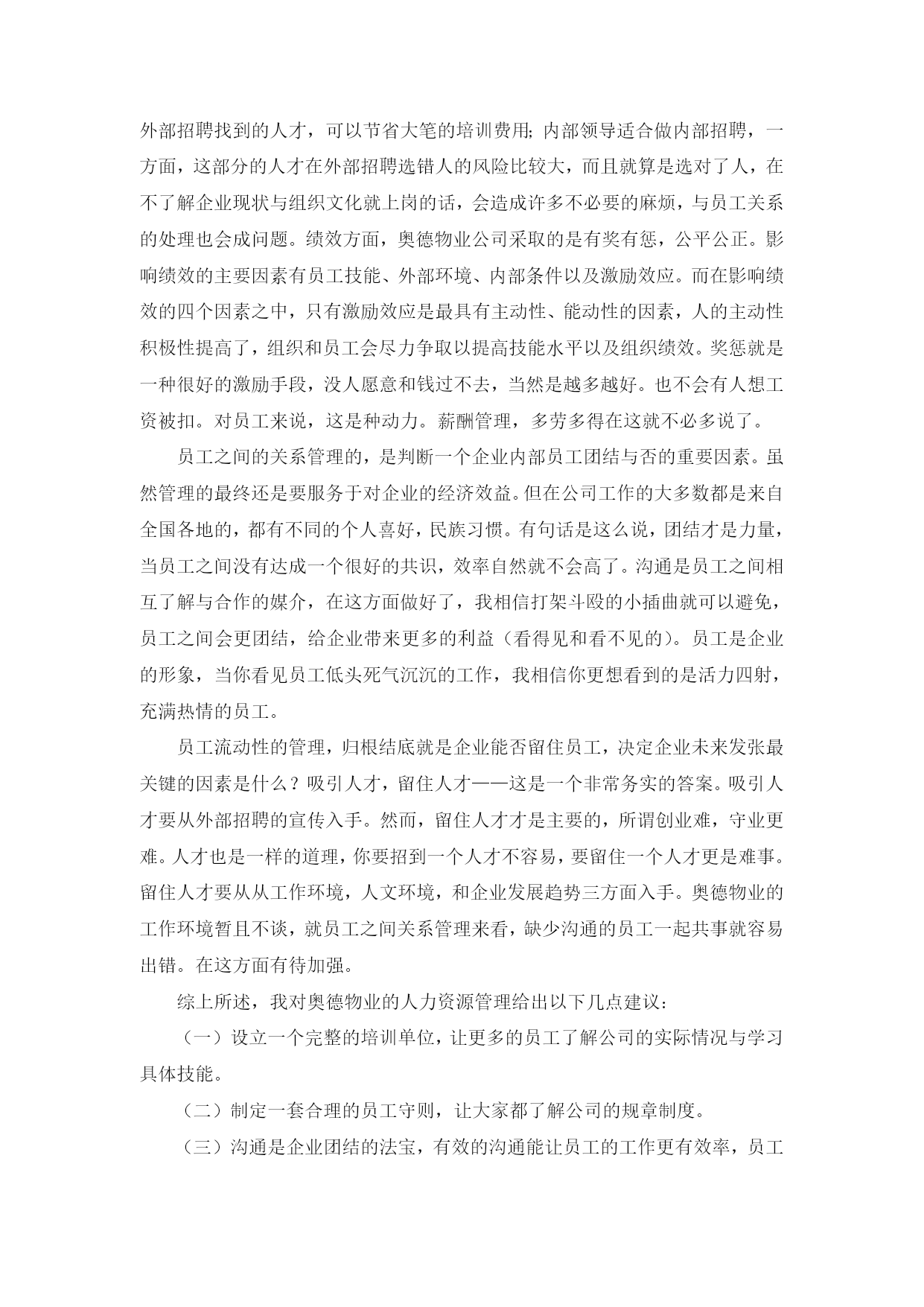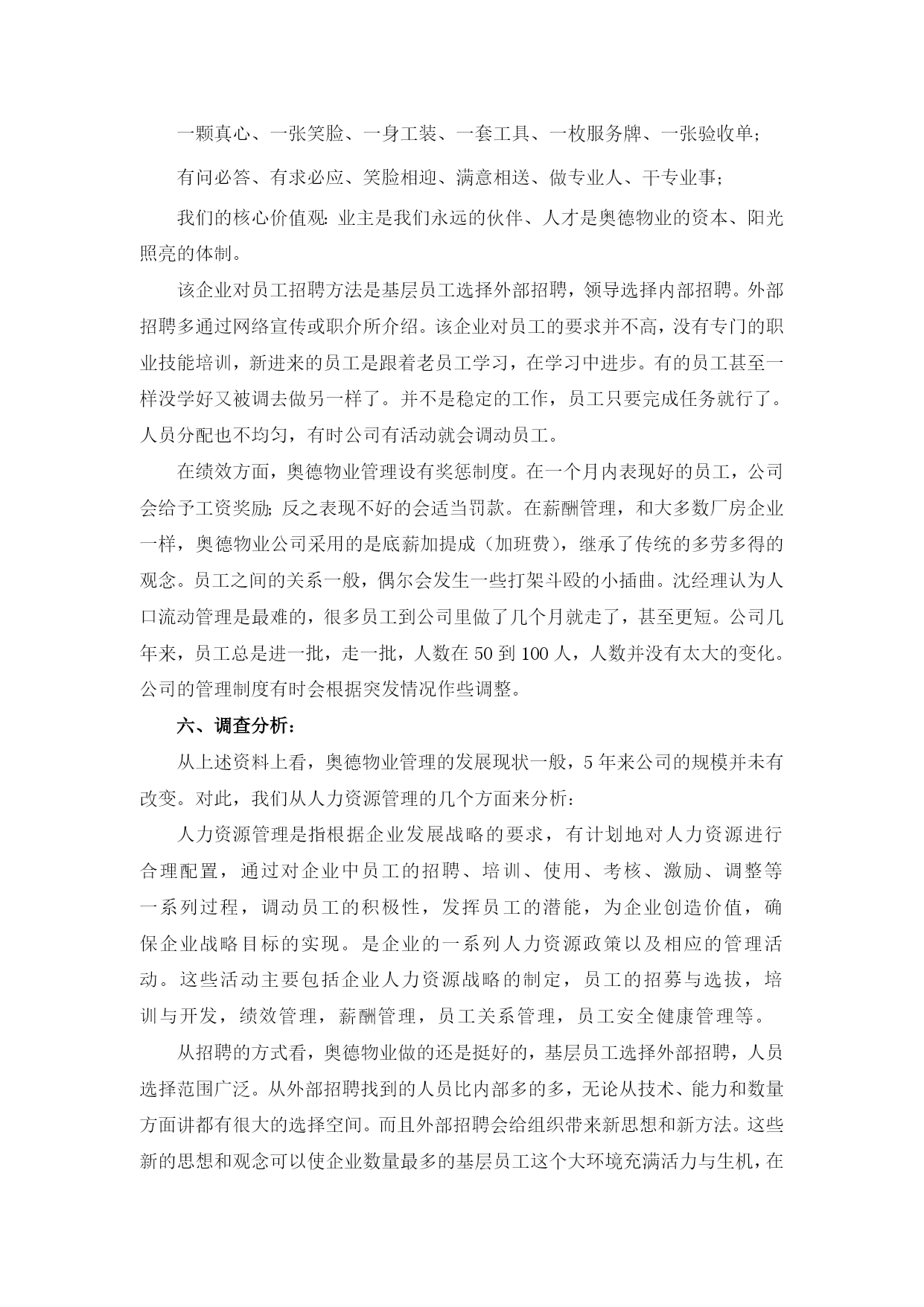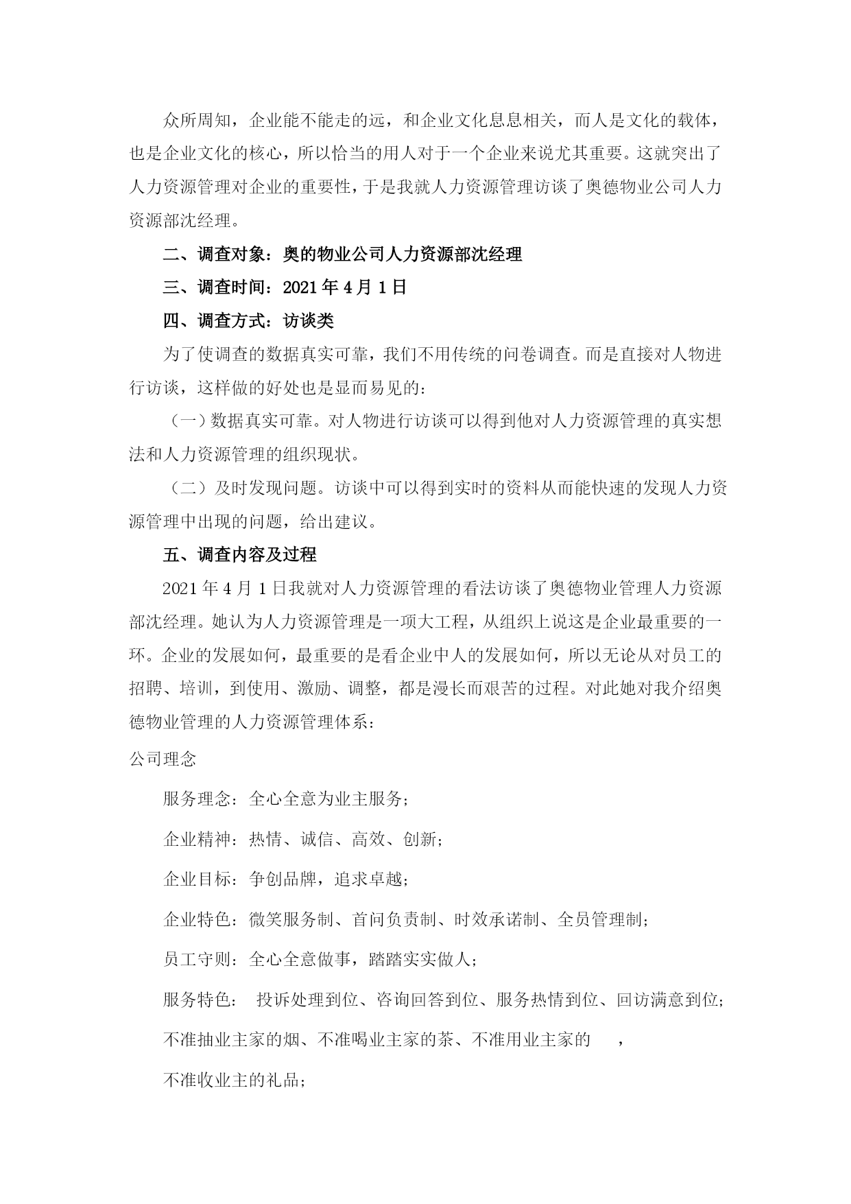 南京广播电视大学社会实践报告题目:关于南京奥德物业管理人力资源管理的调查姓名:学号:年级:12春专业:工商管理学生类别:开放专科指导教师:教学单位:2014年4月2日南京广播电视大学学生社会实践情况表学号专业工商管理(专)实践活动情况实践题目实践时间实践地点实践单位联系实践内容摘要关于南京奥德物业管理人力资源管理的调查报告,对该企业的人力资源做一个全面了解,熟悉人力资源管理流程,从理论联系实际工作进行评价和剖析,找出存在的问题加以讨论,提出改进办法。实践单位评语(盖章/签字)年月日指导教师评语实践报告资料综合成绩(百分制)指导教师:年月日教学单位审核(盖章)年月日市校意见(盖章)年月日所附资料明细表序号资料名称资料形式收集日期、地点123南京奥德物业管理人力资源管理调查报告一、调查目的:了解人力资源管理的过程.众所周知,企业能不能走的远,和企业文化息息相关,而人是文化的载体,也是企业文化的核心,所以恰当的用人对于一个企业来说尤其重要。这就突出了人力资源管理对企业的重要性,于是我就人力资源管理访谈了奥德物业公司人力资源部沈经理。二、调查对象:奥的物业公司人力资源部沈经理三、调查时间:2021年4月1日四、调查方式:访谈类为了使调查的数据真实可靠,我们不用传统的问卷调查。而是直接对人物进行访谈,这样做的好处也是显而易见的:(一)数据真实可靠。对人物进行访谈可以得到他对人力资源管理的真实想法和人力资源管理的组织现状。(二)及时发现问题。访谈中可以得到实时的资料从而能快速的发现人力资源管理中出现的问题,给出建议。五、调查内容及过程2021年4月1日我就对人力资源管理的看法访谈了奥德物业管理人力资源部沈经理。她认为人力资源管理是一项大工程,从组织上说这是企业最重要的一环。企业的发展如何,最重要的是看企业中人的发展如何,所以无论从对员工的招聘、培训,到使用、激励、调整,都是漫长而艰苦的过程。对此她对我介绍奥德物业管理的人力资源管理体系:公司理念服务理念:全心全意为业主服务;企业精神:热情、诚信、高效、创新;企业目标:争创品牌,追求卓越;企业特色:微笑服务制、首问负责制、时效承诺制、全员管理制;员工守则:全心全意做事,踏踏实实做人;服务特色:投诉处理到位、咨询回答到位、服务热情到位、回访满意到位;不准抽业主家的烟、不准喝业主家的茶、不准用业主家的,不准收业主的礼品;一颗真心、一张笑脸、一身工装、一套工具、一枚服务牌、一张验收单;有问必答、有求必应、笑脸相迎、满意相送、做专业人、干专业事;我们的核心价值观:业主是我们永远的伙伴、人才是奥德物业的资本、阳光照亮的体制。该企业对员工招聘方法是基层员工选择外部招聘,领导选择内部招聘。外部招聘多通过网络宣传或职介所介绍。该企业对员工的要求并不高,没有专门的职业技能培训,新进来的员工是跟着老员工学习,在学习中进步。有的员工甚至一样没学好又被调去做另一样了。并不是稳定的工作,员工只要完成任务就行了。人员分配也不均匀,有时公司有活动就会调动员工。在绩效方面,奥德物业管理设有奖惩制度。在一个月内表现好的员工,公司会给予工资奖励;反之表现不好的会适当罚款。在薪酬管理,和大多数厂房企业一样,奥德物业公司采用的是底薪加提成(加班费),继承了传统的多劳多得的观念。员工之间的关系一般,偶尔会发生一些打架斗殴的小插曲。沈经理认为人口流动管理是最难的,很多员工到公司里做了几个月就走了,甚至更短。公司几年来,员工总是进一批,走一批,人数在50到100人,人数并没有太大的变化。公司的管理制度有时会根据突发情况作些调整。六、调查分析:从上述资料上看,奥德物业管理的发展现状一般,5年来公司的规模并未有改变。对此,我们从人力资源管理的几个方面来分析:人力资源管理是指根据企业发展战略的要求,有计划地对人力资源进行合理配置,通过对企业中员工的招聘、培训、使用、考核、激励、调整等一系列过程,调动员工的积极性,发挥员工的潜能,为企业创造价值,确保企业战略目标的实现。是企业的一系列人力资源政策以及相应的管理活动。这些活动主要包括企业人力资源战略的制定,员工的招募与选拔,培训与开发,绩效管理,薪酬管理,员工关系管理,员工安全健康管理等。从招聘的方式看,奥德物业做的还是挺好的,基层员工选择外部招聘,人员选择范围广泛。从外部招聘找到的人员比内部多的多,无论从技术、能力和数量方面讲都有很大的选择空间。而且外部招聘会给组织带来新思想和新方法。这些新的思想和观念可以使企业数量最多的基层员工这个大环境充满活力与生机,在外部招聘找到的人才,可以节省大笔的培训费用;内部领导适合做内部招聘,一方面,这部分的人才在外部招聘选错人的风险比较大,而且