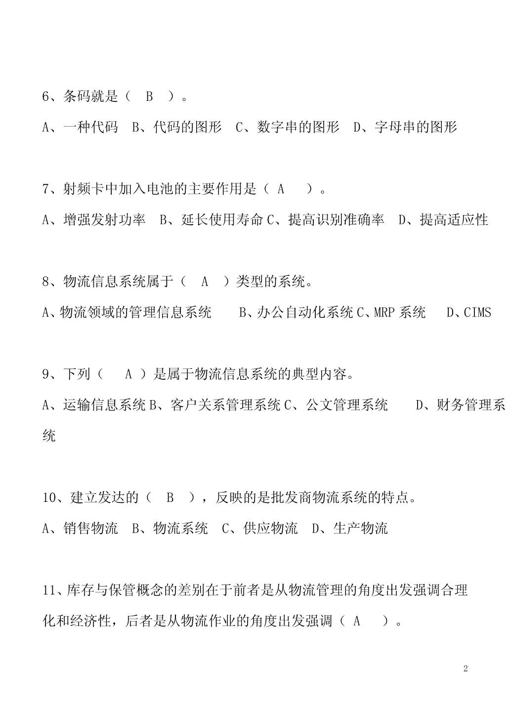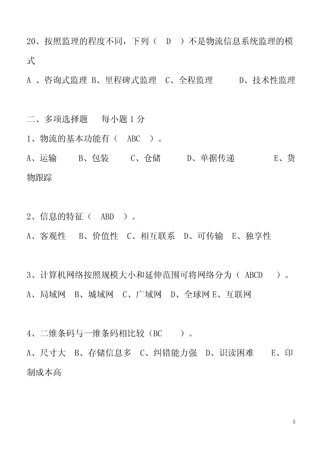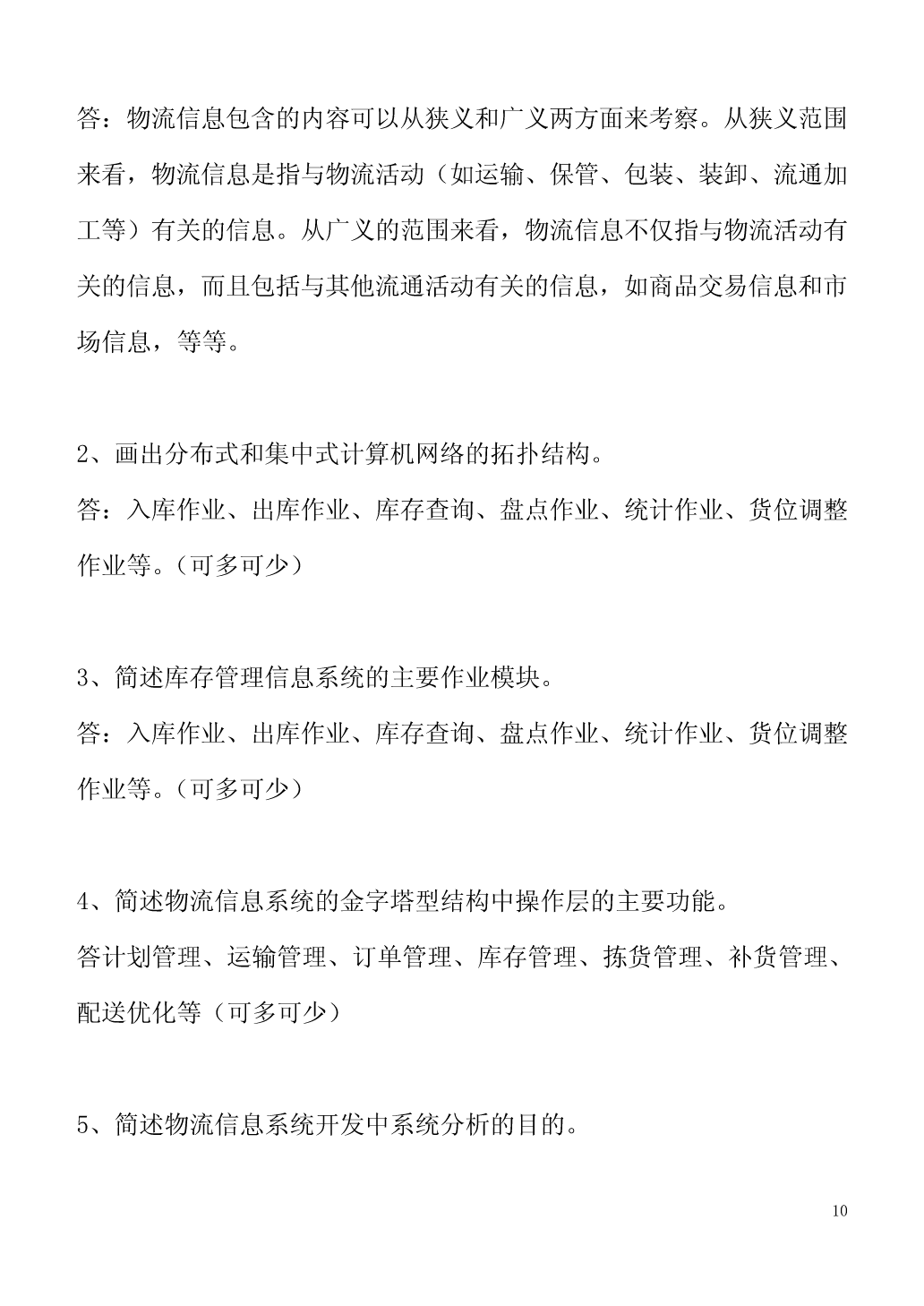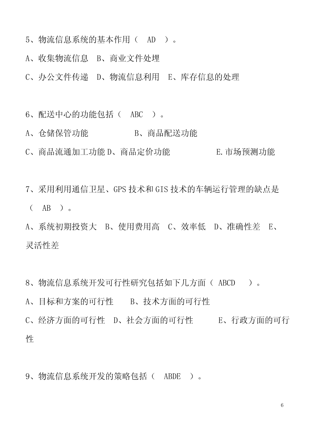 物流信息系统试题及答案一、单项选择题1、数据是(B)。A、对客观实物的认识B、客观实物的记录C、文字D、数字2、物流系统有物流作业系统和(A)部分组成。A、物流信息系统B、运输信息管理系统C、库存信息管理系统D、电子商务物流信息管理系统3、下面(D)不是物流信息的特征。A、信息量大B、更新快C、来源多样化D、单向流动4.、通过自动读取设备在销售商品时直接读取商品销售信息,并通过通信网络和计算机系统传送至有关部门进行分析加工以提高经营效率的系统是(B)。A、EOS系统B、POS系统C、专家系统D、EDI系统5、计算机之间能够互通信息是因为(D)。A、有电缆相连B、计算机相同C、软件系统一样D、用网络连接16、条码就是(B)。A、一种代码B、代码的图形C、数字串的图形D、字母串的图形7、射频卡中加入电池的主要作用是(A)。A、增强发射功率B、延长使用寿命C、提高识别准确率D、提高适应性8、物流信息系统属于(A)类型的系统。A、物流领域的管理信息系统B、办公自动化系统C、MRP系统D、CIMS9、下列(A)是属于物流信息系统的典型内容。A、运输信息系统B、客户关系管理系统C、公文管理系统D、财务管理系统10、建立发达的(B),反映的是批发商物流系统的特点。A、销售物流B、物流系统C、供应物流D、生产物流11、库存与保管概念的差别在于前者是从物流管理的角度出发强调合理化和经济性,后者是从物流作业的角度出发强调(A)。2A、效率化B、安全化C、标准化D、功能化12、运输信息系统可以提供的信息(A)。A、在途货物情况B、库存数量C、配送成本D、货物质量13、配送中心的(C)系统管理情况是整个物流系统运营好坏的标志。A、物流B、人力资源C、信息D、安全14、物流信息系统与环境是由物流系统的(A)所划分,在它之内称为系统,在它之外称为环境。A、边界B、输入C、处理D、输出15、建立物流信息系统的组织基础是指组织内部所需的(C)。A、技术性条件B、非技术性条件C、管理基础条件D、人才基础条件16、用原型法开发信息系统,评价原型阶段的主要任务是(B)。3A、修改、完善系统原型B、征求用户对原型的评价和改进意见C、扩展系统功能D、研制者分析、评价已建原型17、对一个企业供、销、存管理信息系统而言,以下各部门哪一个是外部实体(B)?A、仓库B、计划科C、供应科D、销售科18、物流信息系统的维护按不同性质划分为以下4种类型:纠错性维护、(A)、完善性维护、预防性维护。A、适应性维护B、代码维护C、系统性维护D、系统应用程序维护19、下列(D)不是物流信息系统的不安全性和信息网络的不安全性主要原因。A、黑客攻击B、软硬件的“漏洞”和后门C、信息战D、技术缺陷420、按照监理的程度不同,下列(D)不是物流信息系统监理的模式A、咨询式监理B、里程碑式监理C、全程监理D、技术性监理二、多项选择题每小题1分1、物流的基本功能有(ABC)。A、运输B、包装C、仓储D、单据传递E、货物跟踪2、信息的特征(ABD)。A、客观性B、价值性C、相互联系D、可传输E、独享性3、计算机网络按照规模大小和延伸范围可将网络分为(ABCD)。A、局域网B、城域网C、广域网D、全球网E、互联网4、二维条码与一维条码相比较(BC)。A、尺寸大B、存储信息多C、纠错能力强D、识读困难E、印制成本高55、物流信息系统的基本作用(AD)。A、收集物流信息B、商业文件处埋C、办公文件传递D、物流信息利用E、库存信息的处理6、配送中心的功能包括(ABC)。A、仓储保管功能B、商品配送功能C、商品流通加工功能D、商品定价功能E.市场预测功能7、采用利用通信卫星、GPS技术和GIS技术的车辆运行管理的缺点是(AB)。A、系统初期投资大B、使用费用高C、效率低D、准确性差E、灵活性差8、物流信息系统开发可行性研究包括如下几方面(ABCD)。A、目标和方案的可行性B、技术方面的可行性C、经济方面的可行性D、社会方面的可行性E、行政方面的可行性9、物流信息系统开发的策略包括(ABDE)。6A、接收式的开发策略B、直接式的开发策略C、间接式的开发策略D、迭代式的开发策略E、实验式的开发策略10、按照维护对象