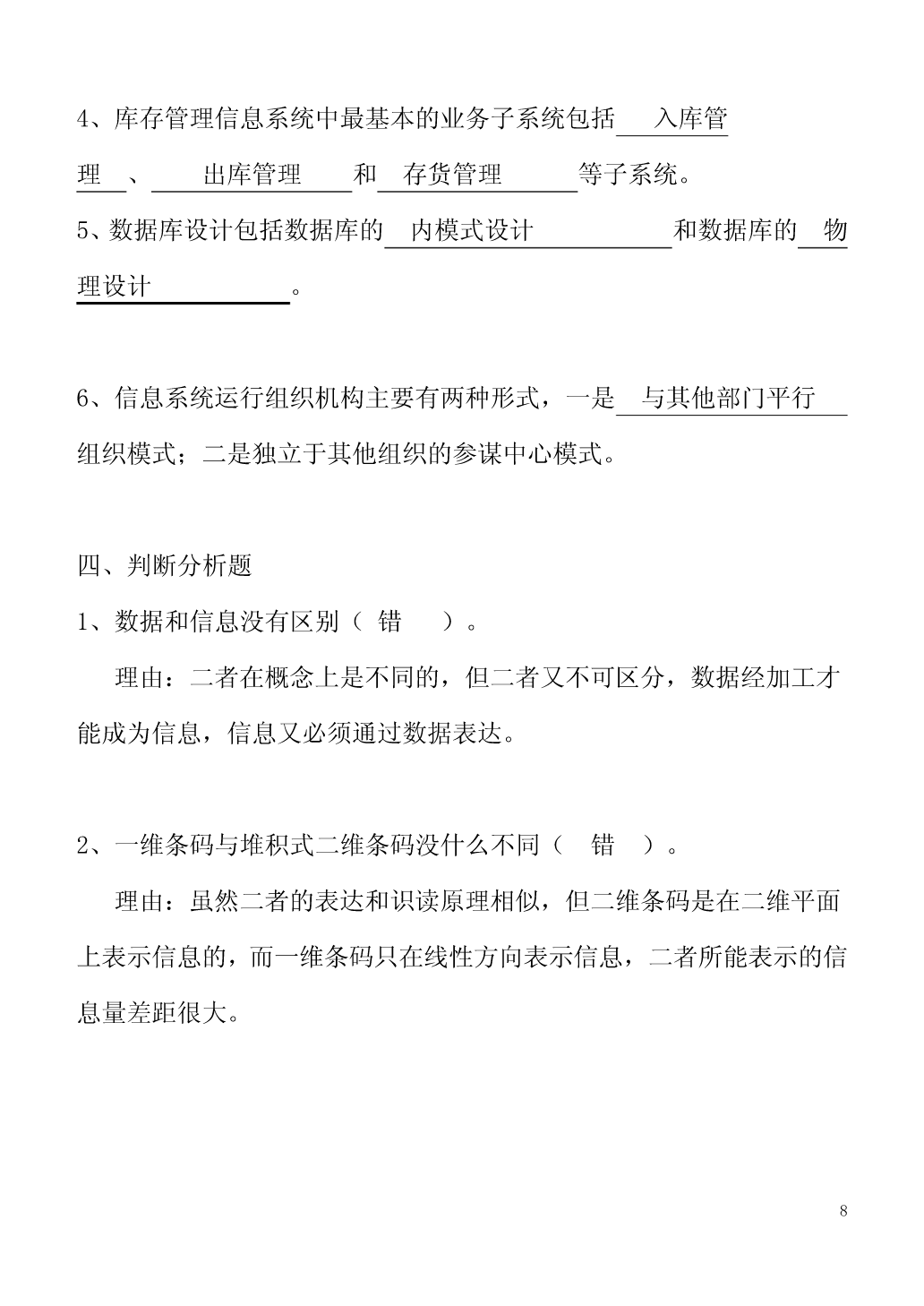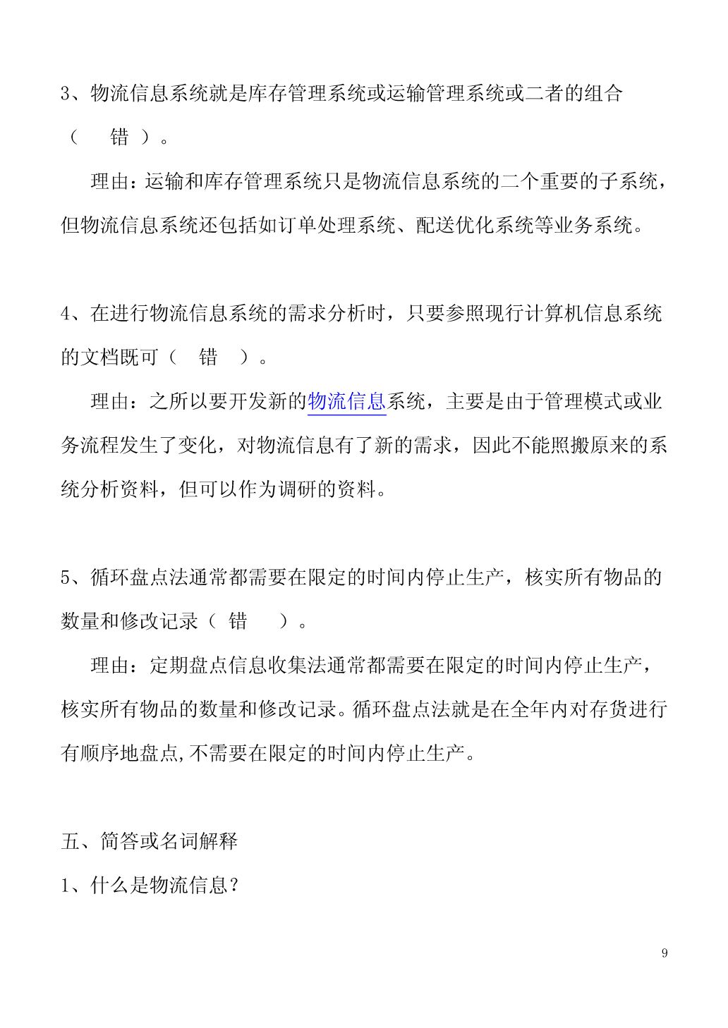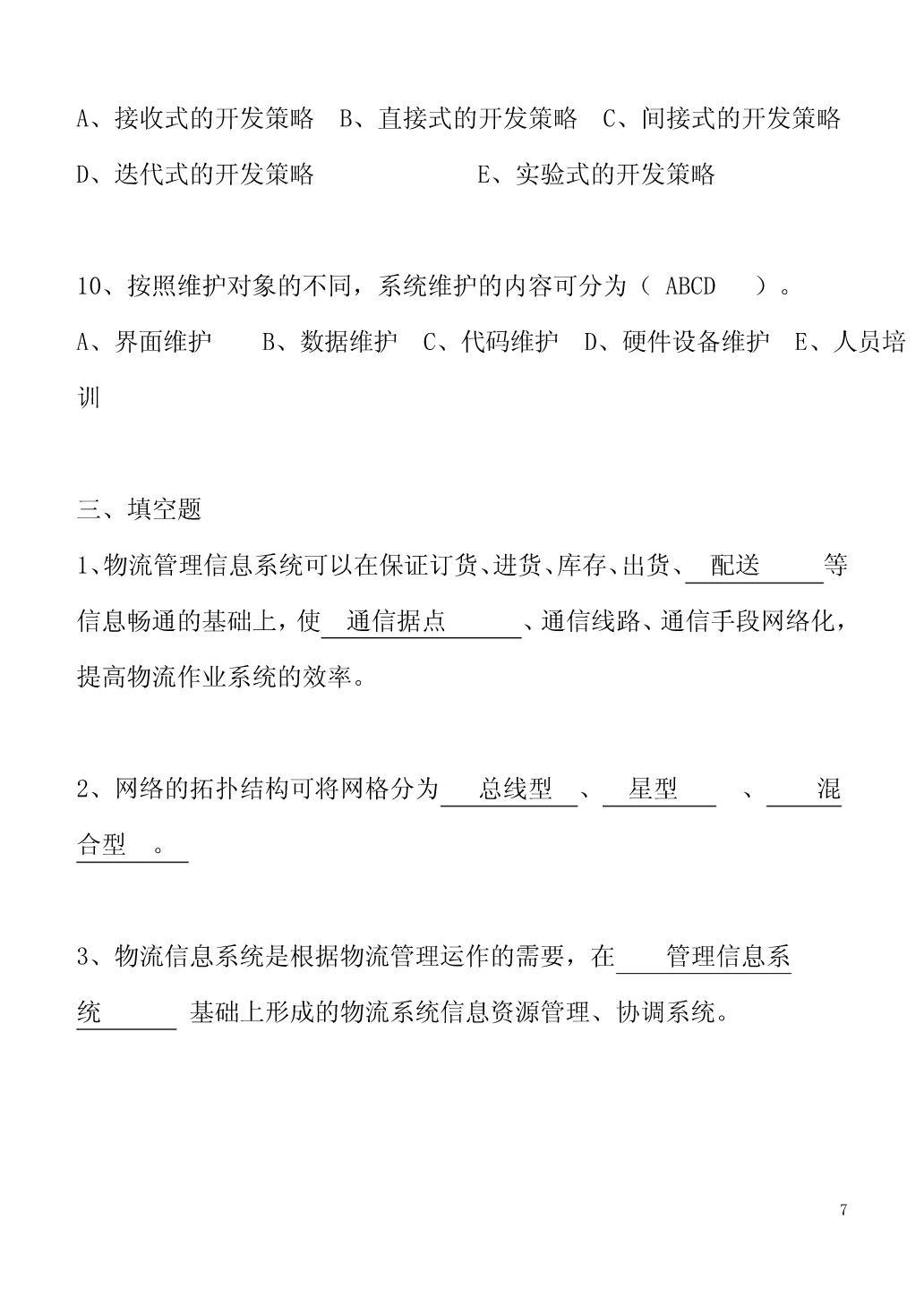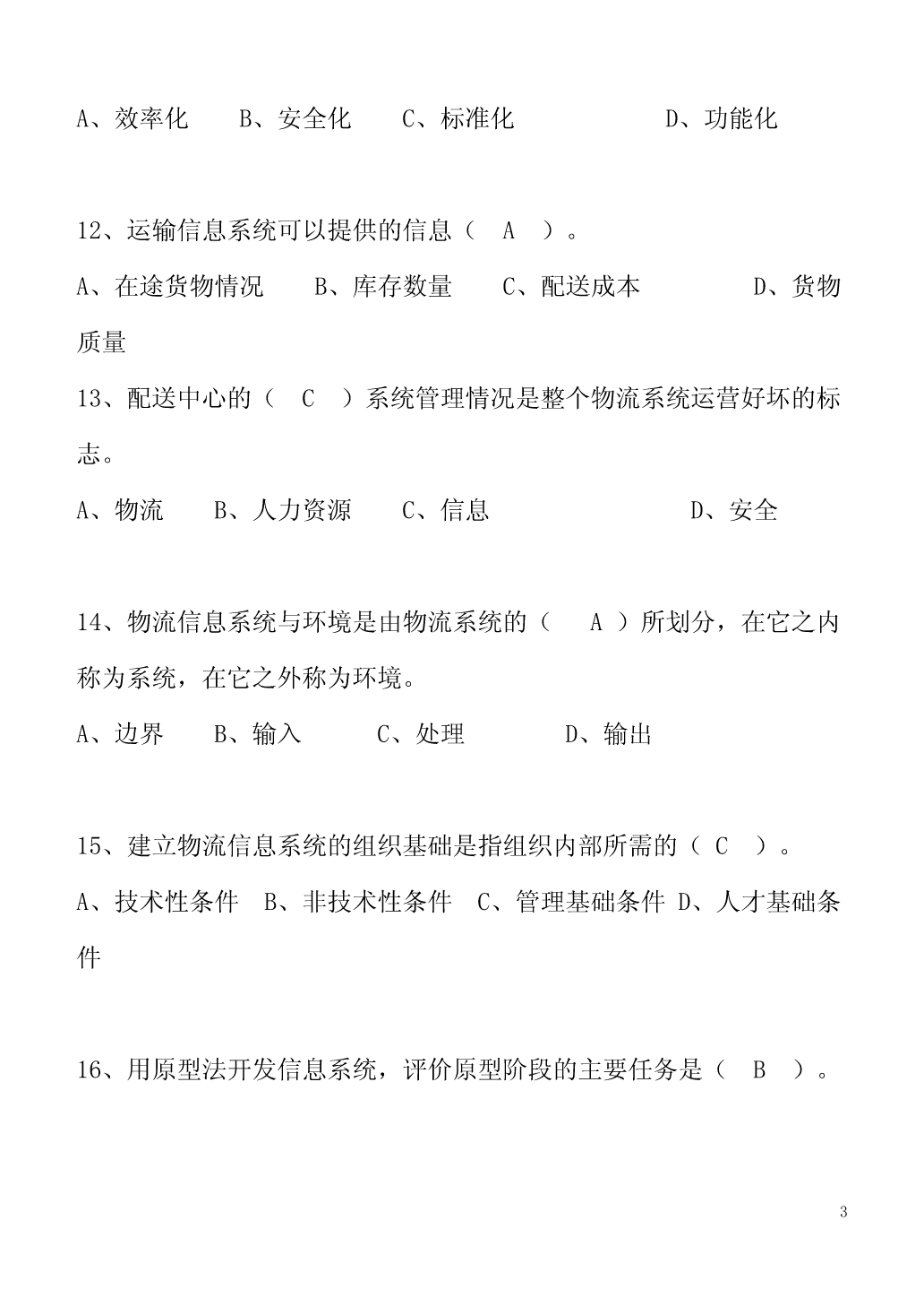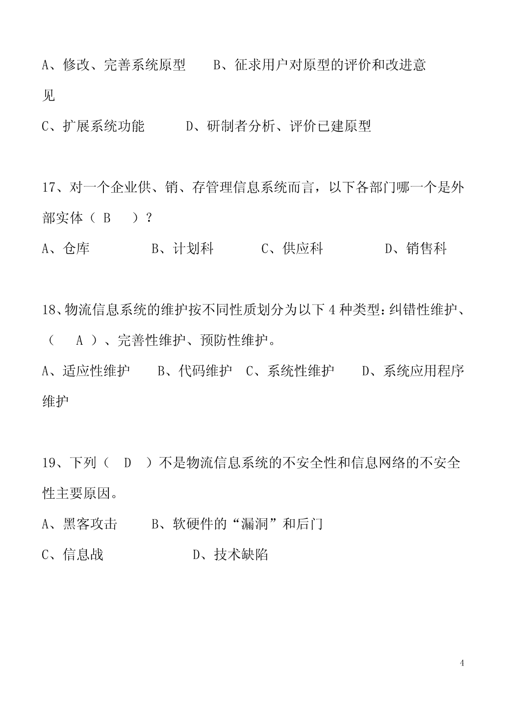 物流信息系统试题及答案一、单项选择题1、数据是(B)。A、对客观实物的认识B、客观实物的记录C、文字D、数字2、物流系统有物流作业系统和(A)部分组成。A、物流信息系统B、运输信息管理系统C、库存信息管理系统D、电子商务物流信息管理系统3、下面(D)不是物流信息的特征。A、信息量大B、更新快C、来源多样化D、单向流动4.、通过自动读取设备在销售商品时直接读取商品销售信息,并通过通信网络和计算机系统传送至有关部门进行分析加工以提高经营效率的系统是(B)。A、EOS系统B、POS系统C、专家系统D、EDI系统5、计算机之间能够互通信息是因为(D)。A、有电缆相连B、计算机相同C、软件系统一样D、用网络连接16、条码就是(B)。A、一种代码B、代码的图形C、数字串的图形D、字母串的图形7、射频卡中加入电池的主要作用是(A)。A、增强发射功率B、延长使用寿命C、提高识别准确率D、提高适应性8、物流信息系统属于(A)类型的系统。A、物流领域的管理信息系统B、办公自动化系统C、MRP系统D、CIMS9、下列(A)是属于物流信息系统的典型内容。A、运输信息系统B、客户关系管理系统C、公文管理系统D、财务管理系统10、建立发达的(B),反映的是批发商物流系统的特点。A、销售物流B、物流系统C、供应物流D、生产物流11、库存与保管概念的差别在于前者是从物流管理的角度出发强调合理化和经济性,后者是从物流作业的角度出发强调(A)。2A、效率化B、安全化C、标准化D、功能化12、运输信息系统可以提供的信息(A)。A、在途货物情况B、库存数量C、配送成本D、货物质量13、配送中心的(C)系统管理情况是整个物流系统运营好坏的标志。A、物流B、人力资源C、信息D、安全14、物流信息系统与环境是由物流系统的(A)所划分,在它之内称为系统,在它之外称为环境。A、边界B、输入C、处理D、输出15、建立物流信息系统的组织基础是指组织内部所需的(C)。A、技术性条件B、非技术性条件C、管理基础条件D、人才基础条件16、用原型法开发信息系统,评价原型阶段的主要任务是(B)。3A、修改、完善系统原型B、征求用户对原型的评价和改进意见C、扩展系统功能D、研制者分析、评价已建原型17、对一个企业供、销、存管理信息系统而言,以下各部门哪一个是外部实体(B)?A、仓库B、计划科C、供应科D、销售科18、物流信息系统的维护按不同性质划分为以下4种类型:纠错性维护、(A)、完善性维护、预防性维护。A、适应性维护B、代码维护C、系统性维护D、系统应用程序维护19、下列(D)不是物流信息系统的不安全性和信息网络的不安全性主要原因。A、黑客攻击B、软硬件的“漏洞”和后门C、信息战D、技术缺陷420、按照监理的程度不同,下列(D)不是物流信息系统监理的模式A、咨询式监理B、里程碑式监理C、全程监理D、技术性监理二、多项选择题每小题1分1、物流的基本功能有(ABC)。A、运输B、包装C、仓储D、单据传递E、货物跟踪2、信息的特征(ABD)。A、客观性B、价值性C、相互联系D、可传输E、独享性3、计算机网络按照规模大小和延伸范围可将网络分为(ABCD)。A、局域网B、城域网C、广域网D、全球网E、互联网4、二维条码与一维条码相比较(BC)。A、尺寸大B、存储信息多C、纠错能力强D、识读困难E、印制成本高55、物流信息系统的基本作用(AD)。A、收集物流信息B、商业文件处埋C、办公文件传递D、物流信息利用E、库存信息的处理6、配送中心的功能包括(ABC)。A、仓储保管功能B、商品配送功能C、商品流通加工功能D、商品定价功能E.市场预测功能7、采用利用通信卫星、GPS技术和GIS技术的车辆运行管理的缺点是(AB)。A、系统初期投资大B、使用费用高C、效率低D、准确性差E、灵活性差8、物流信息系统开发可行性研究包括如下几方面(ABCD)。A、目标和方案的可行性B、技术方面的可行性C、经济方面的可行性D、社会方面的可行性E、行政方面的可行性9、物流信息系统开发的策略包括(ABDE)。6A、接收式的开发策略B、直接式的开发策略C、间接式的开发策略D、迭代式的开发策略E、实验式的开发策略10、按照维护对象